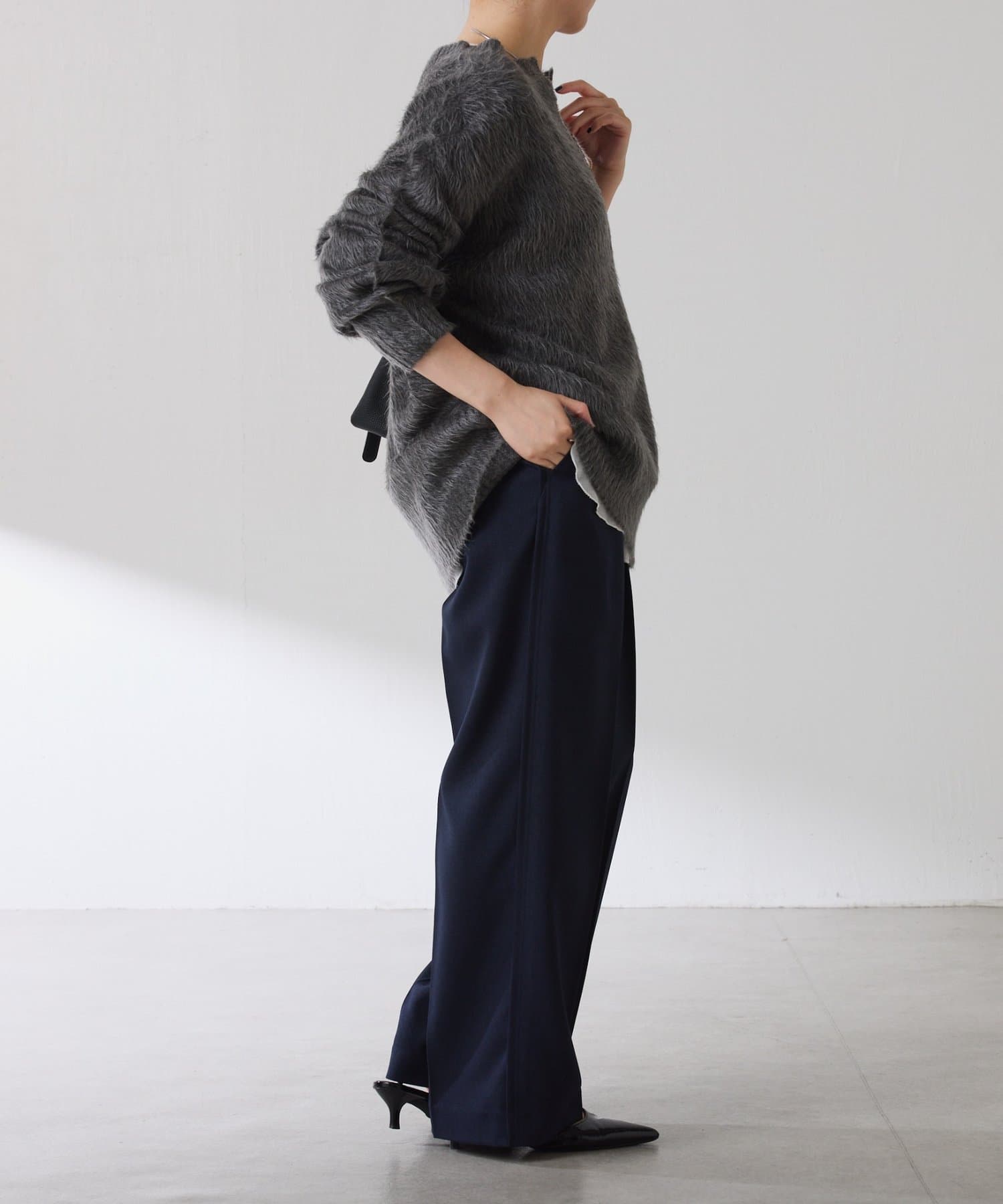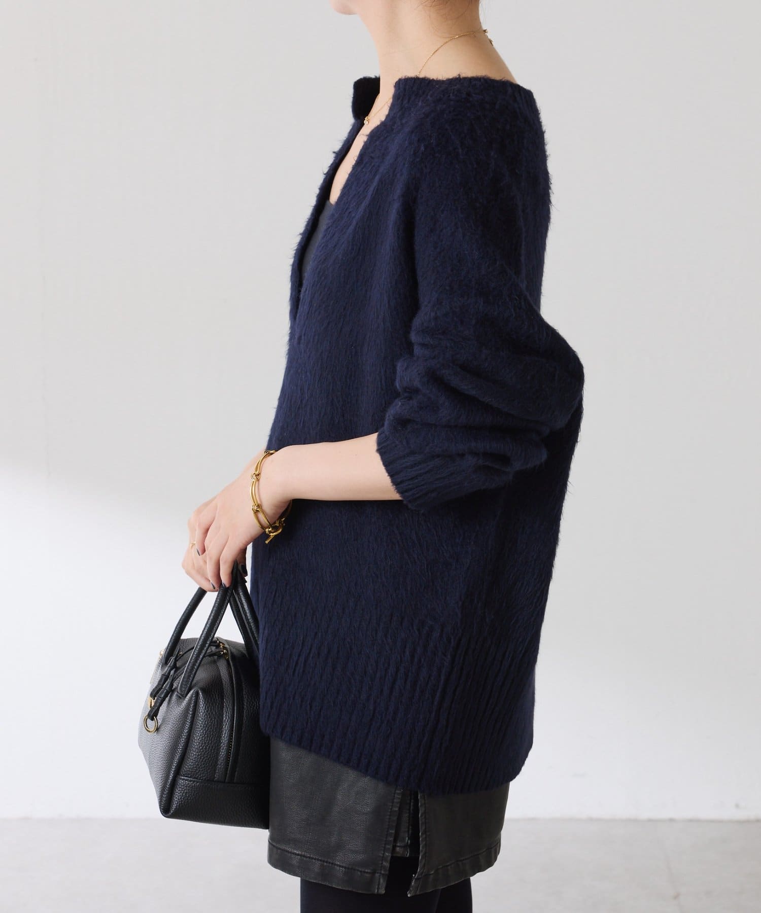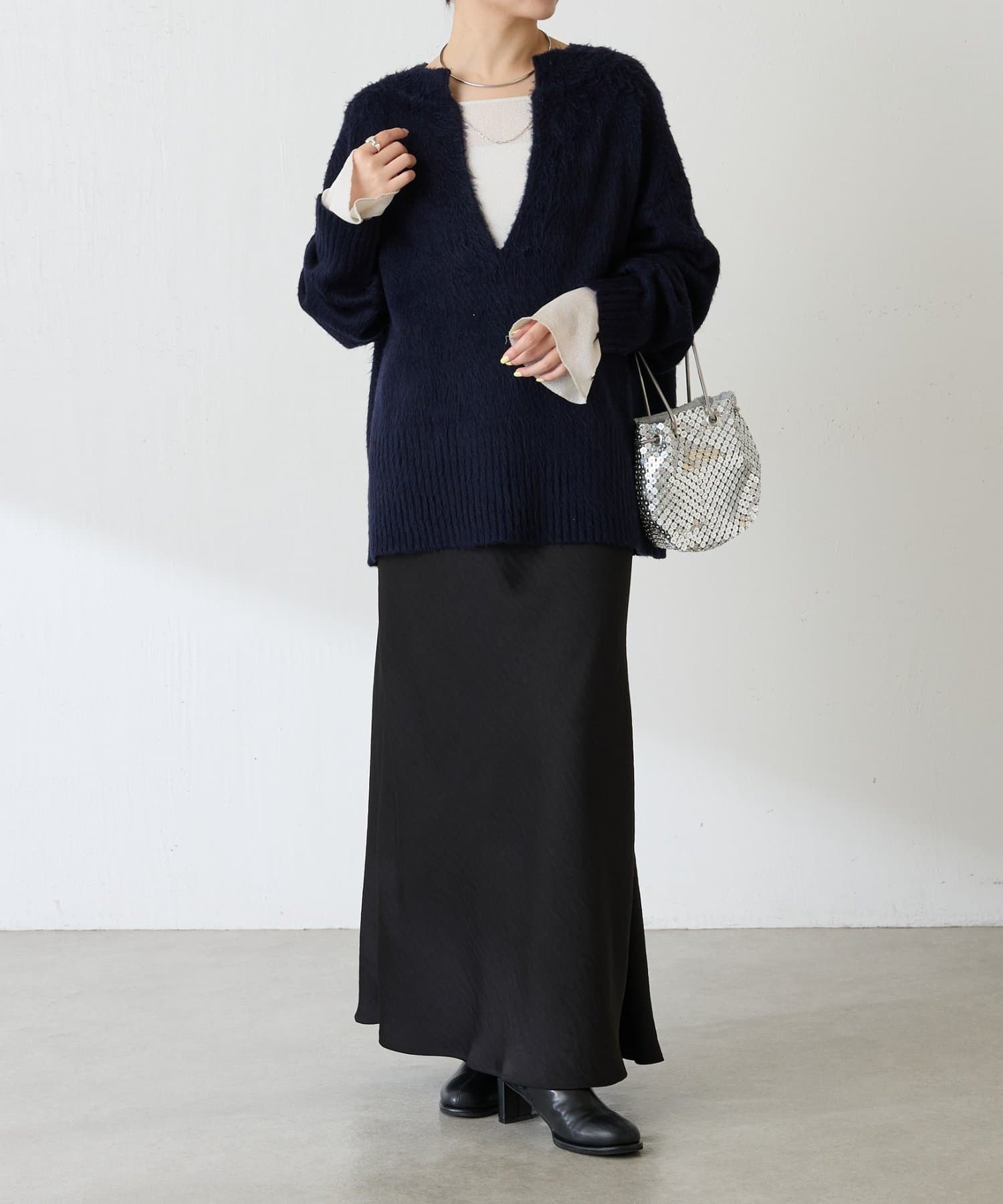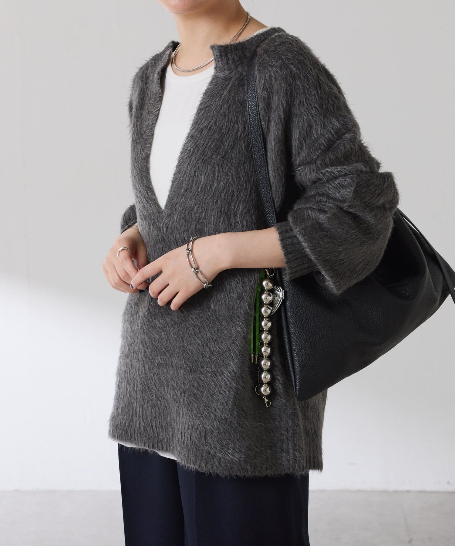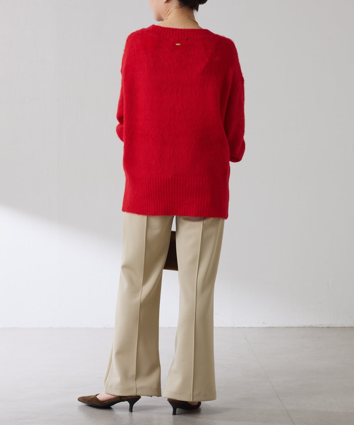 ・とにかく軽いエアリーな糸を使用した深Vニット。着ぶくれ感もなく、ストレスフリーな着心地です。