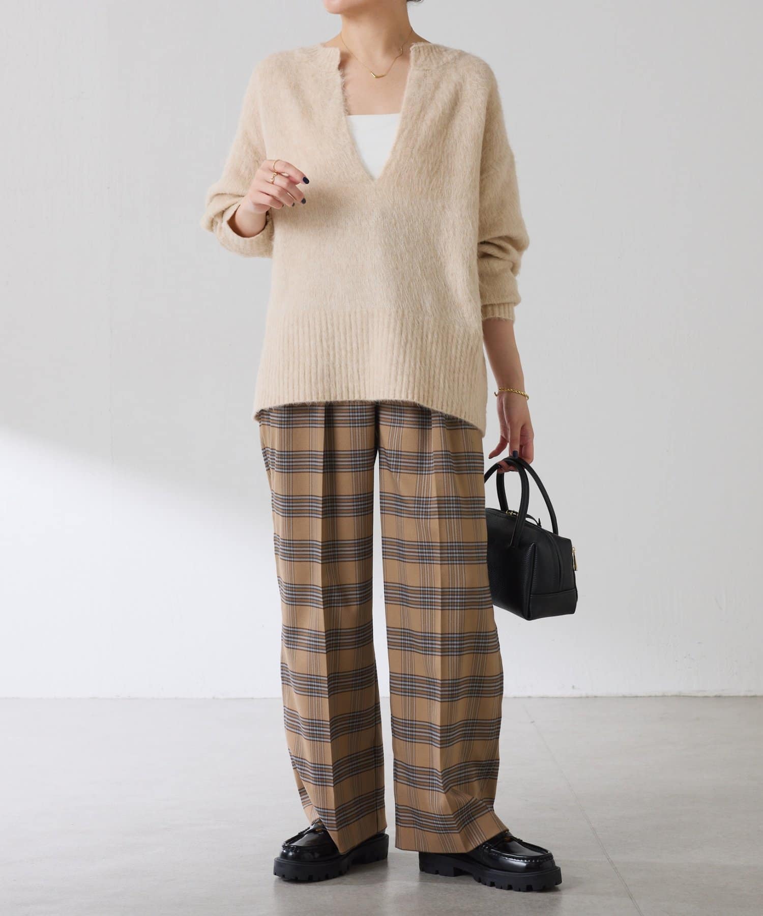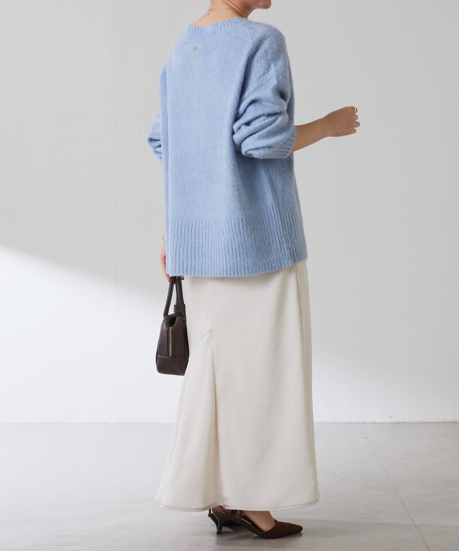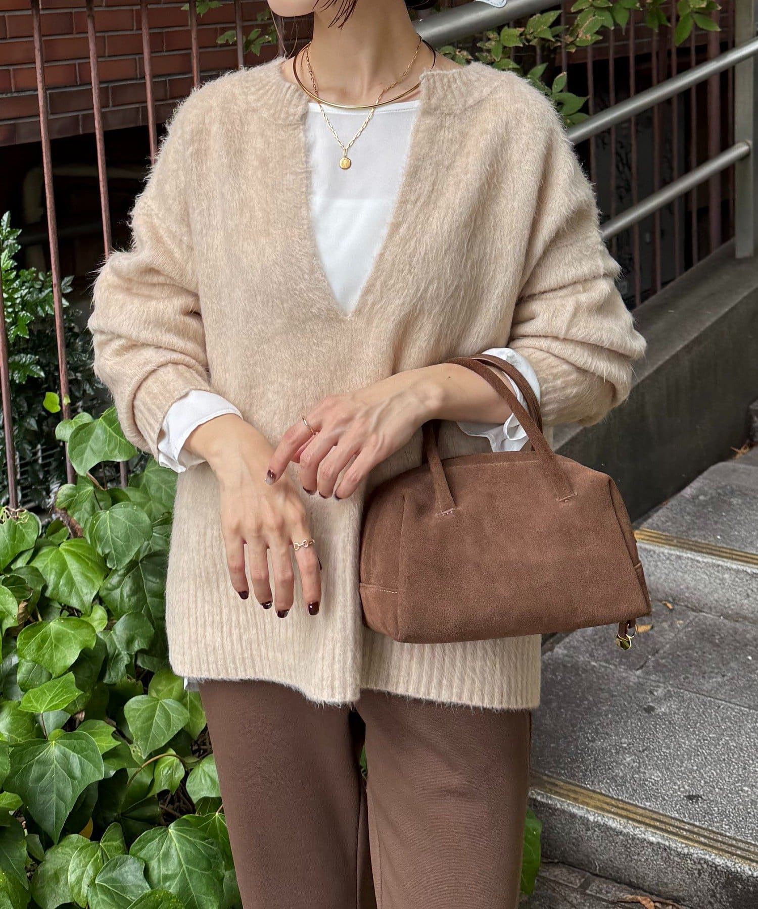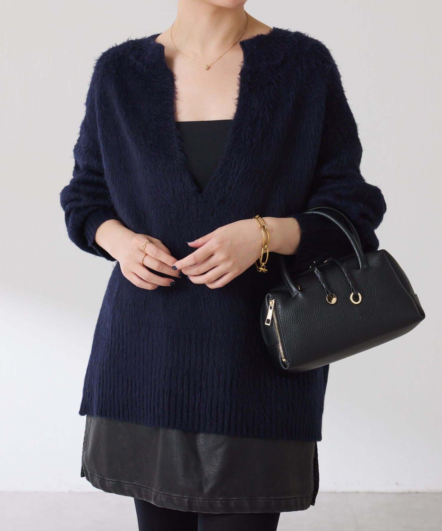 ・とにかく軽いエアリーな糸を使用した深Vニット。着ぶくれ感もなく、ストレスフリーな着心地です。