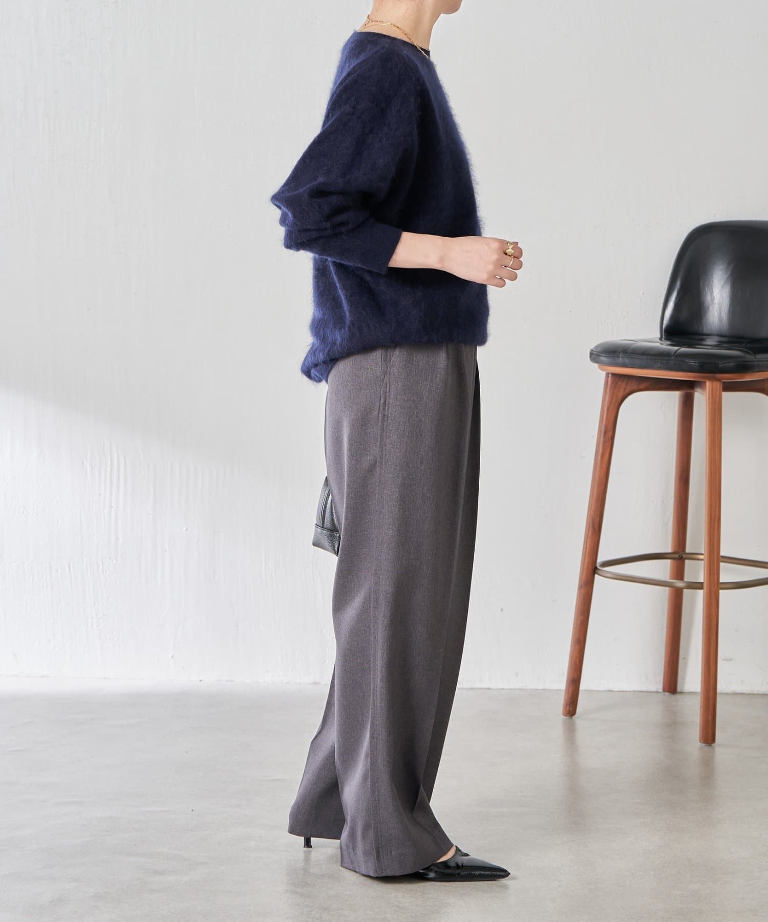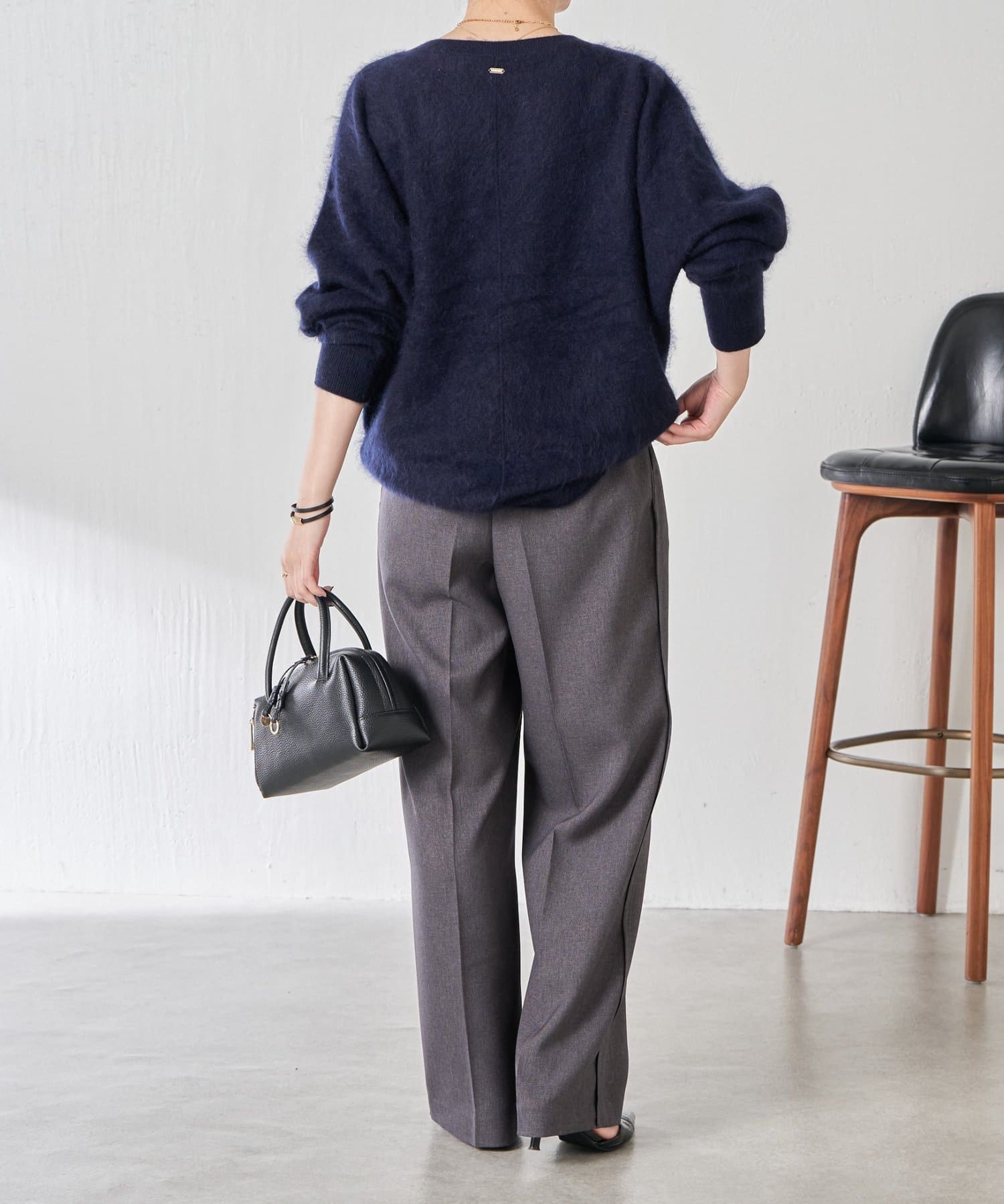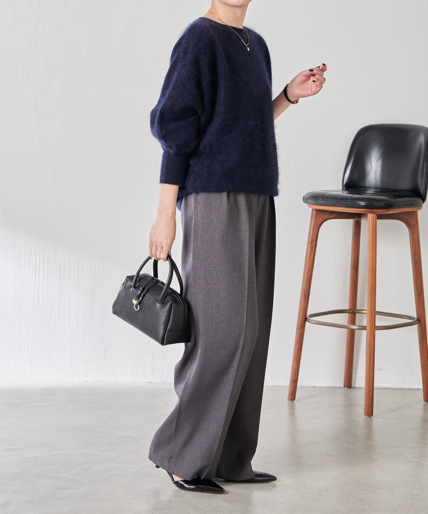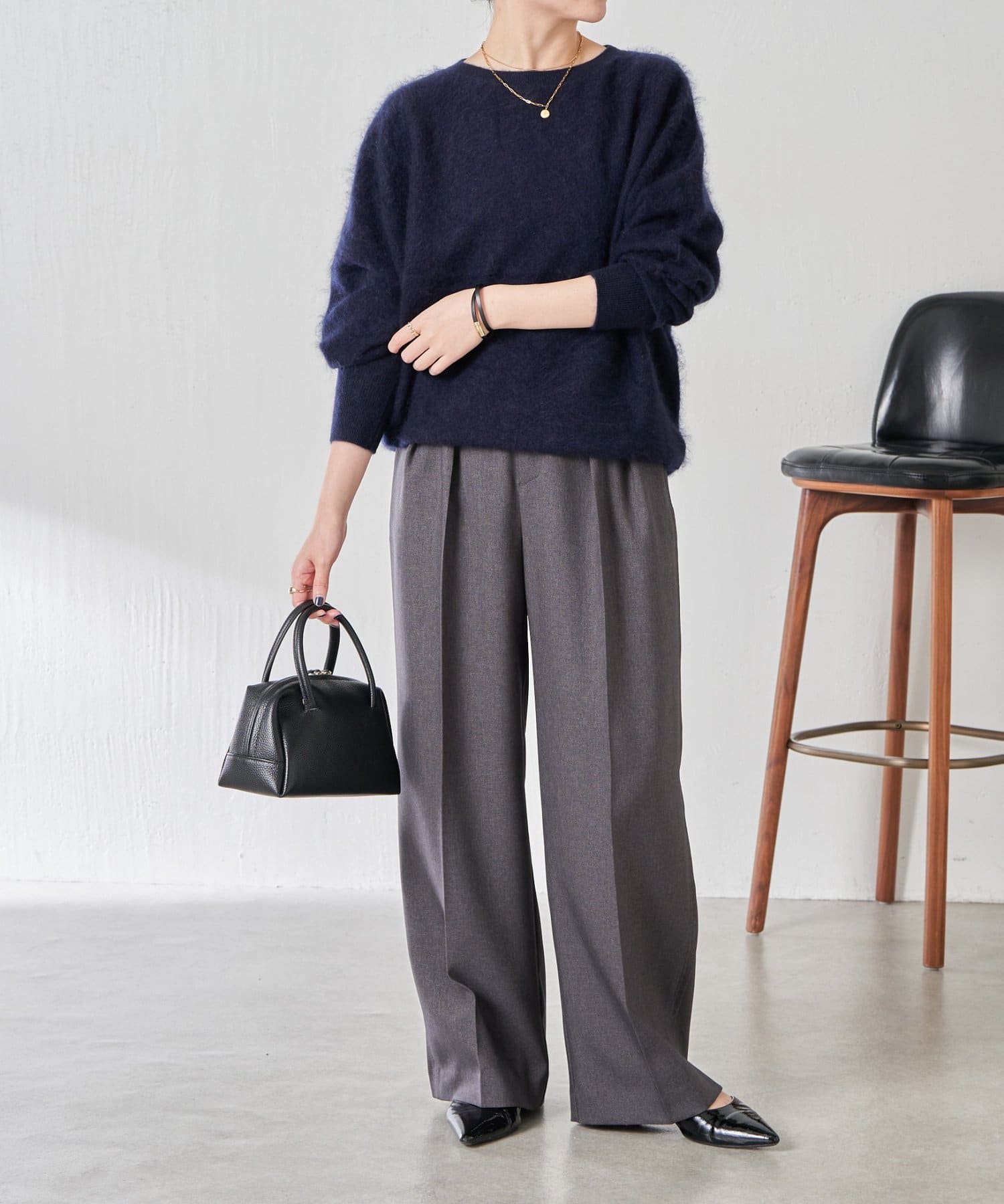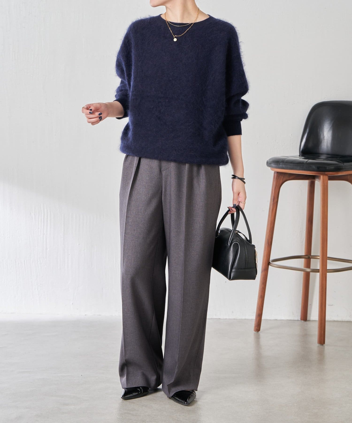 ウールやツイードなど重厚感あるボトムスと合わせて柔らかさをプラスするのもおすすめ。