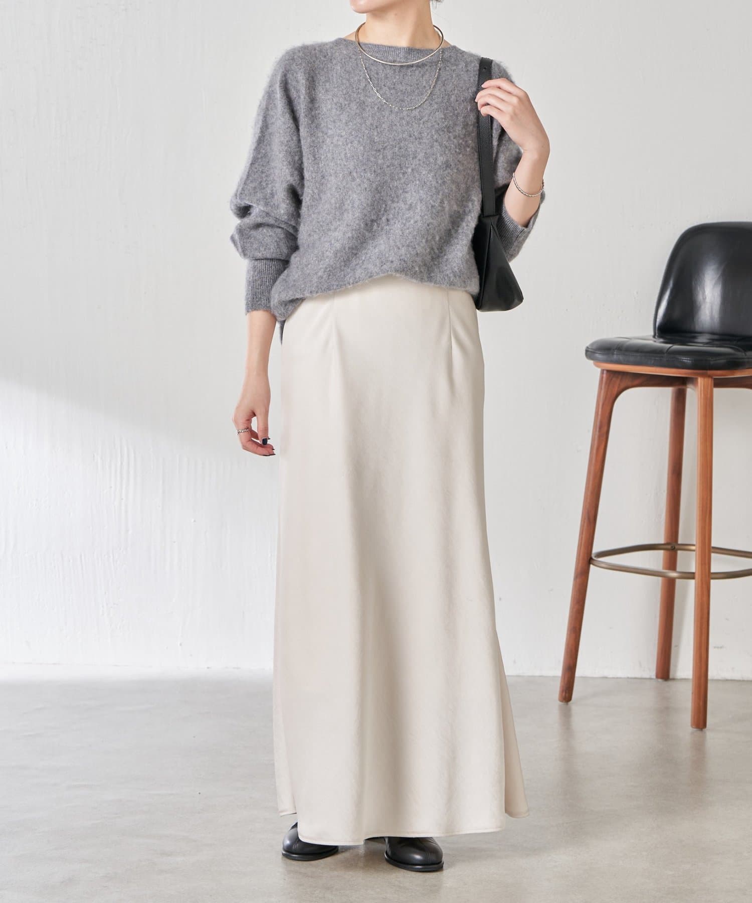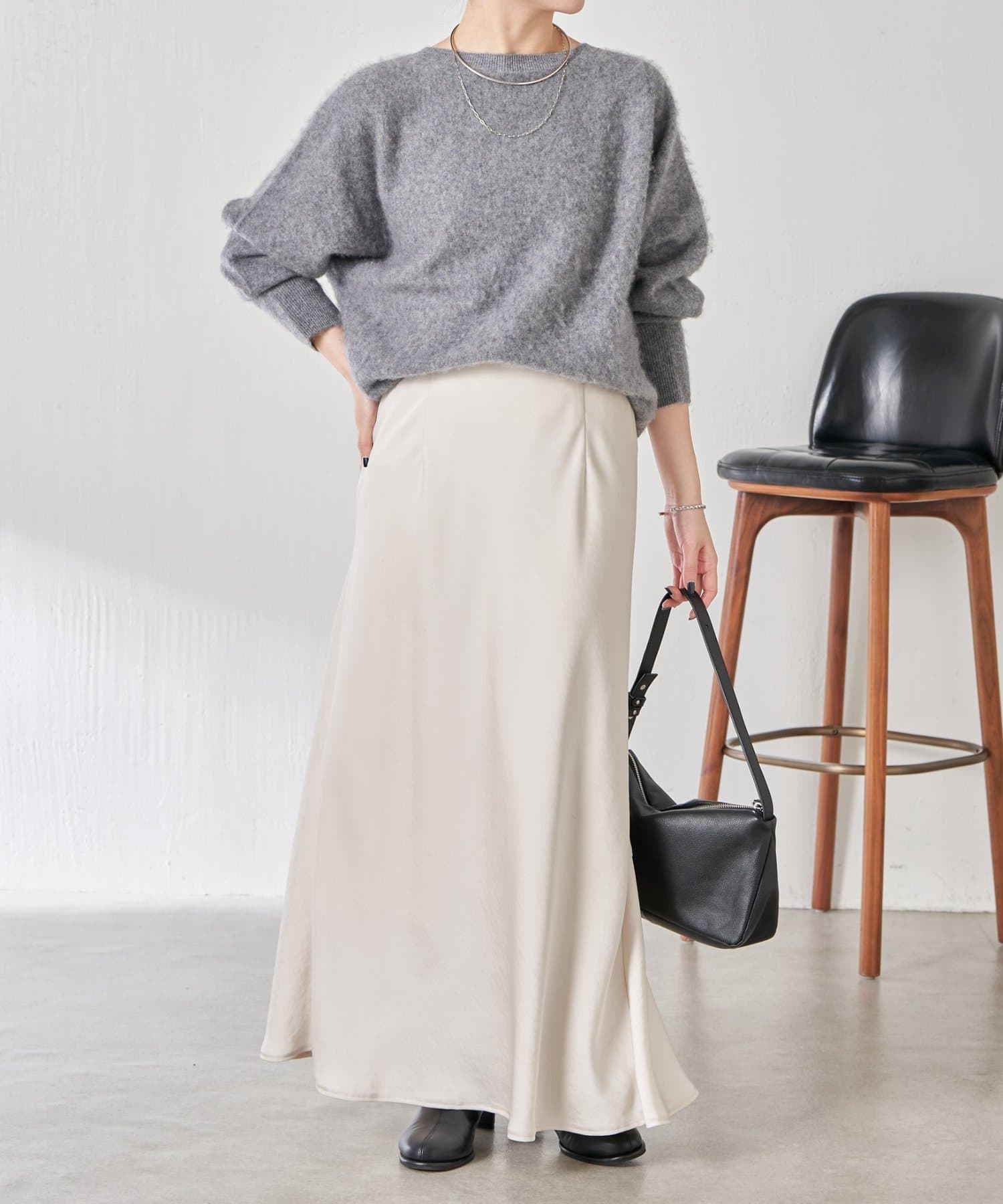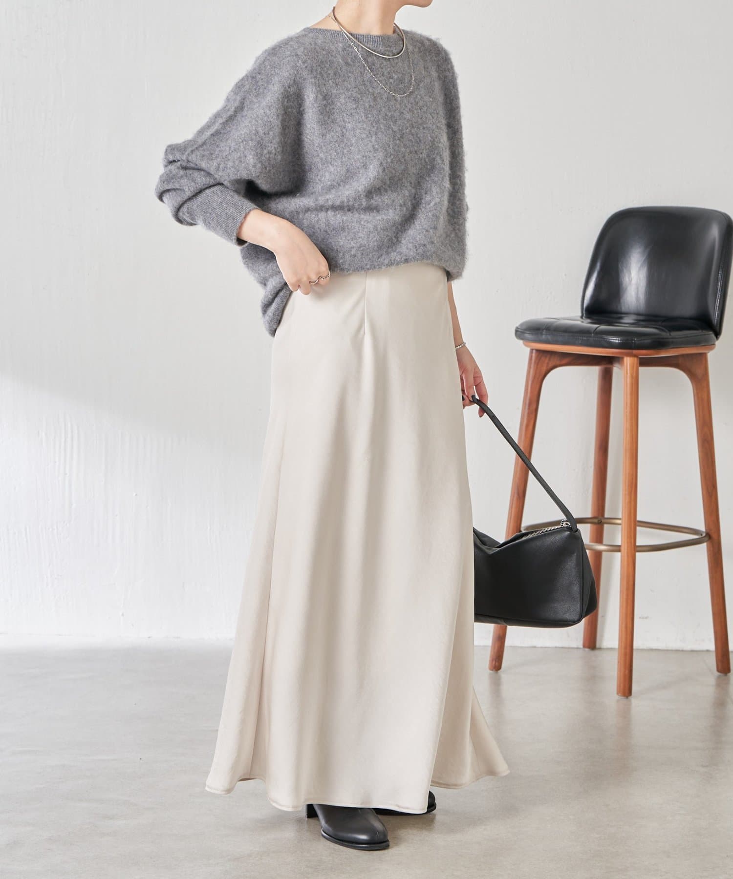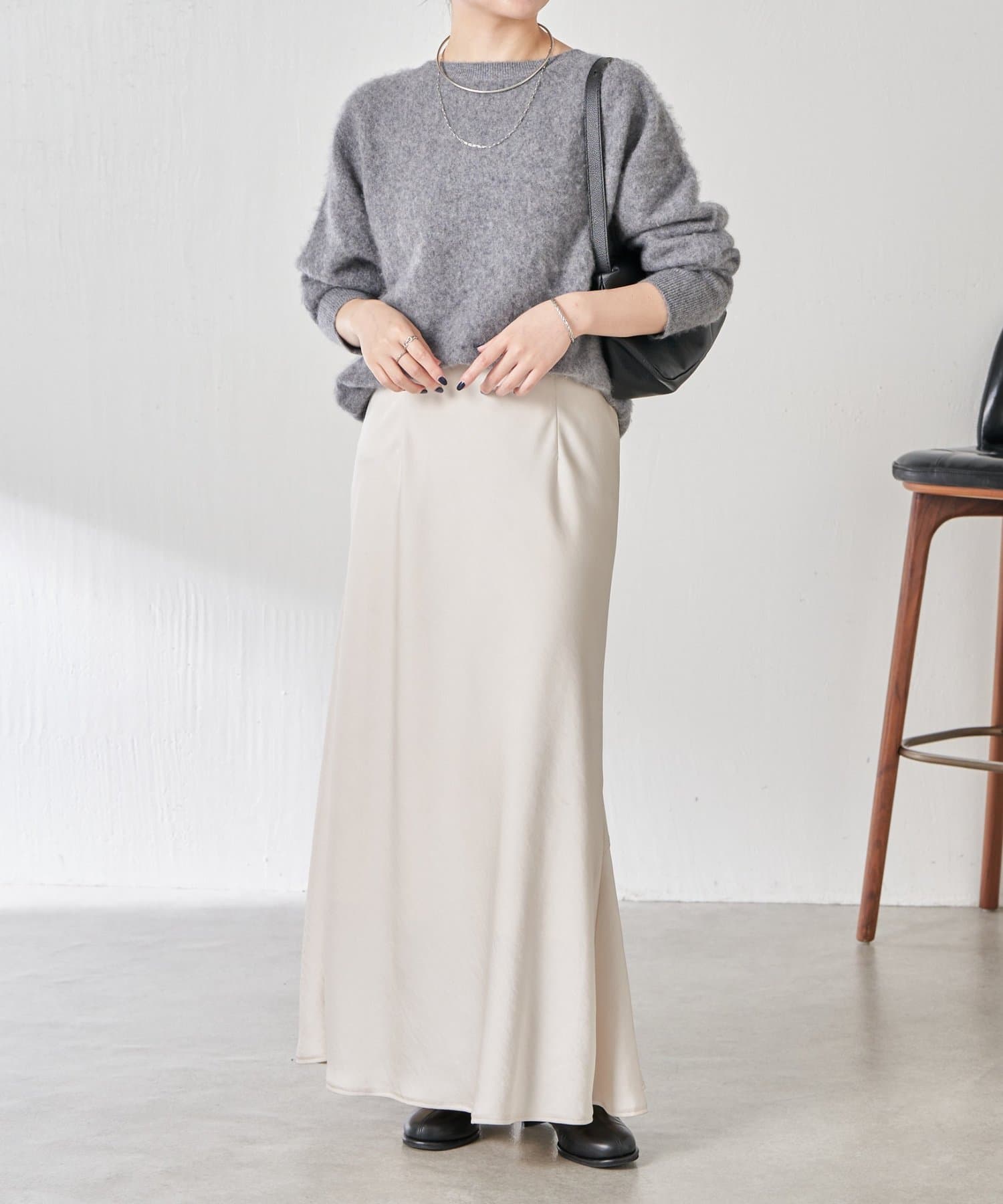 柔らかい印象のニットなのでサテンスカートやフレアスカートなど女性らしくまとめるのも素敵です。
