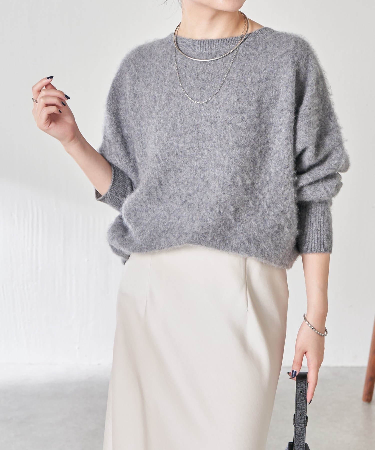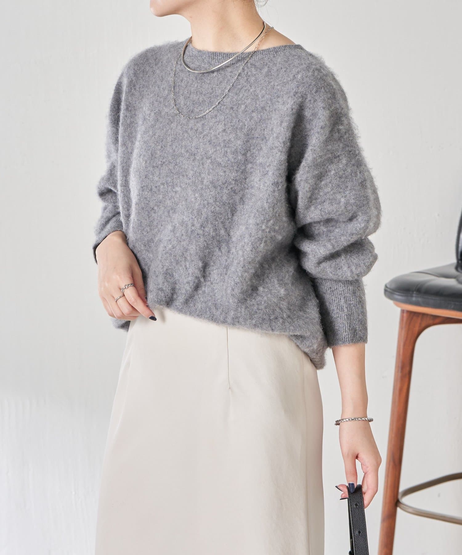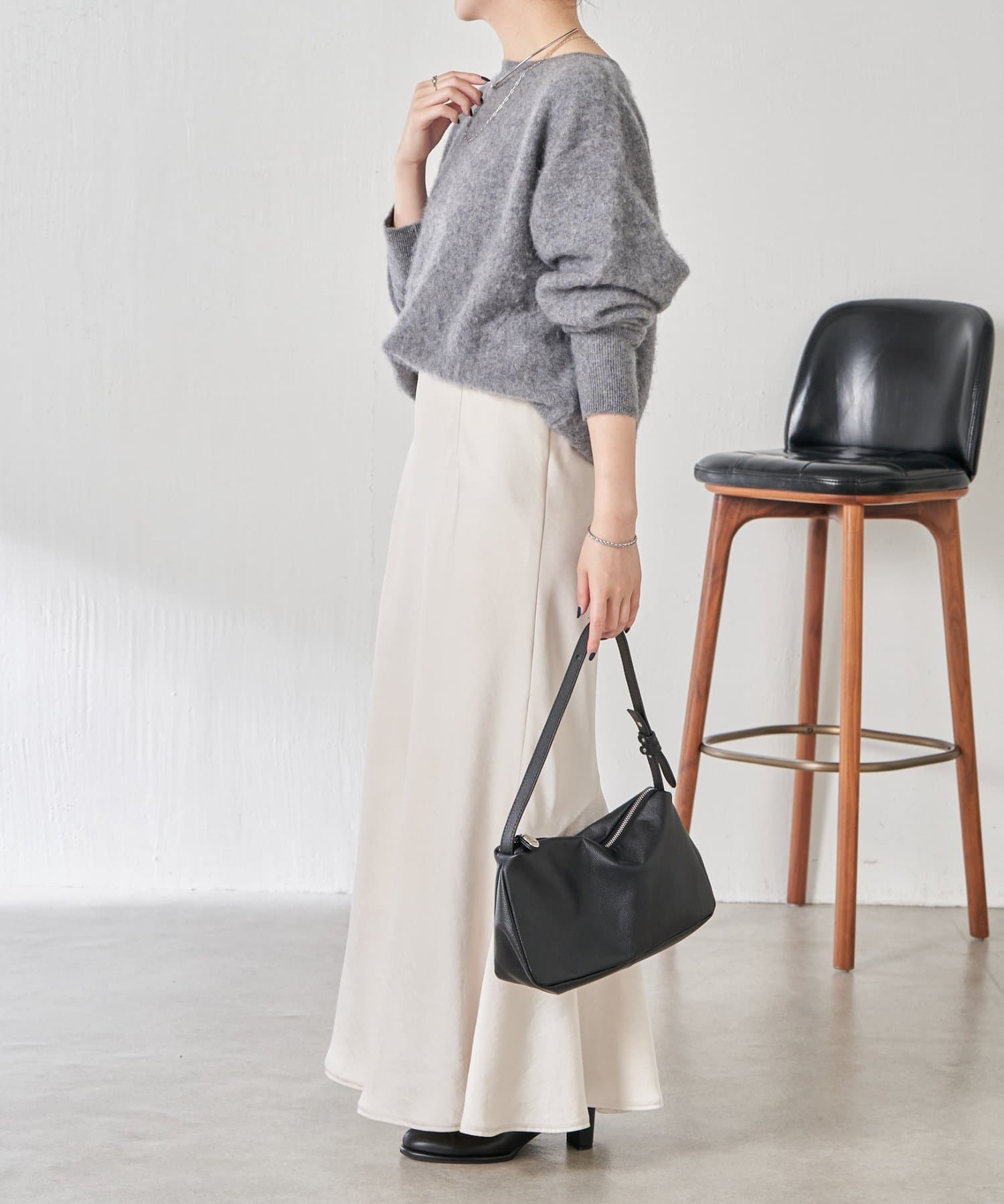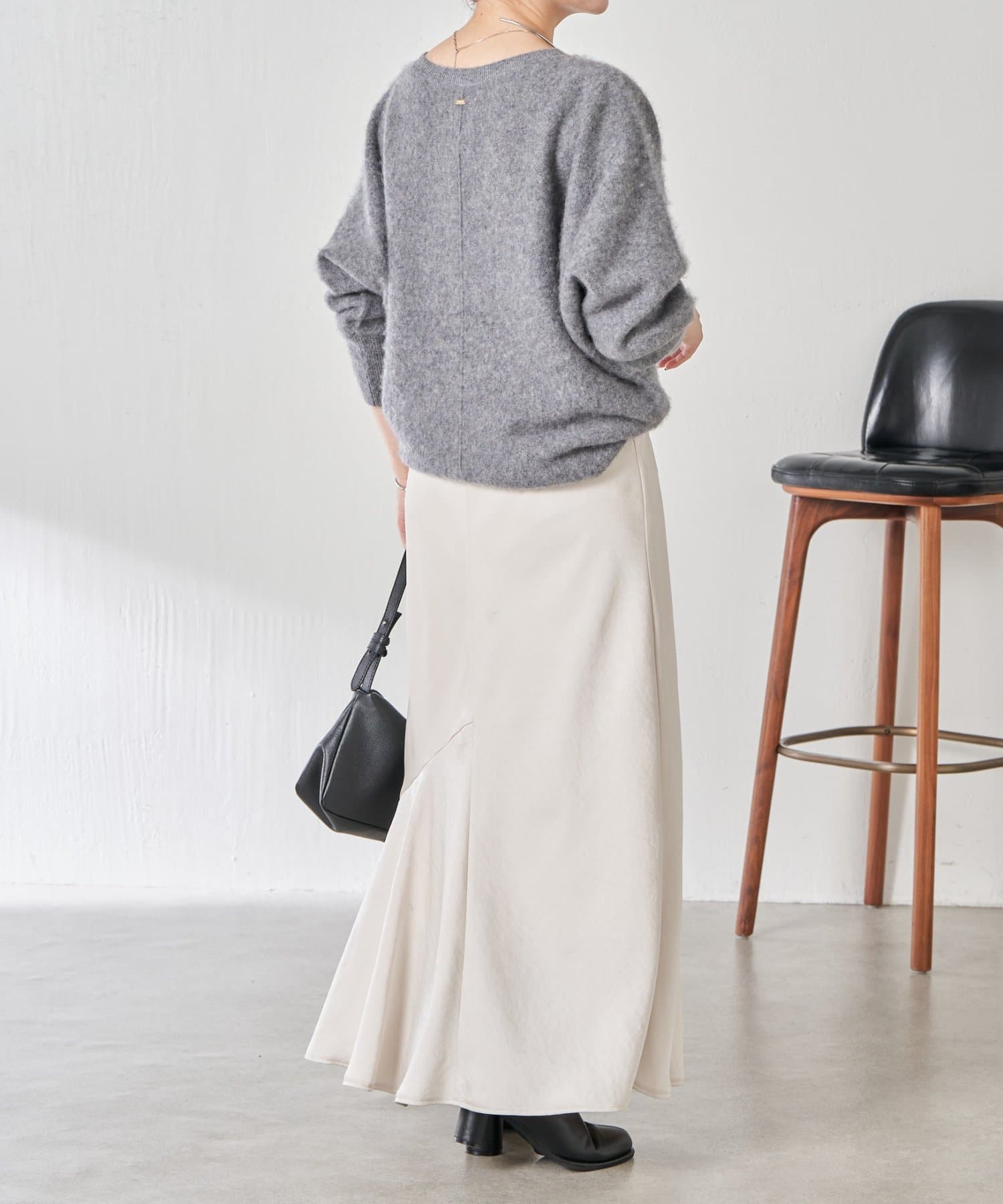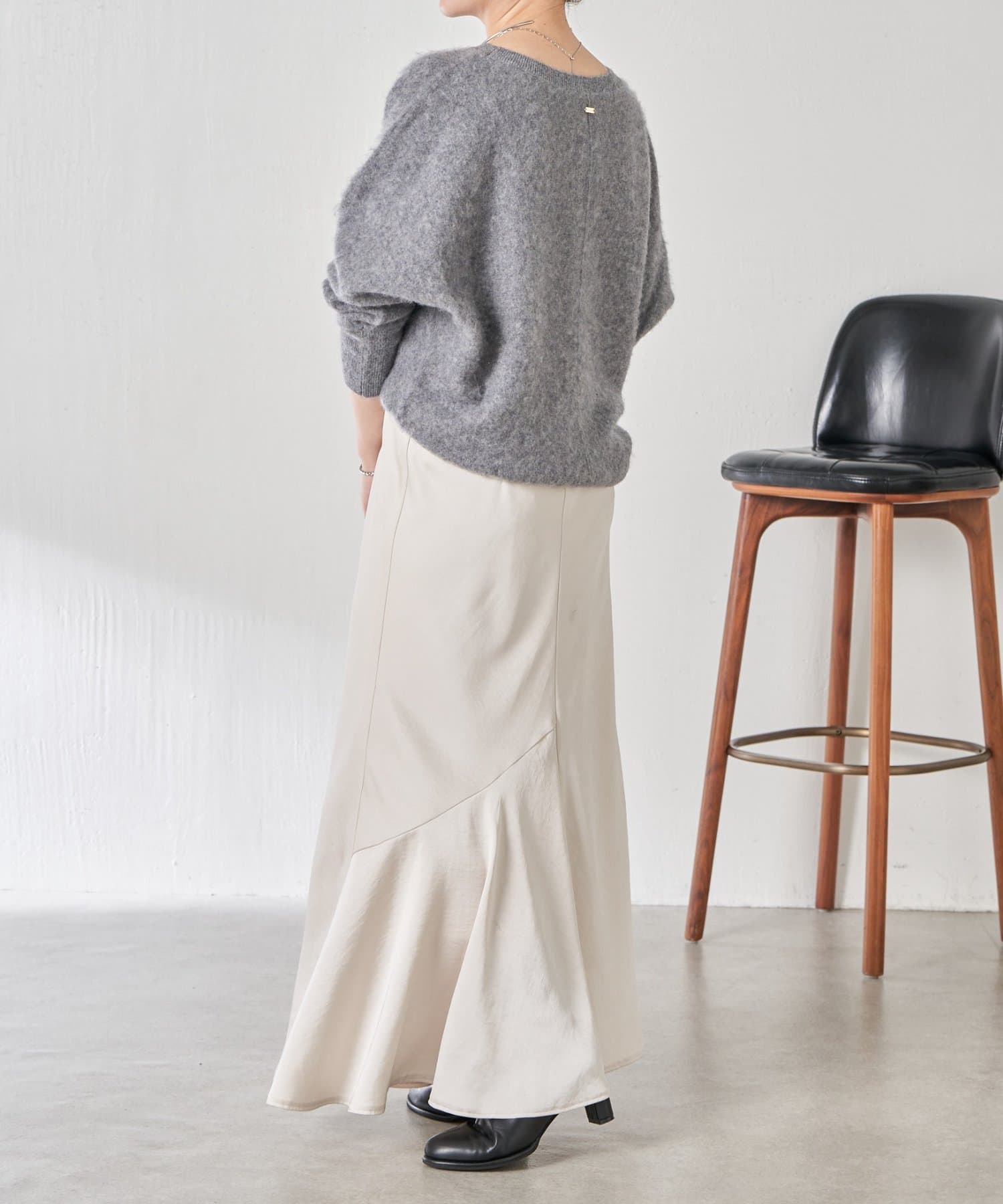 柔らかい印象のニットなのでサテンスカートやフレアスカートなど女性らしくまとめるのも素敵です。
