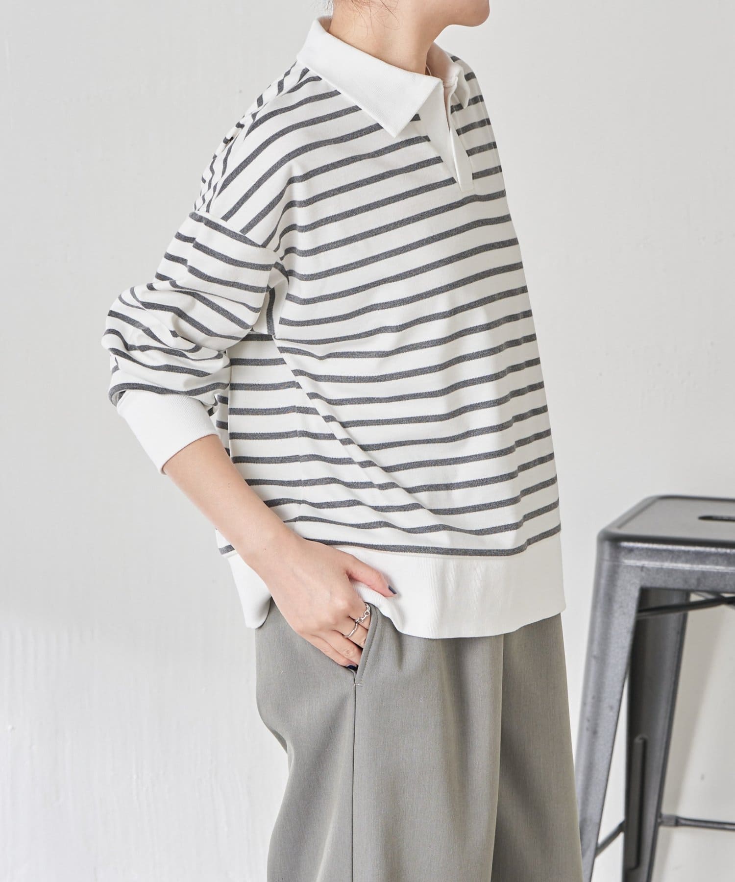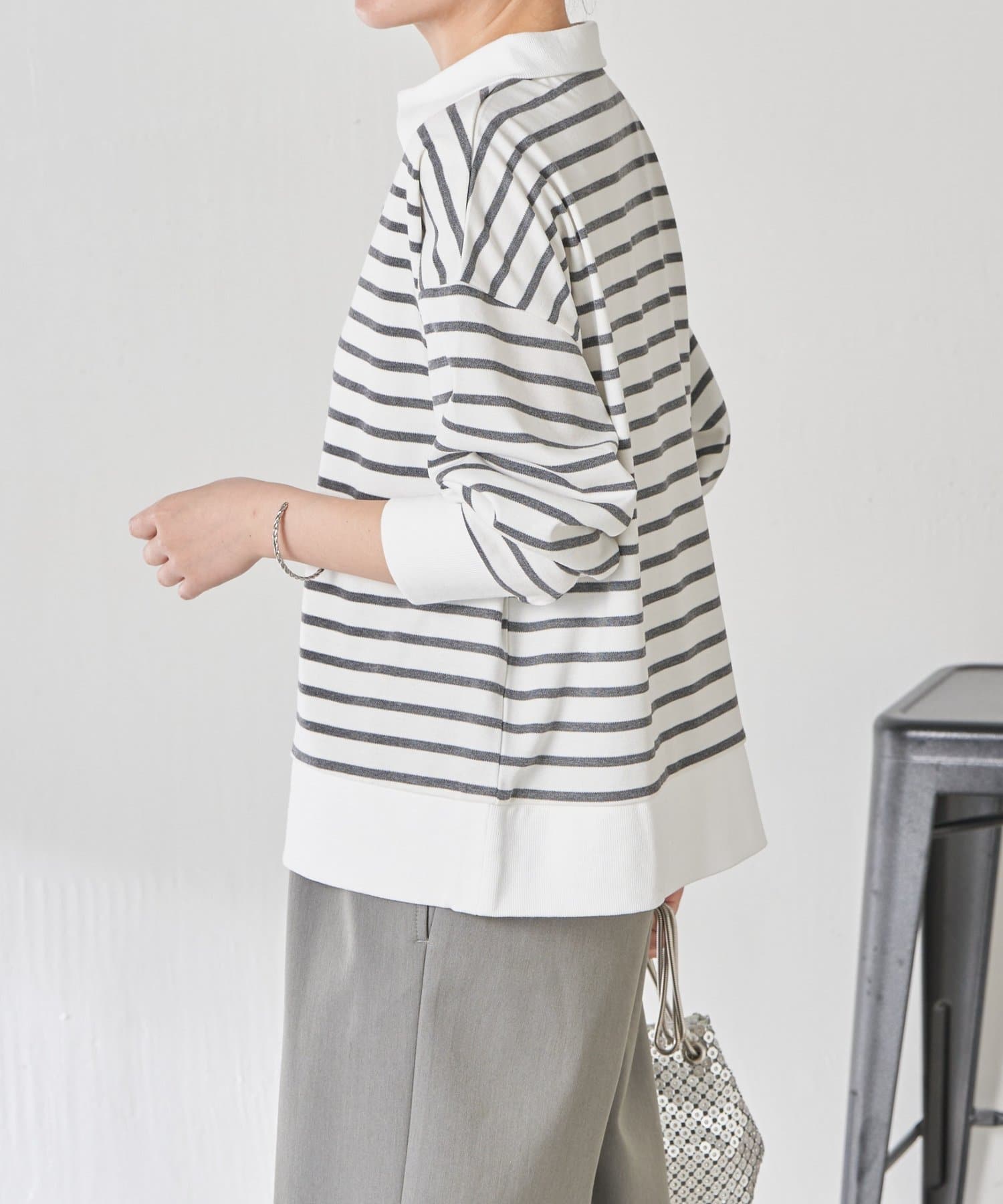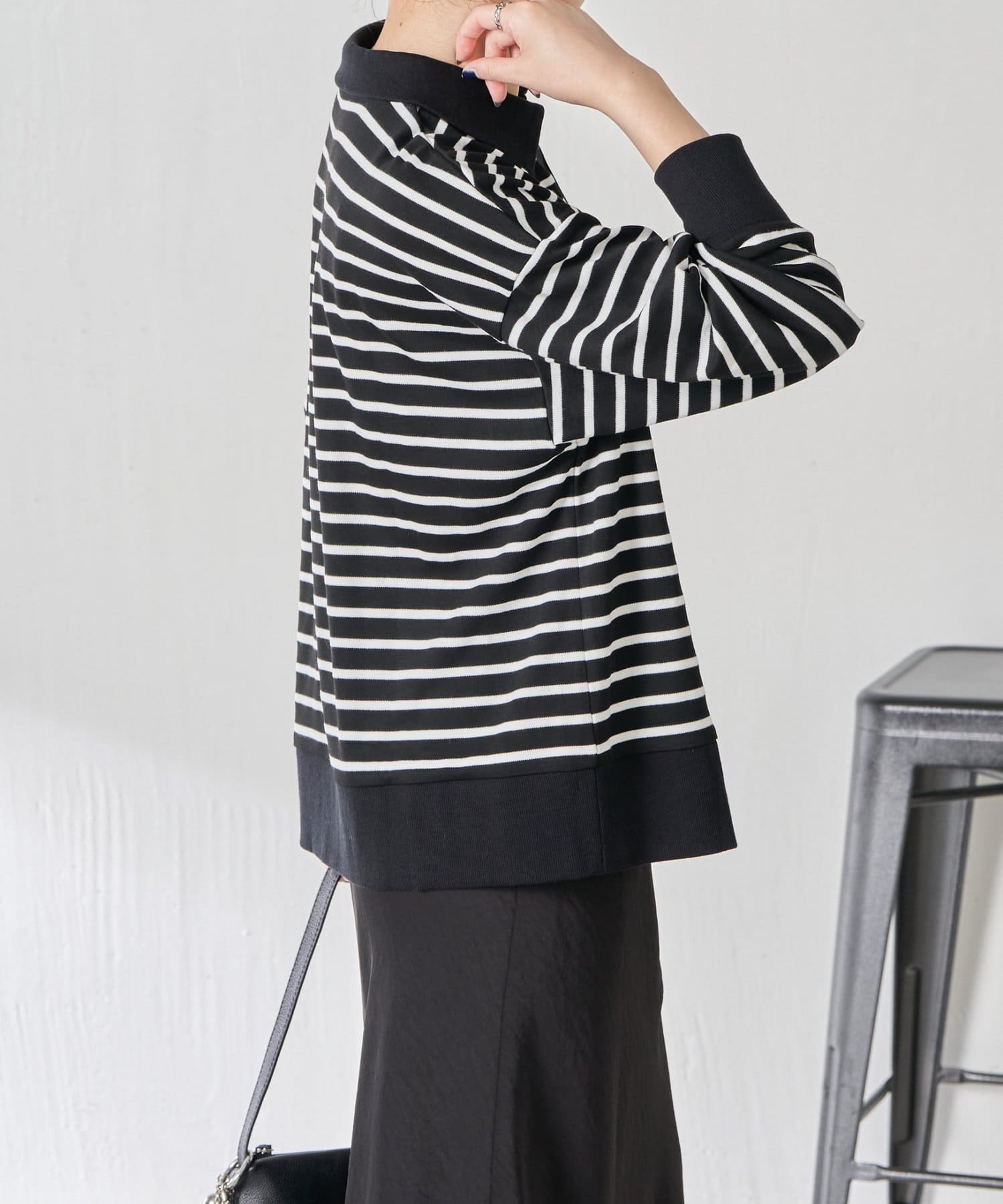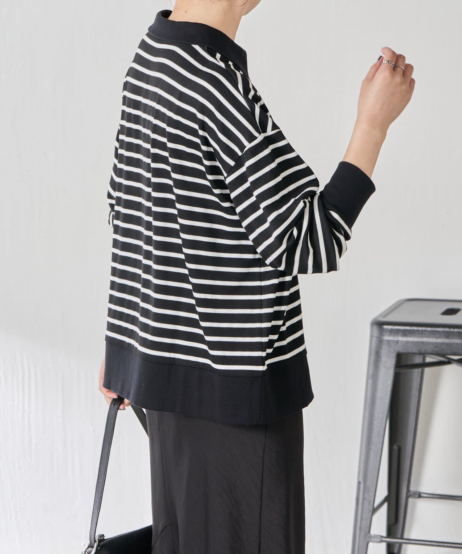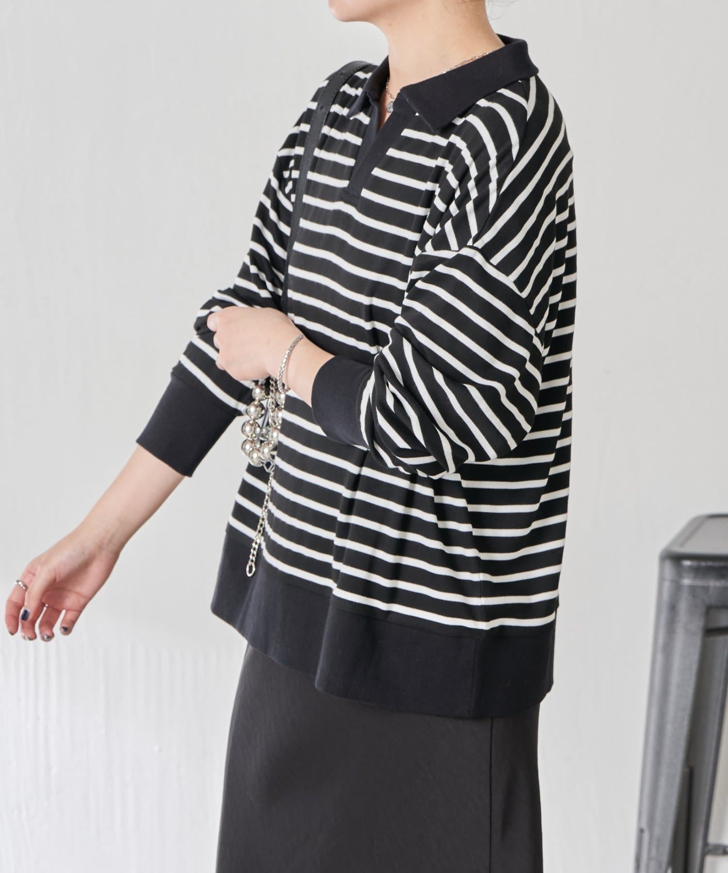 ・細めのボーダーなので、カジュアルにもきれいめにも着用できます。