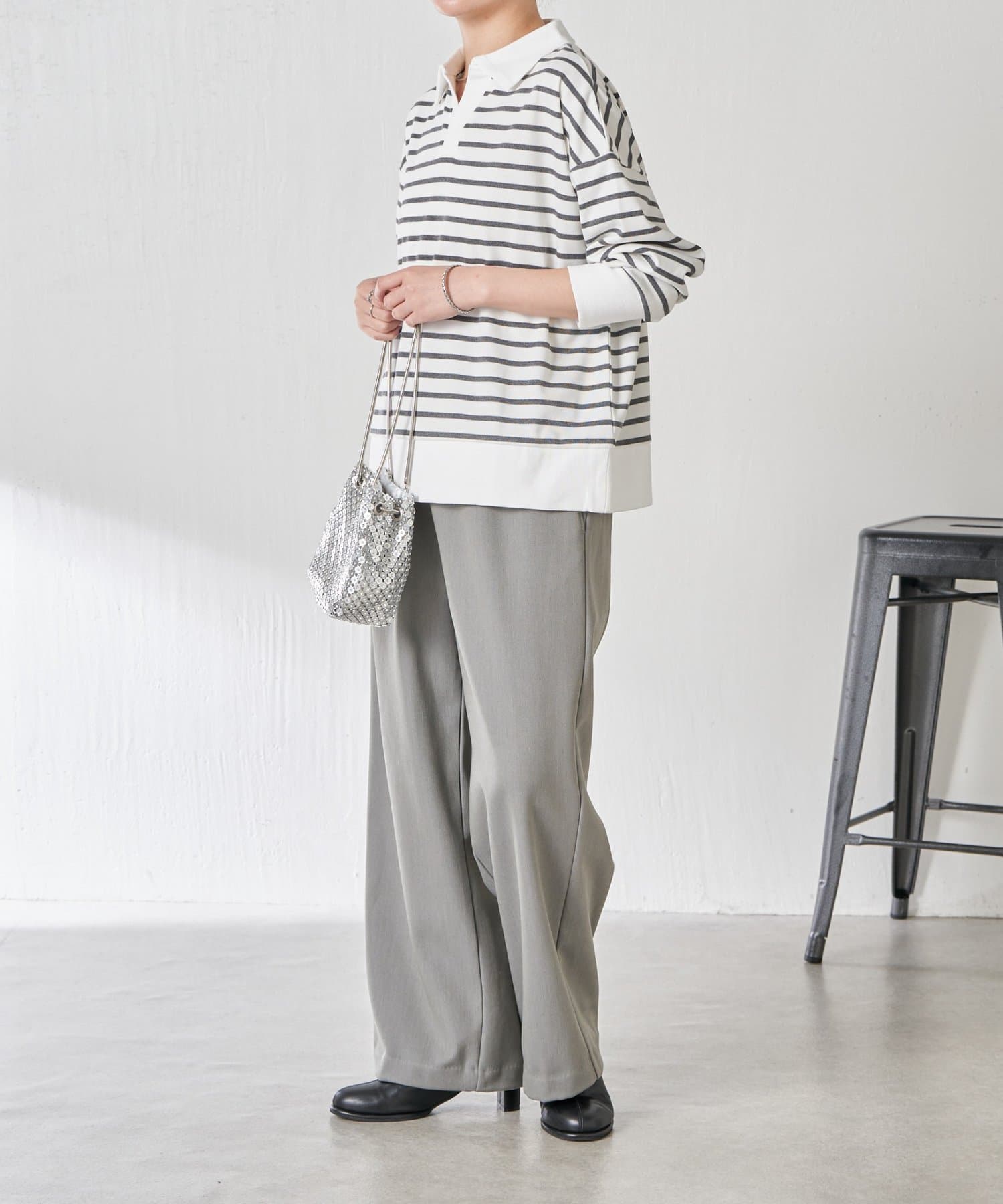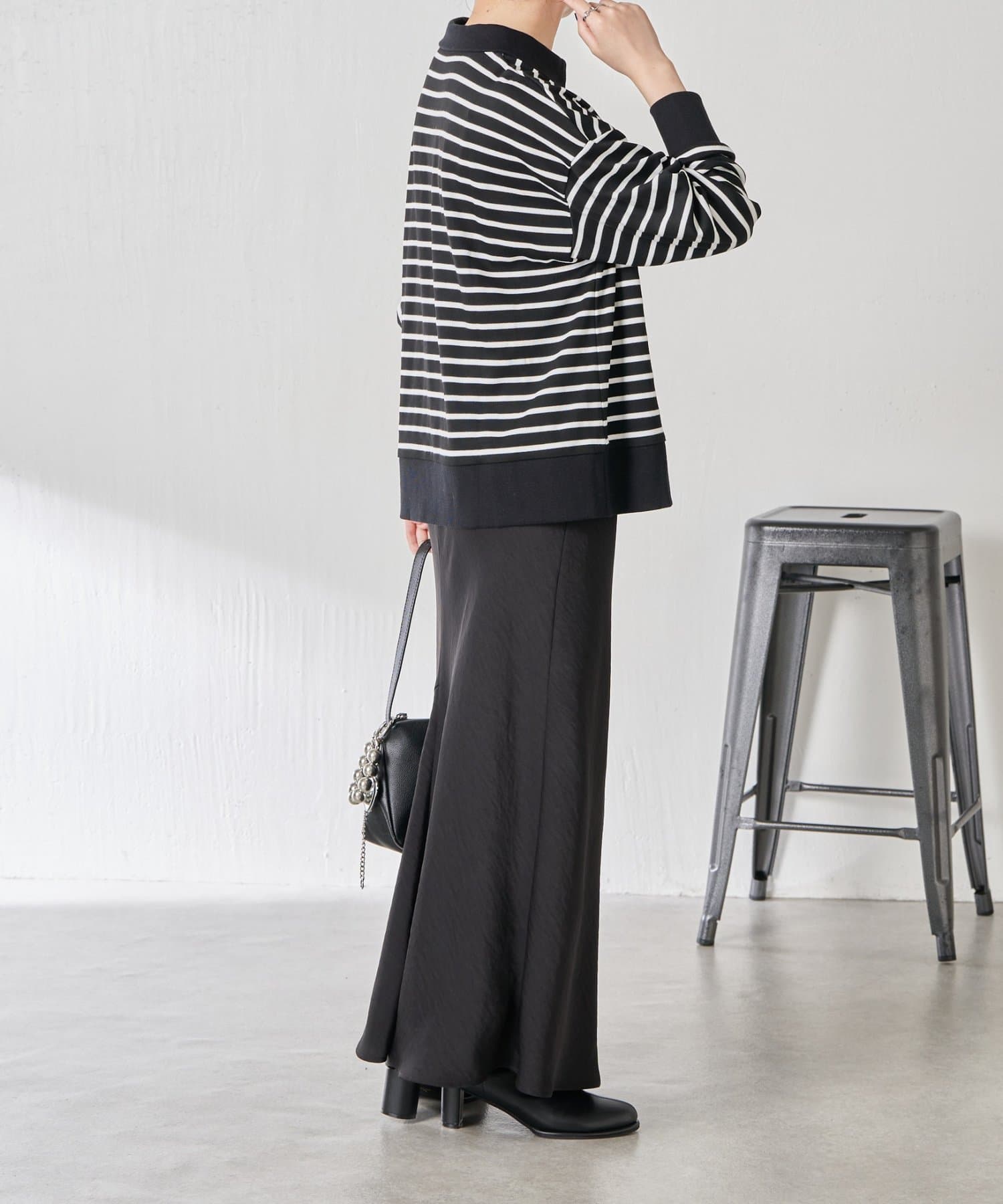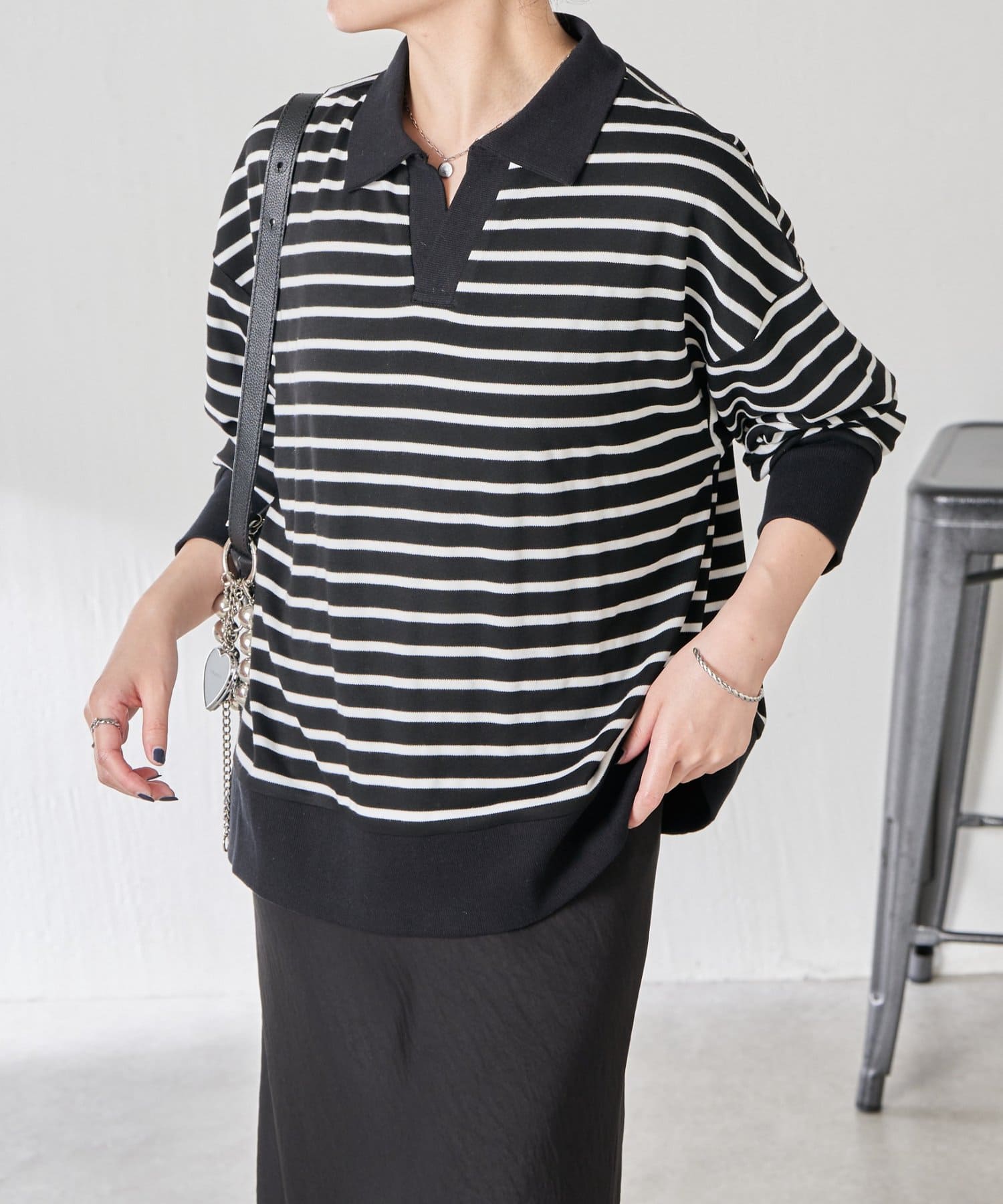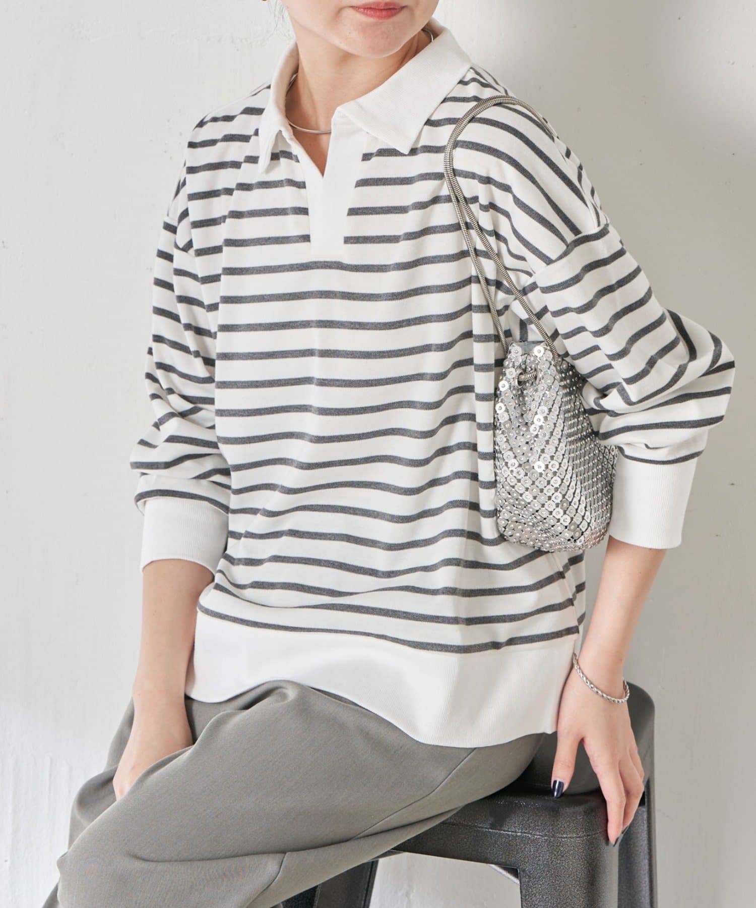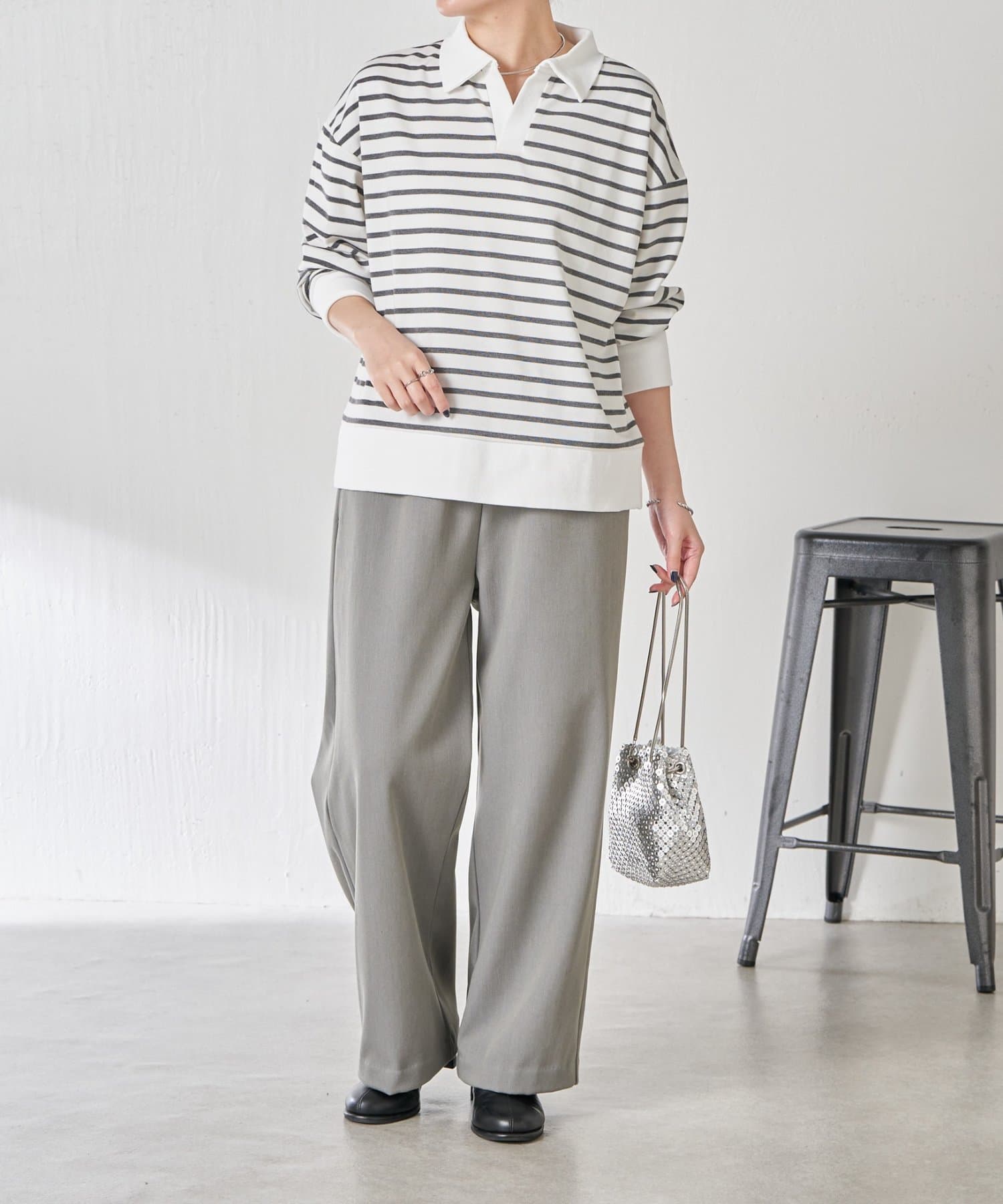 ・細めのボーダーなので、カジュアルにもきれいめにも着用できます。