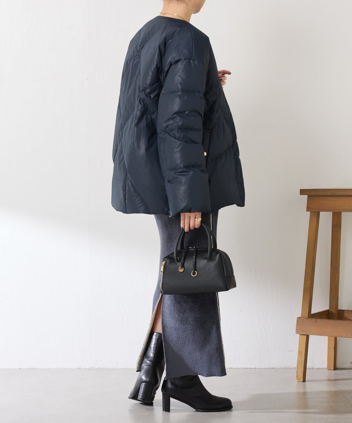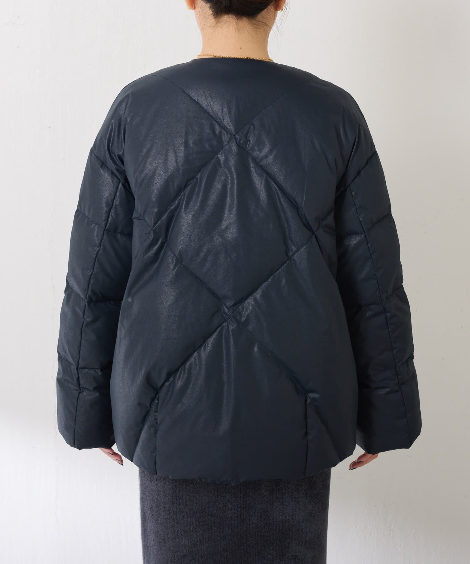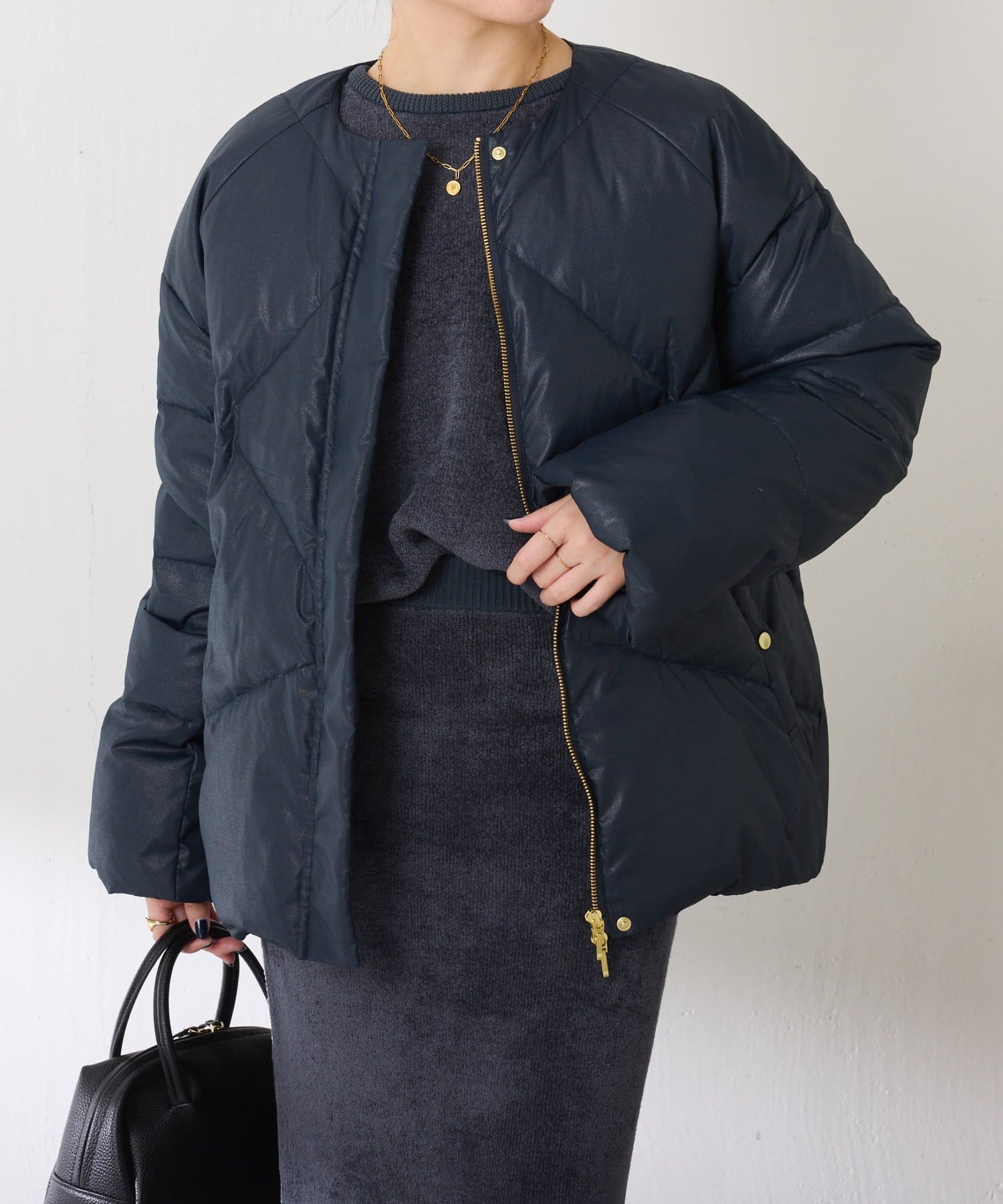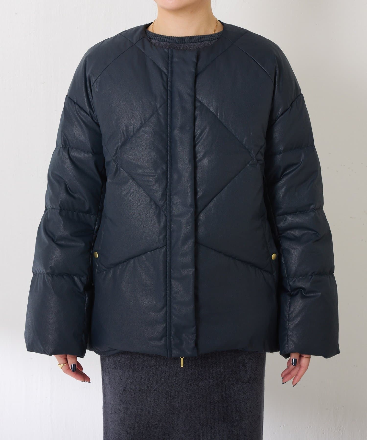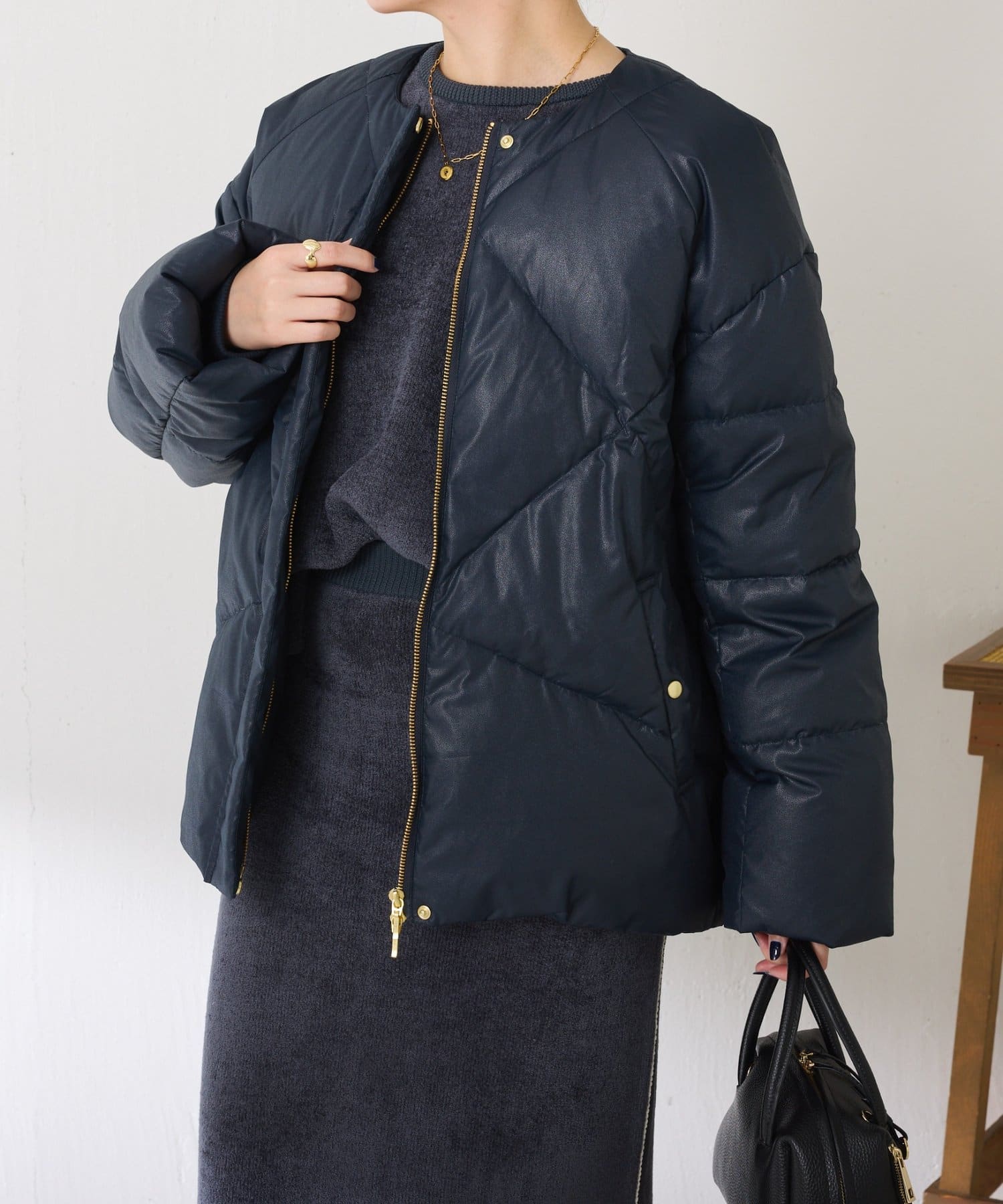 ・エンボス加工を施した生地でレザー見えするノーカラーダウン。マットな質感が落ち着いた印象になります◎
