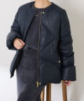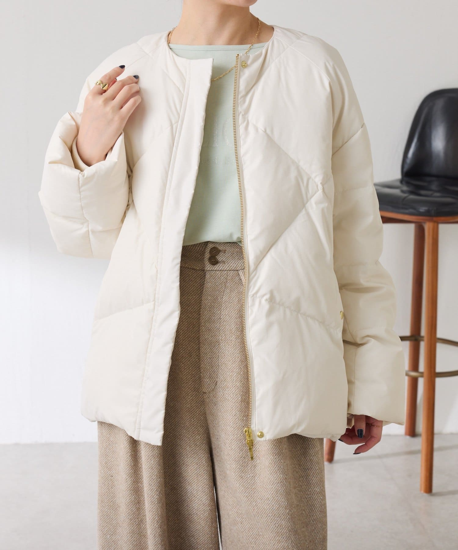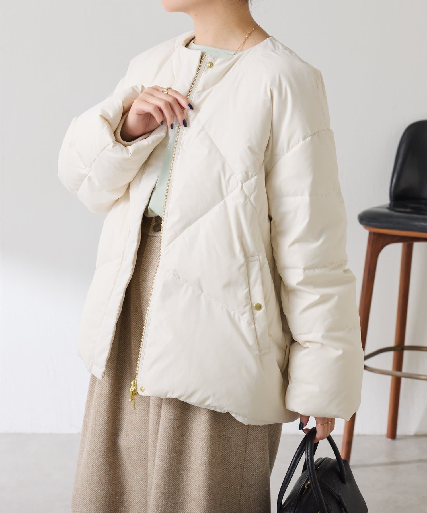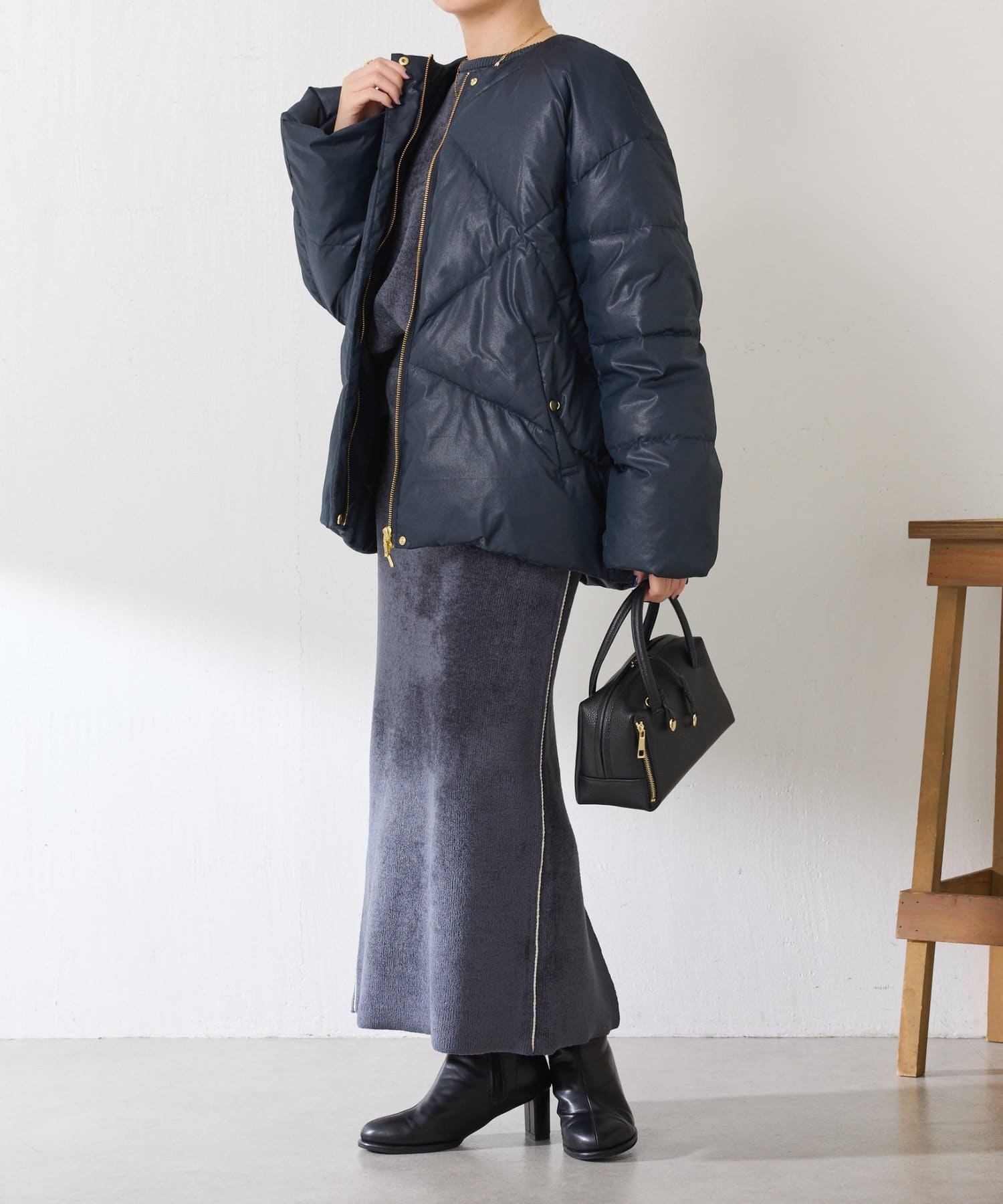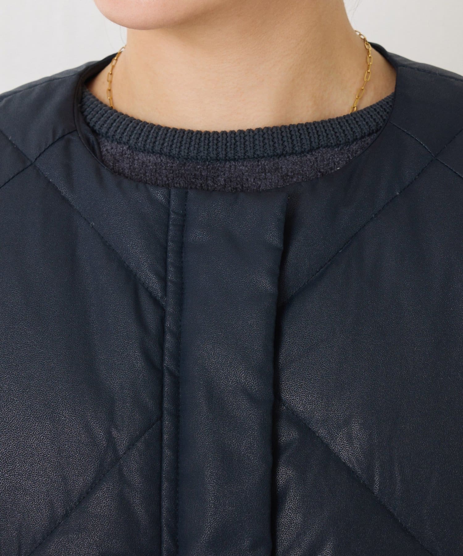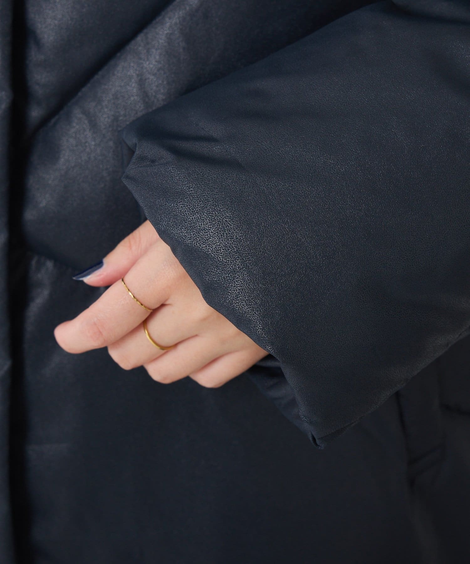 ・エンボス加工を施した生地でレザー見えするノーカラーダウン。マットな質感が落ち着いた印象になります◎