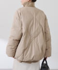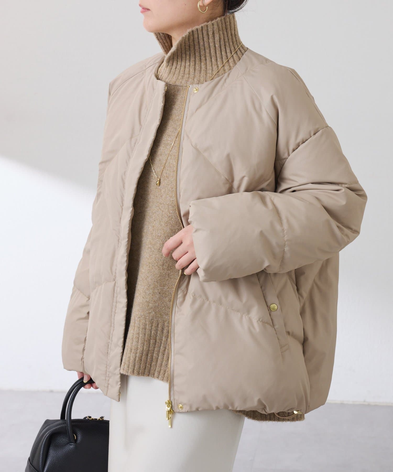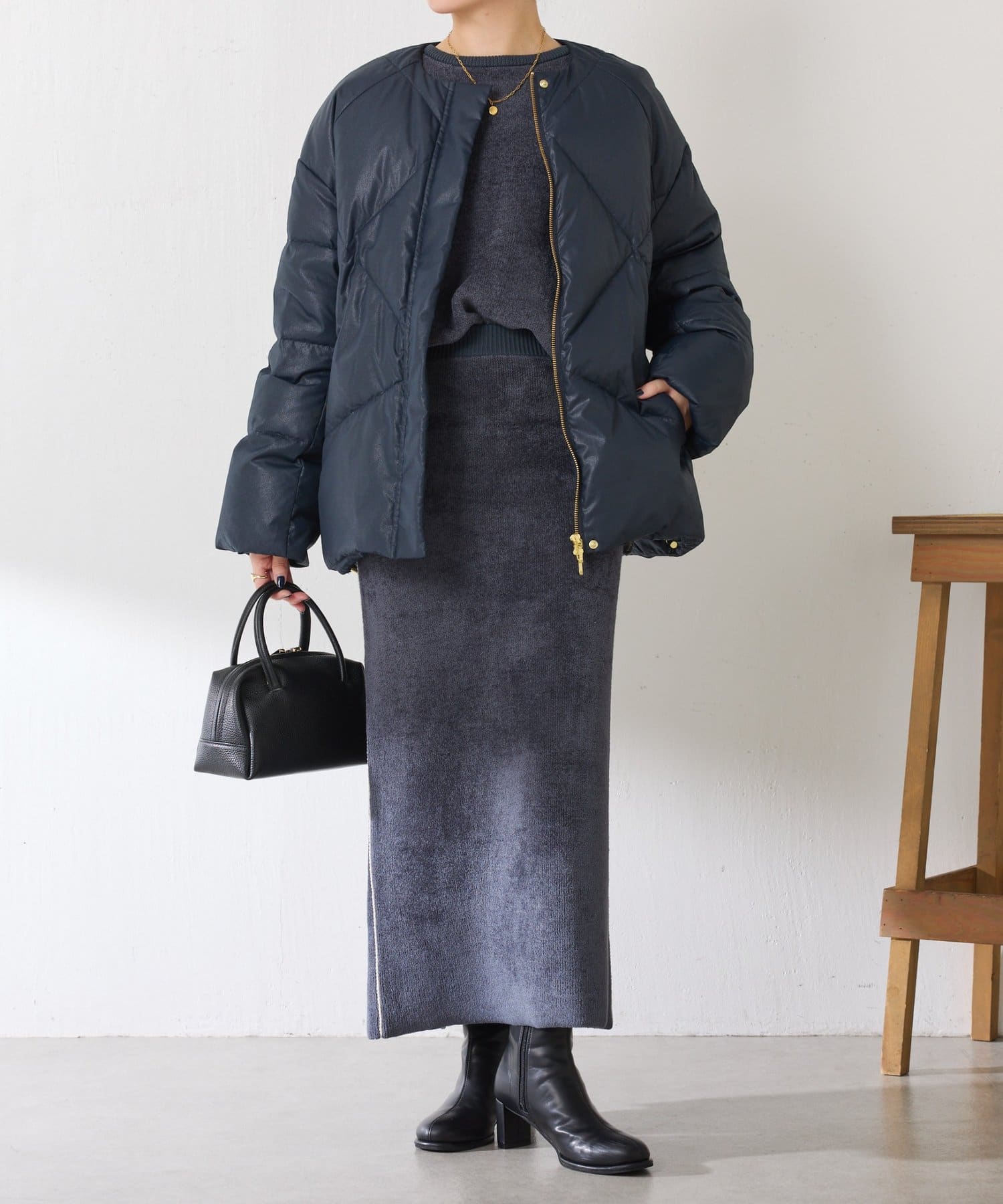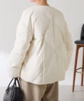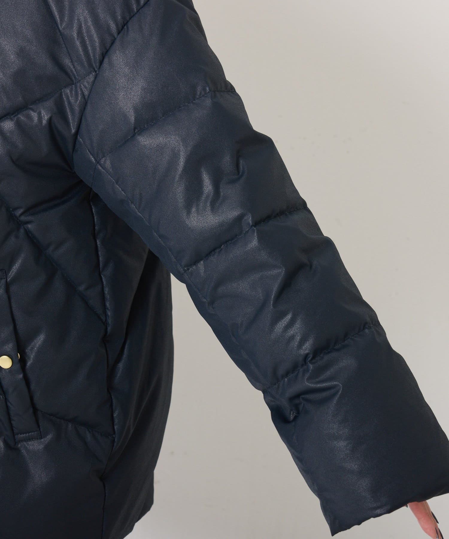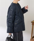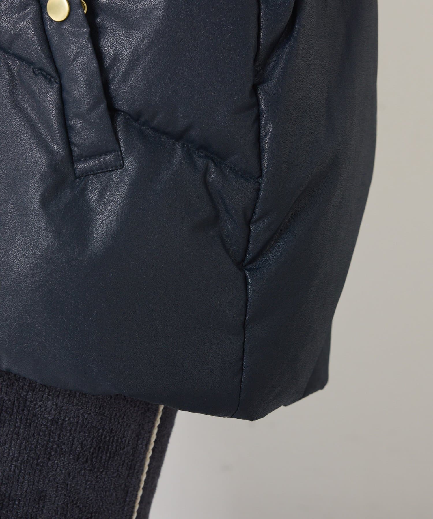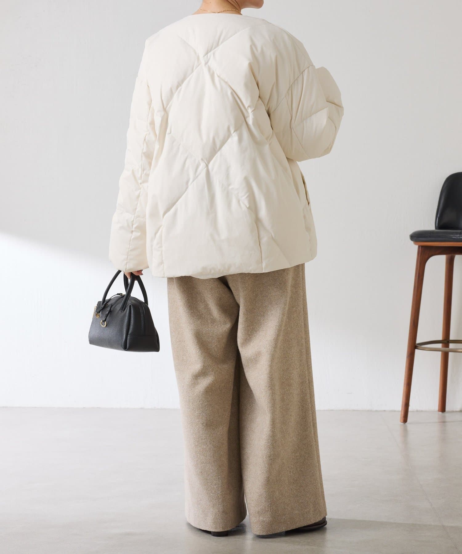 ・エンボス加工を施した生地でレザー見えするノーカラーダウン。マットな質感が落ち着いた印象になります◎