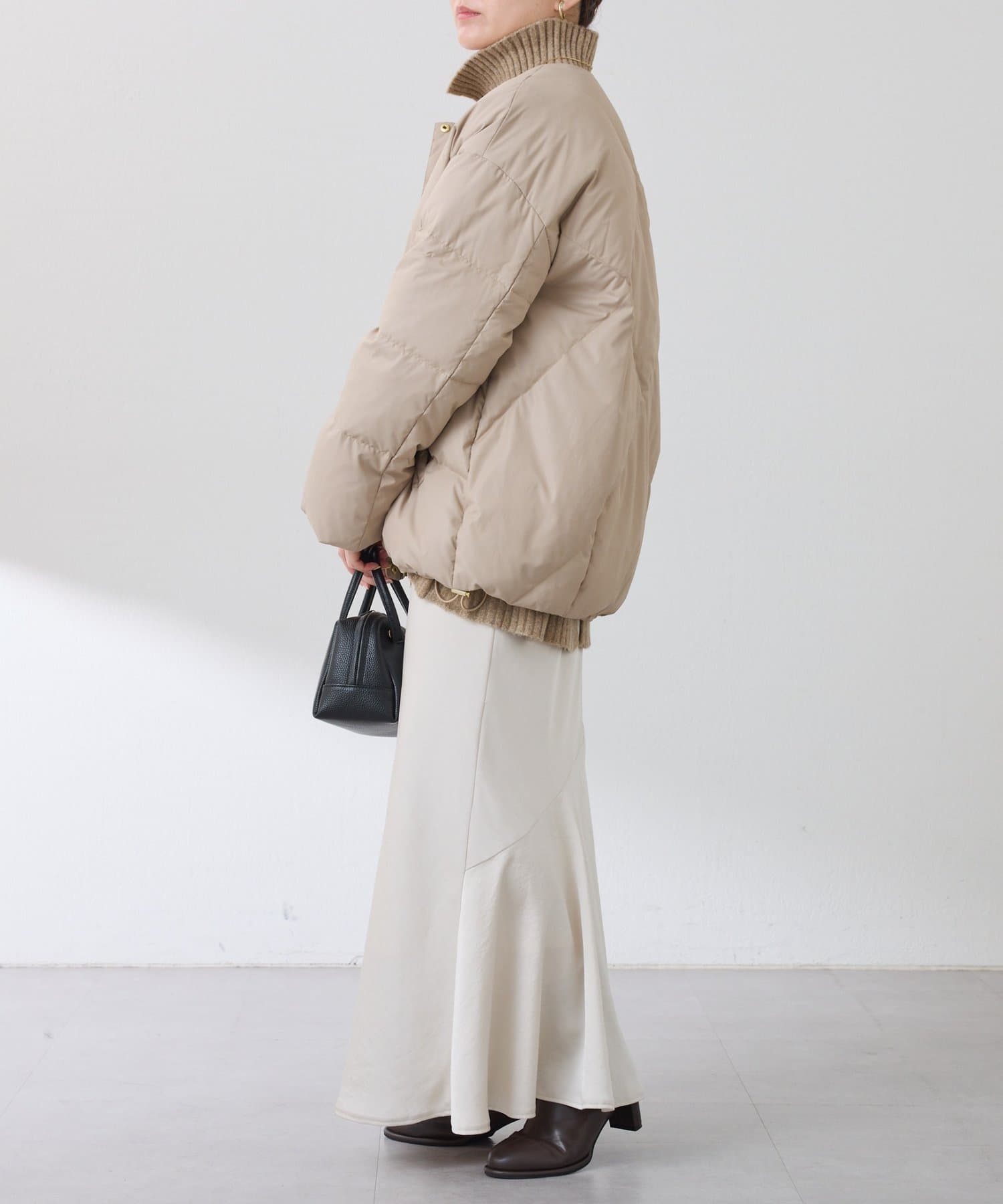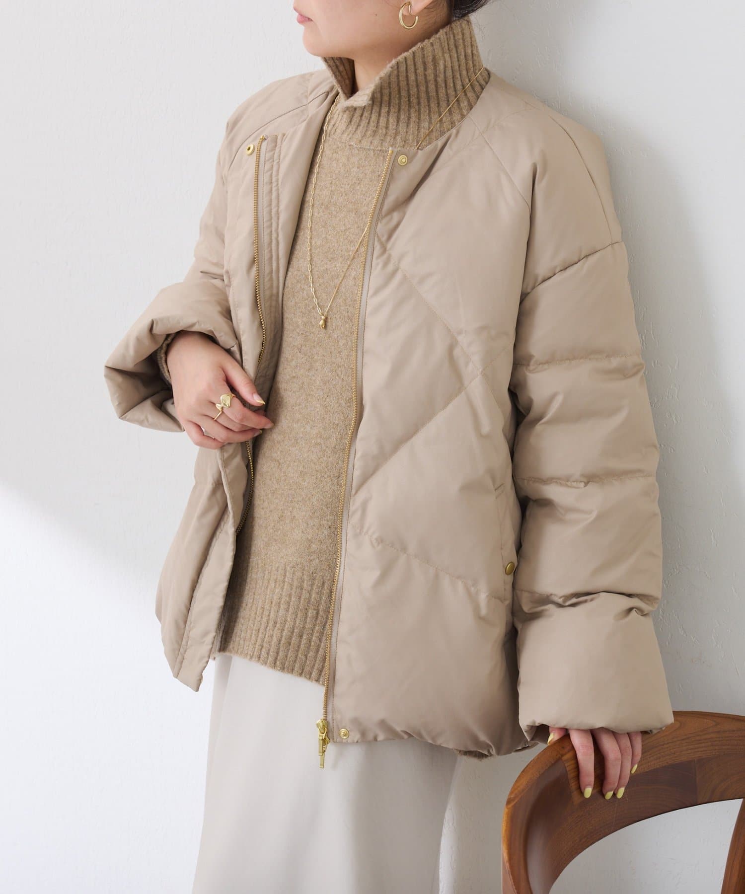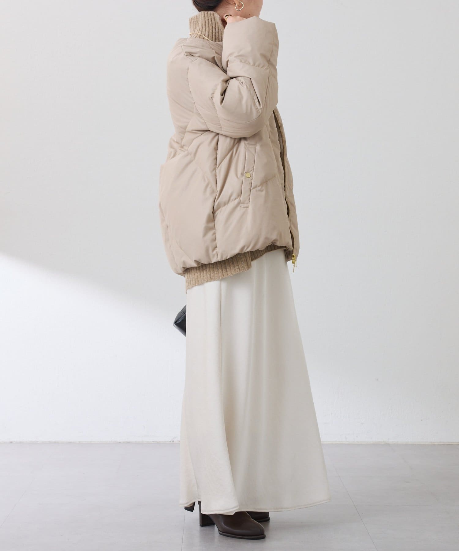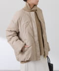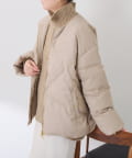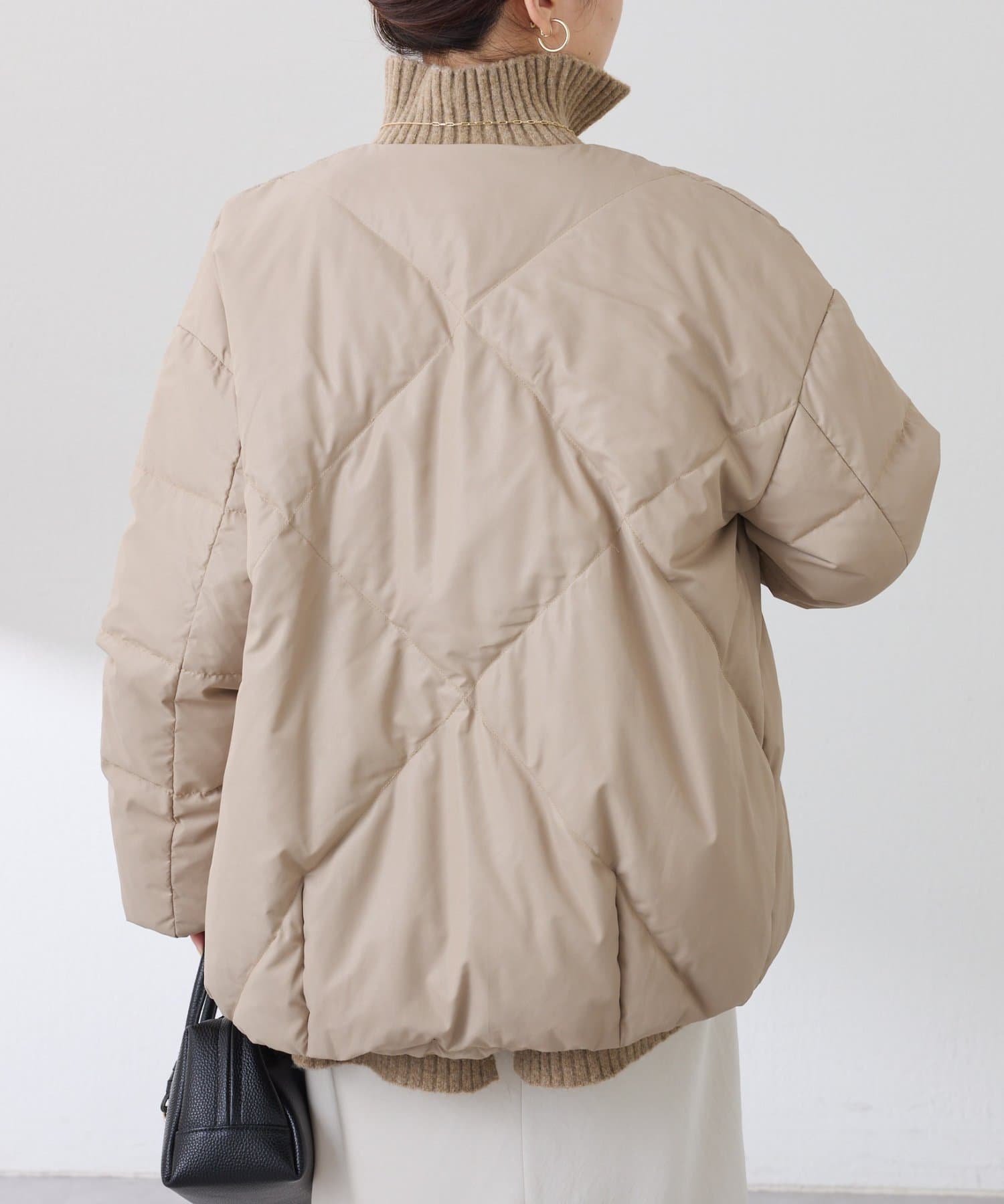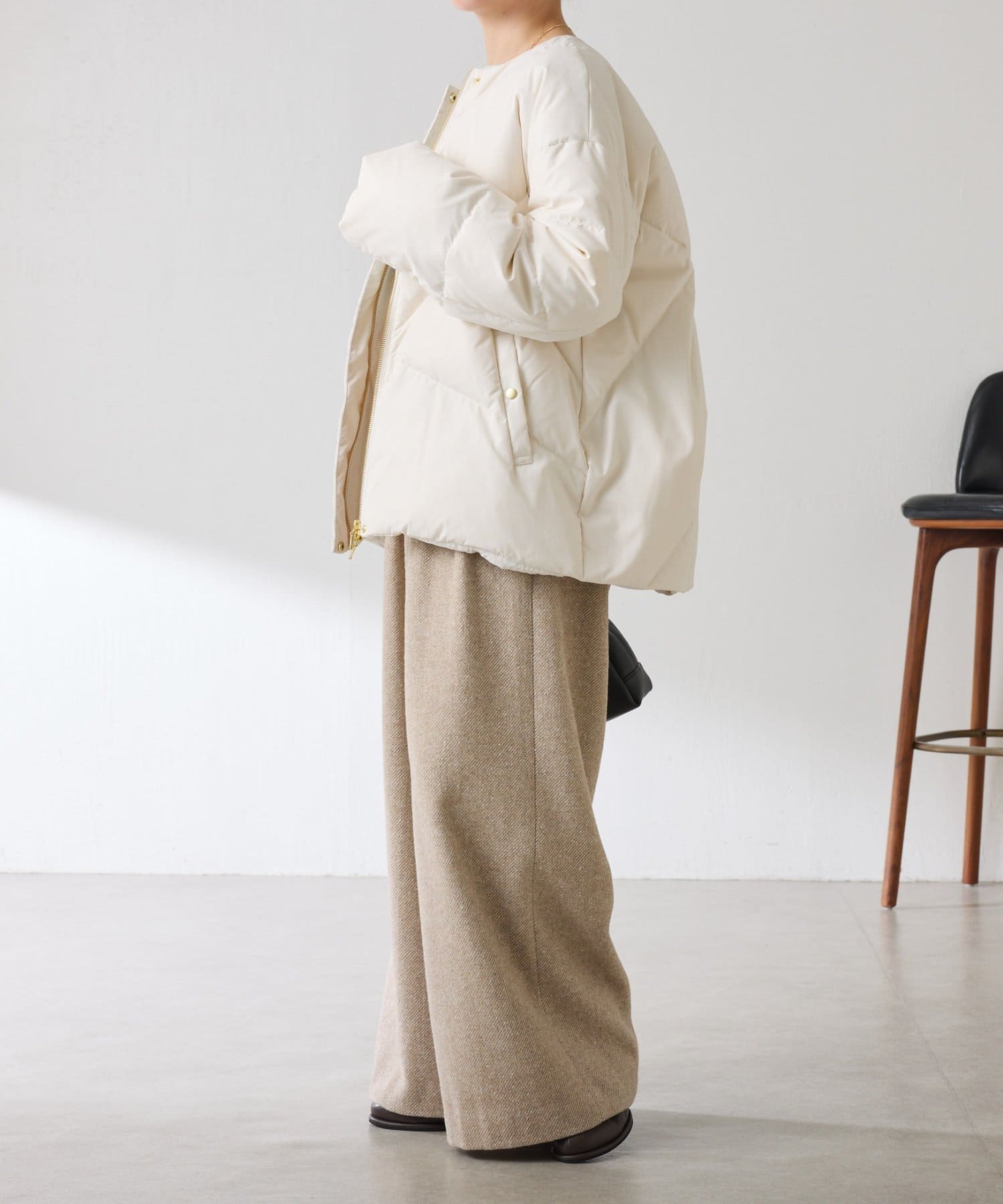 ・エンボス加工を施した生地でレザー見えするノーカラーダウン。マットな質感が落ち着いた印象になります◎