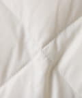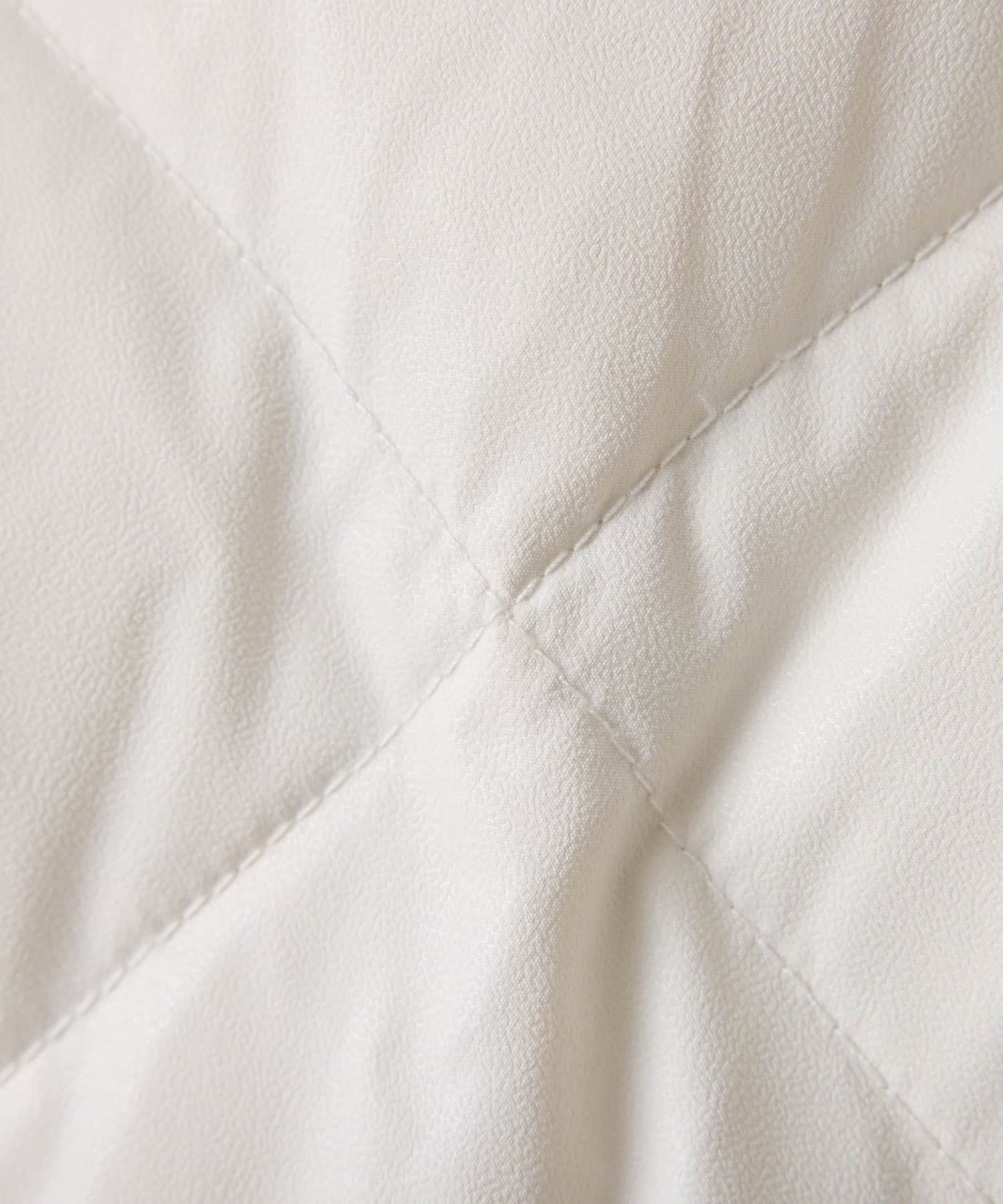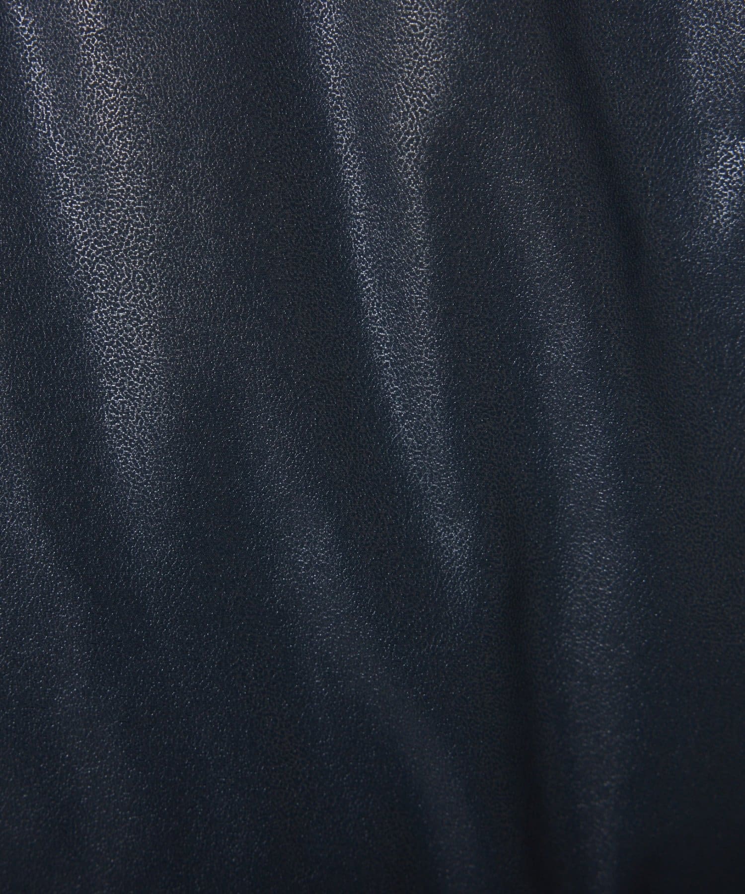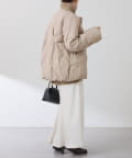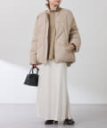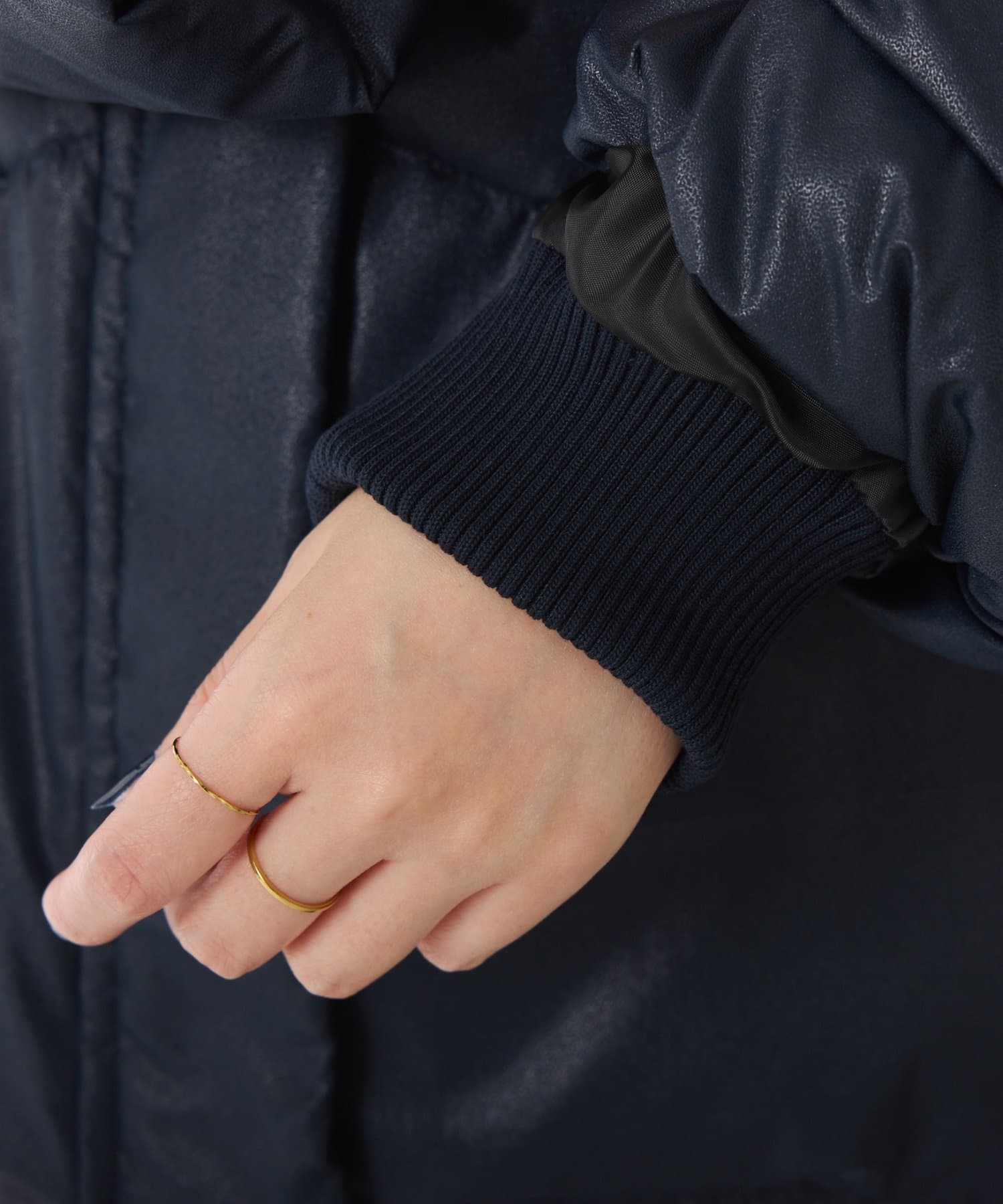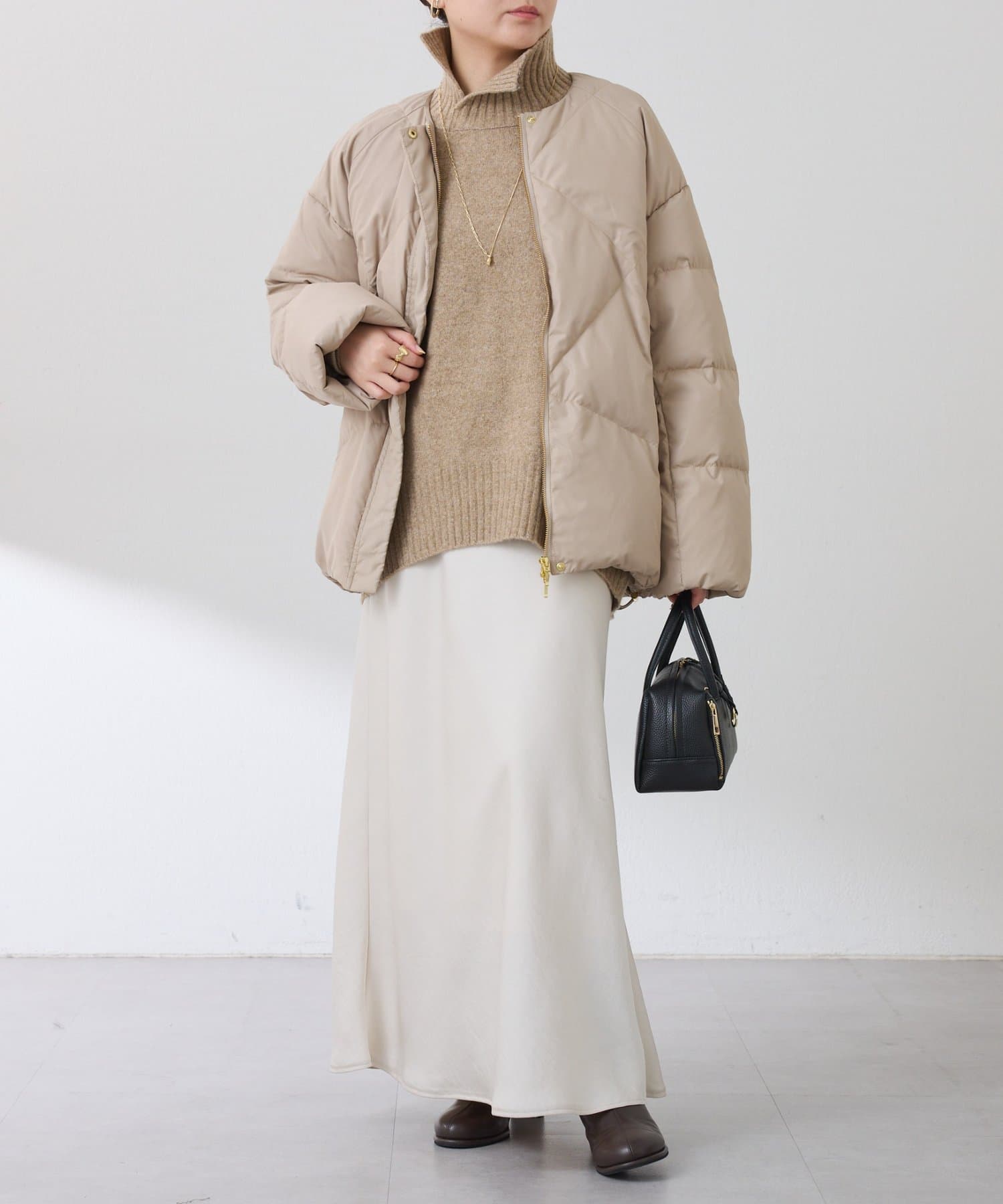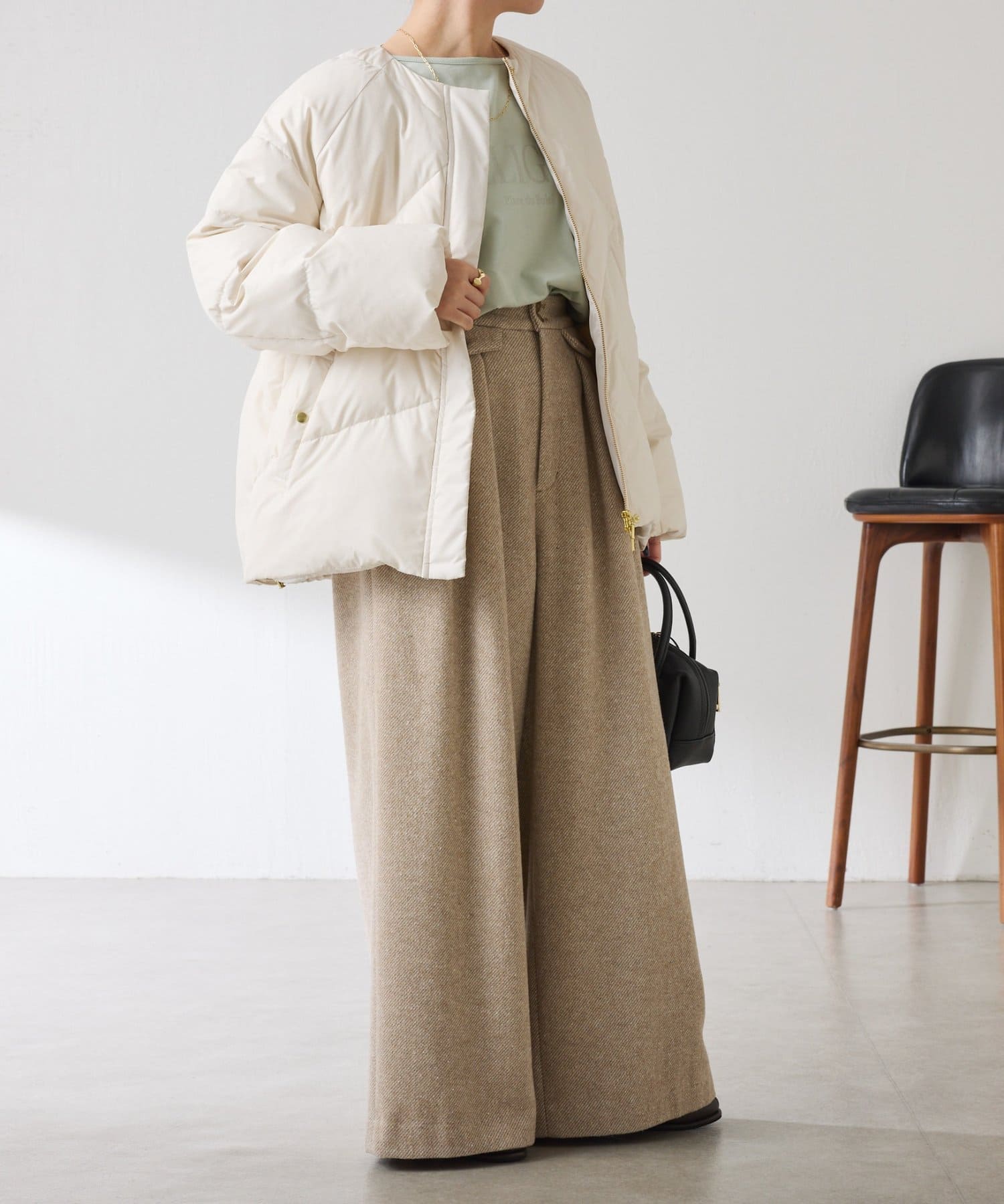・エンボス加工を施した生地でレザー見えするノーカラーダウン。マットな質感が落ち着いた印象になります◎