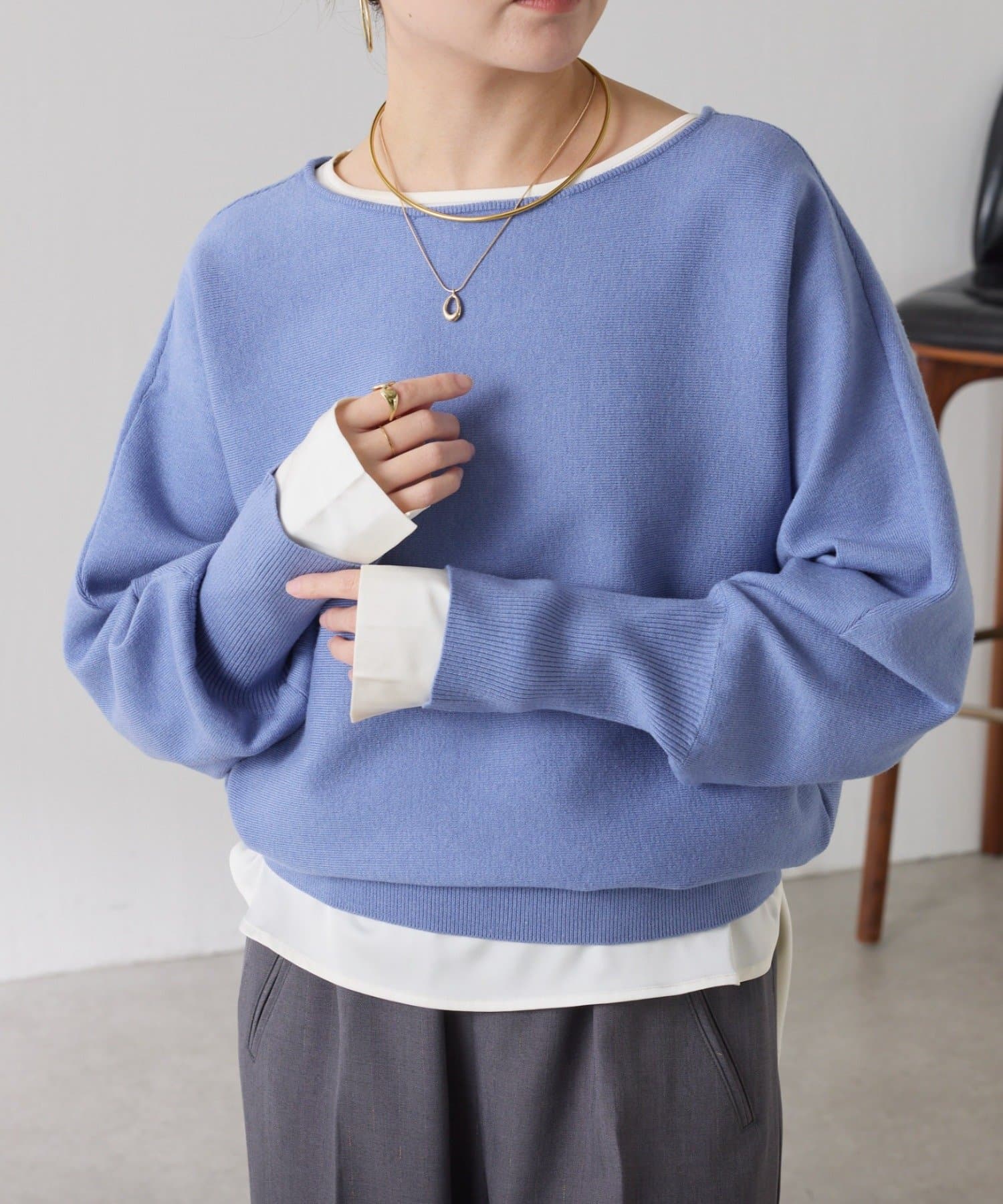 冬場にはニットと重ねて裾や袖口からツヤ感を覗かせて抜け感をプラスできます◎
