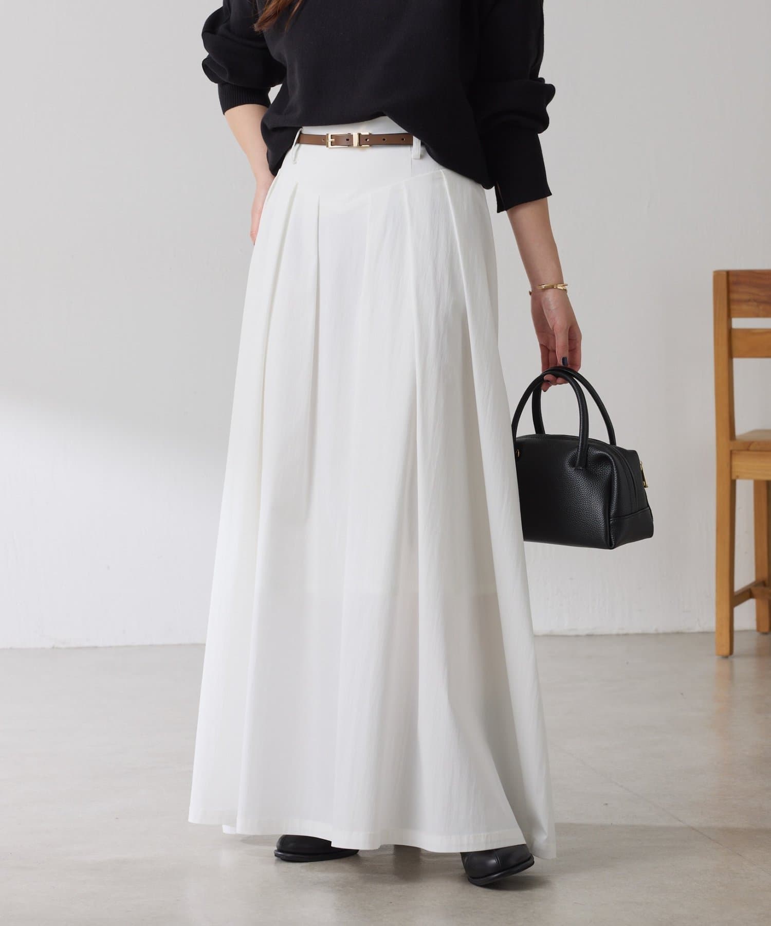 ブラック:マットな光沢がシルエットを引き立ててくれます。トップスは明るいトーンのお色にすると柔らかさをプラスできます。