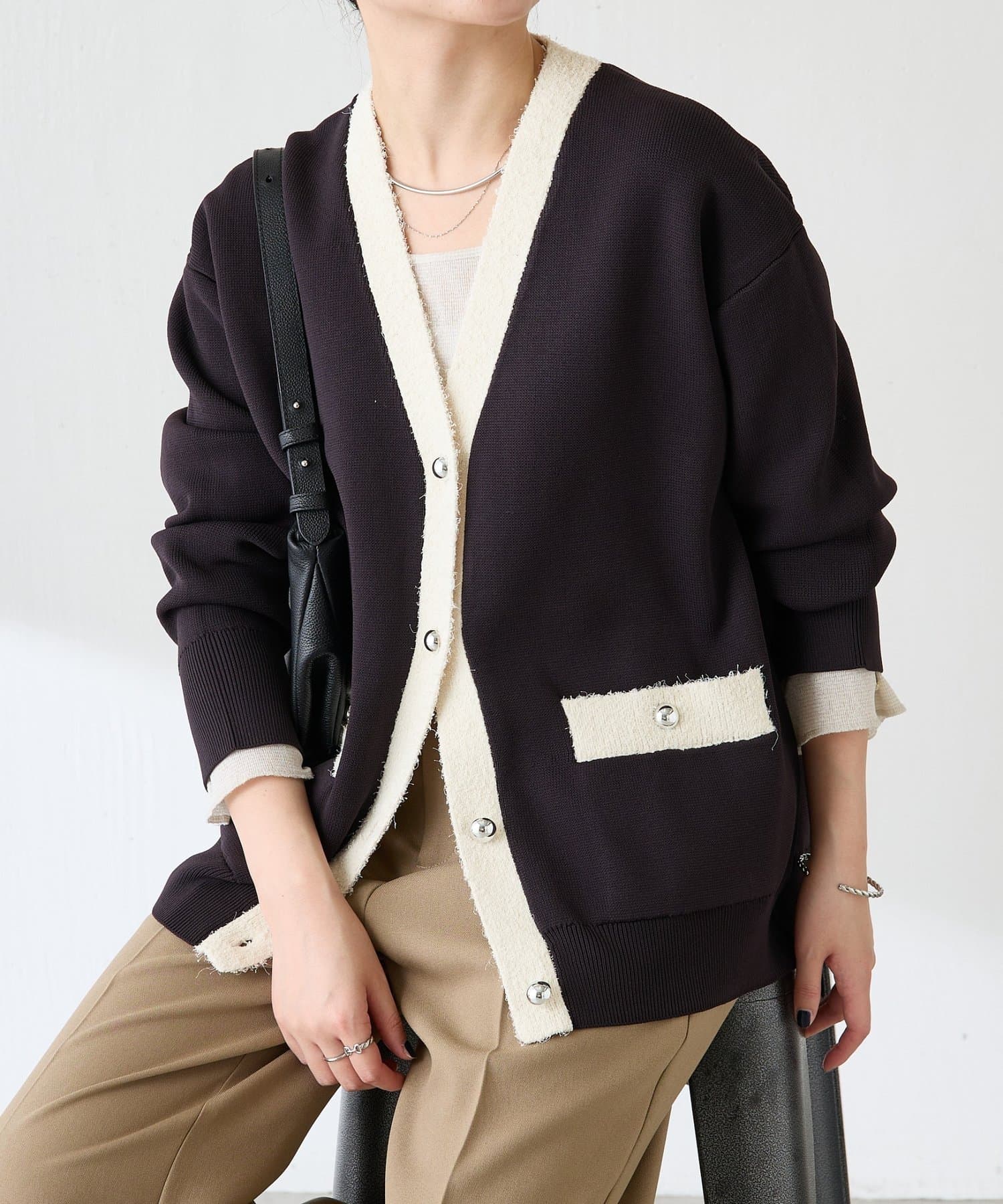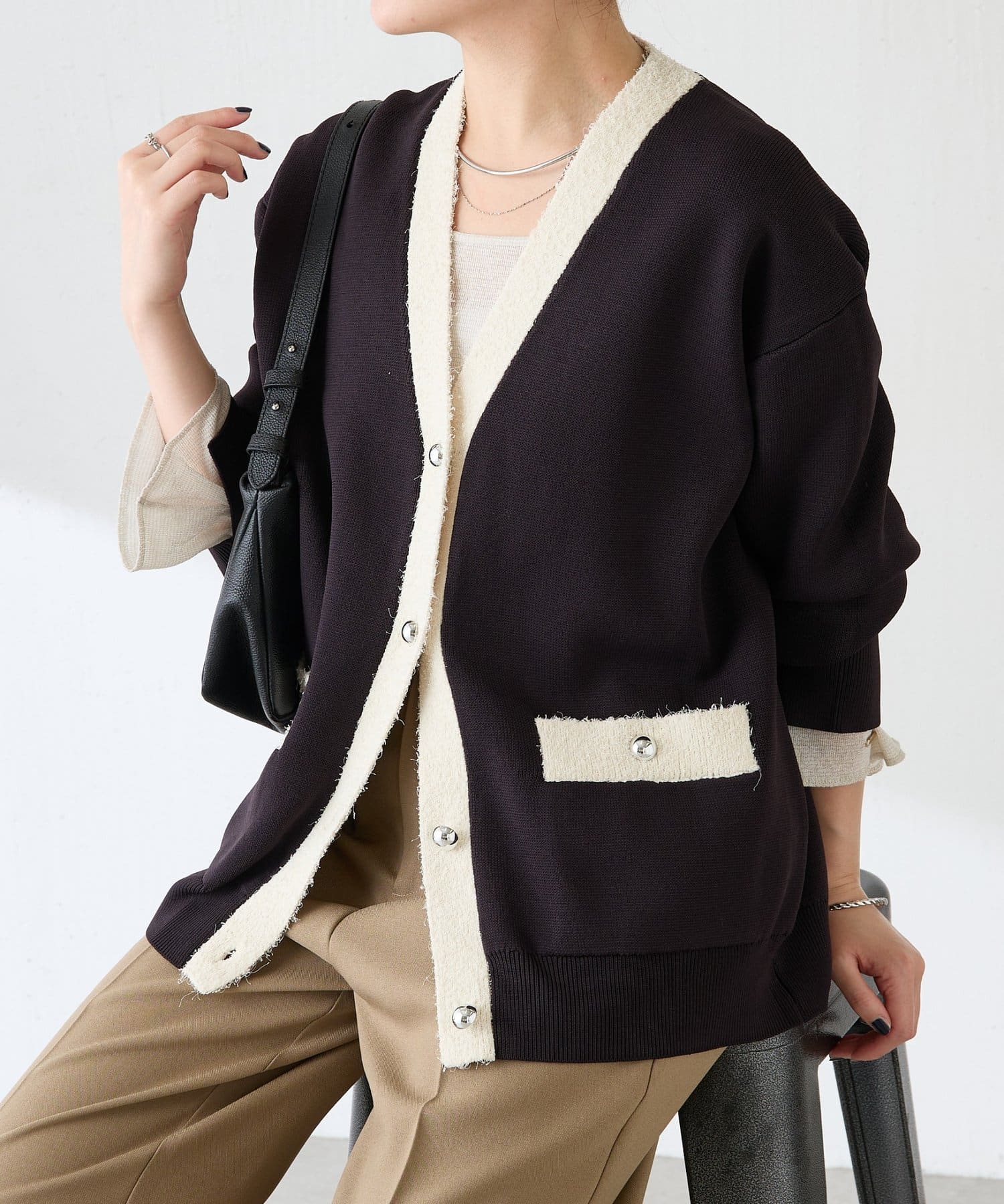 異素材の組み合わせがポイントになるVネックニット