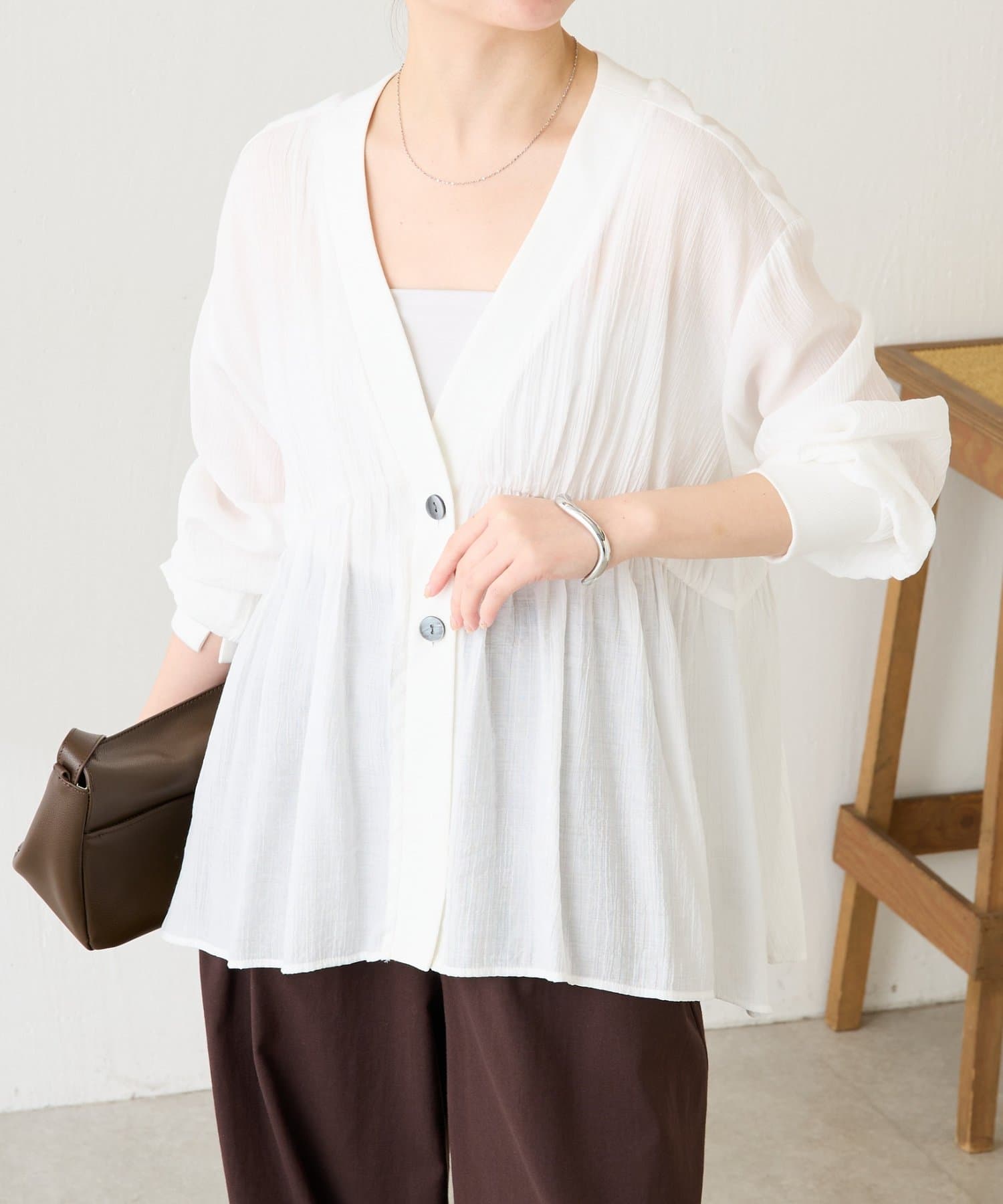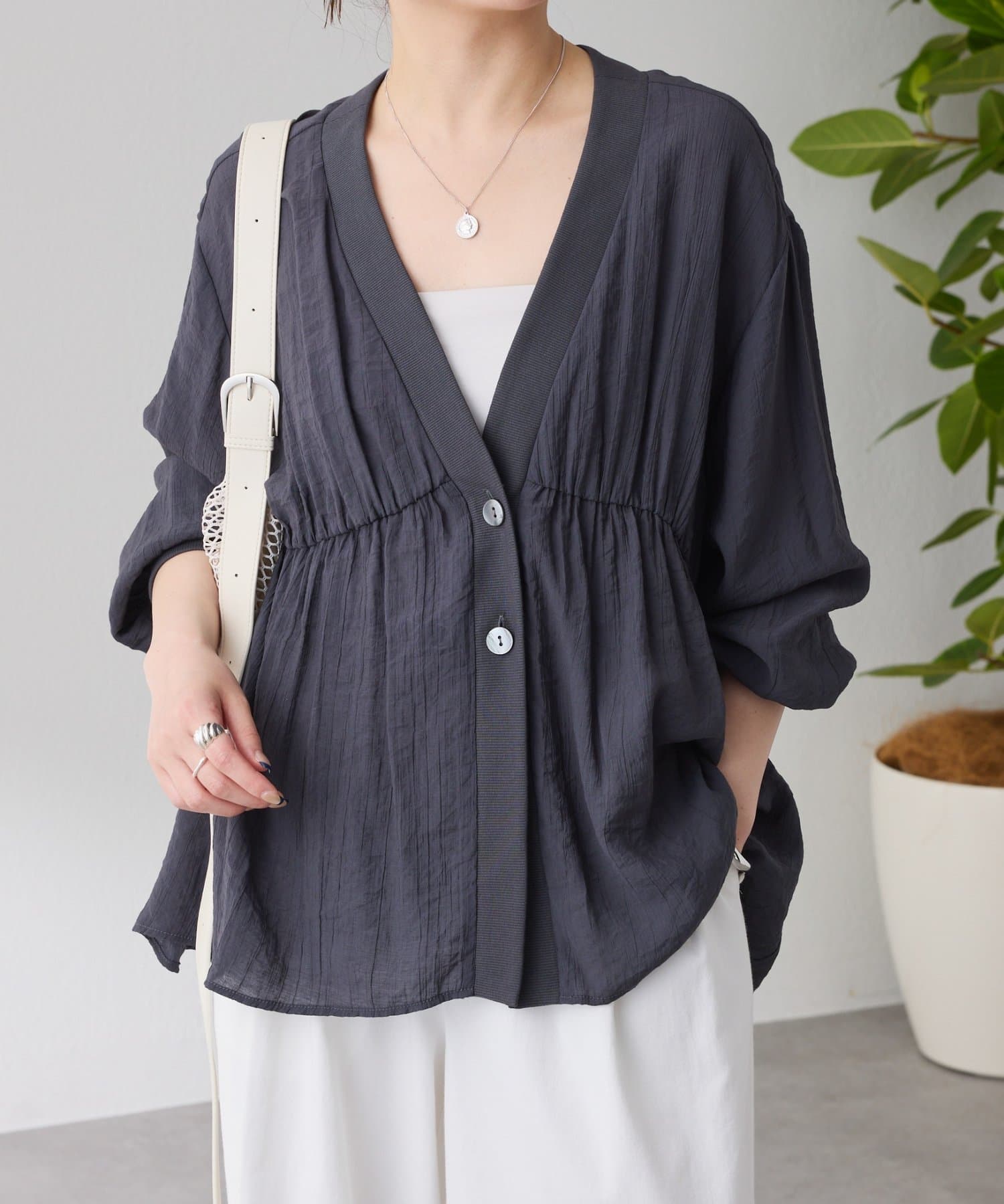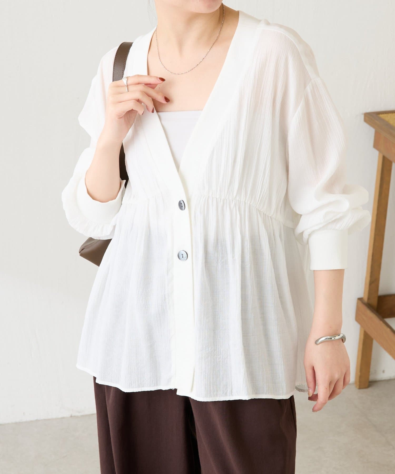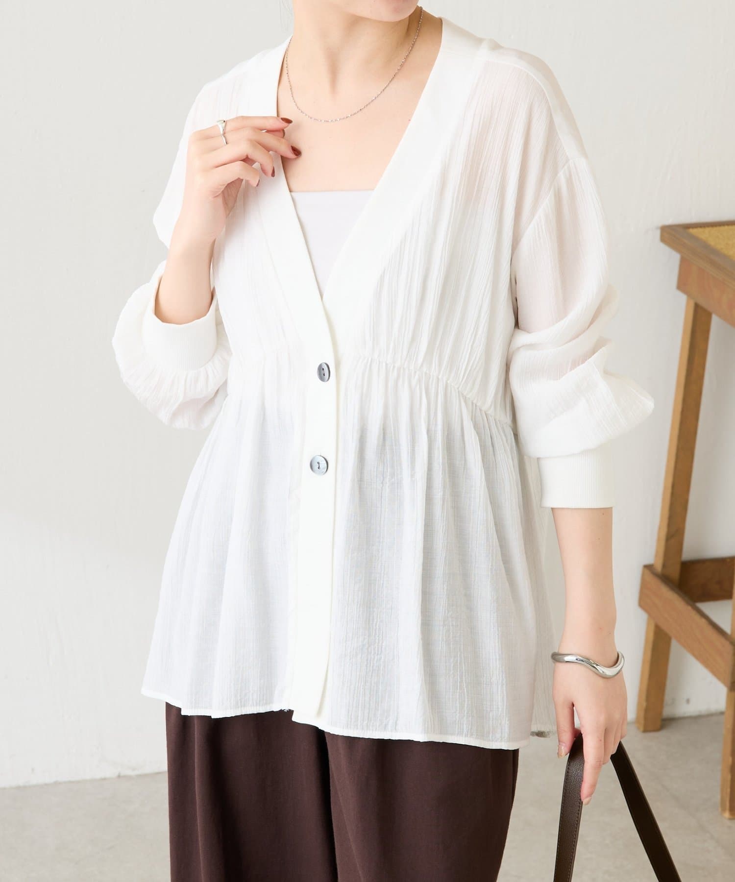 【軽量/体型カバー】ギャザー切替シアーシャツカーディガン