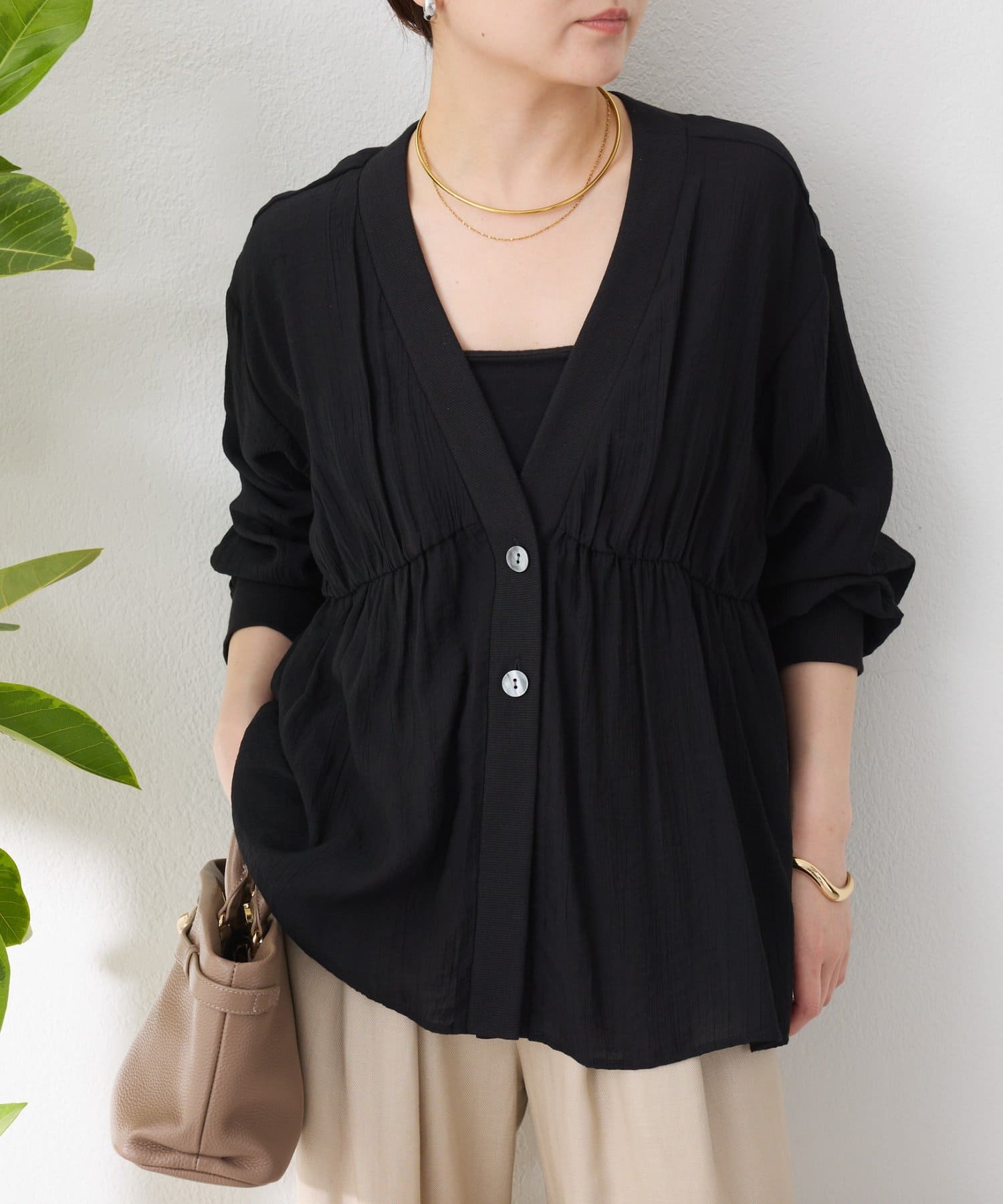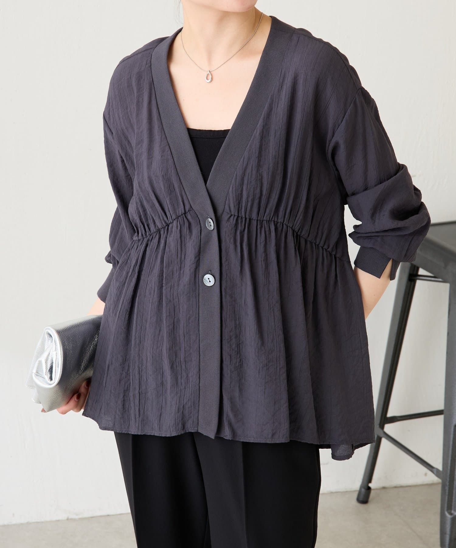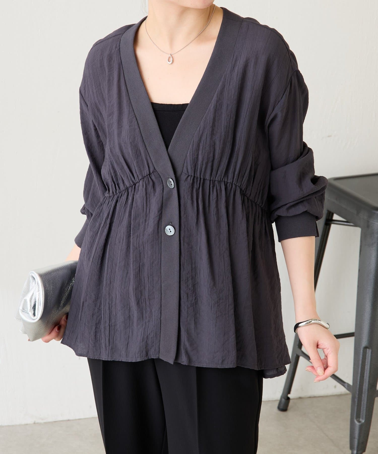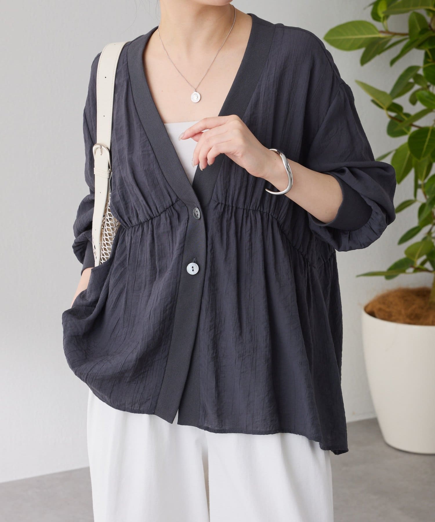 【軽量/体型カバー】ギャザー切替シアーシャツカーディガン