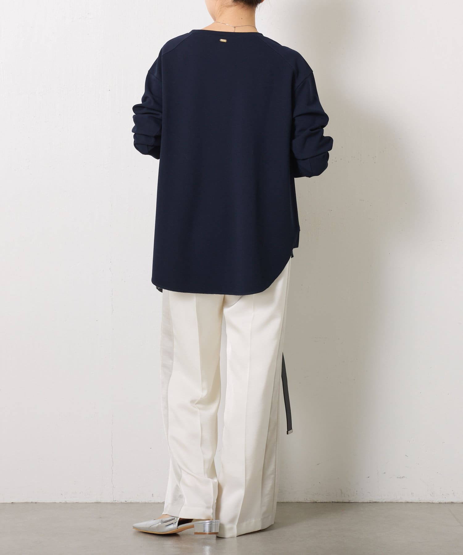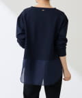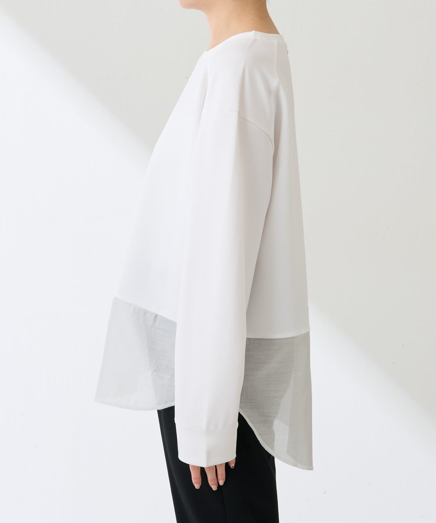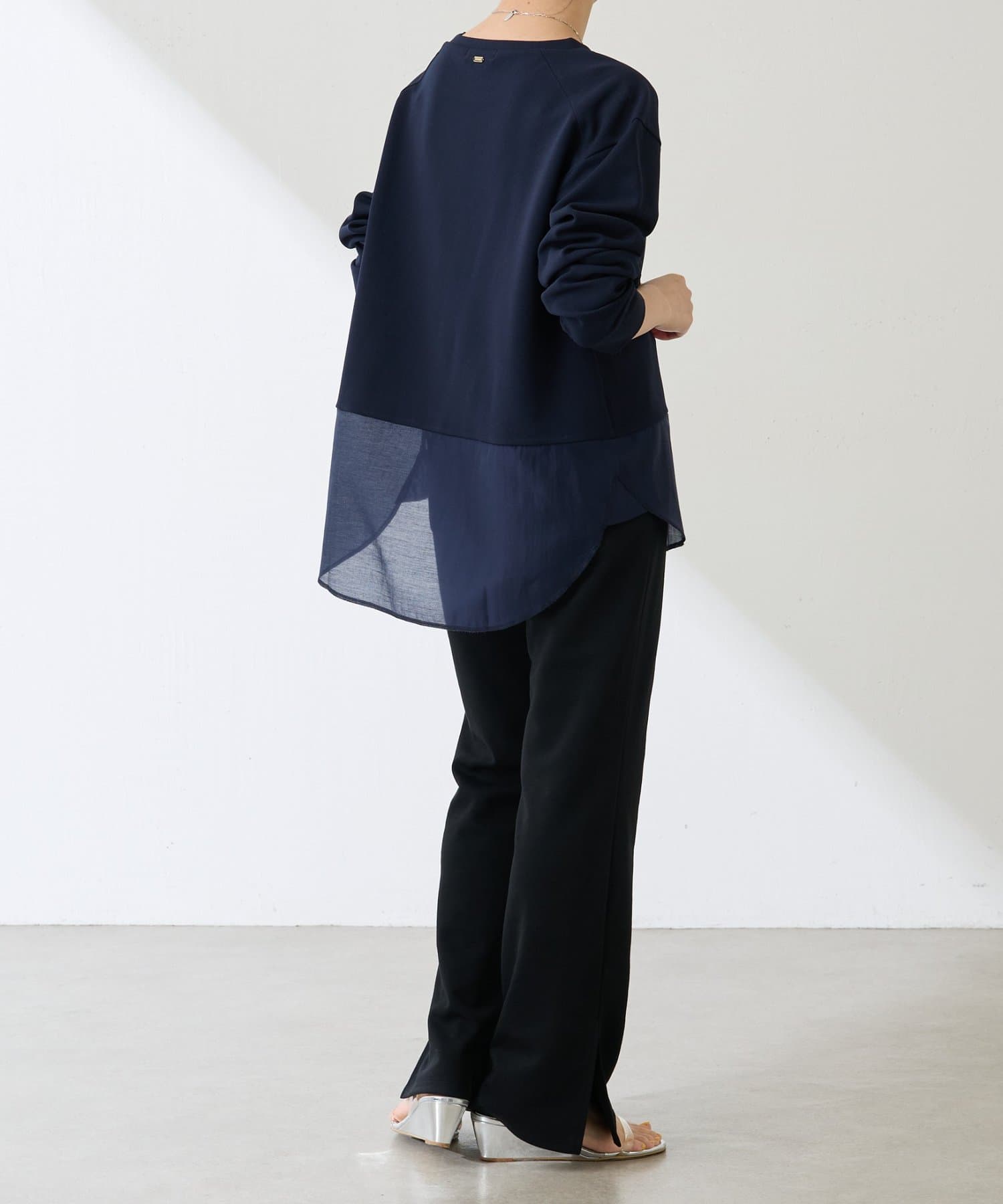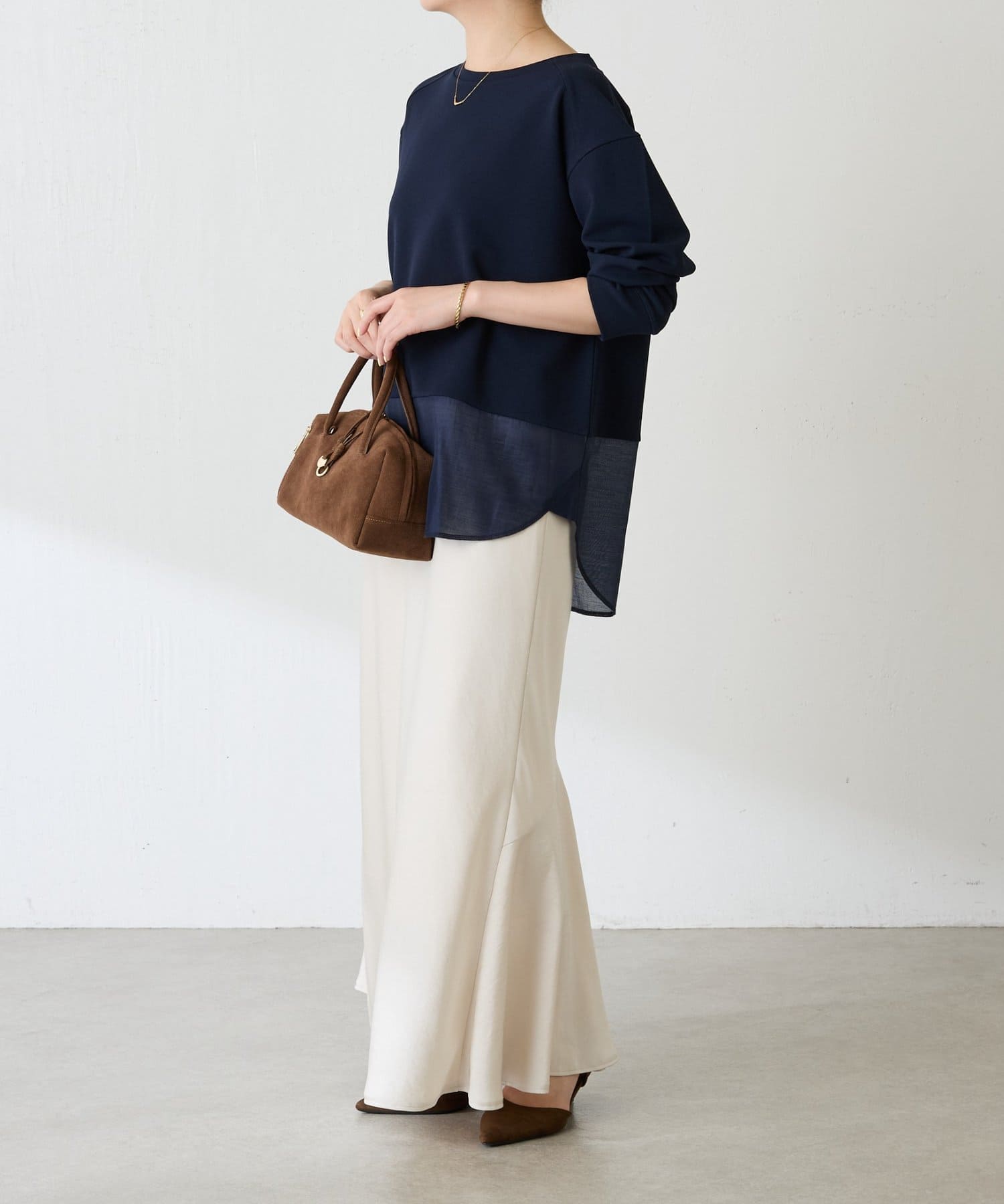 ・(カラー名:ホワイト/ミッドナイトブルー)ニットやスウェットのインナーとしてシアー部分を見せるとメリハリのあるスタイリングが完成します◎