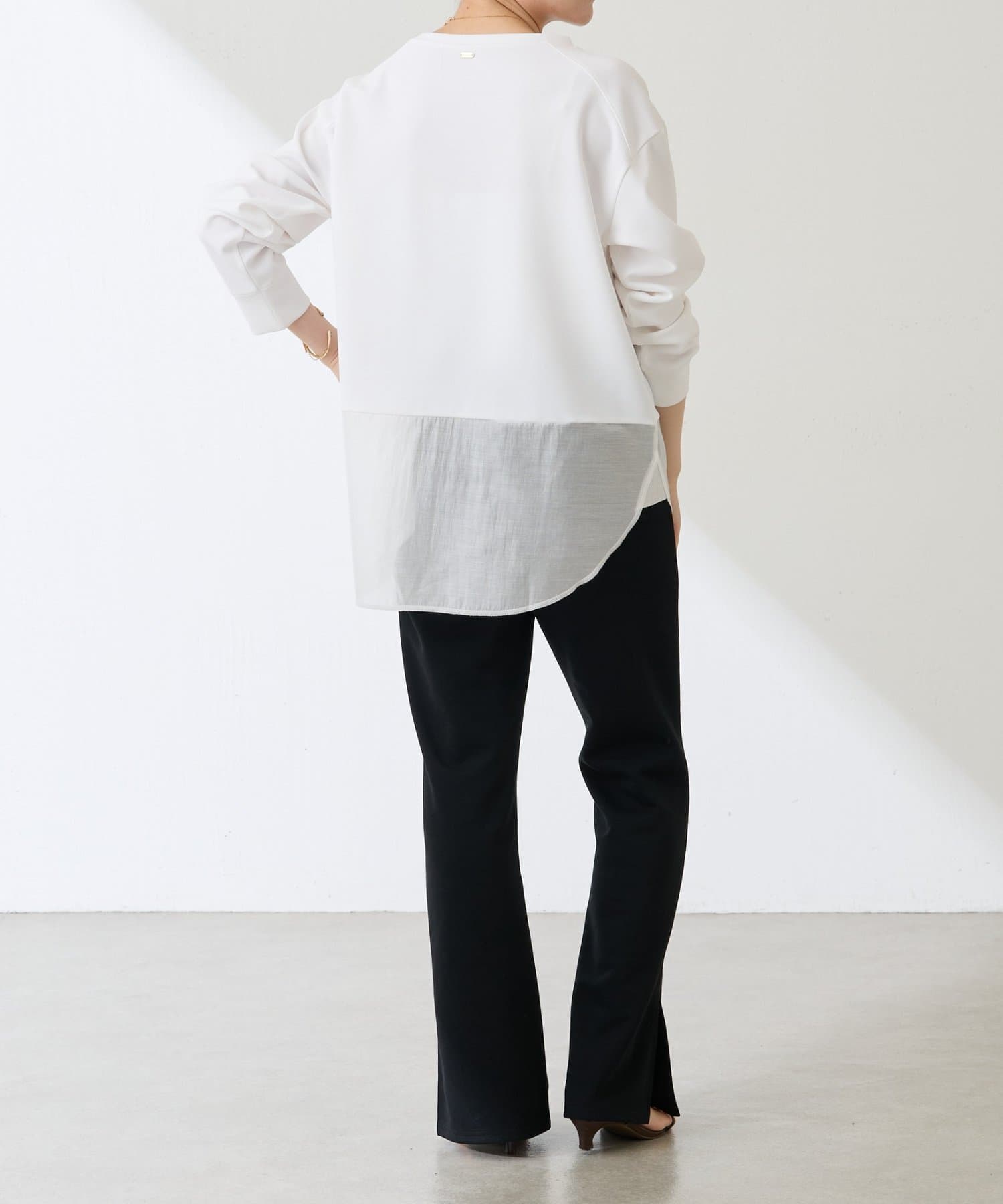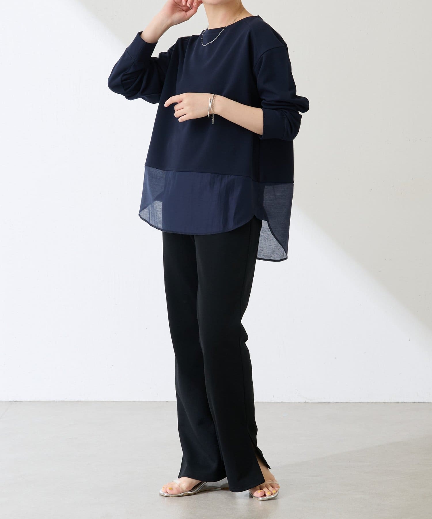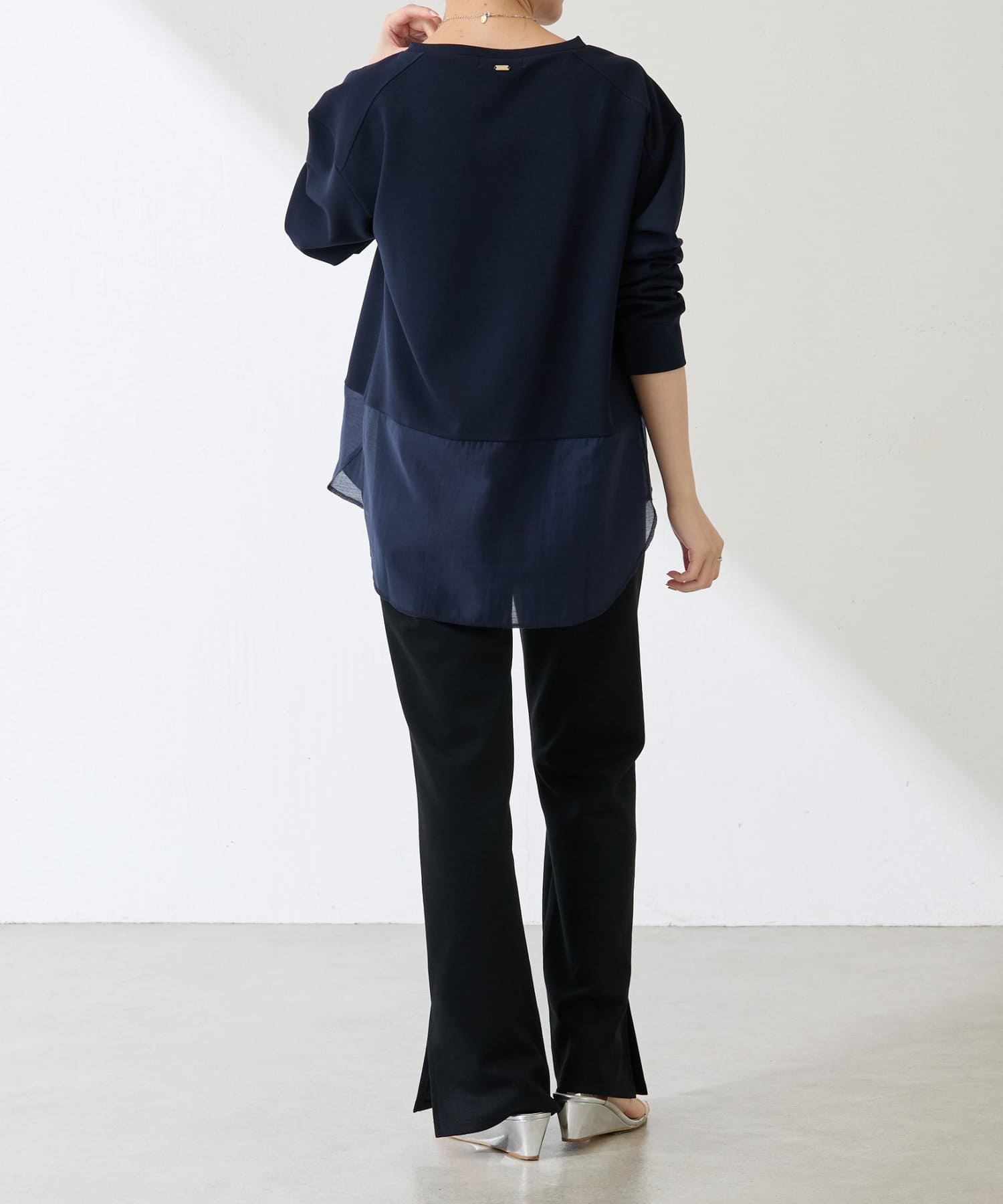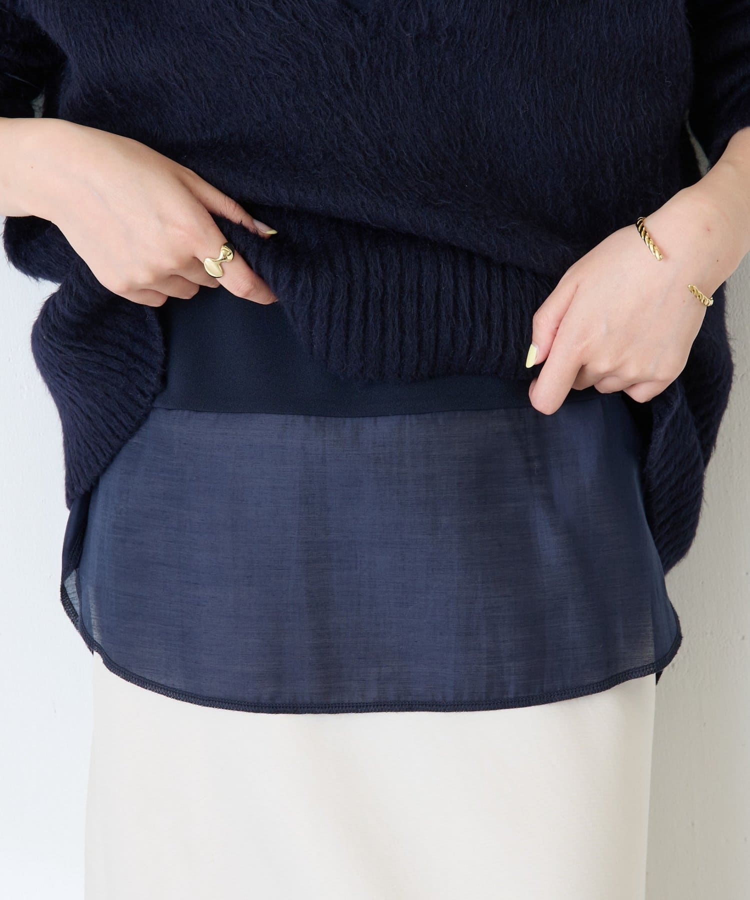 ・(カラー名:ホワイト/ミッドナイトブルー)ニットやスウェットのインナーとしてシアー部分を見せるとメリハリのあるスタイリングが完成します◎
