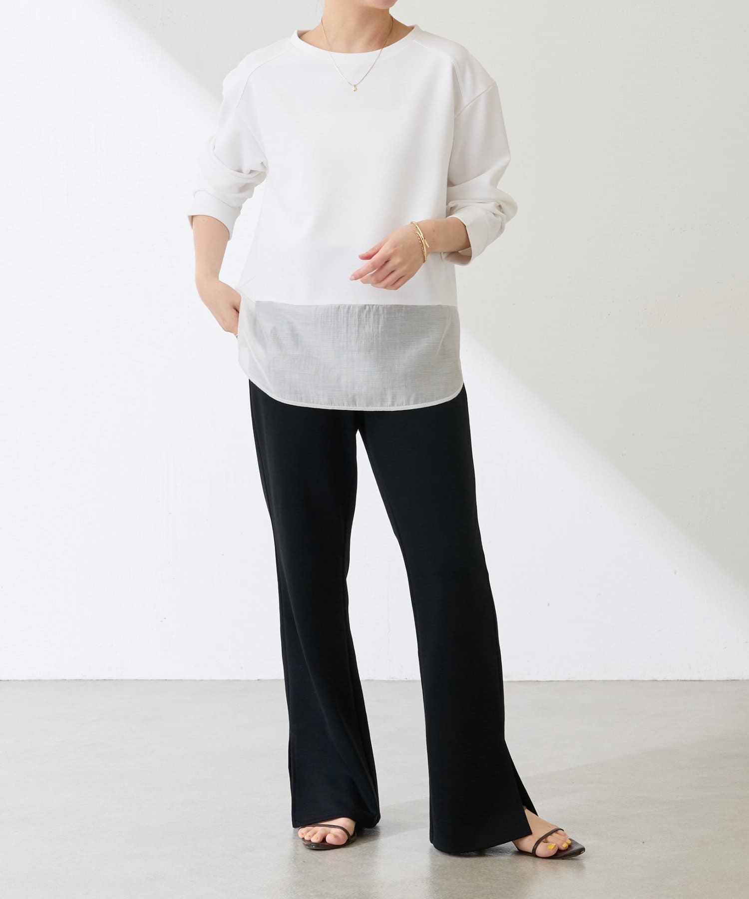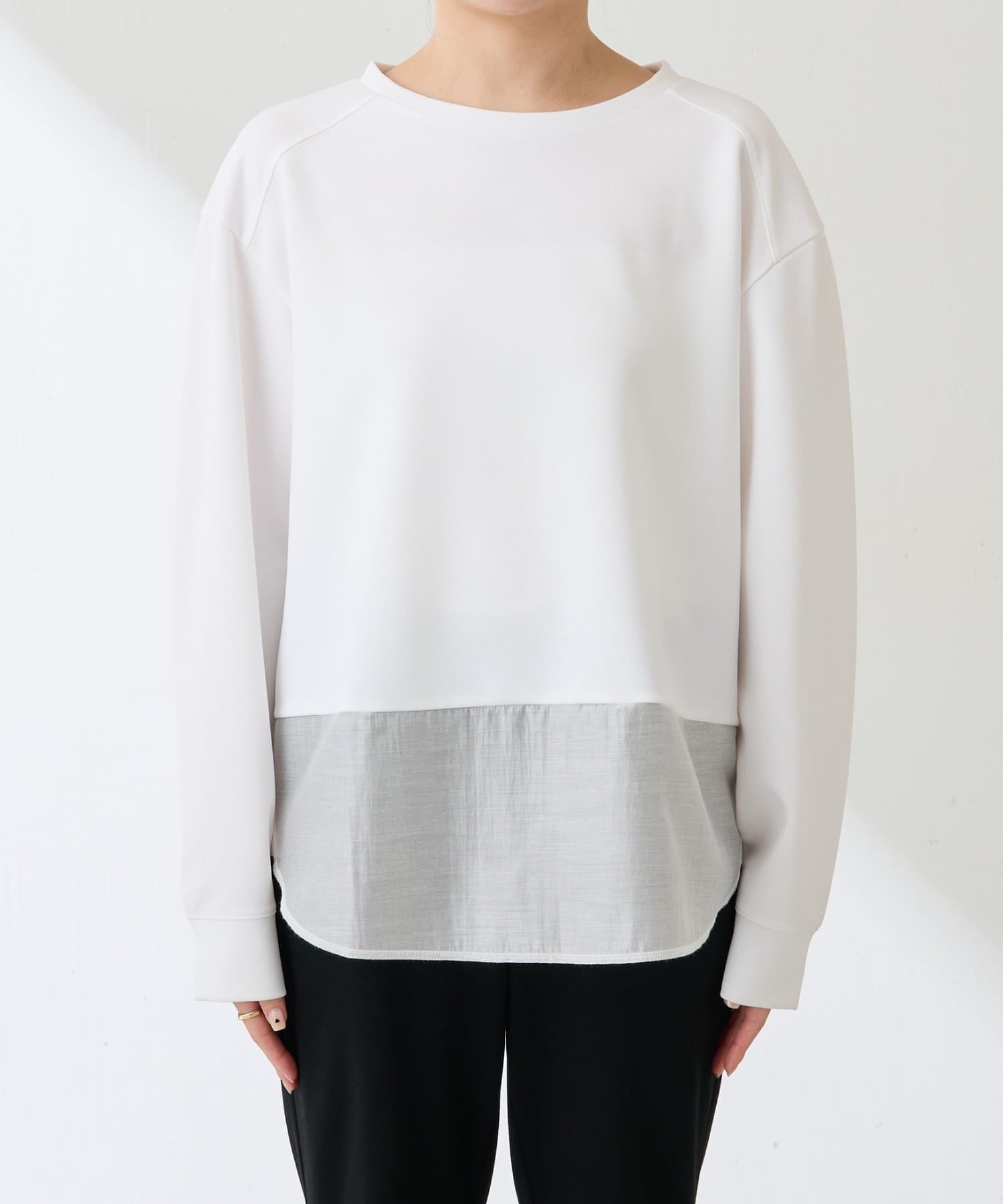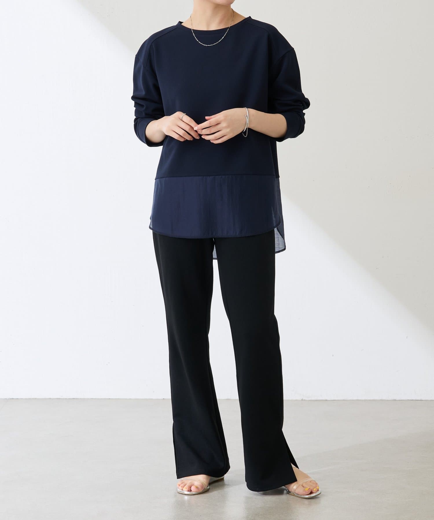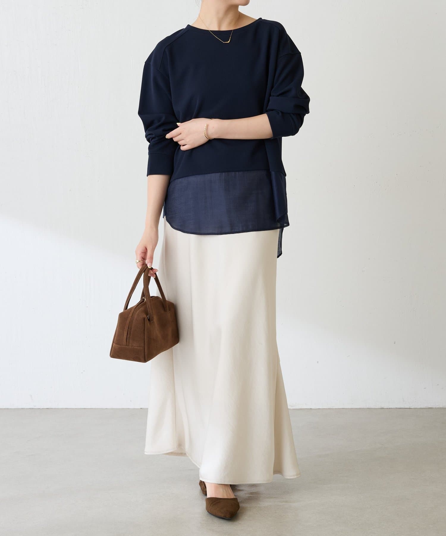 ・(カラー名:ホワイト/ミッドナイトブルー)ニットやスウェットのインナーとしてシアー部分を見せるとメリハリのあるスタイリングが完成します◎