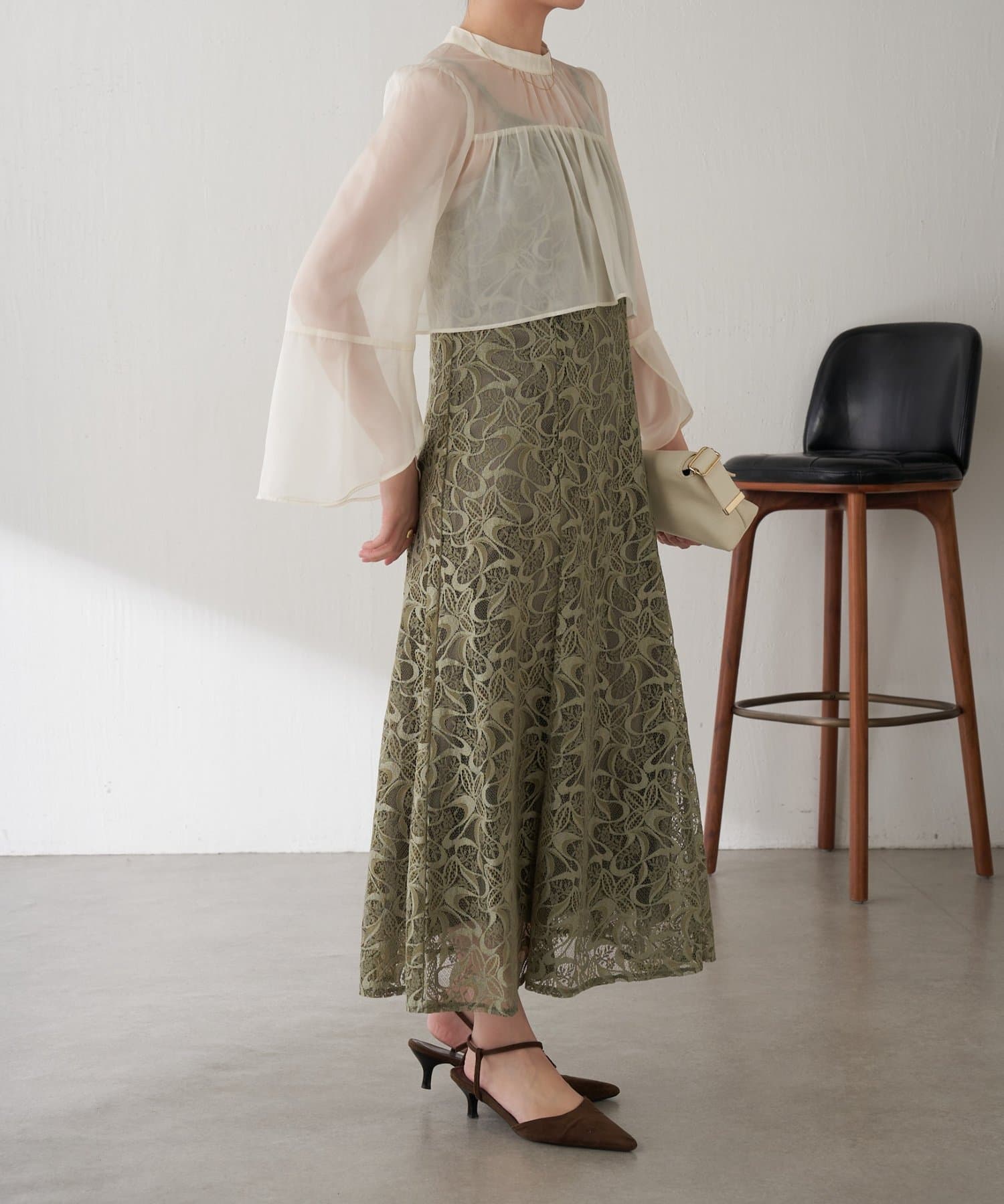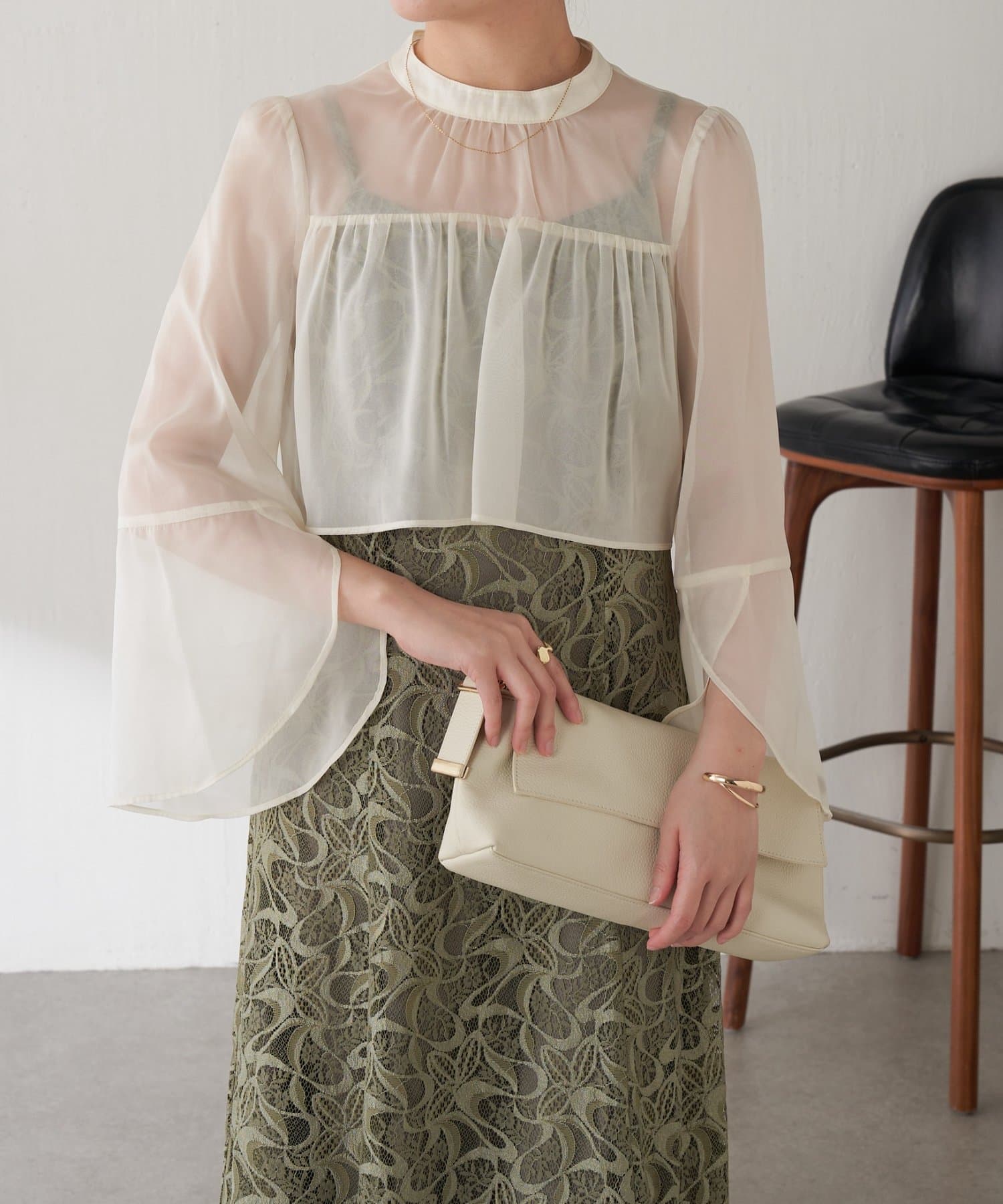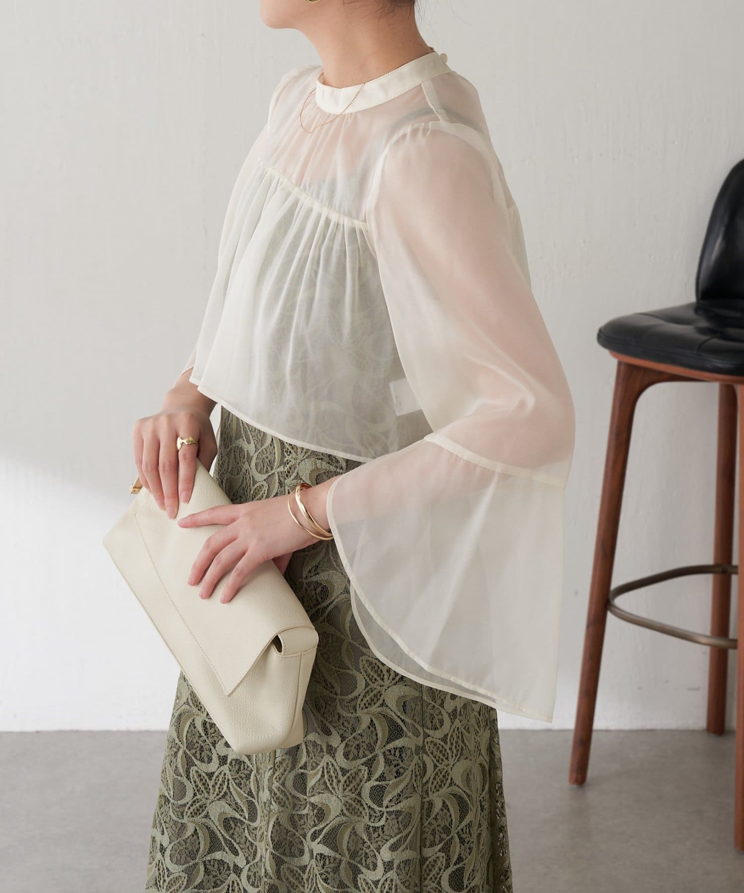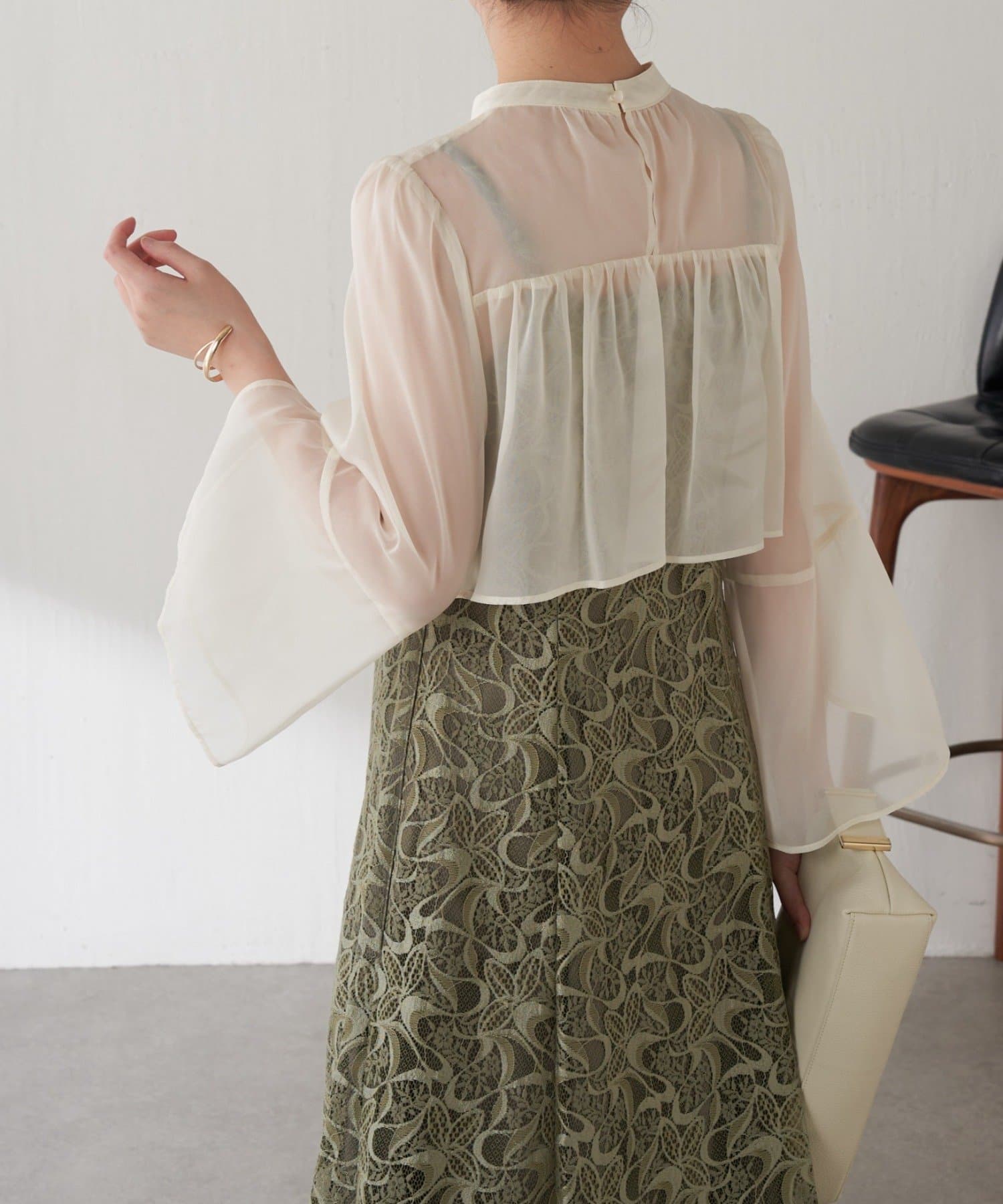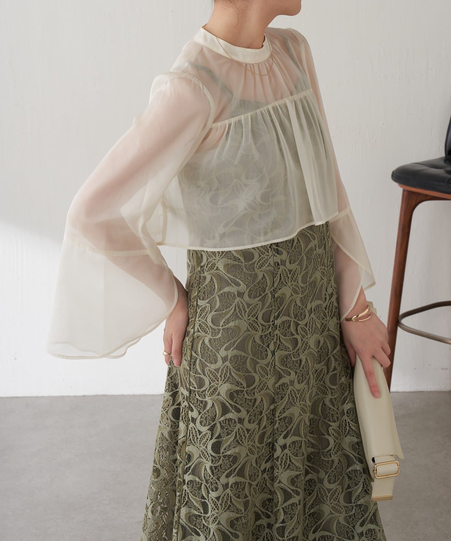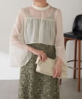 ・ほんのり透け感もあるフレアスリーブのブラウスが女性らしさをプラス。