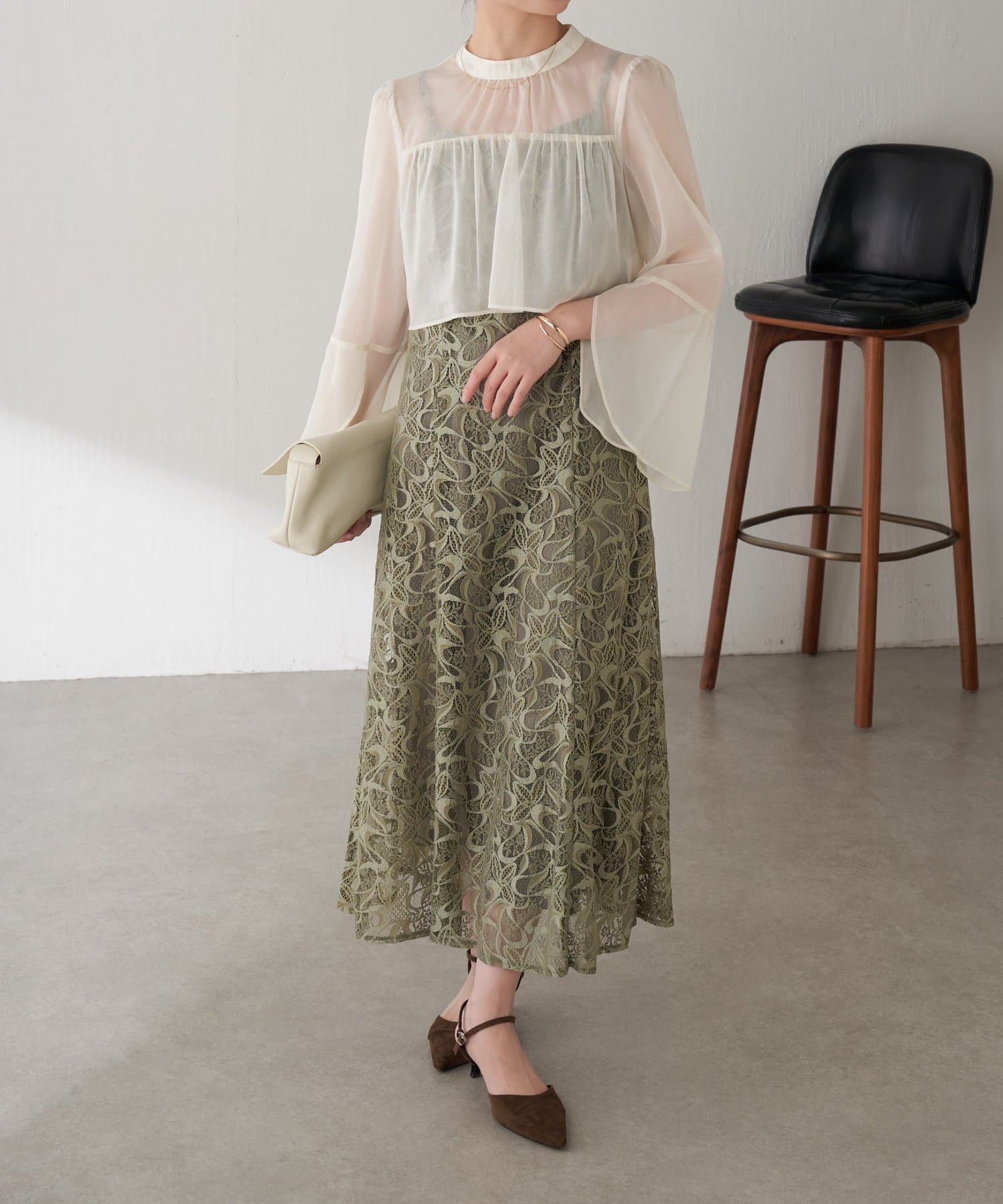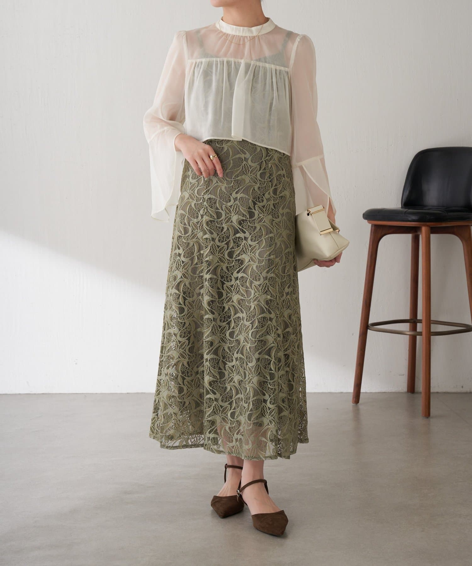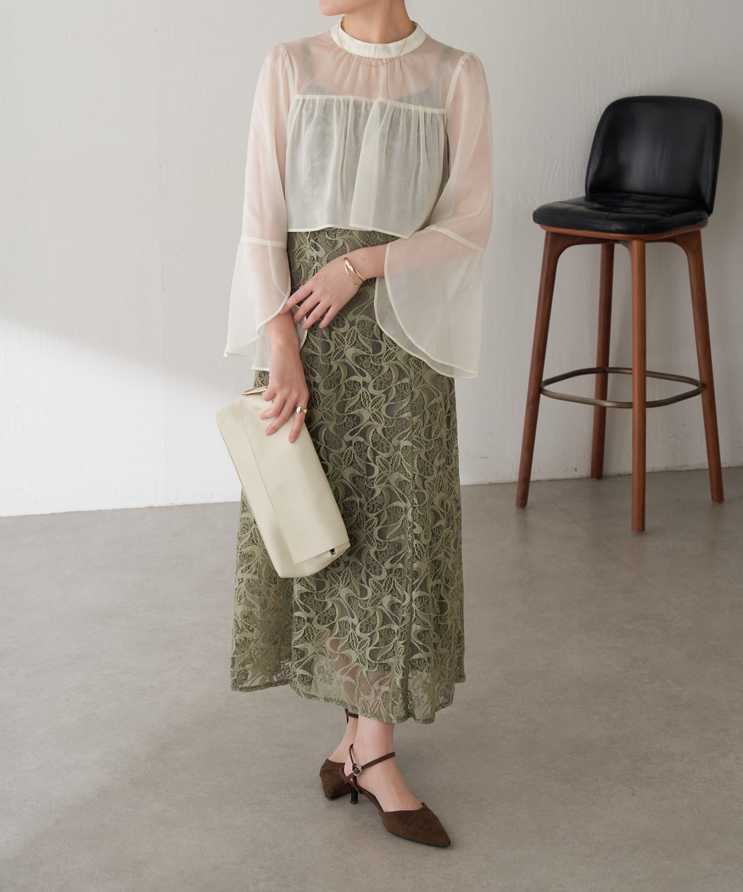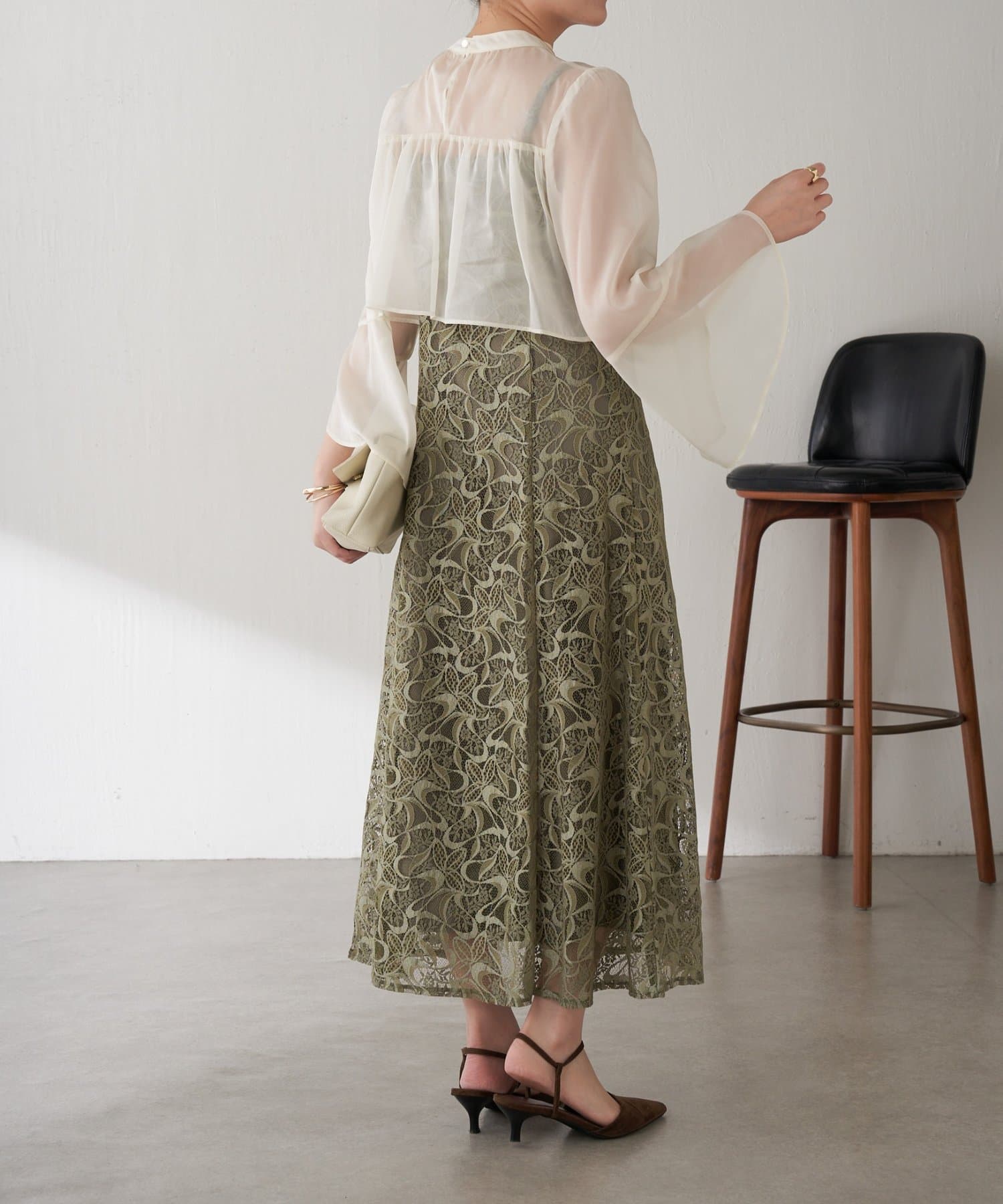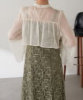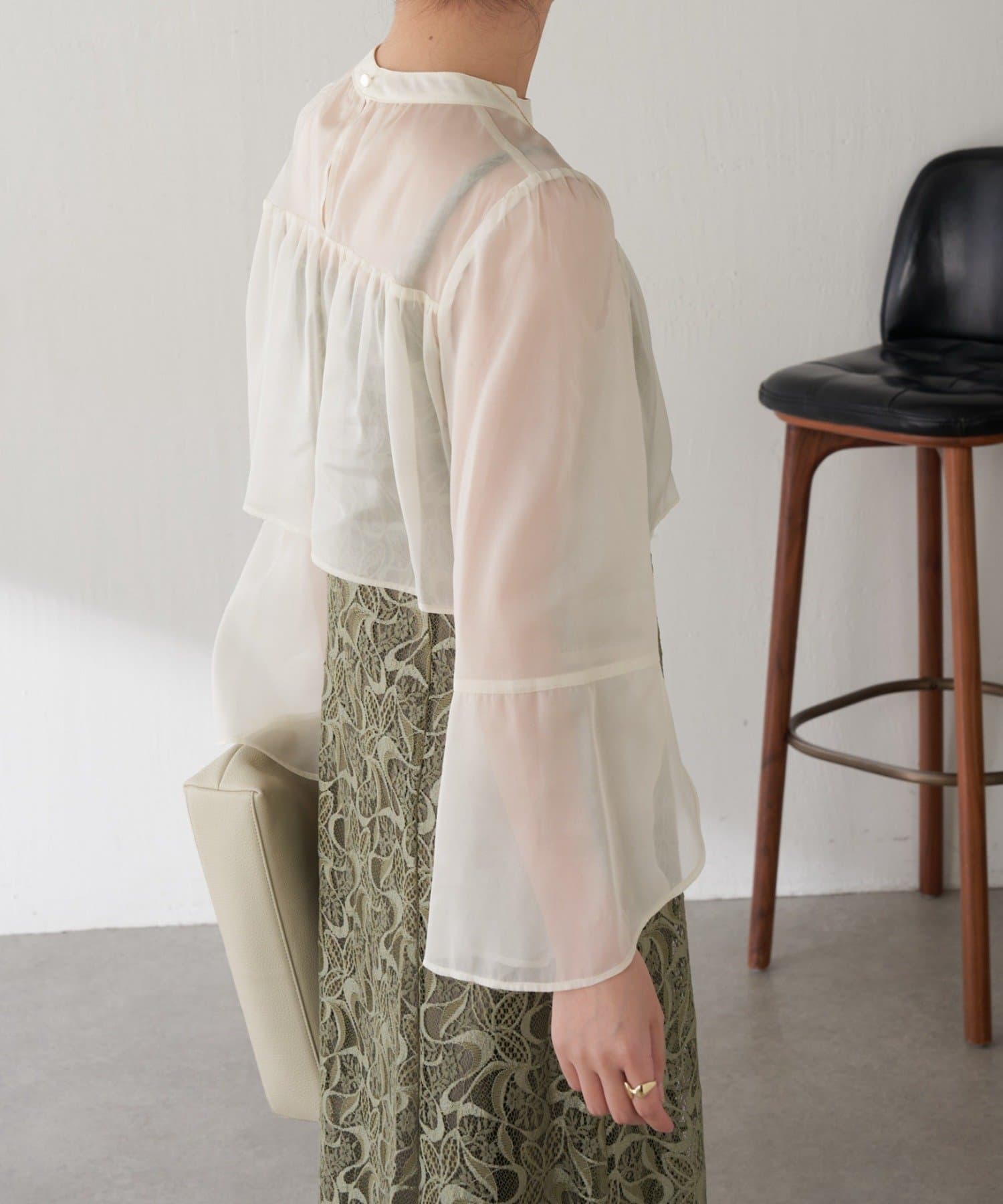 ・ほんのり透け感もあるフレアスリーブのブラウスが女性らしさをプラス。