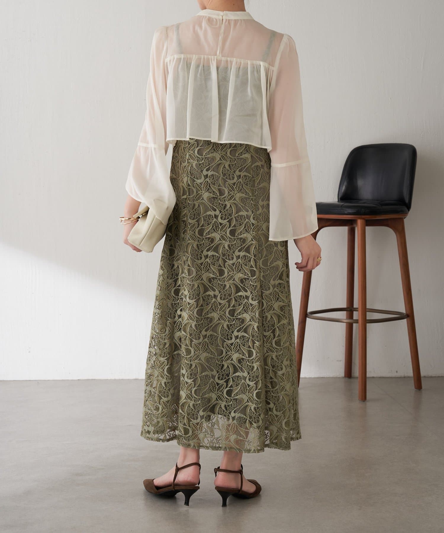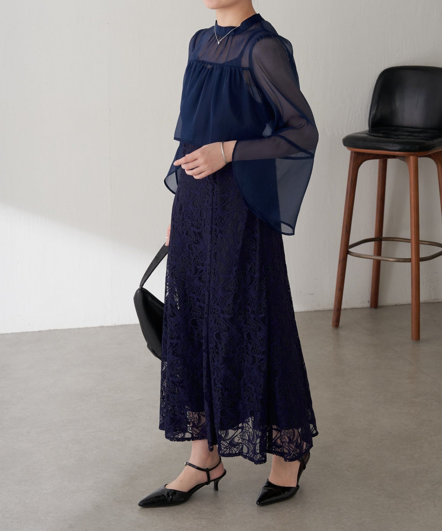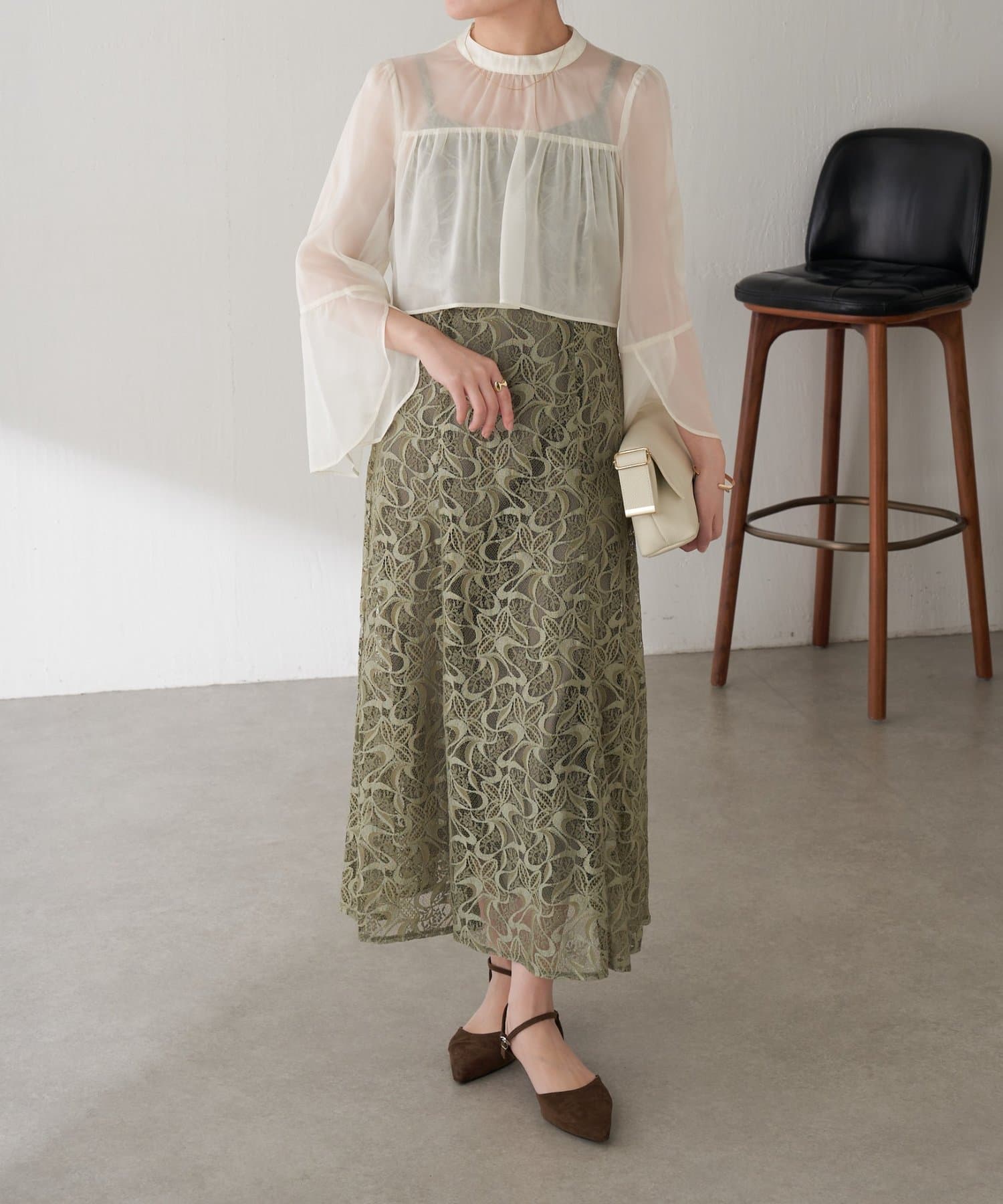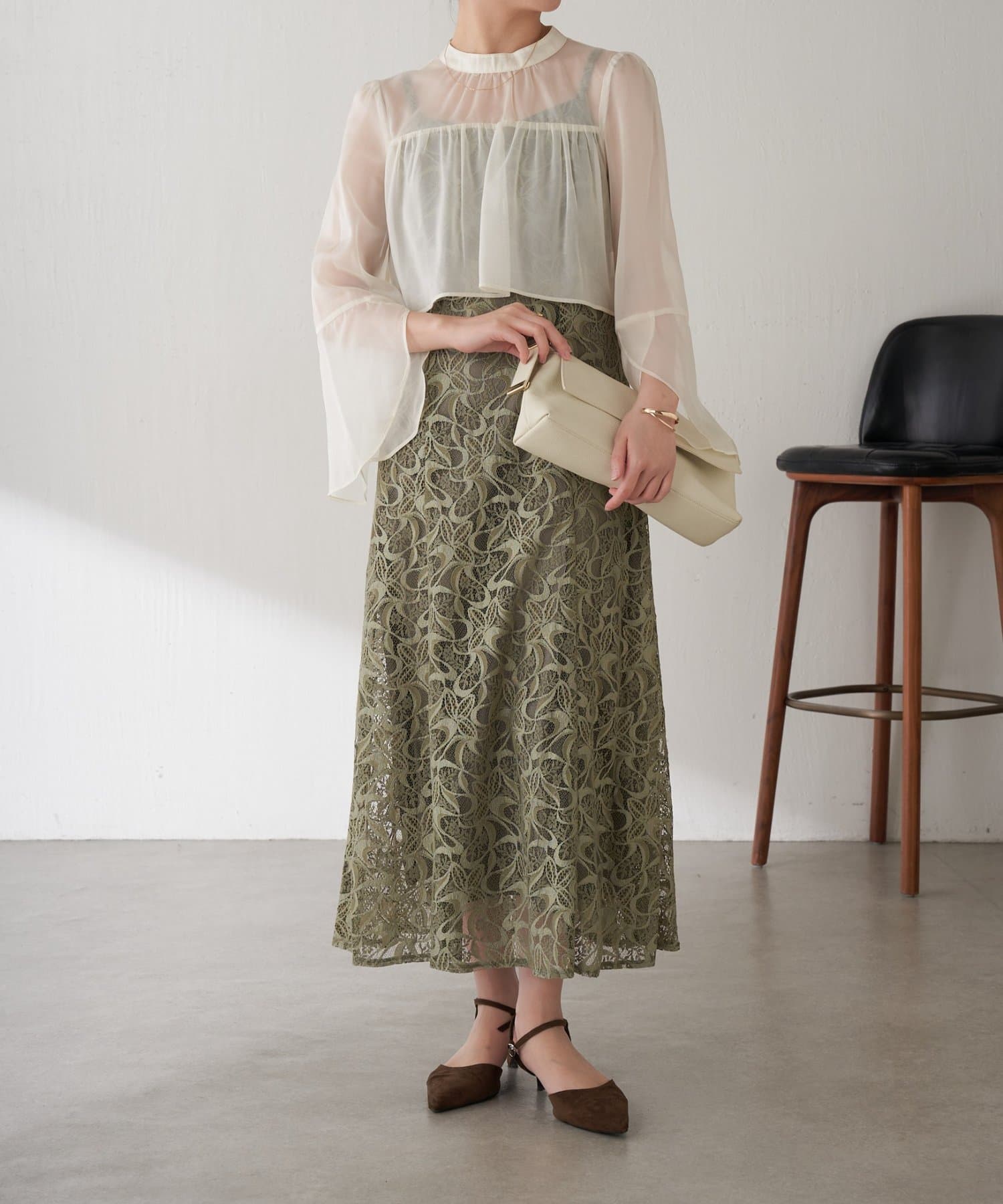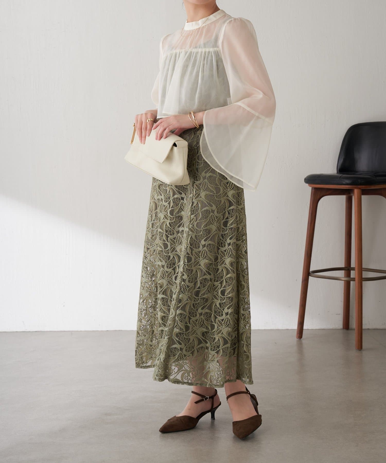 ・ほんのり透け感もあるフレアスリーブのブラウスが女性らしさをプラス。
