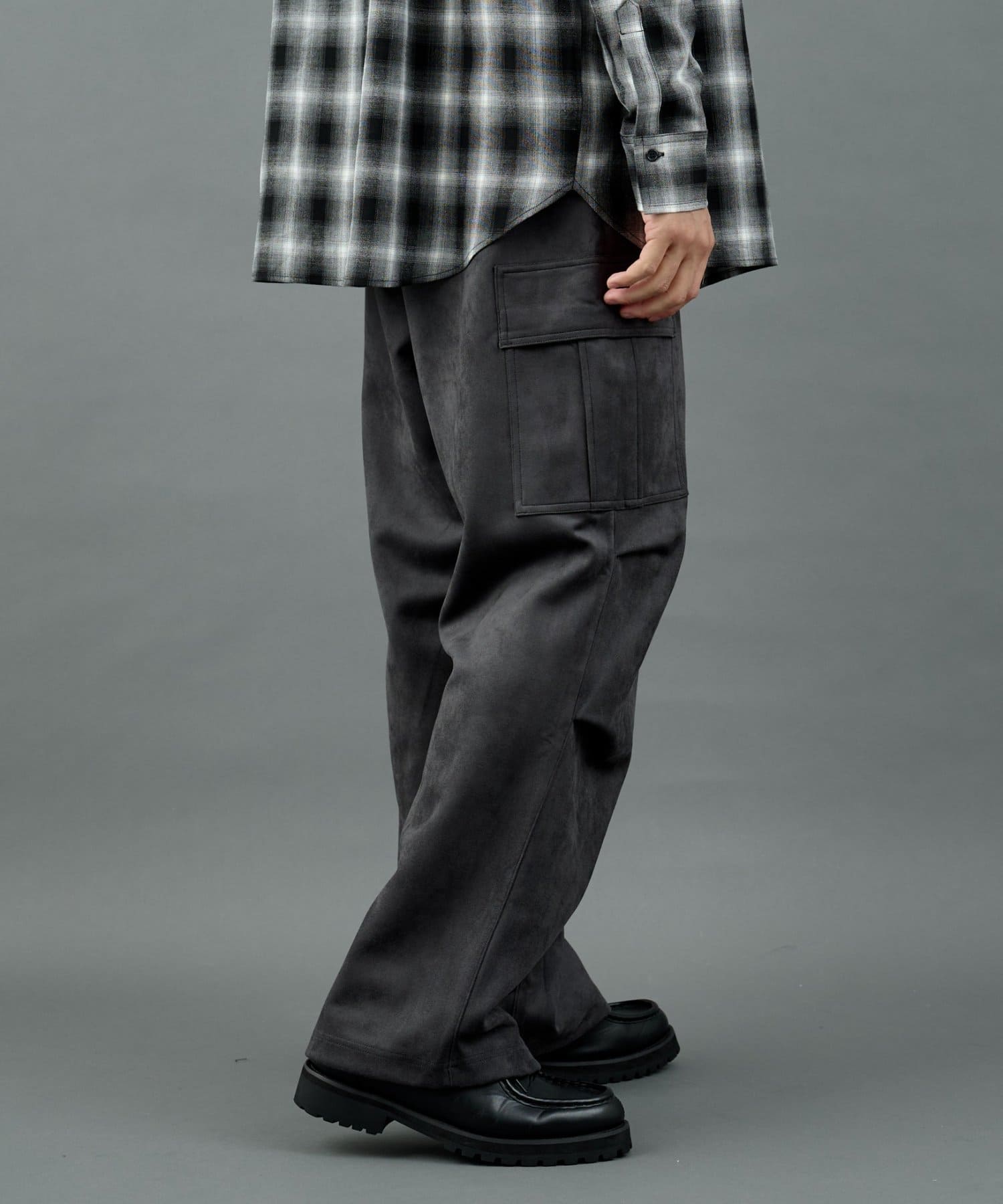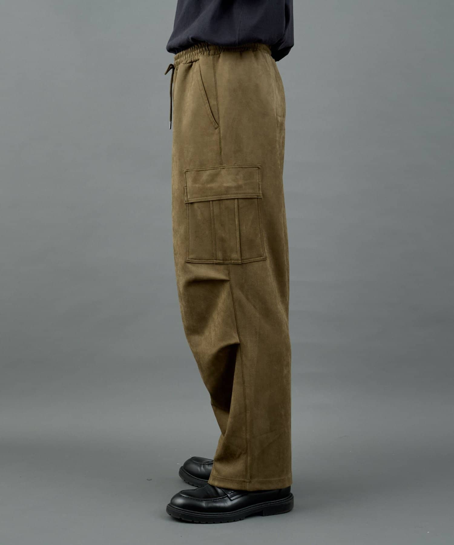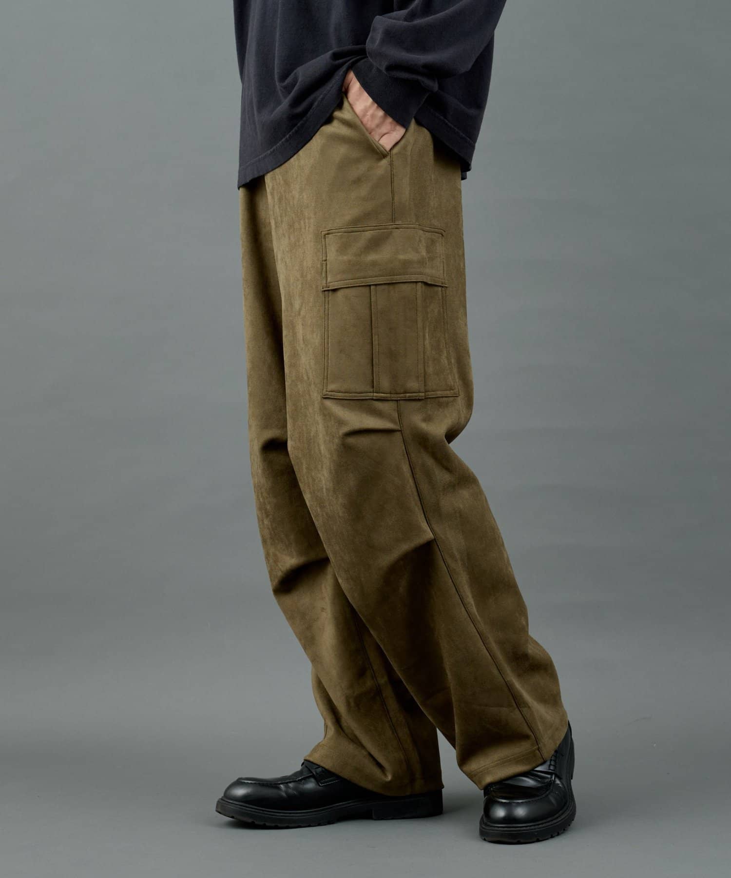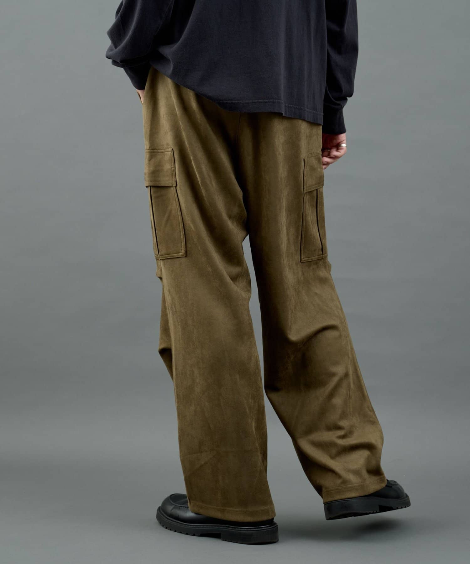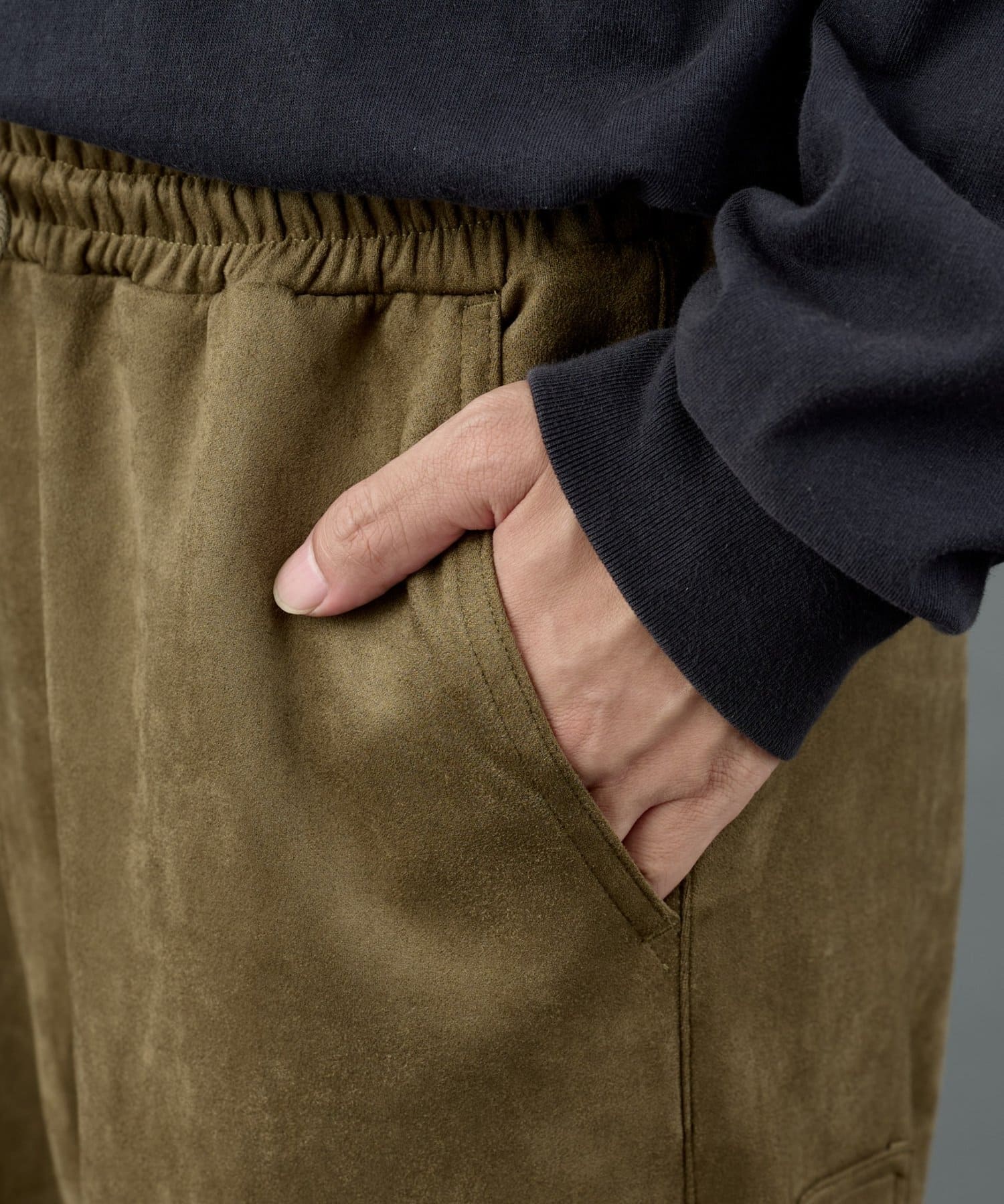 上品な光沢としなやかな質感が魅力のシンセティックスエード素材を使用したカーゴパンツです。