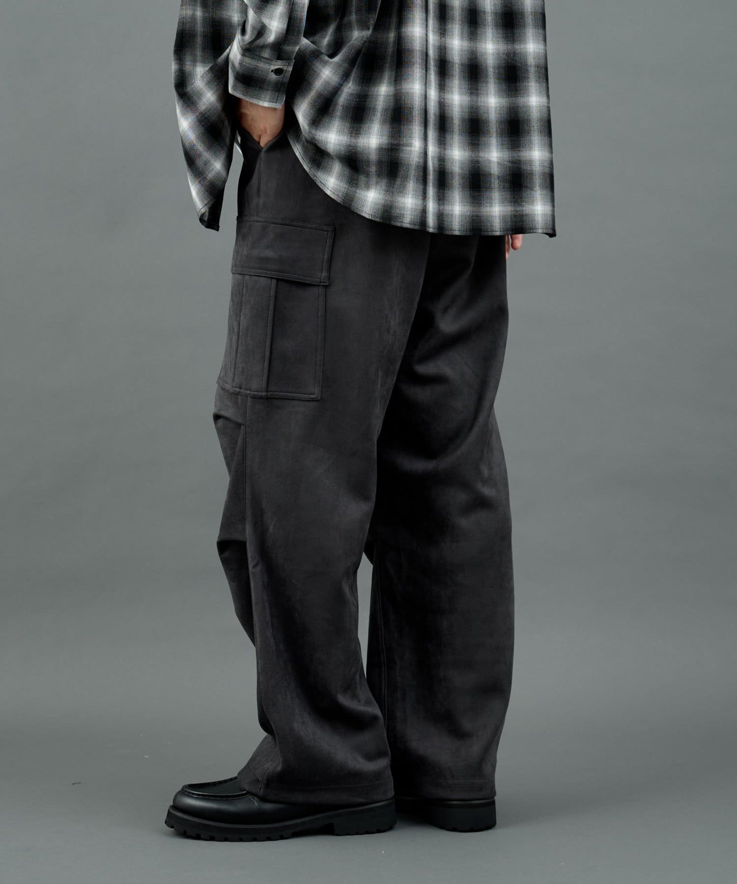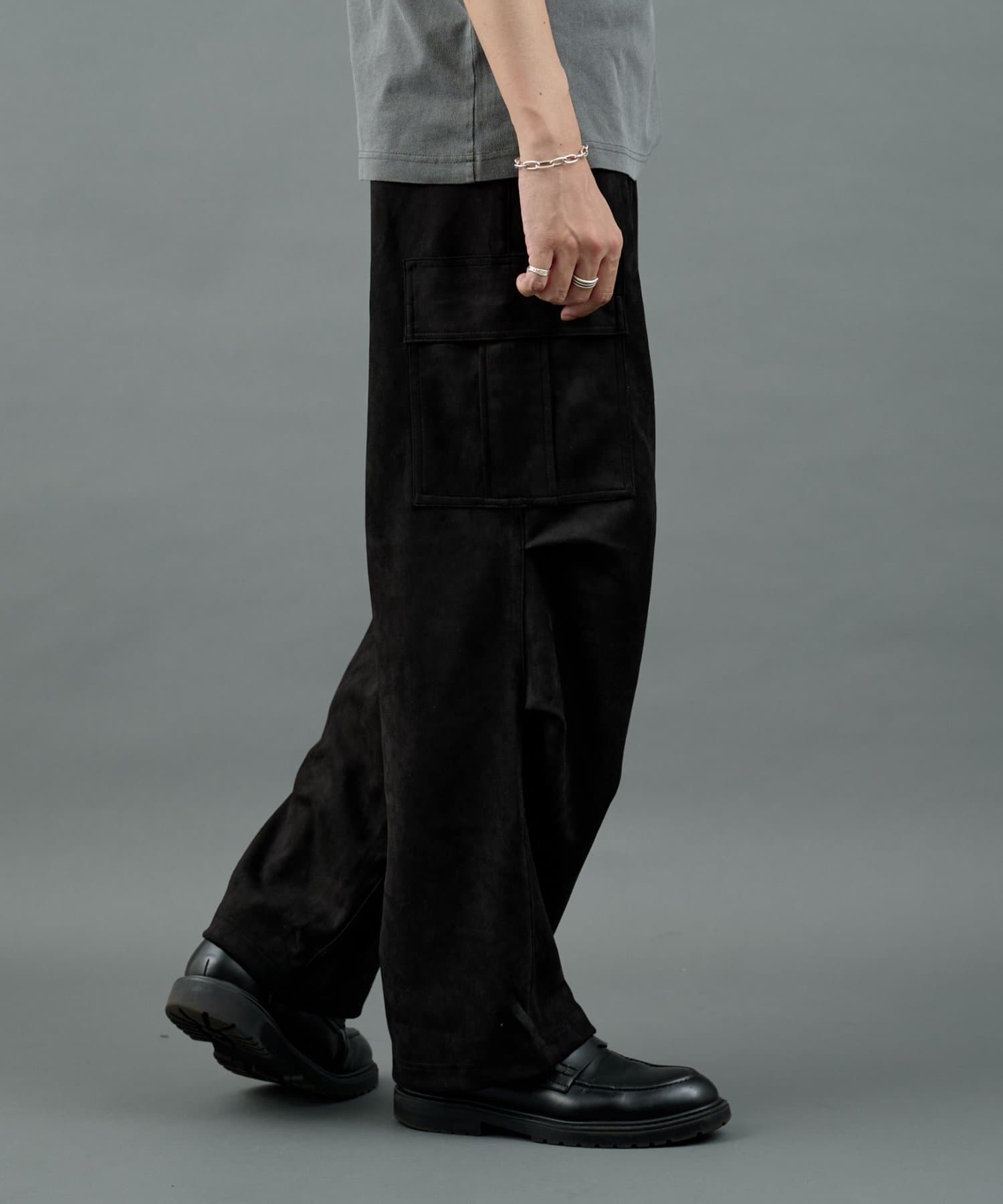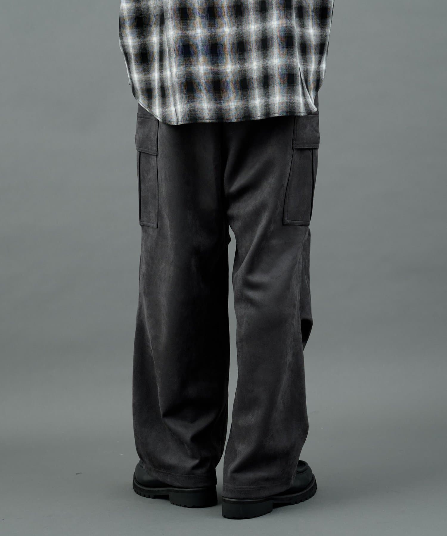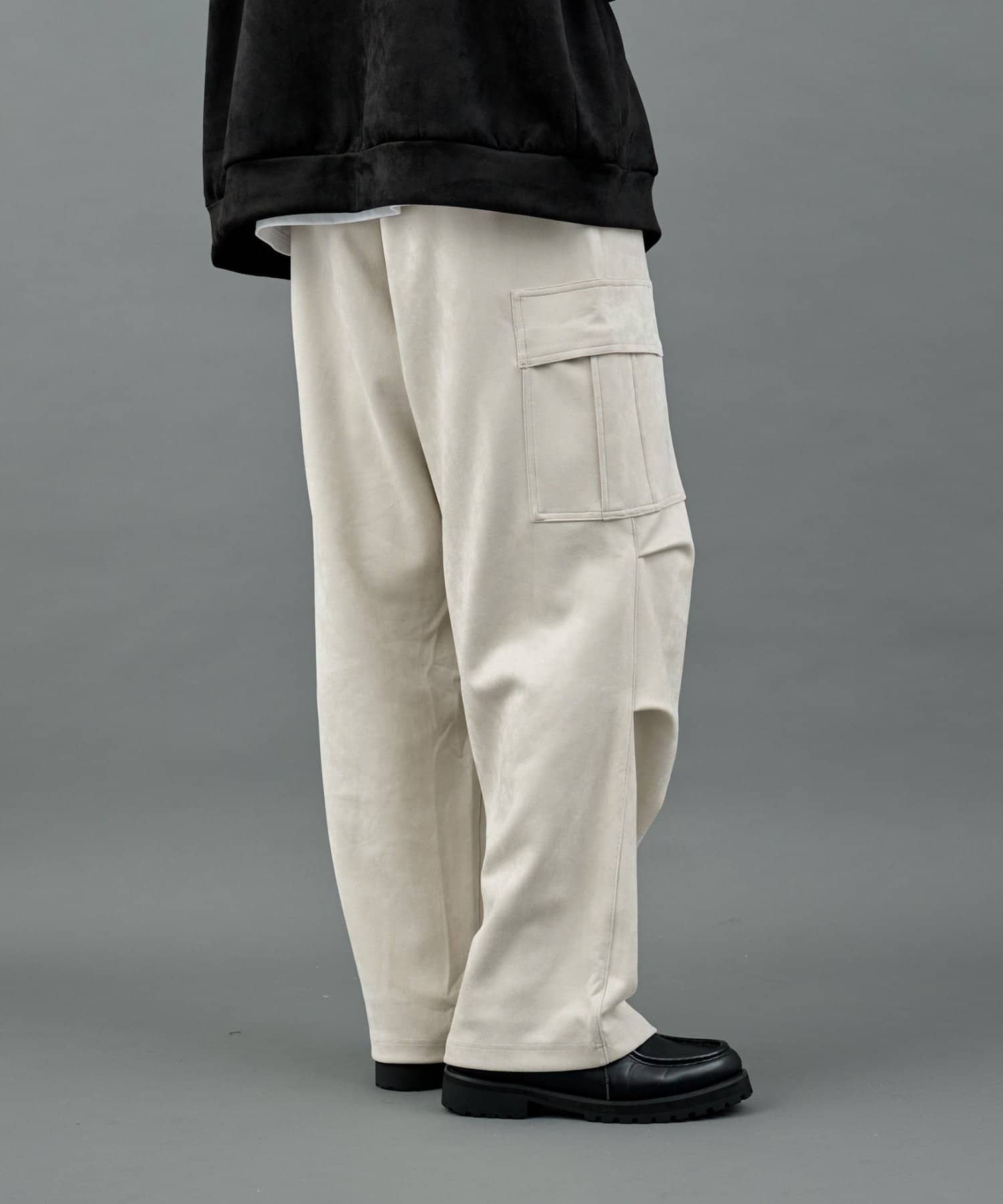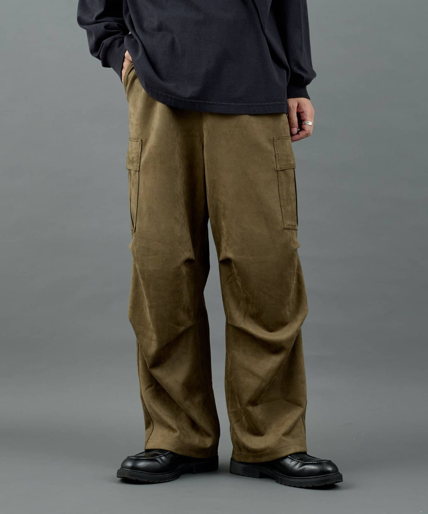 上品な光沢としなやかな質感が魅力のシンセティックスエード素材を使用したカーゴパンツです。