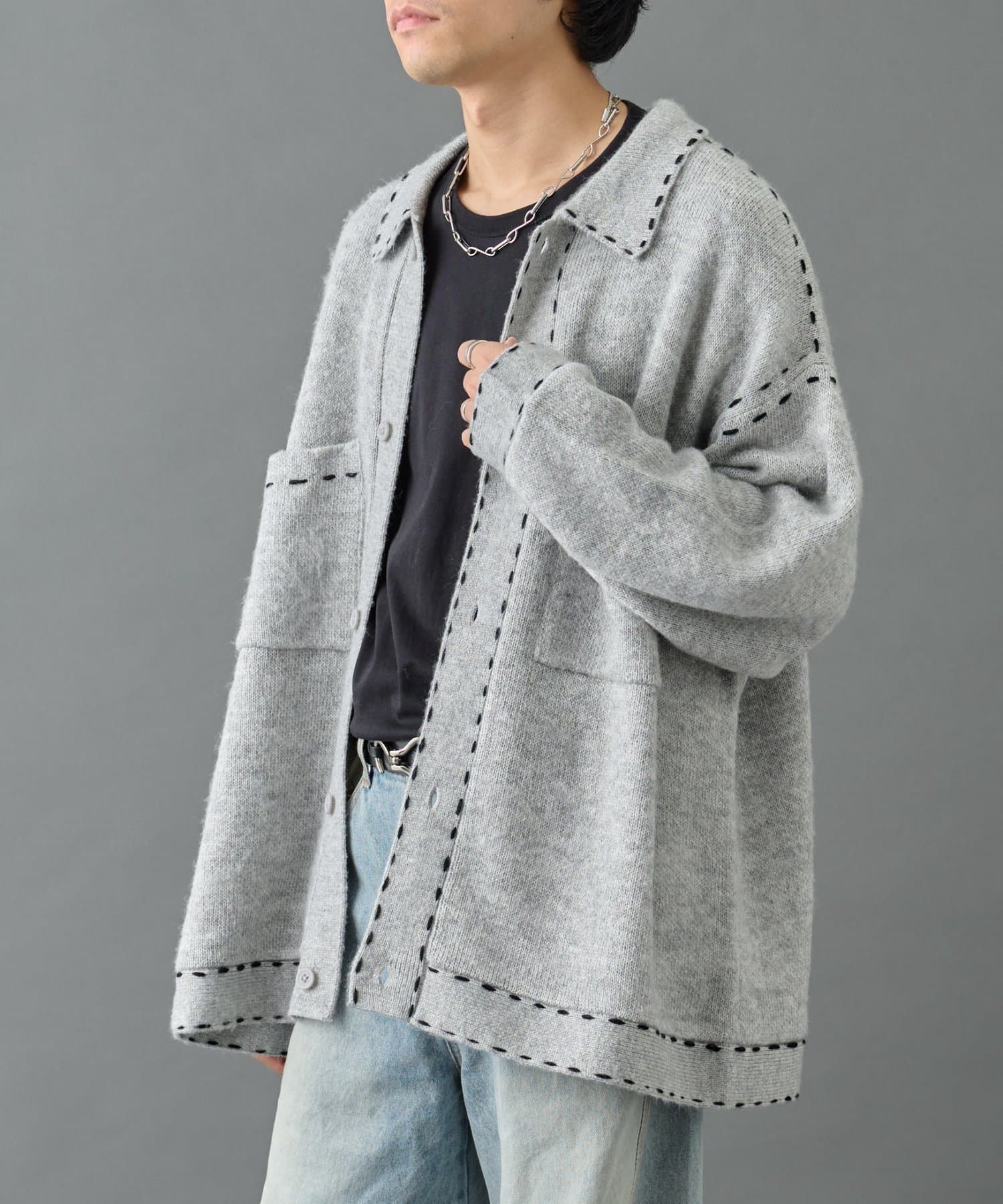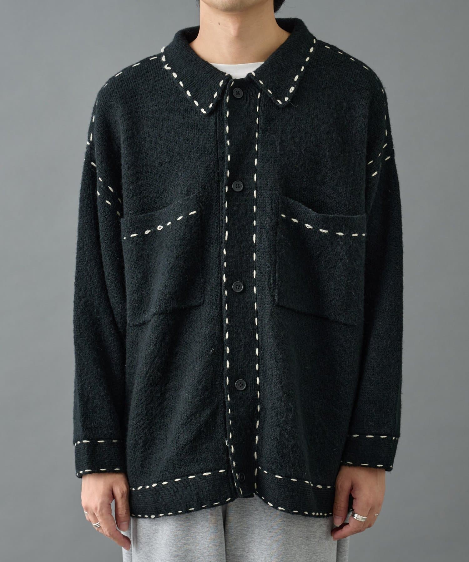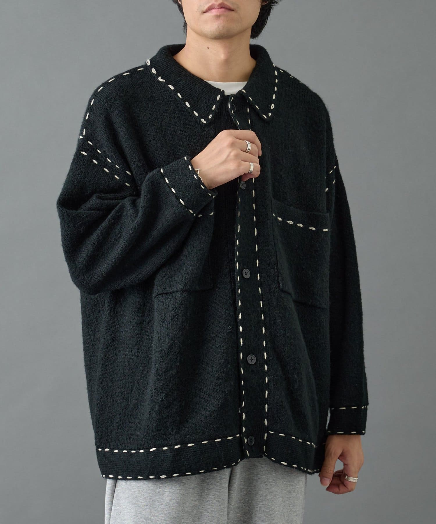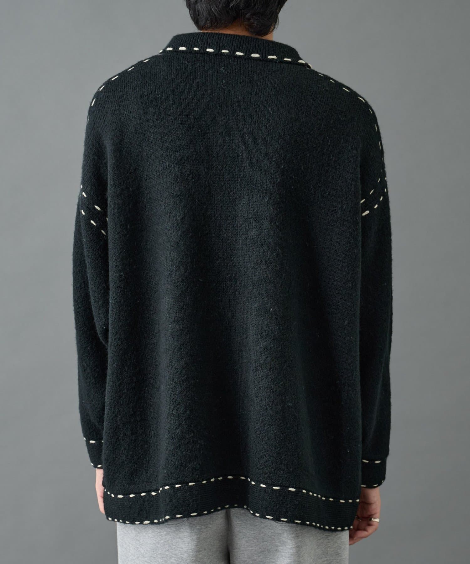 【ステッチがアクセントに。モヘアライクハンドステッチ襟付きカーディガン】