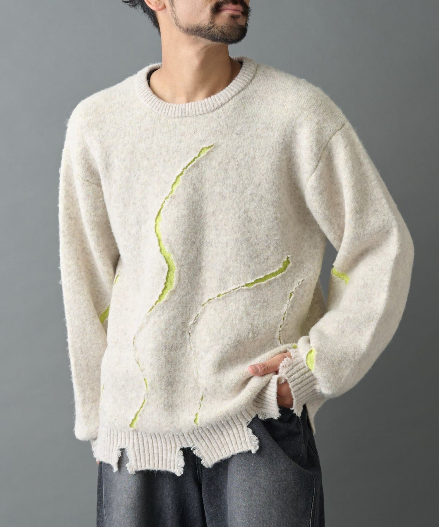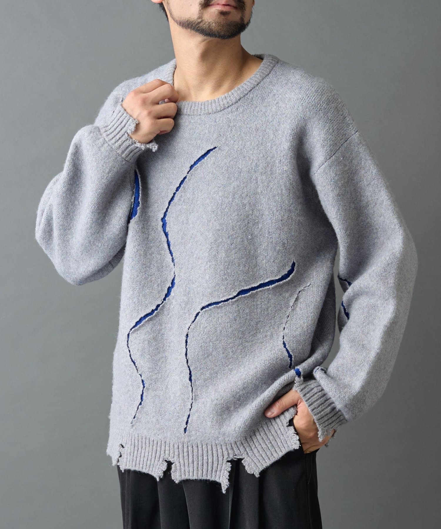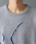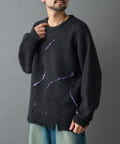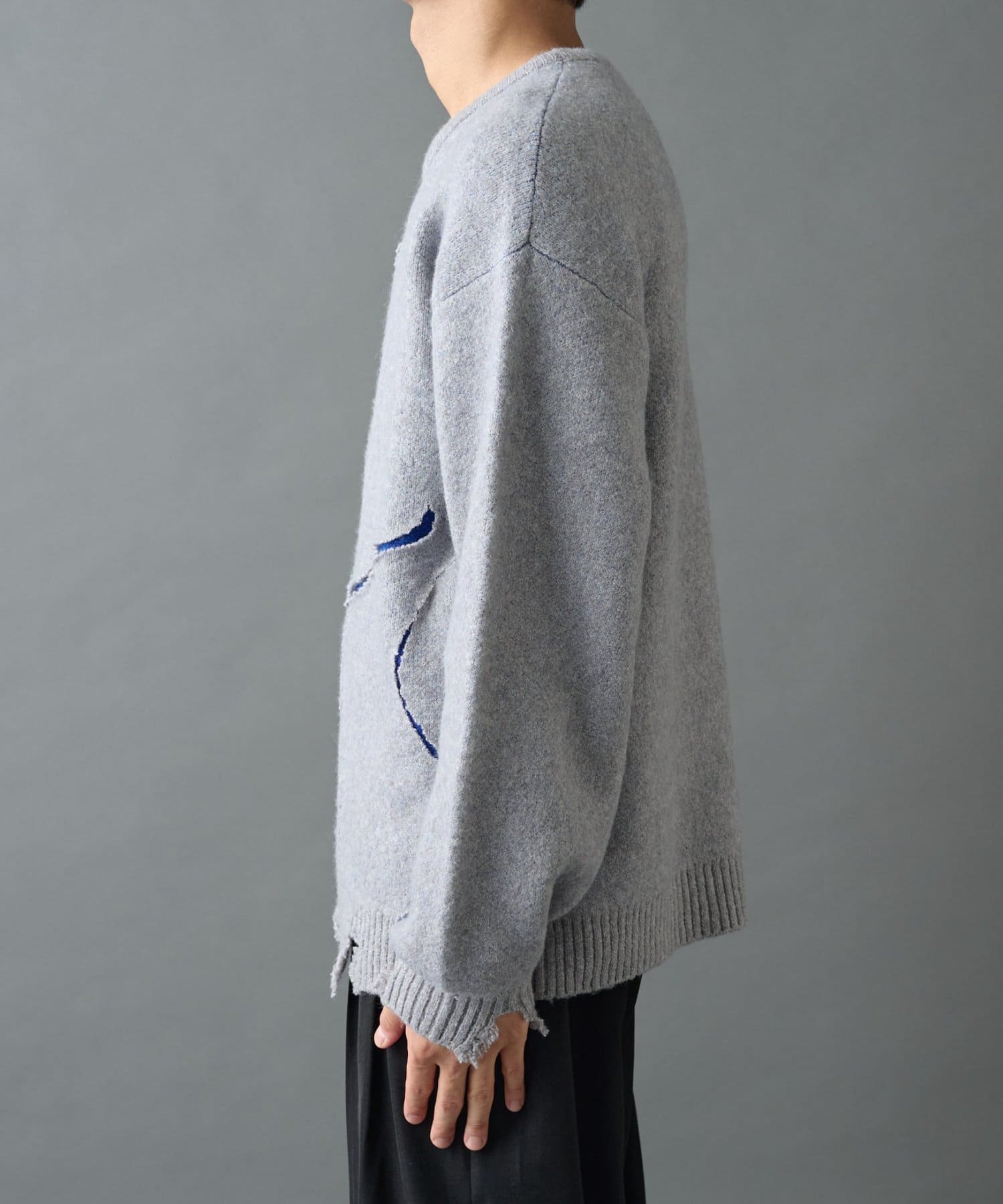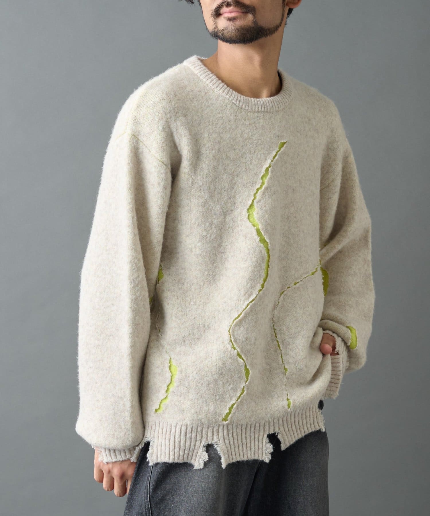 大胆な切り替えデザインとユニークな柄が目を引くクレイジージャガードニットです。