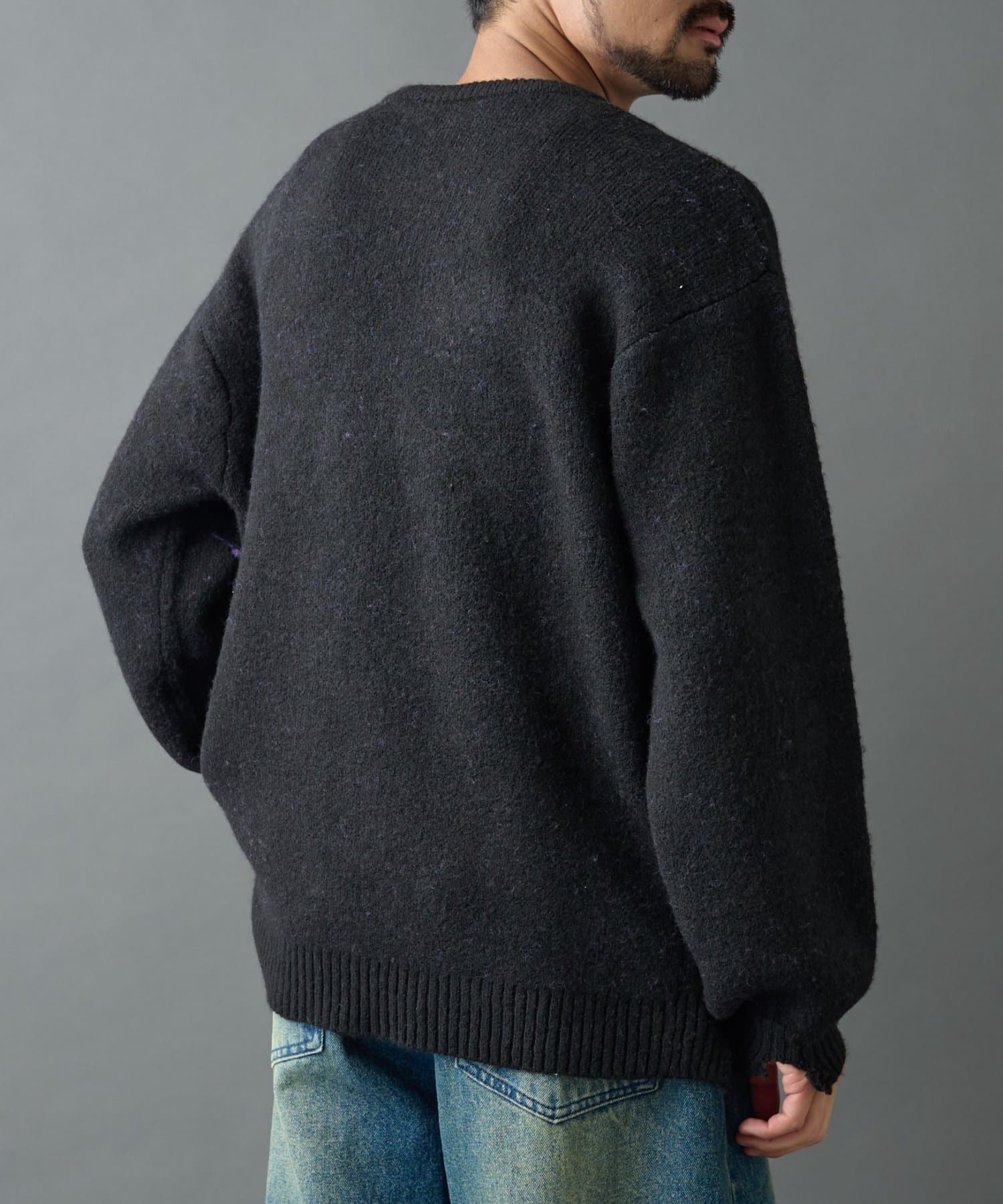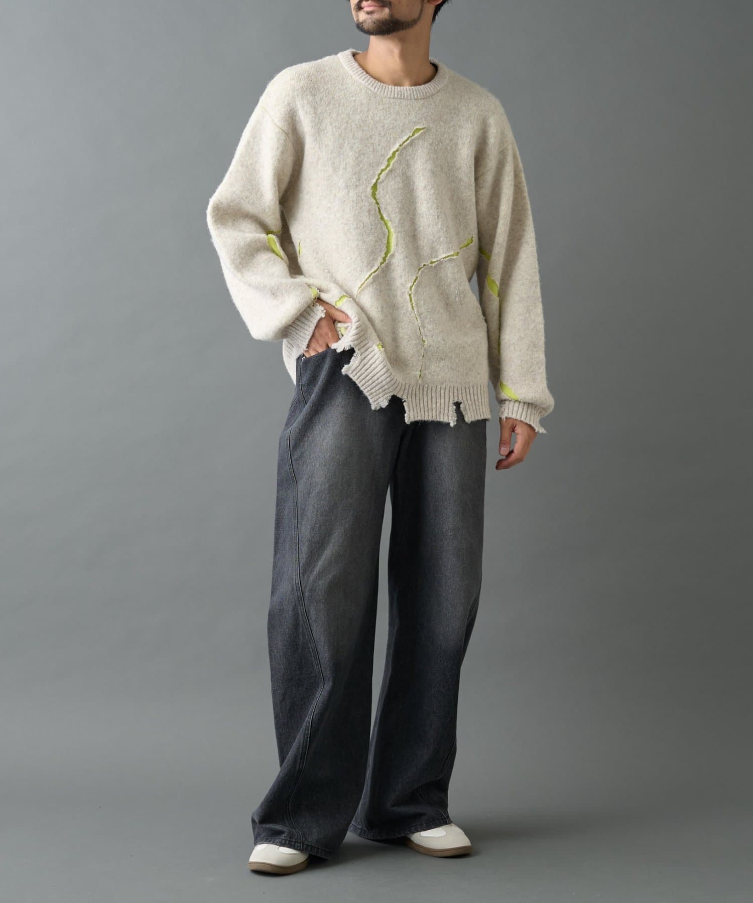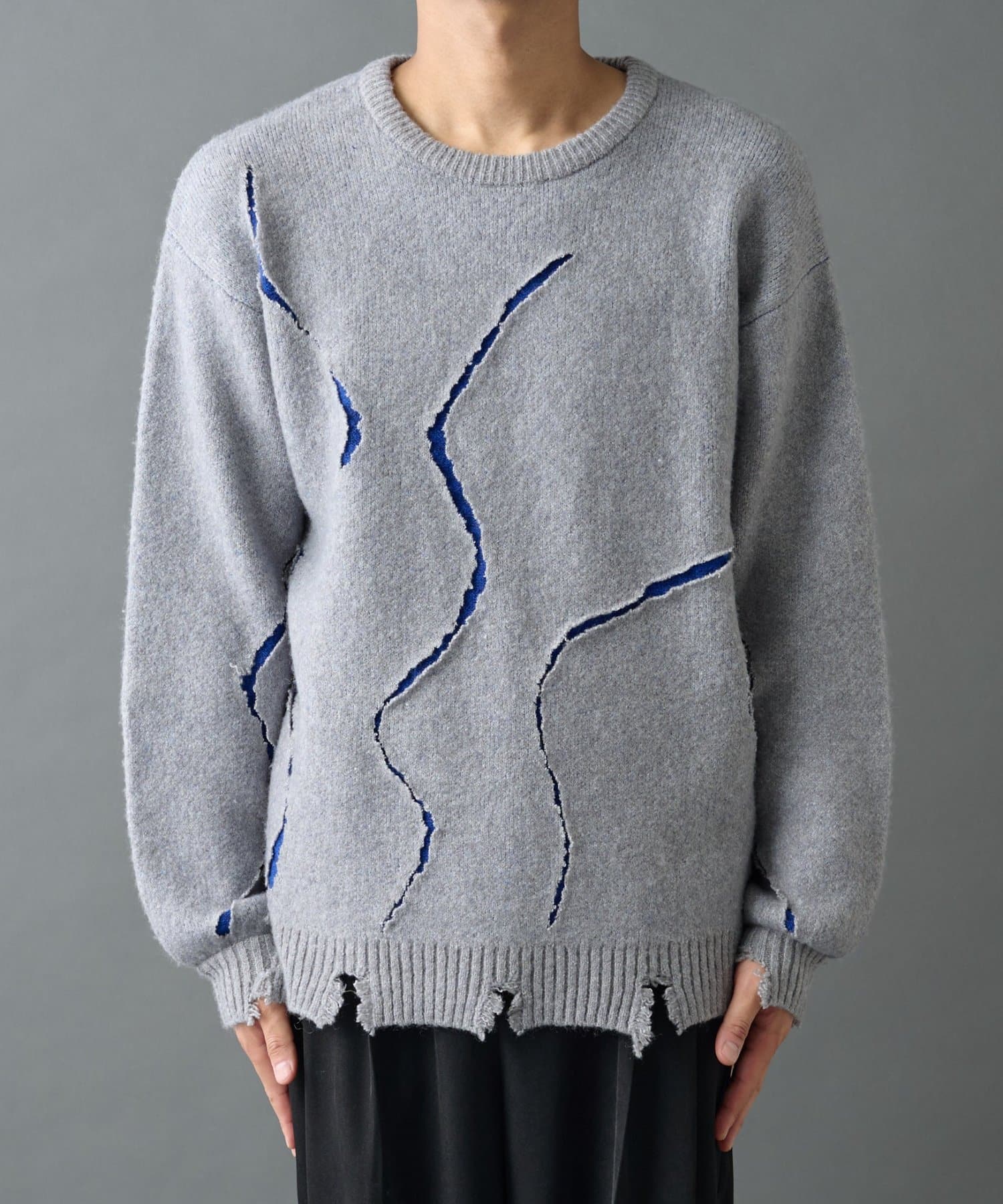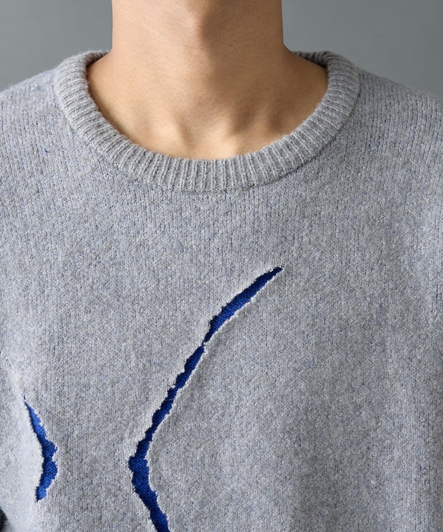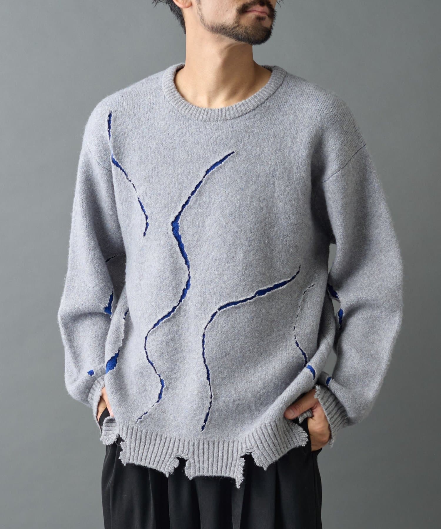 大胆な切り替えデザインとユニークな柄が目を引くクレイジージャガードニットです。