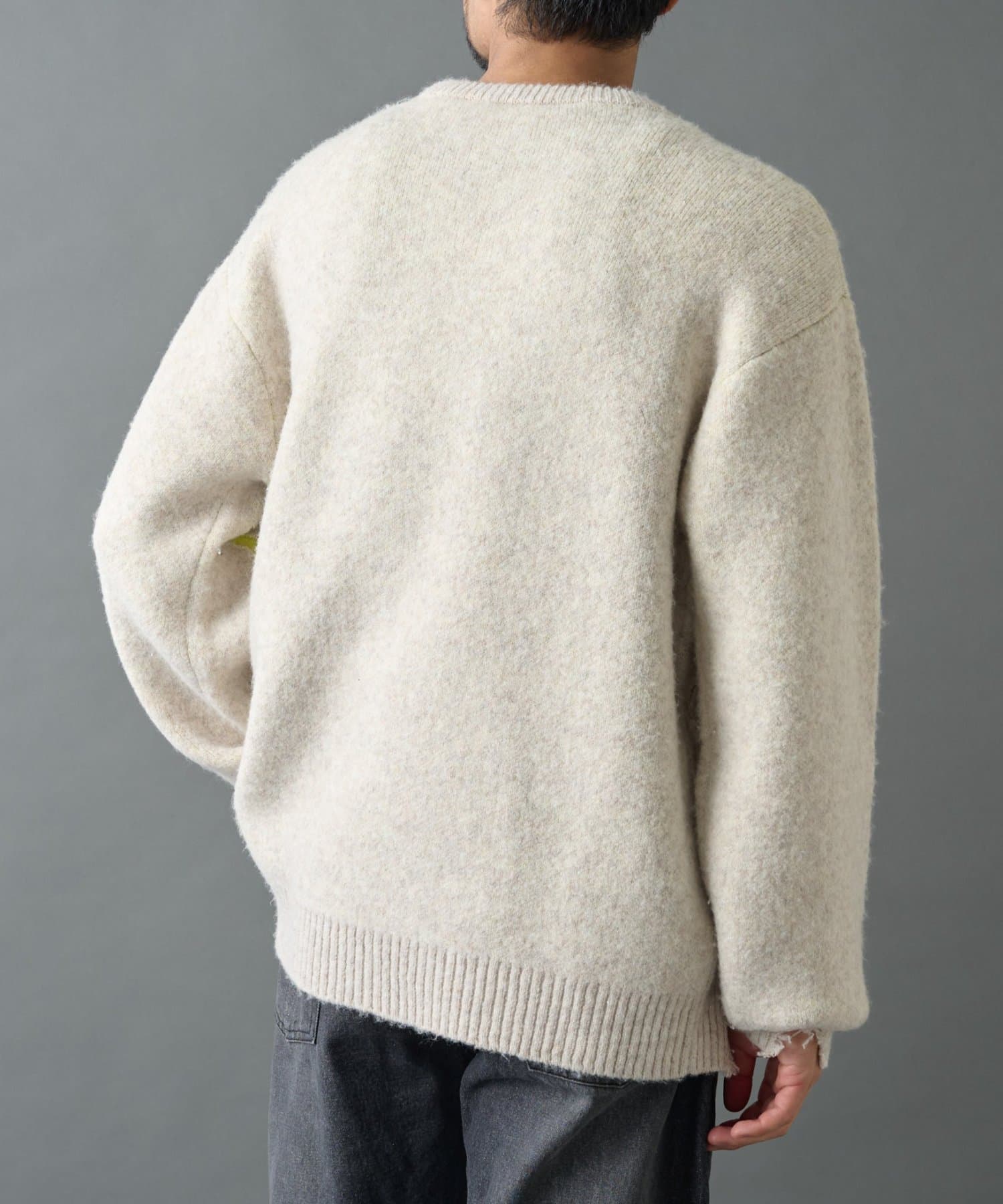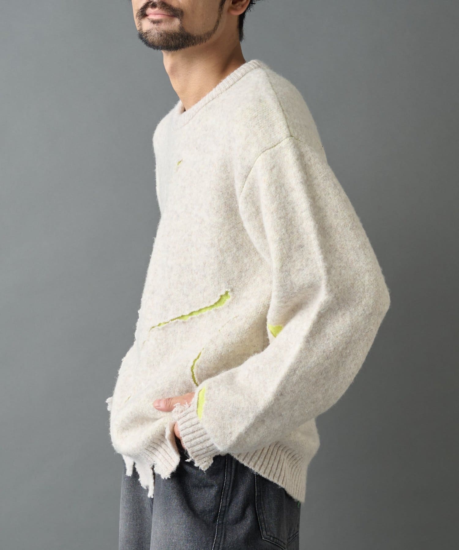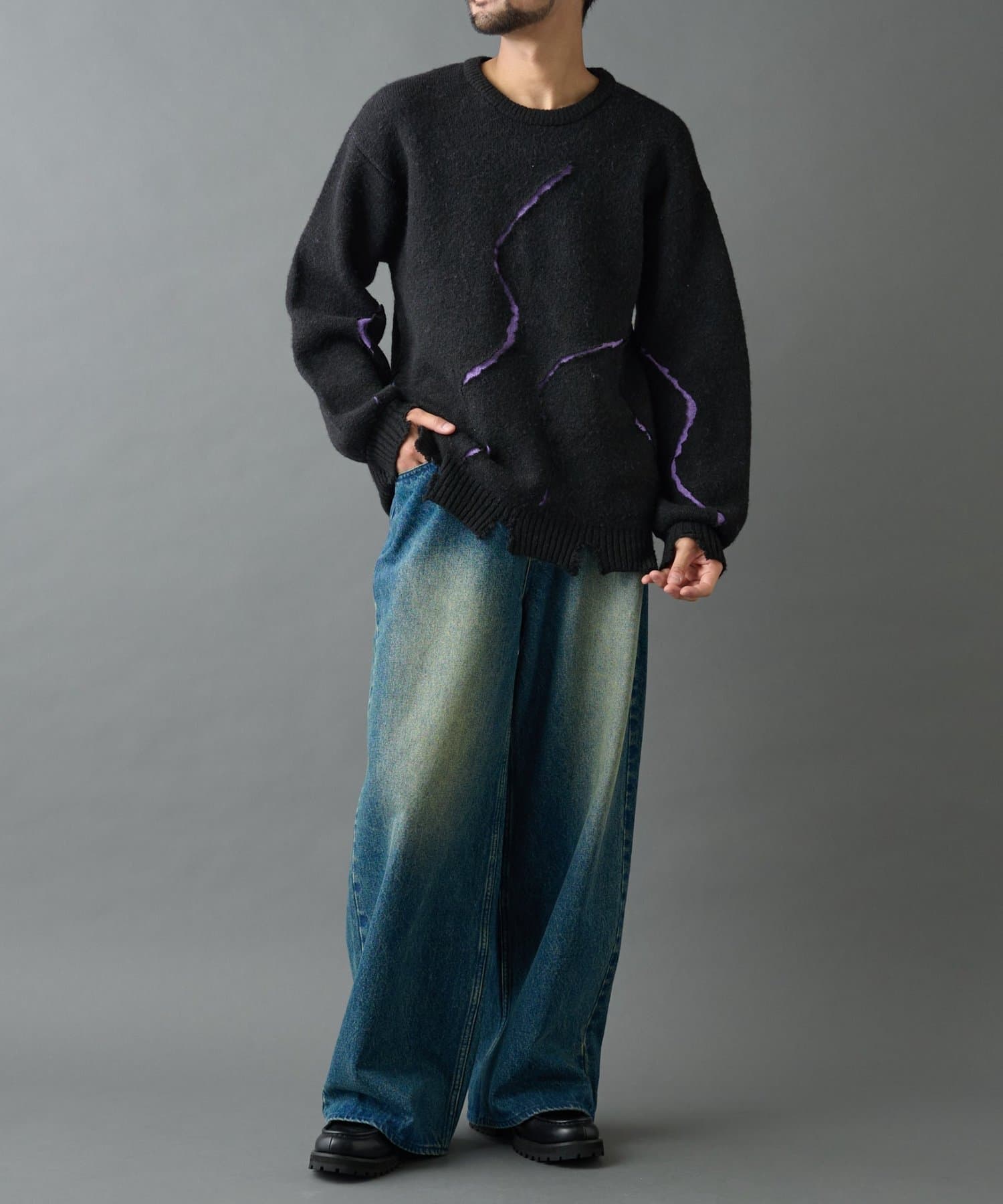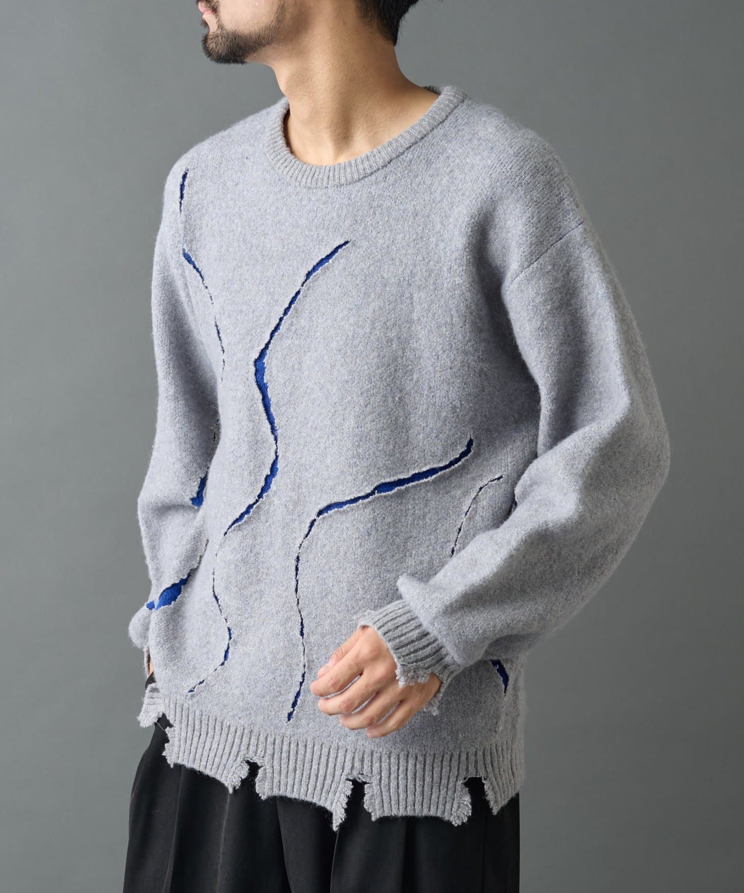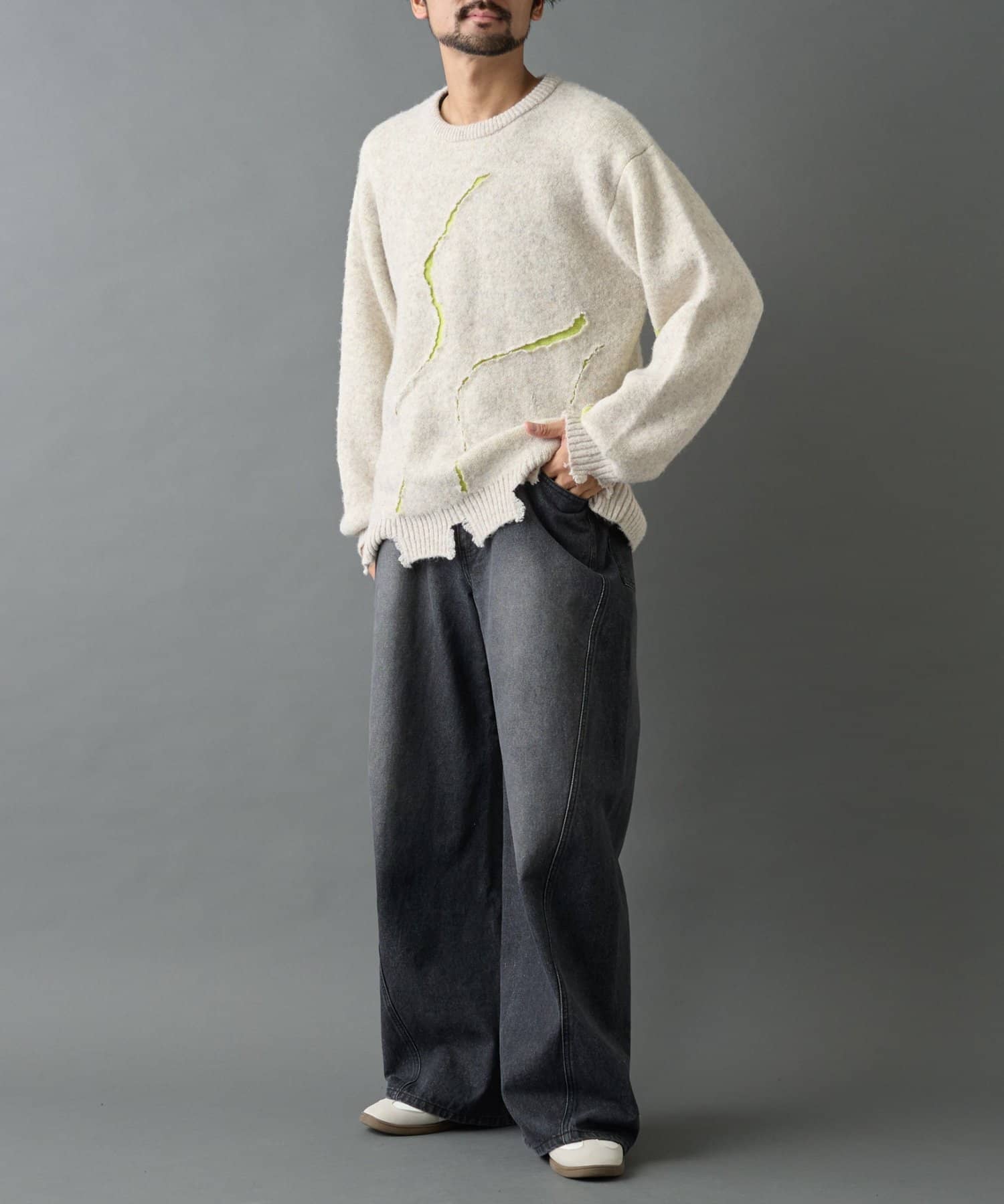 大胆な切り替えデザインとユニークな柄が目を引くクレイジージャガードニットです。