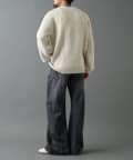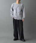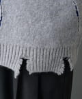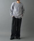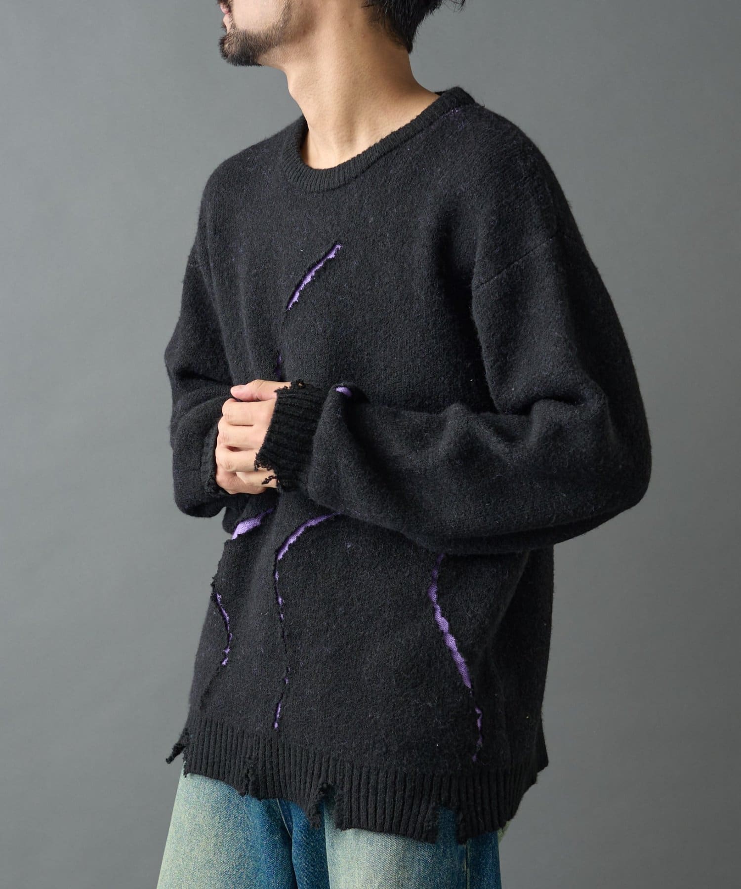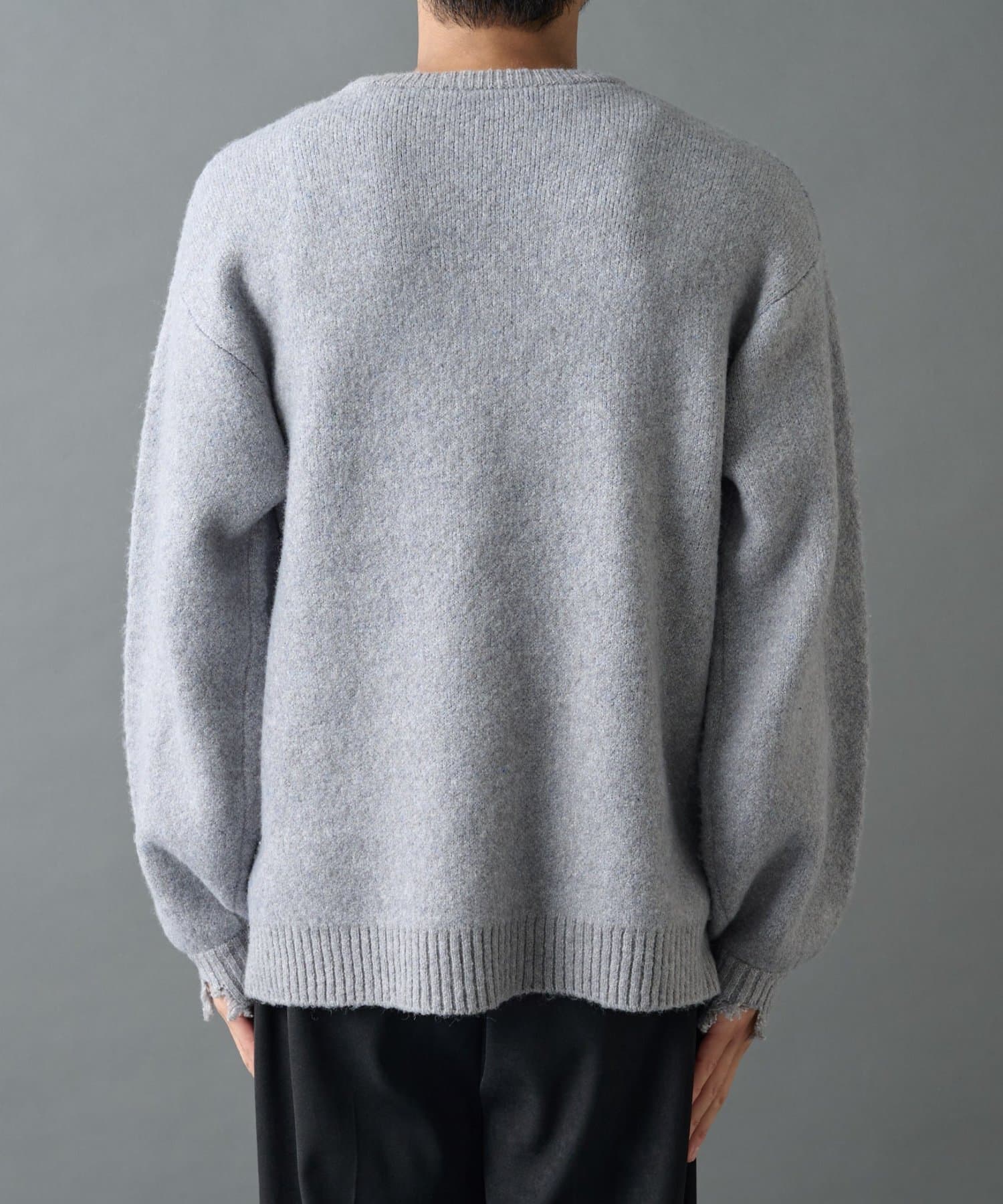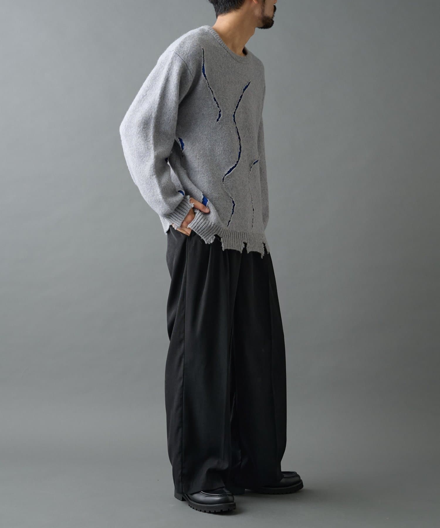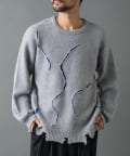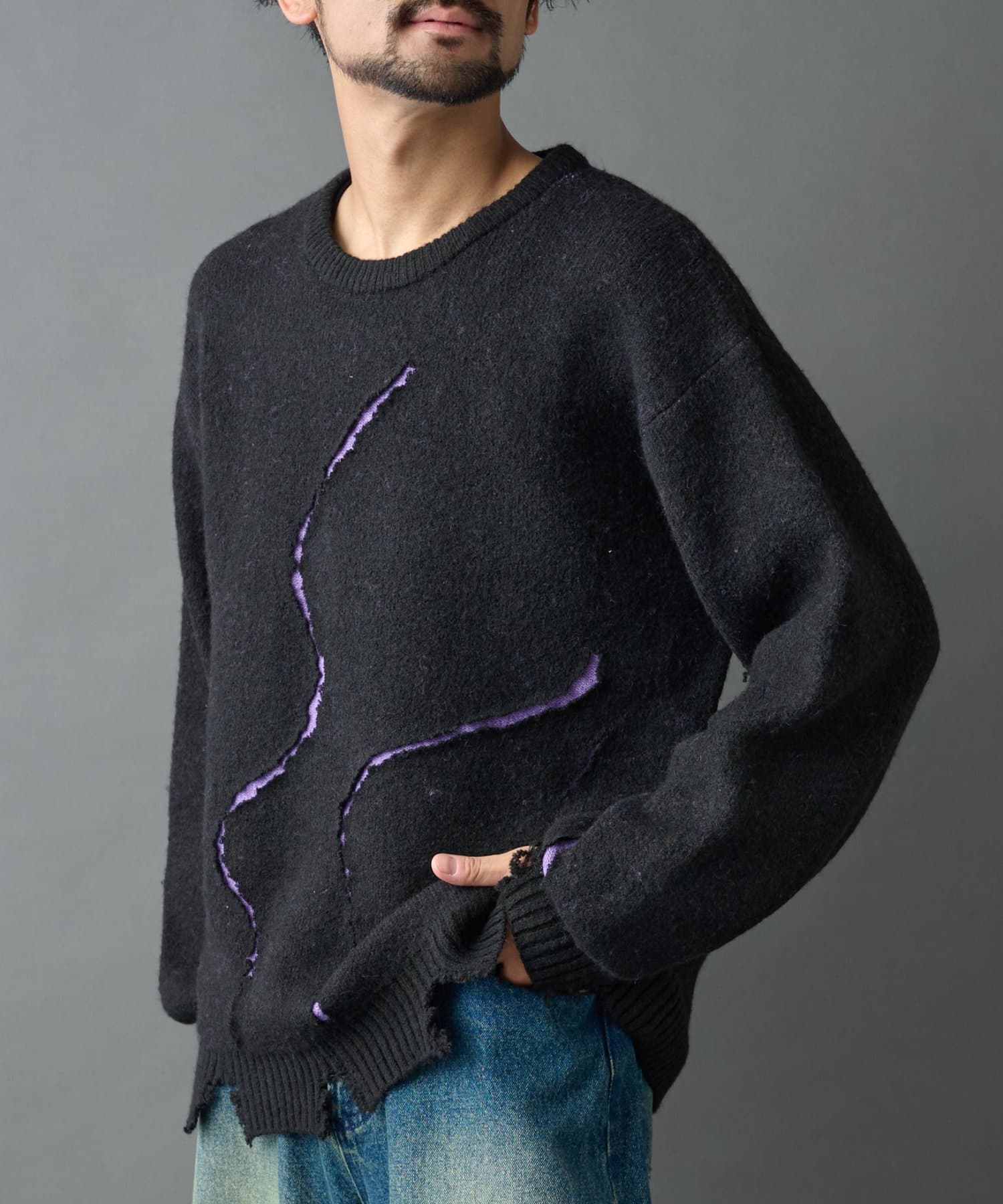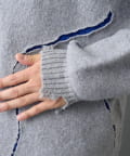 大胆な切り替えデザインとユニークな柄が目を引くクレイジージャガードニットです。