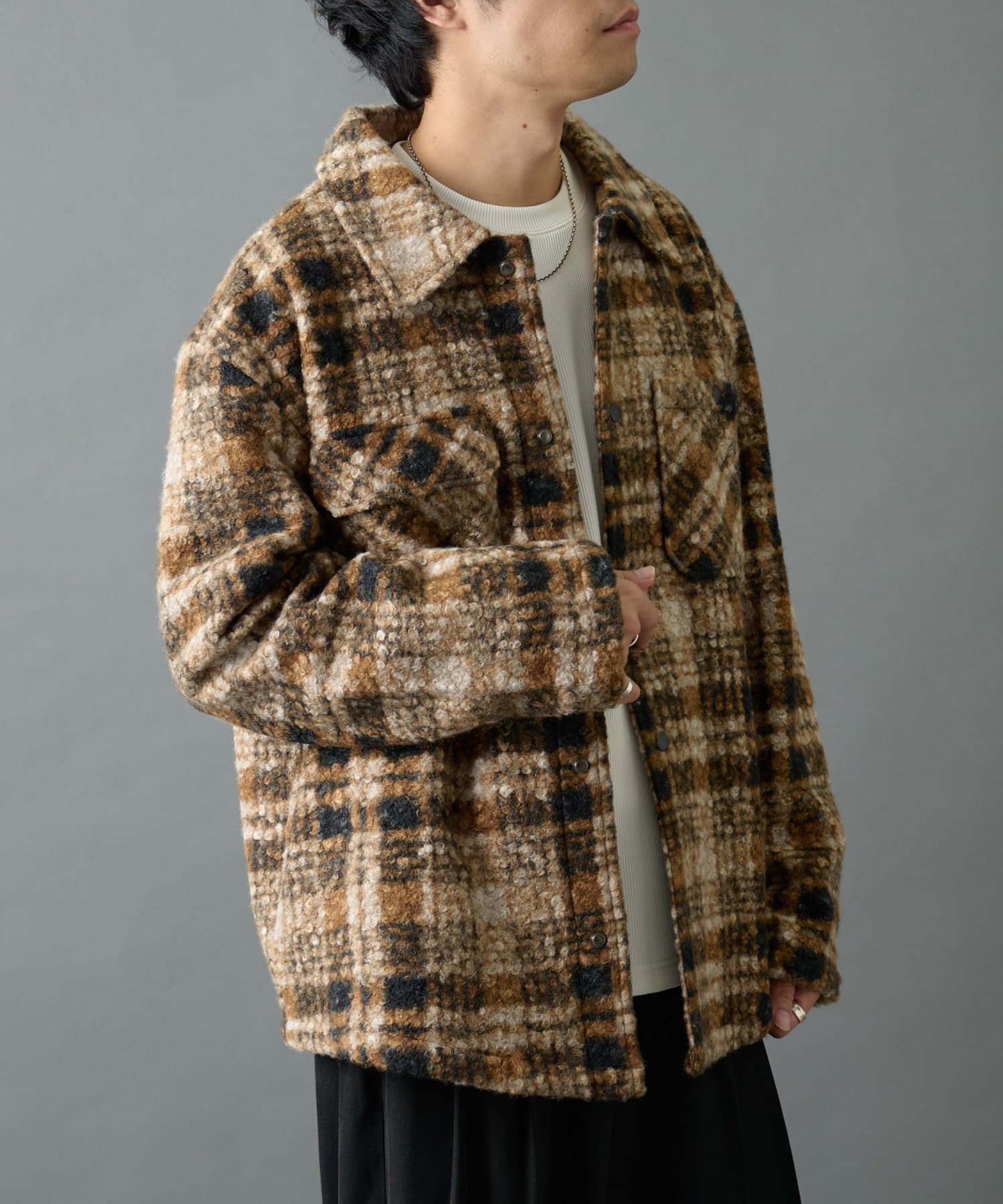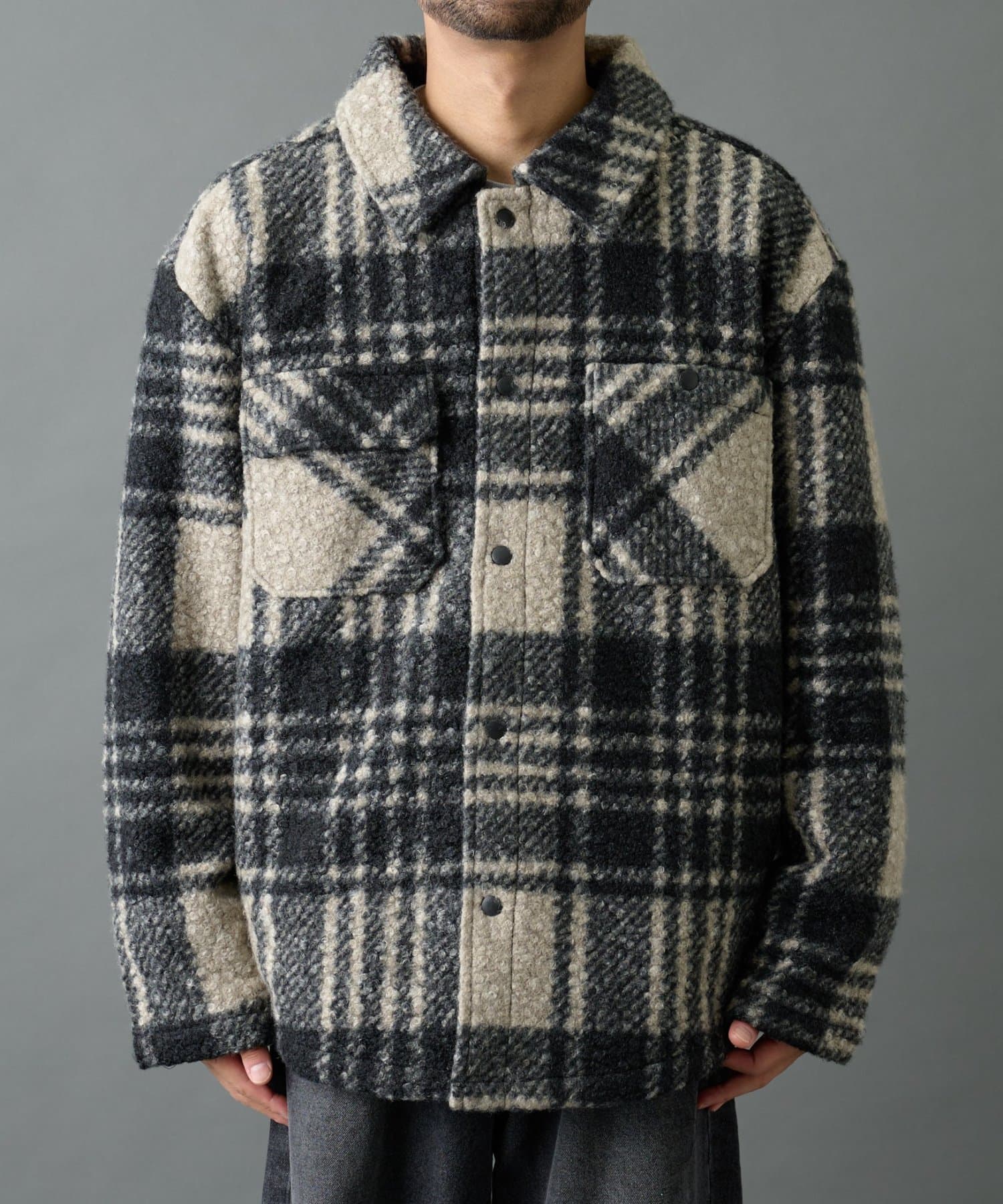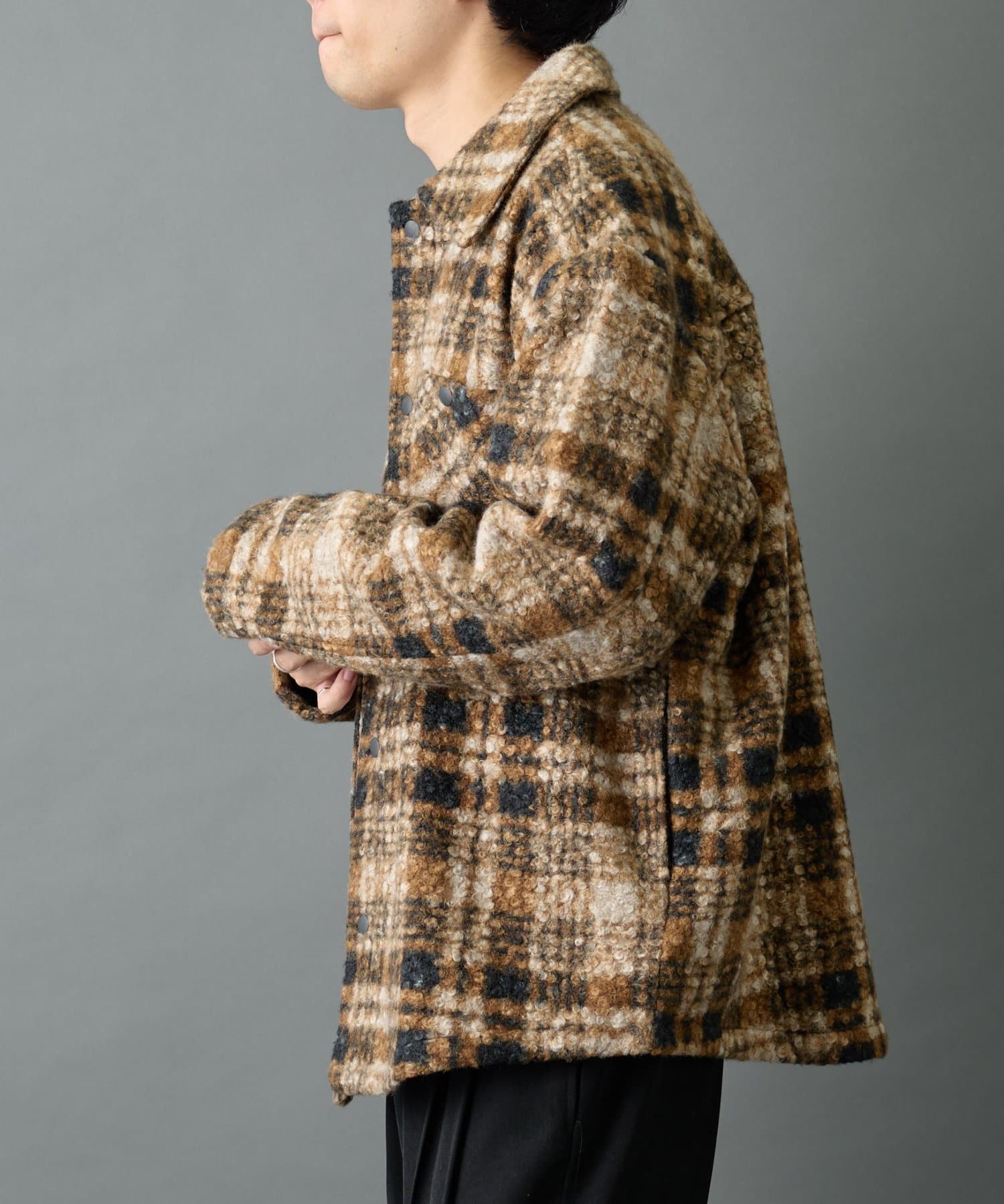 大人っぽいチェック柄とスナップボタンデザインが特徴のブークレチェックジャケットです。