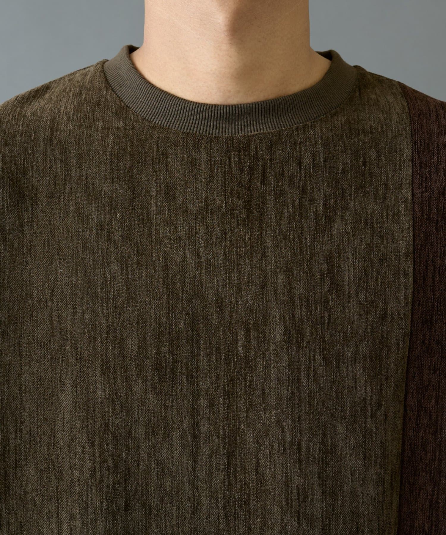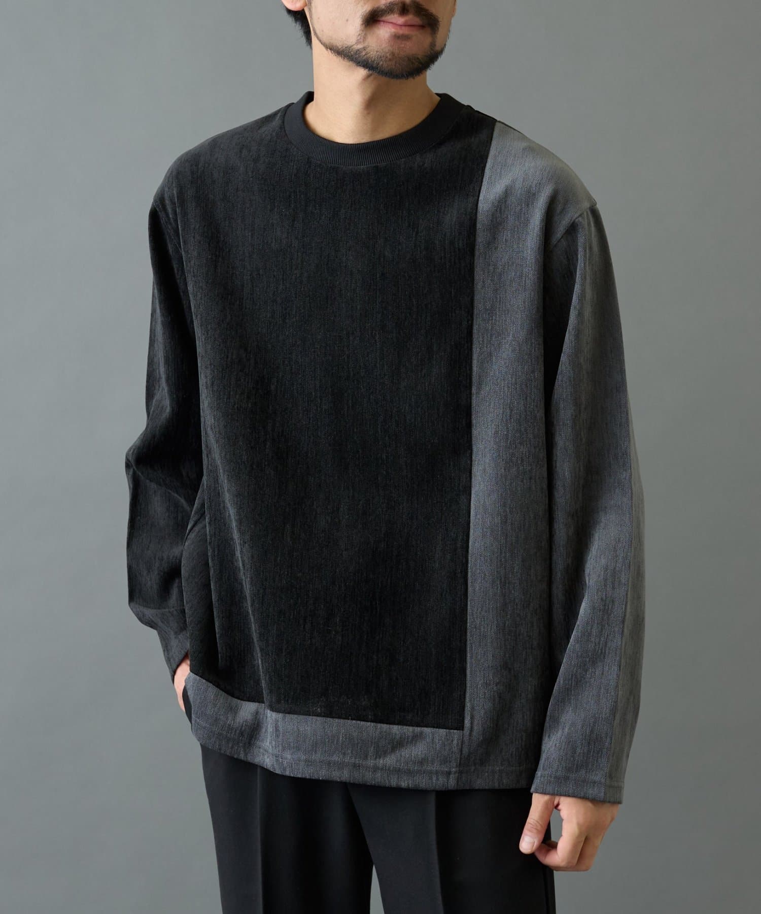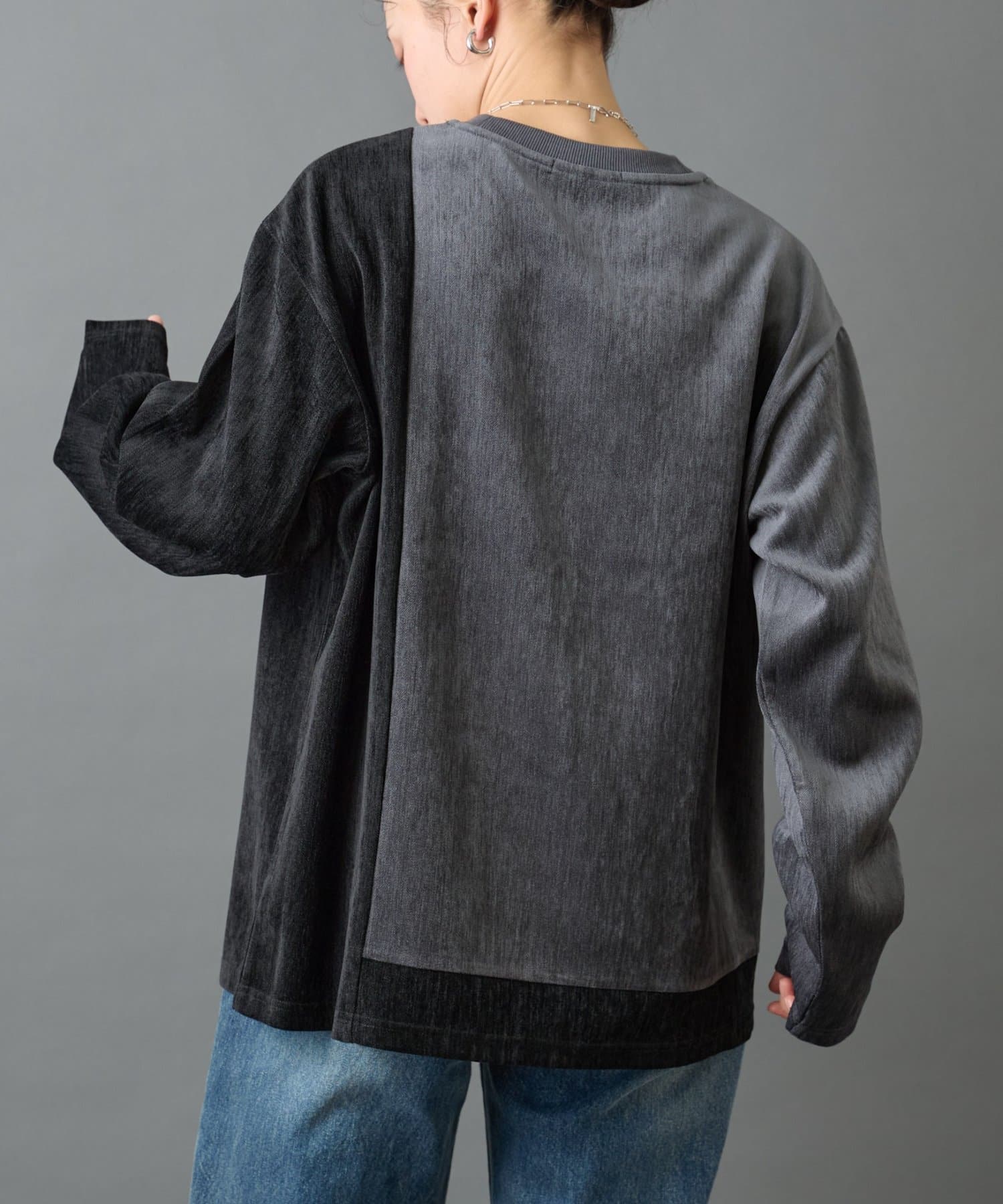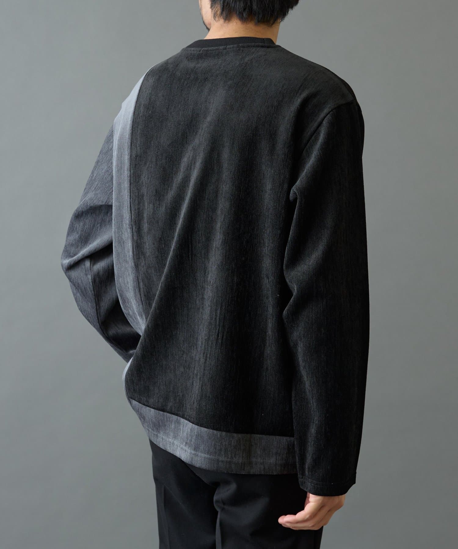 上品なフェードカラーとバイカラー切り替えが印象的なモール素材のクルーネックプルオーバーです。