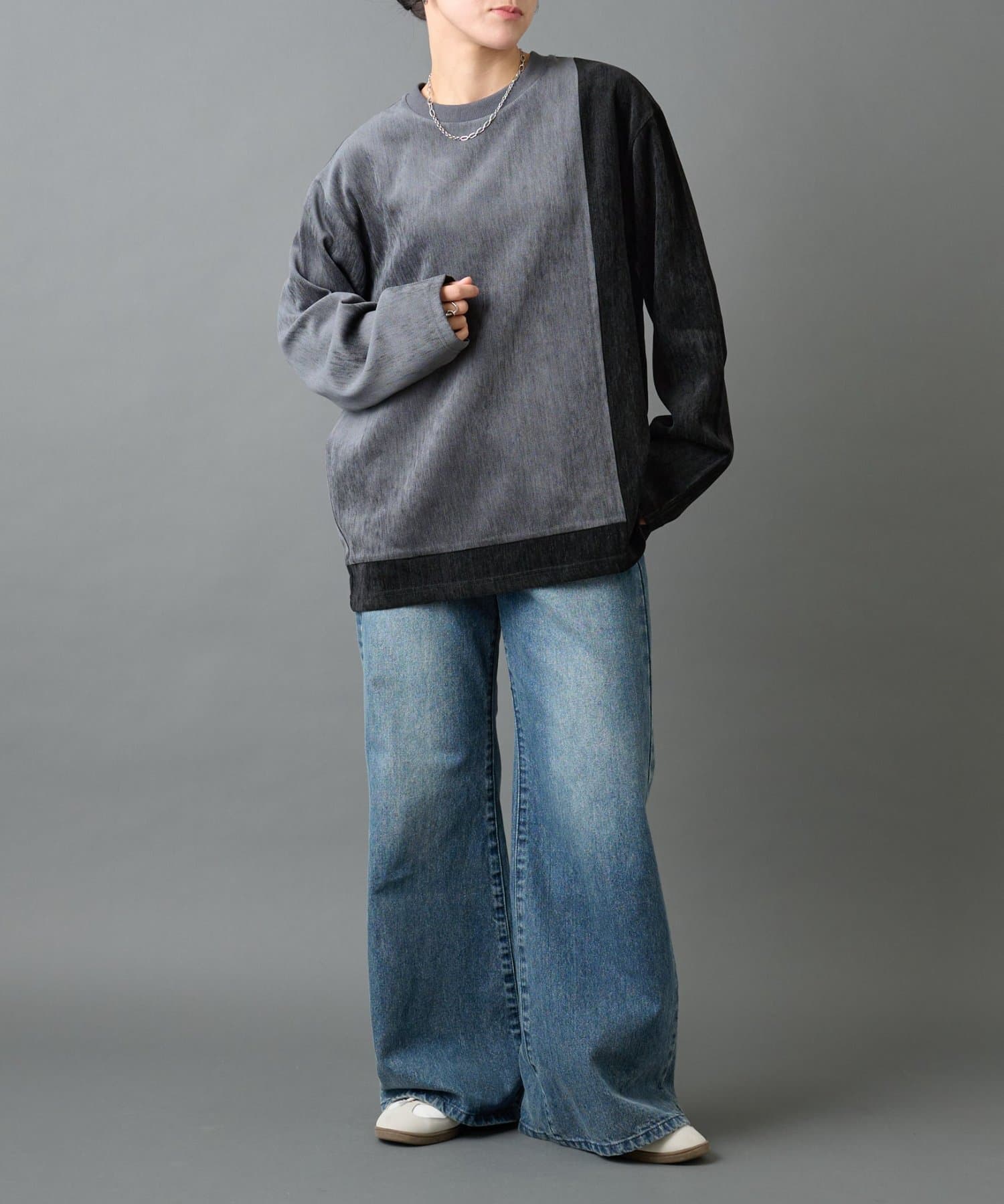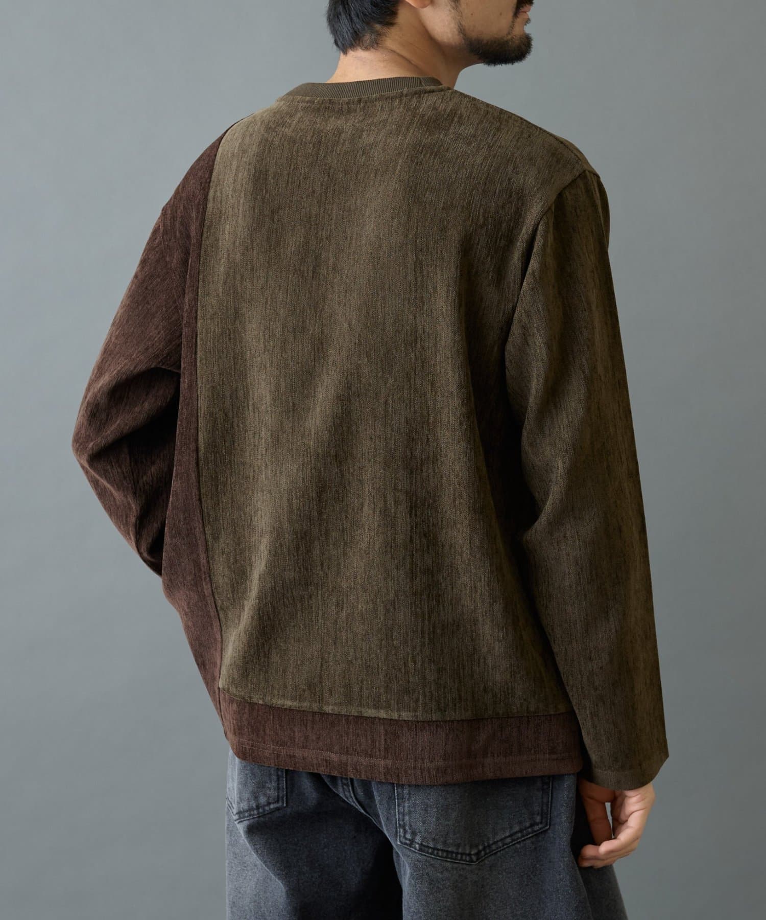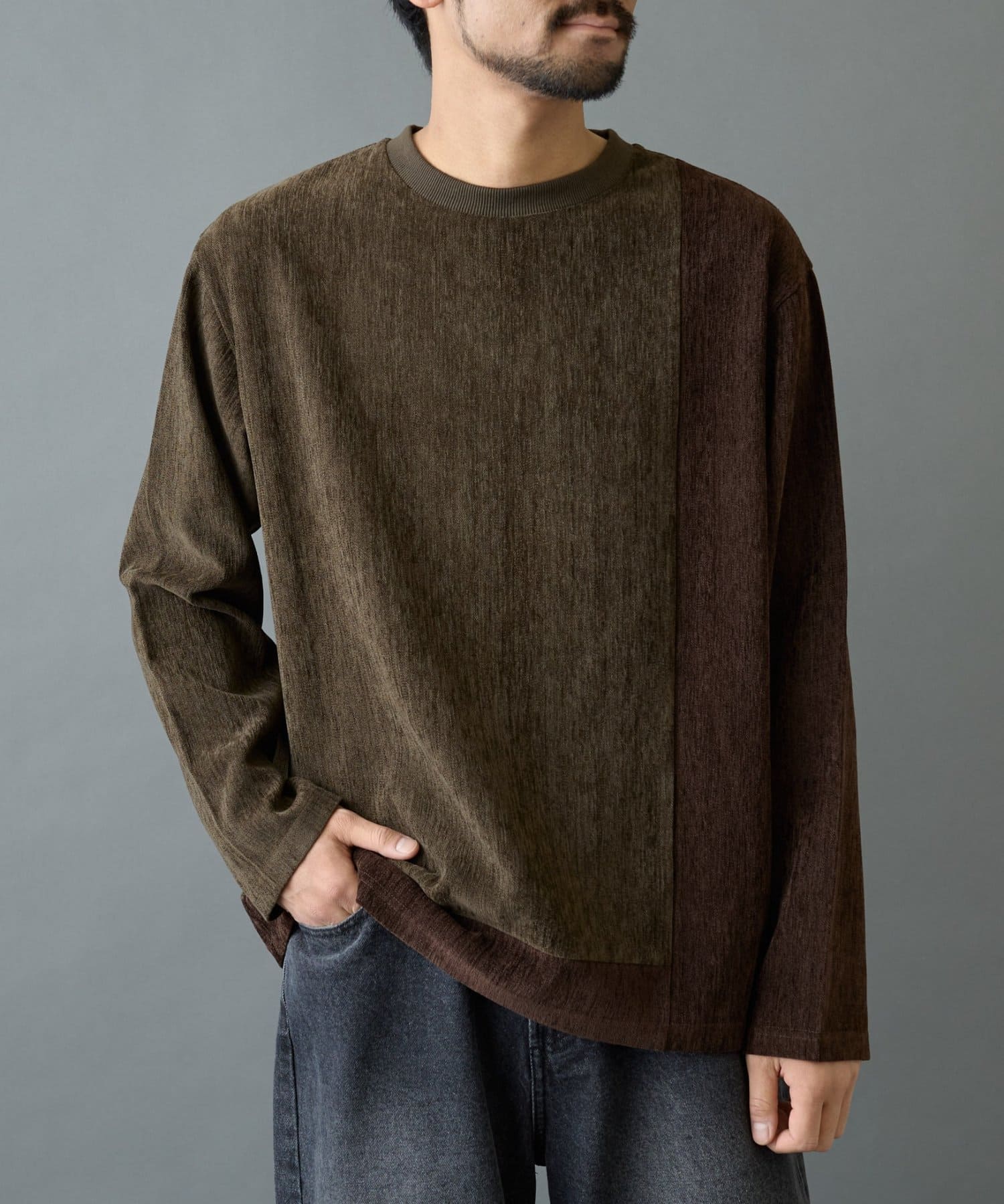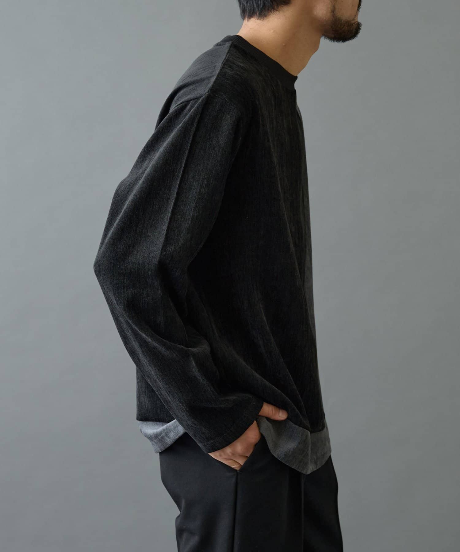 上品なフェードカラーとバイカラー切り替えが印象的なモール素材のクルーネックプルオーバーです。