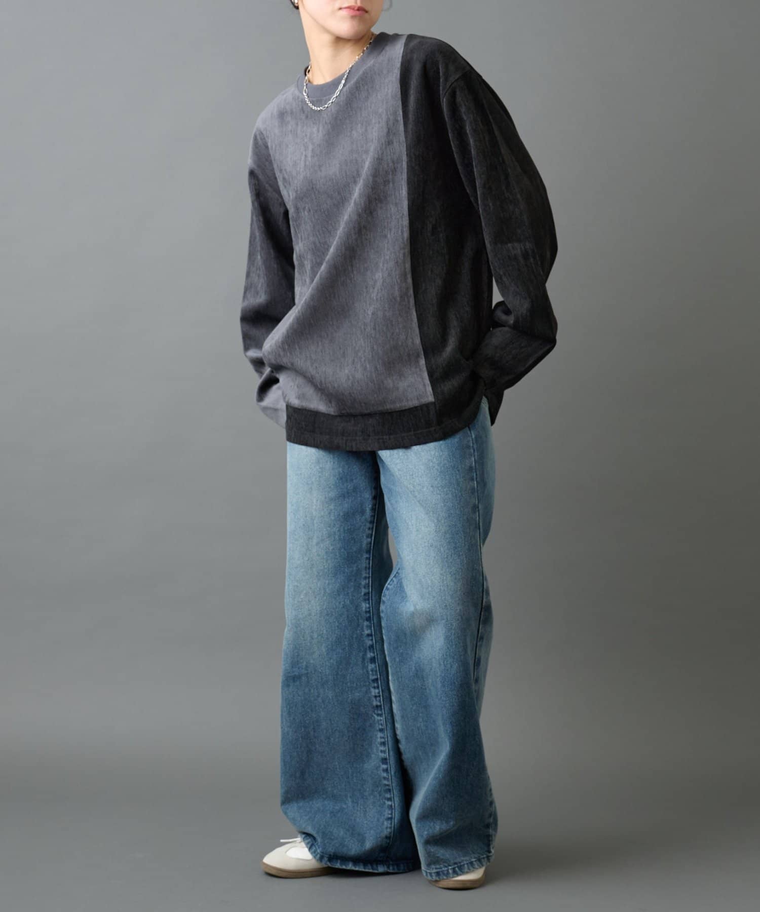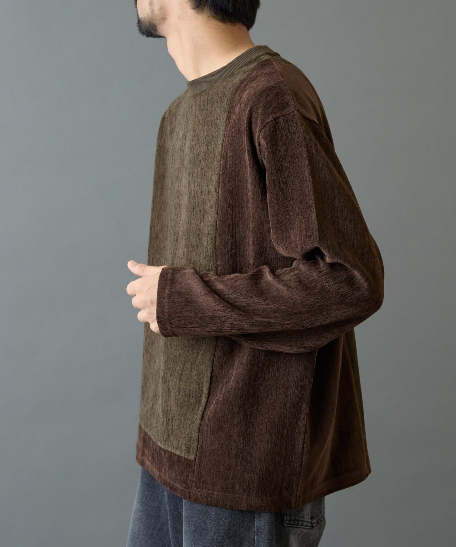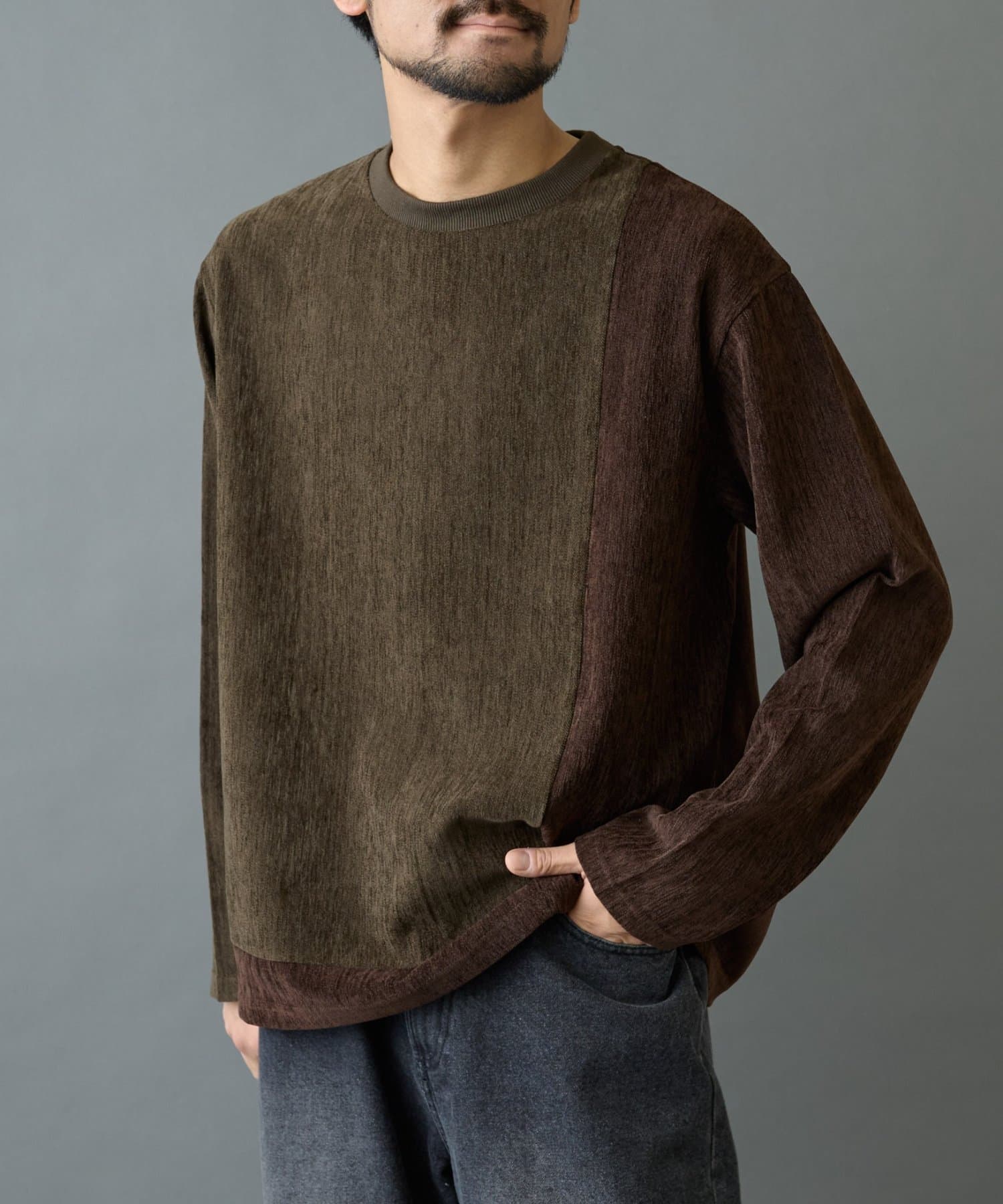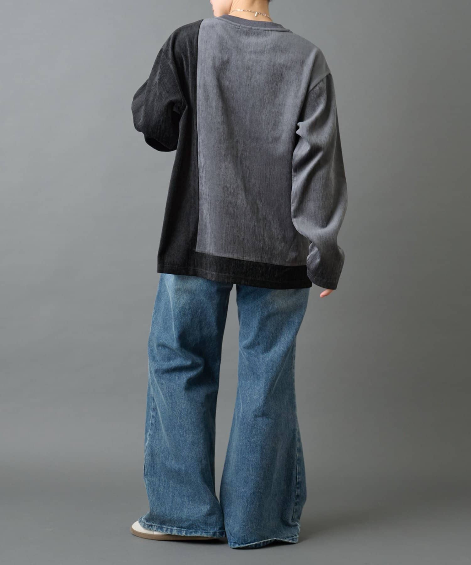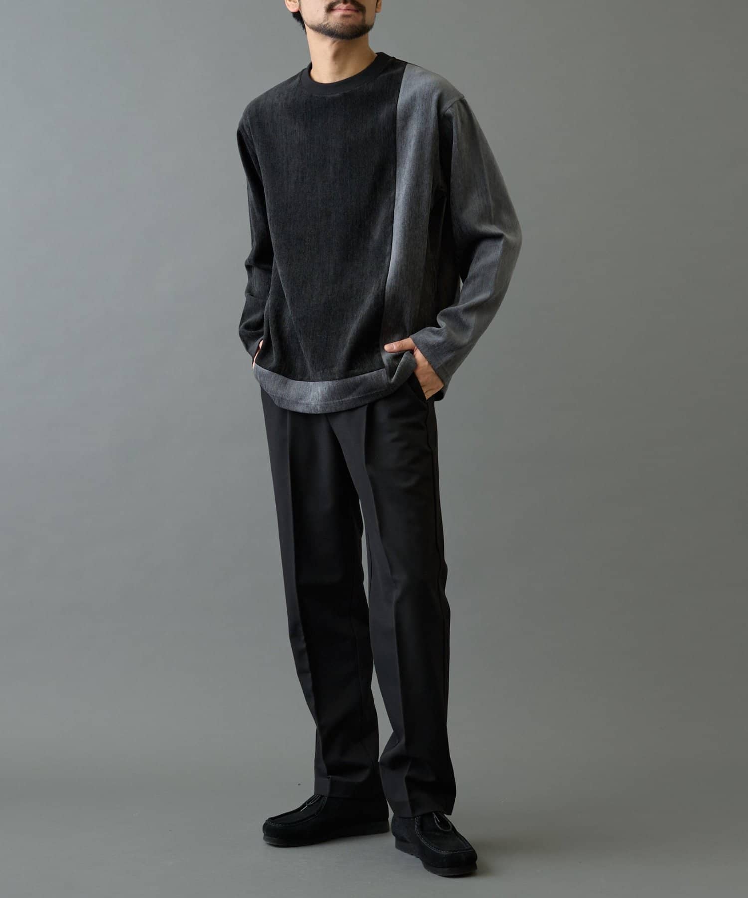 上品なフェードカラーとバイカラー切り替えが印象的なモール素材のクルーネックプルオーバーです。