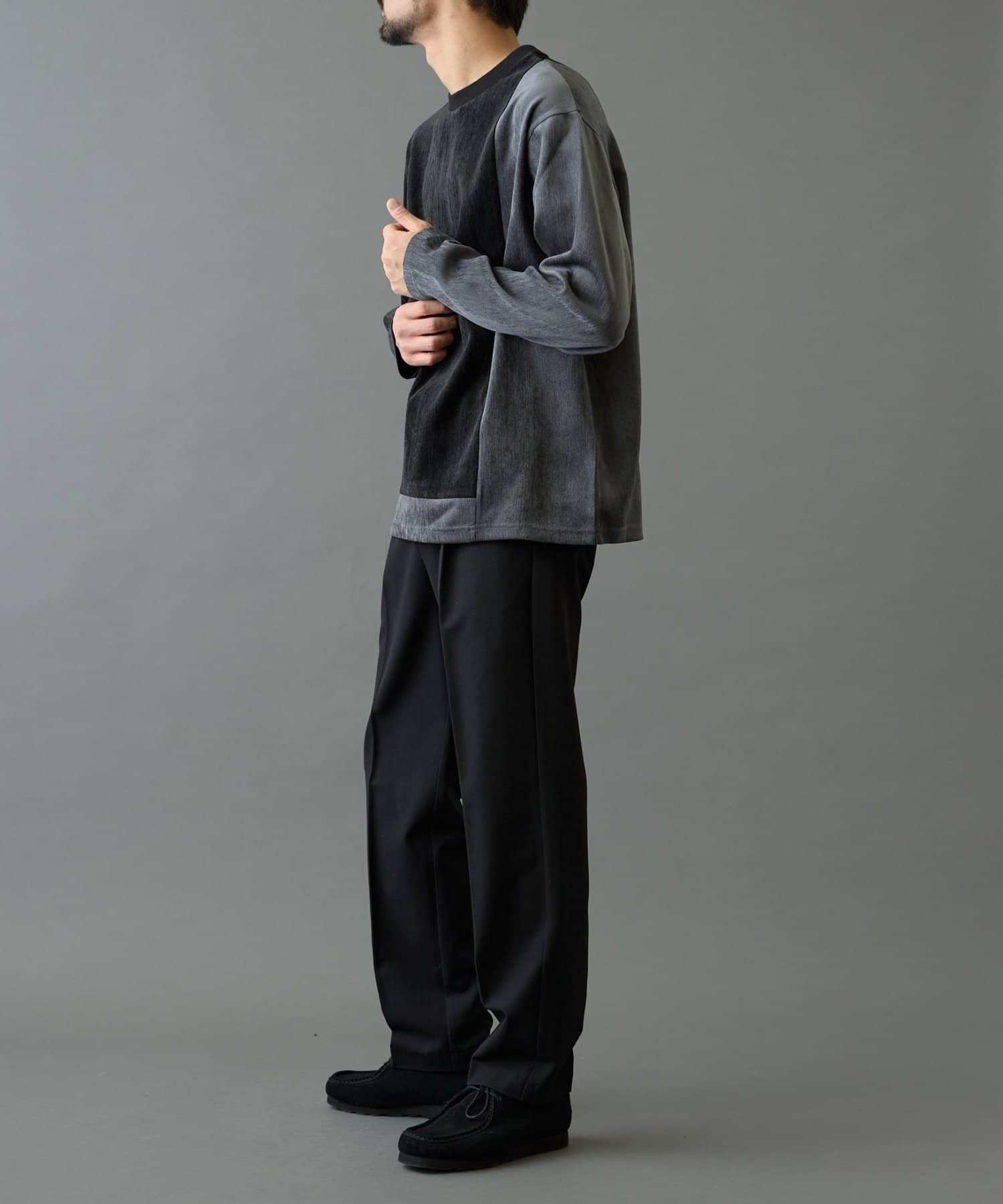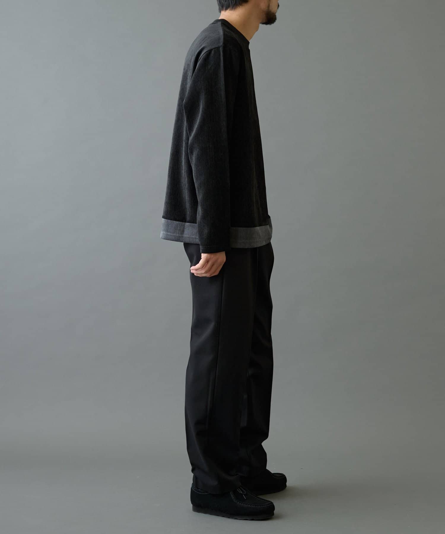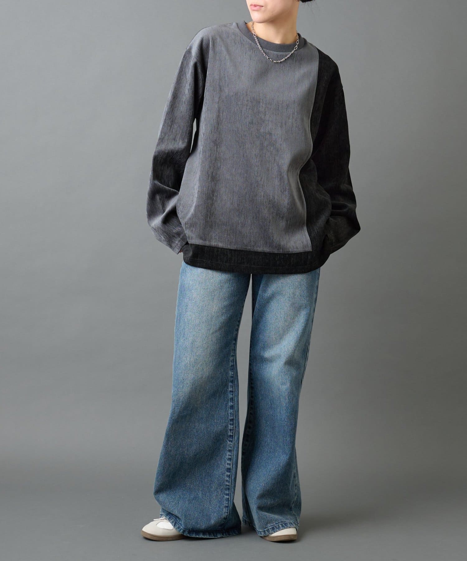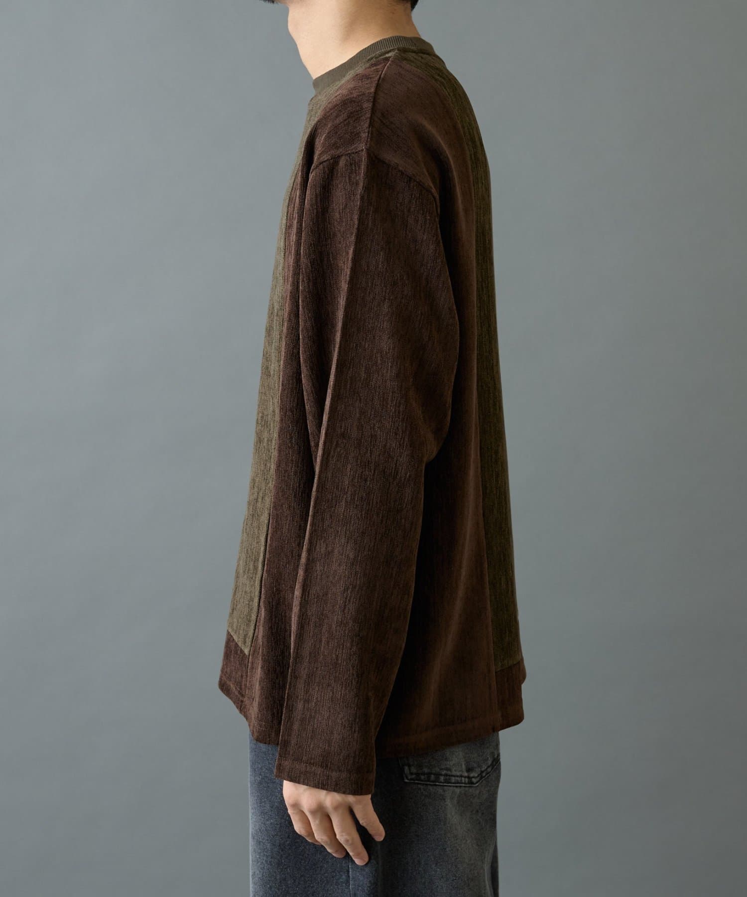 上品なフェードカラーとバイカラー切り替えが印象的なモール素材のクルーネックプルオーバーです。