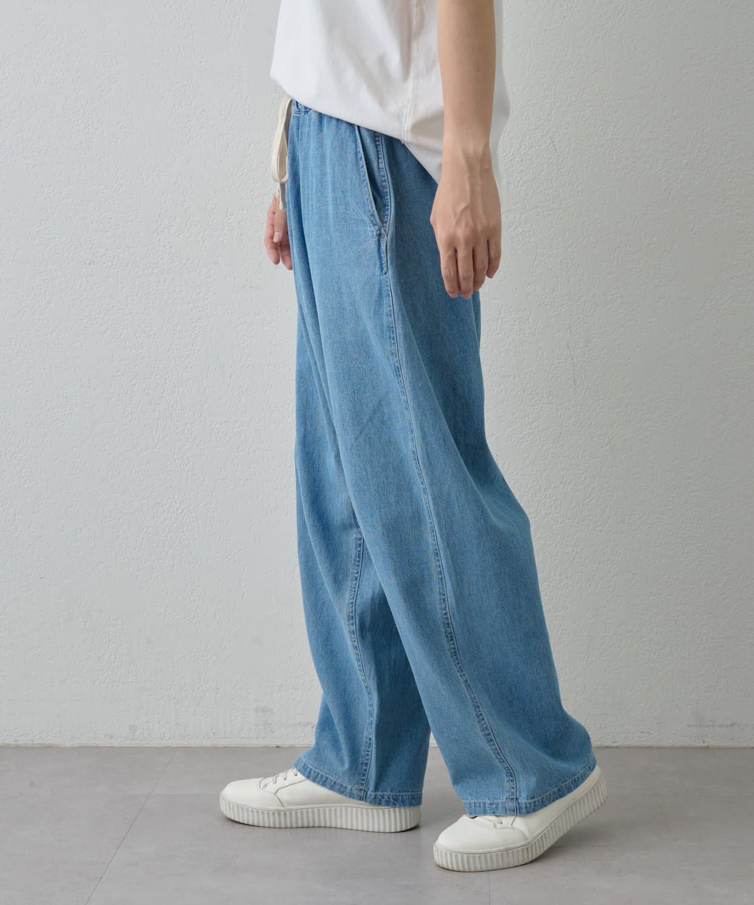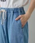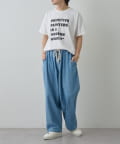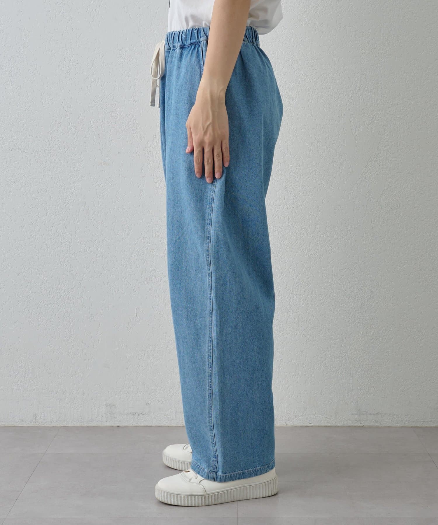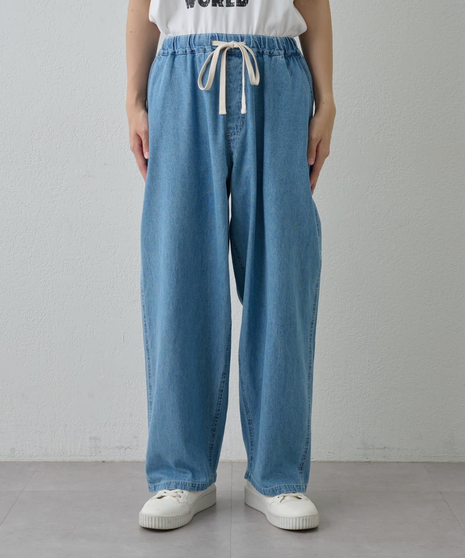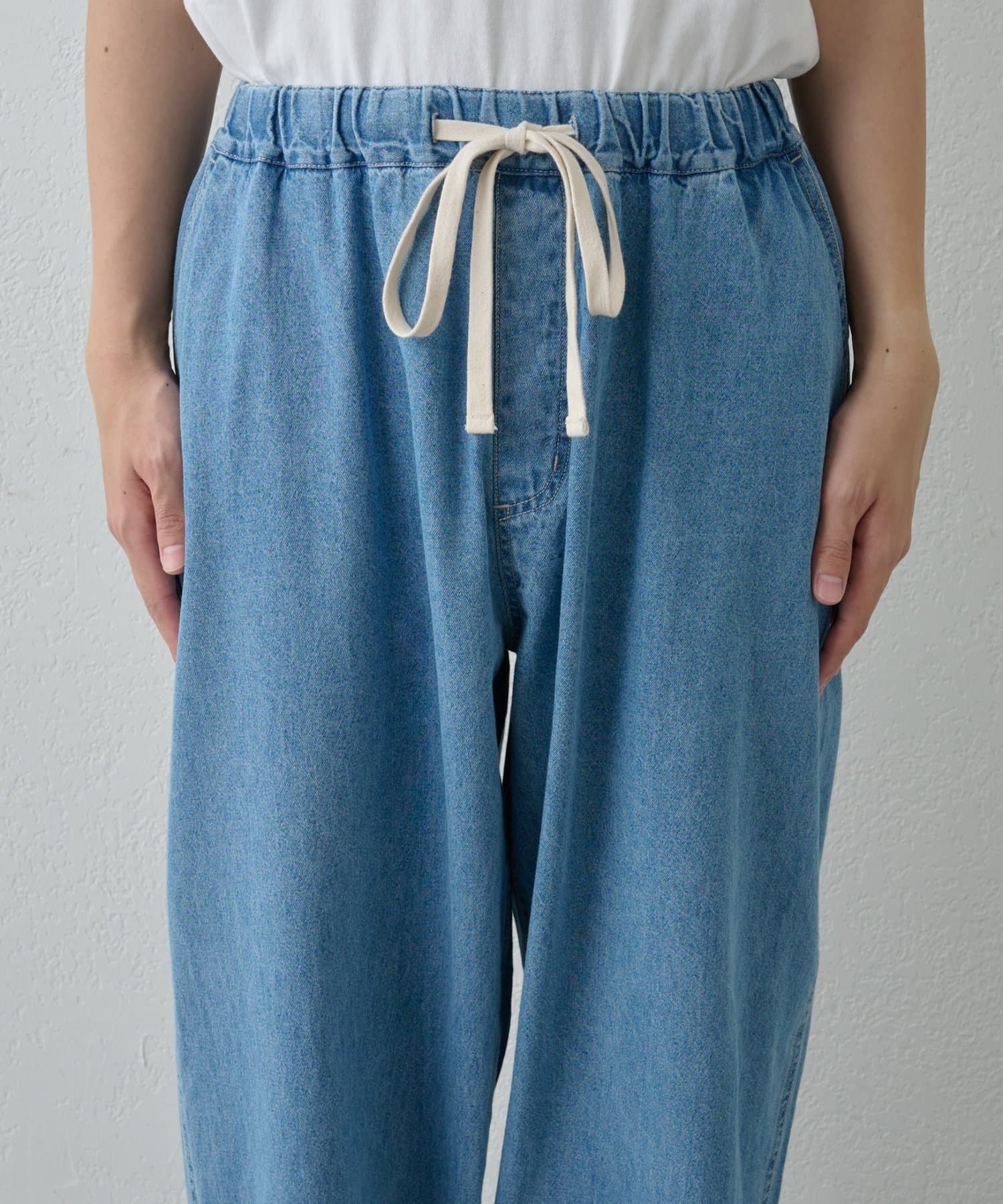 ウエストの紐がヘルシーなアクセントになり、タックインスタイルやコンパクトな丈感のアイテムとの相性もいいアイテムです。