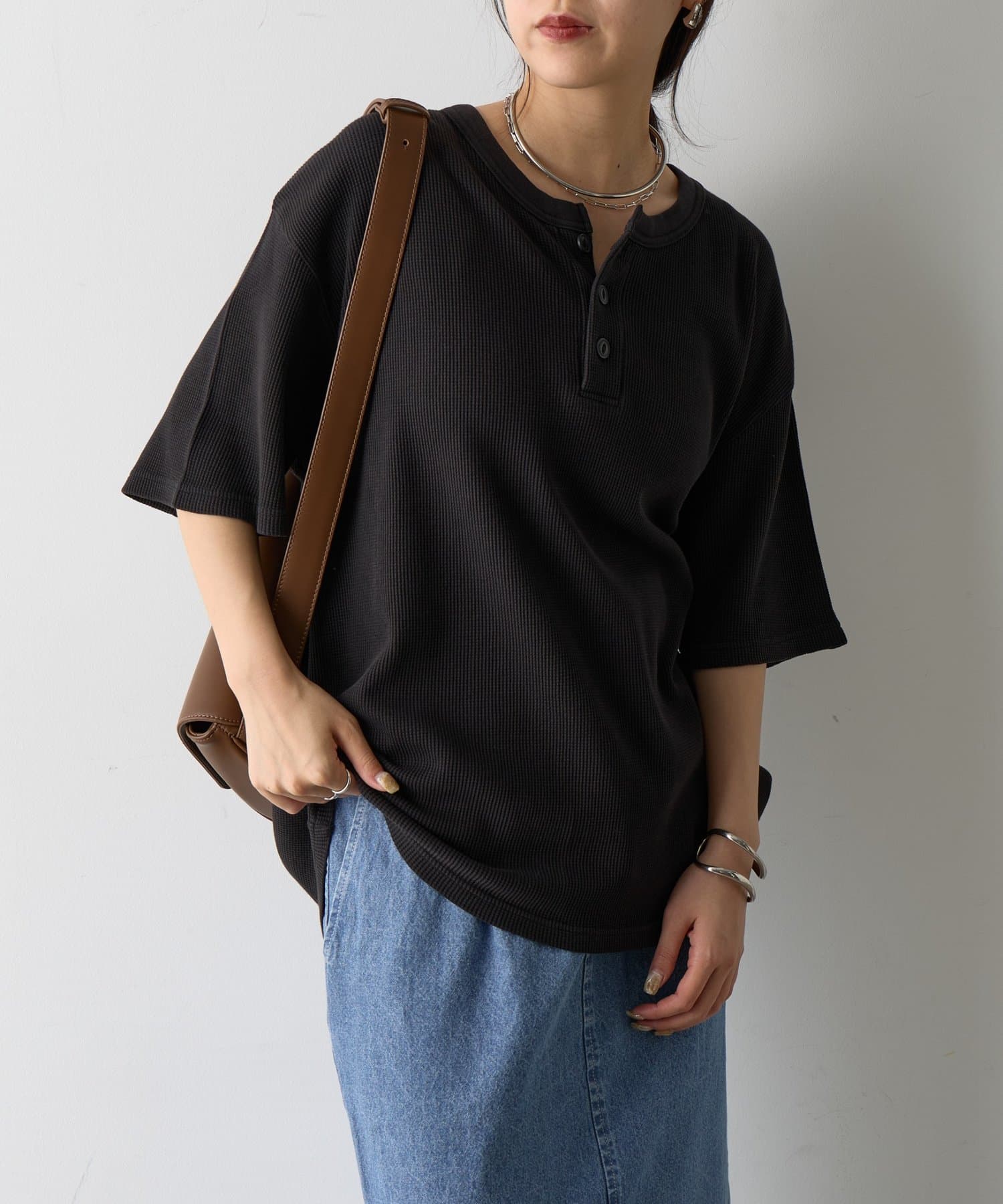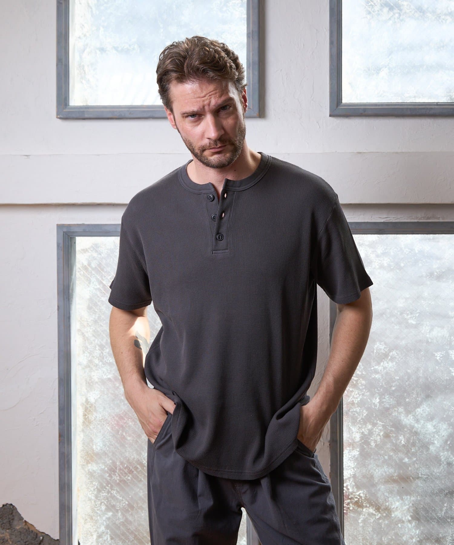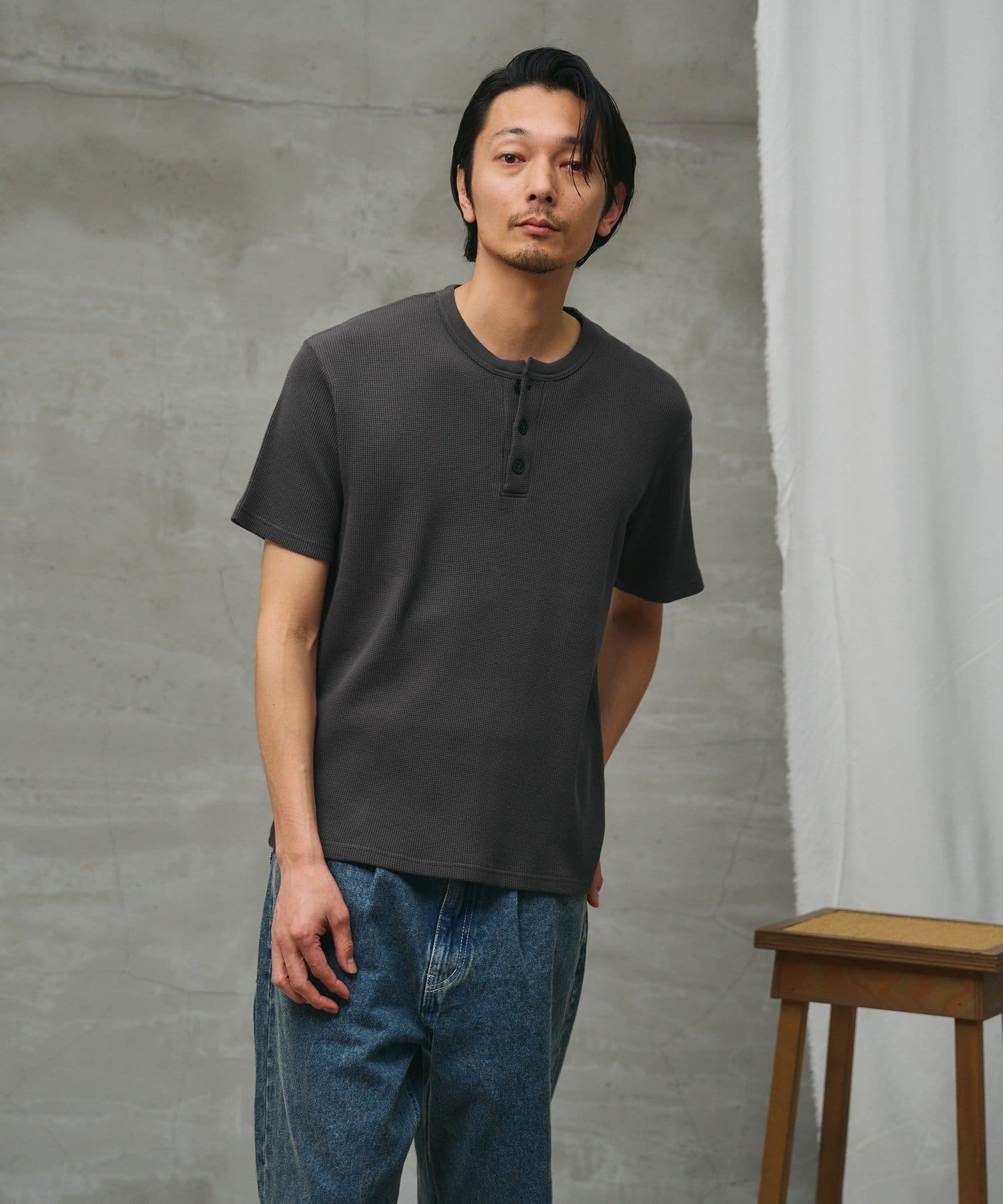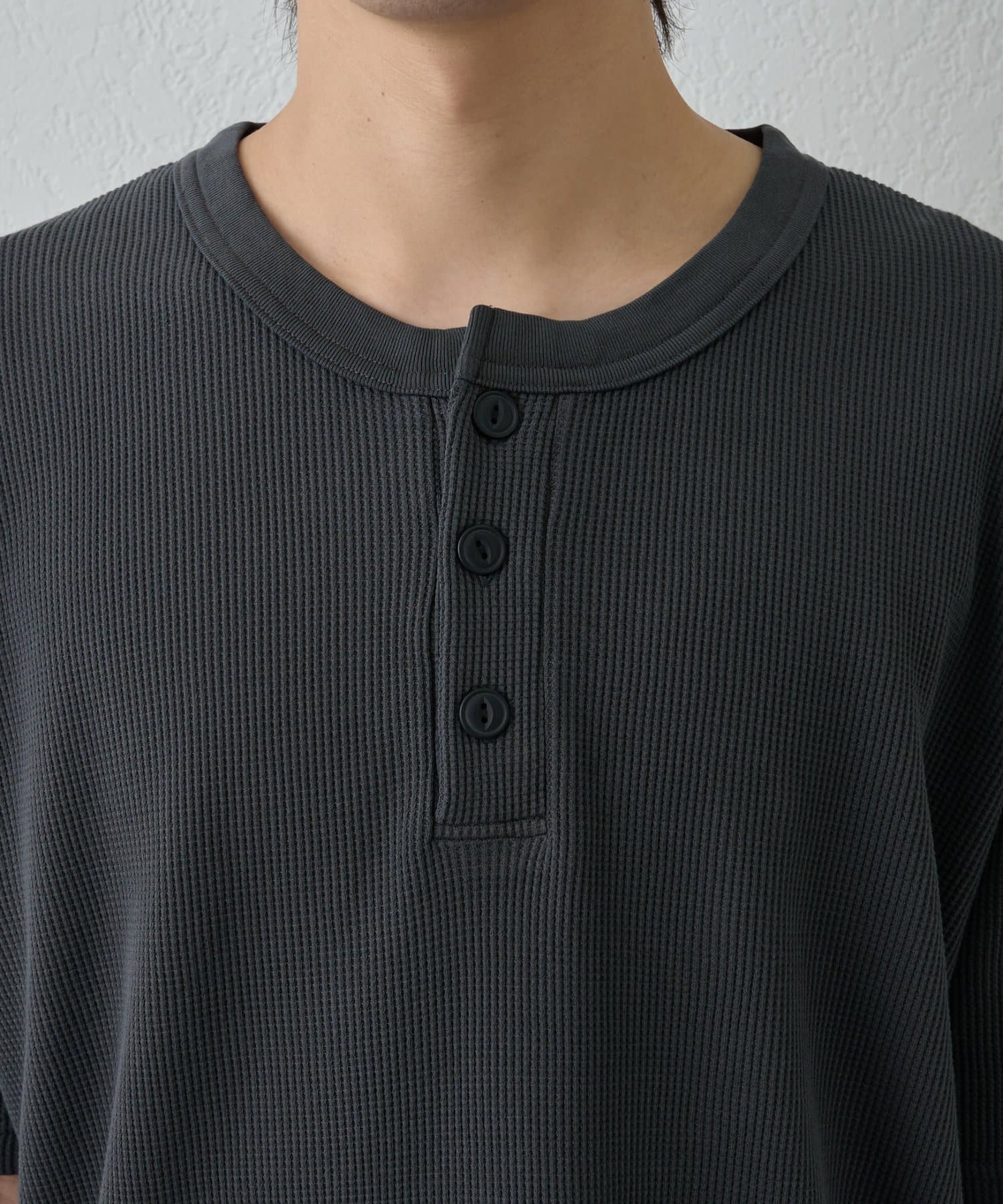 シンプルながらも、首元の釦がアクセントになっているガス焼きワッフルを使用したヘンリーネックです。
