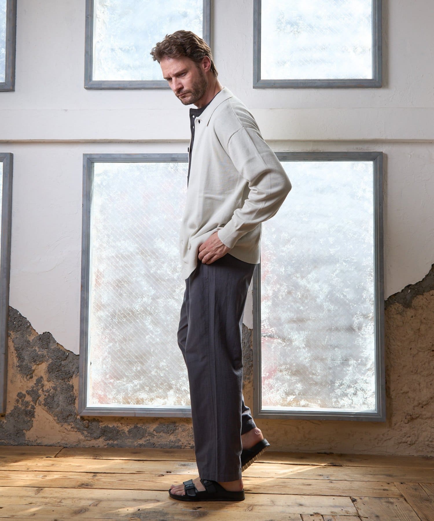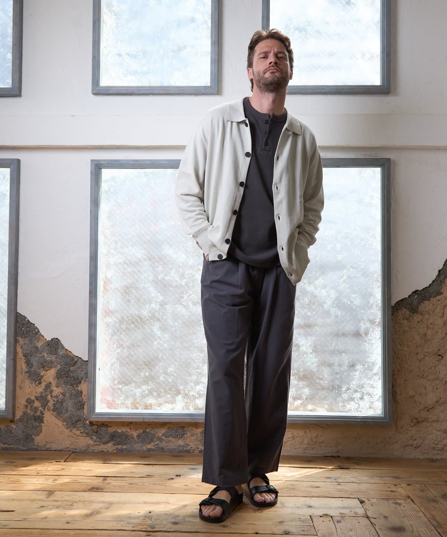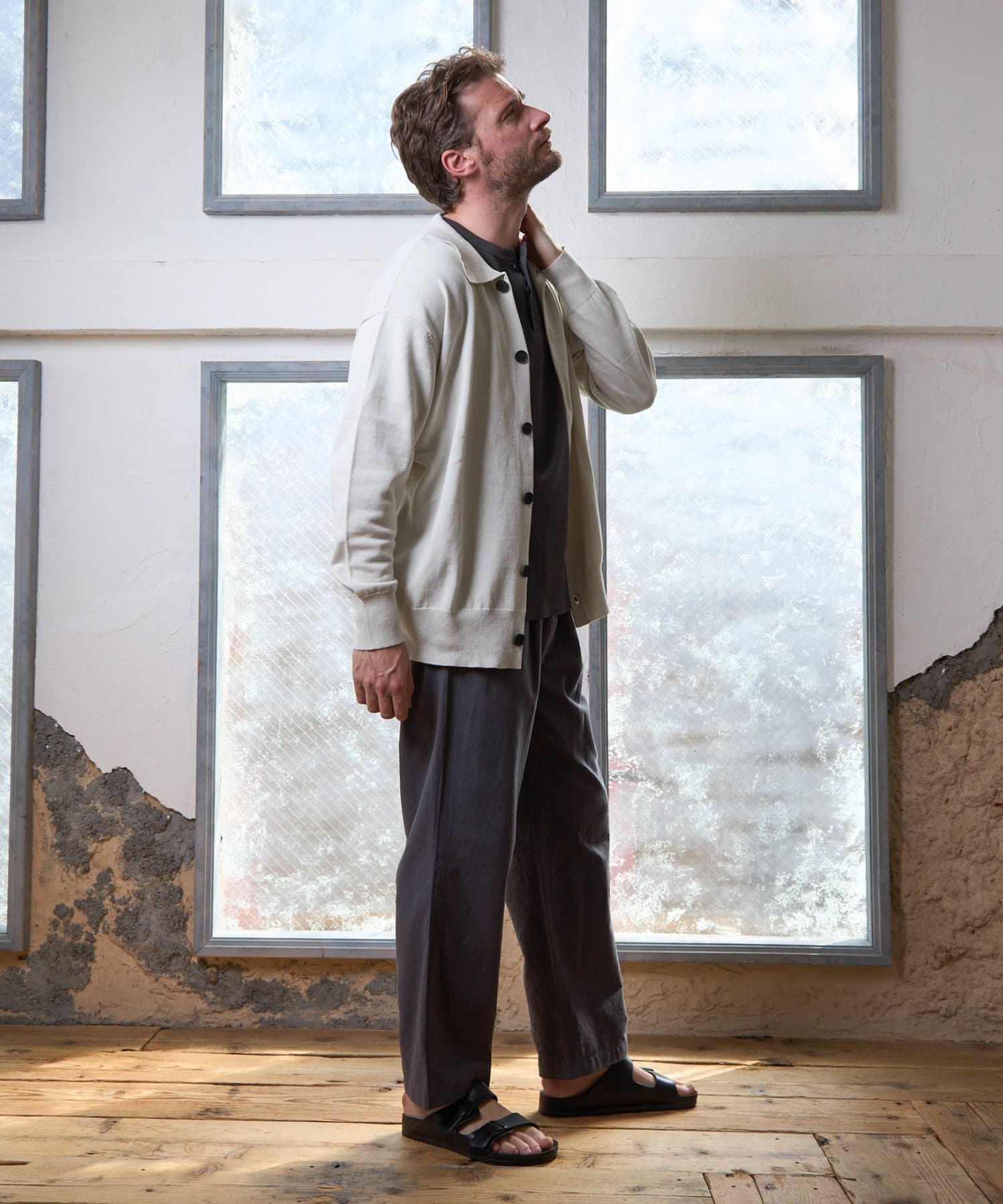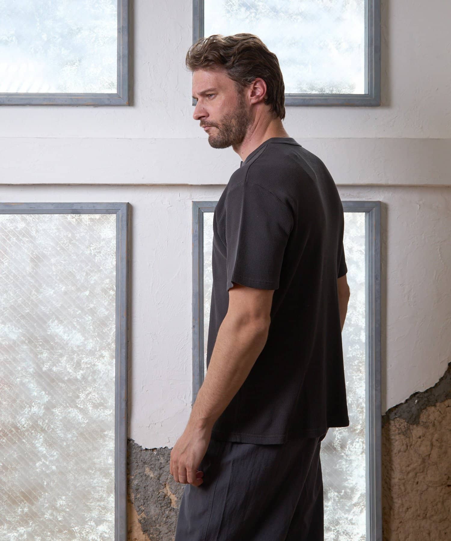シンプルながらも、首元の釦がアクセントになっているガス焼きワッフルを使用したヘンリーネックです。