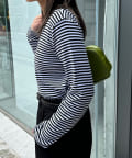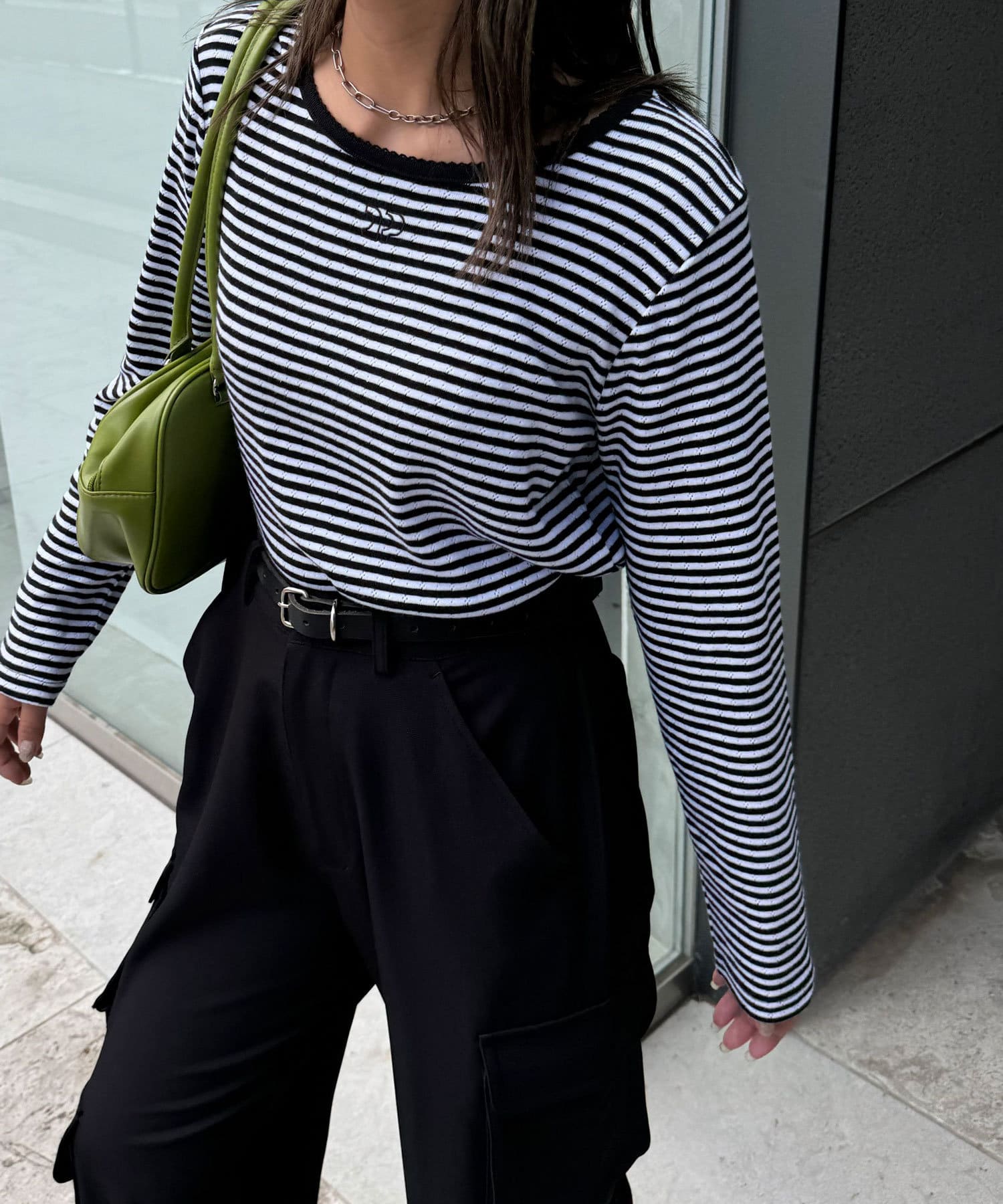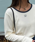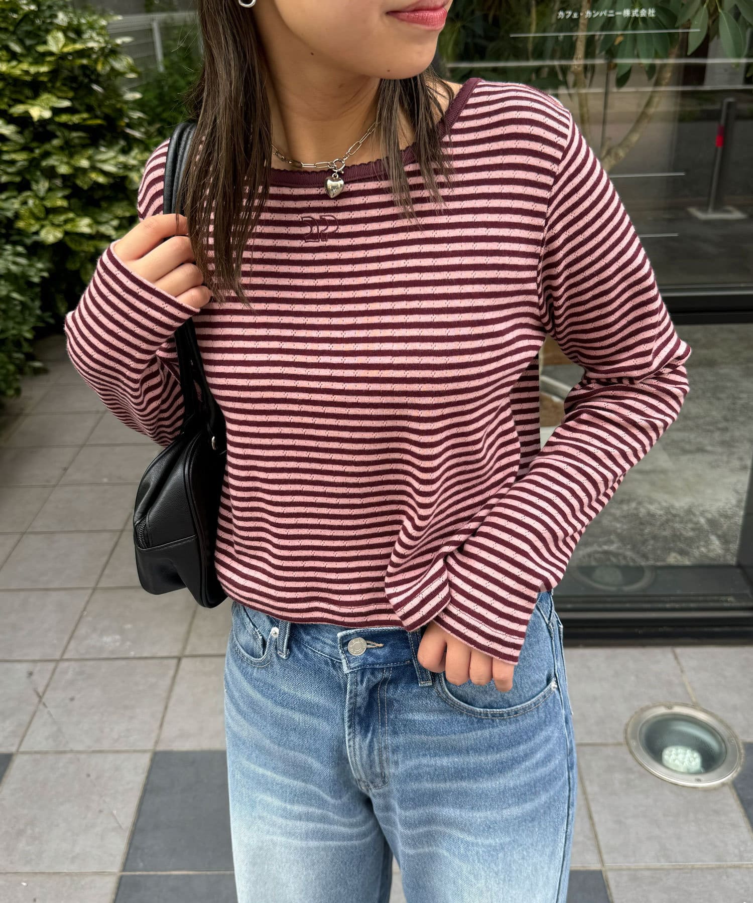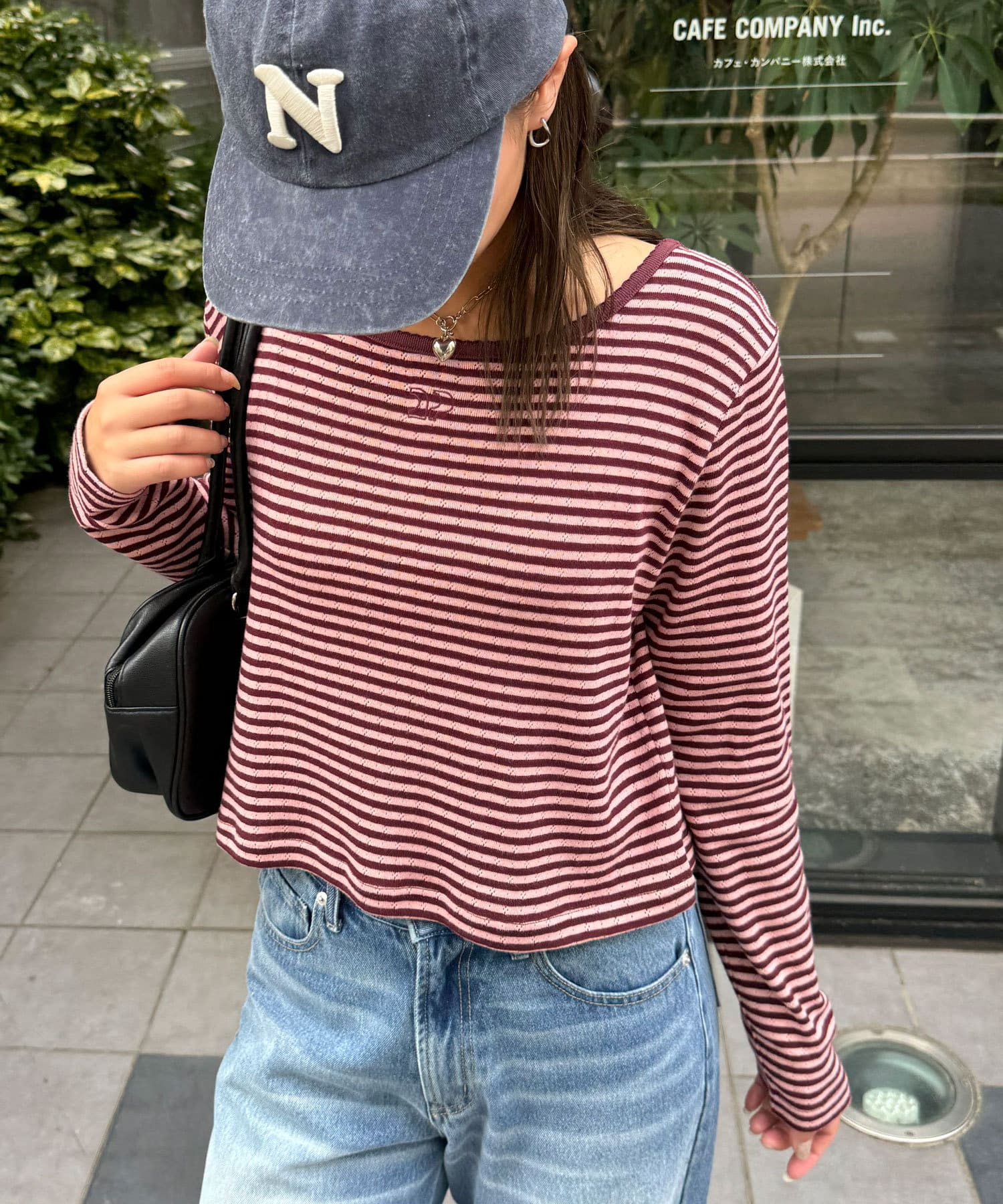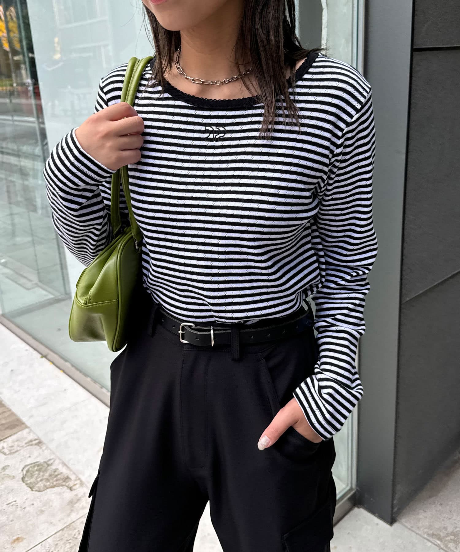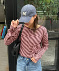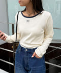 カーディガンやジャケットのインナーで着ると、リンガーのレースとロゴがコーデのアクセントに◎