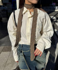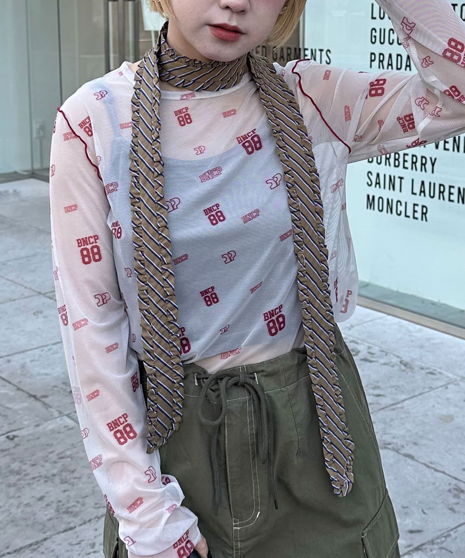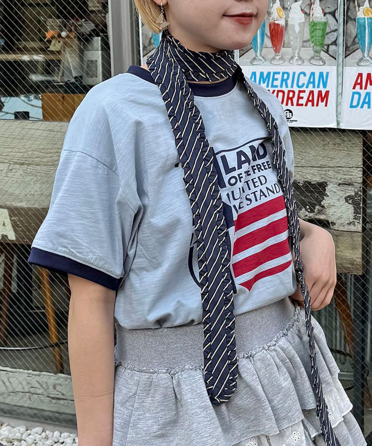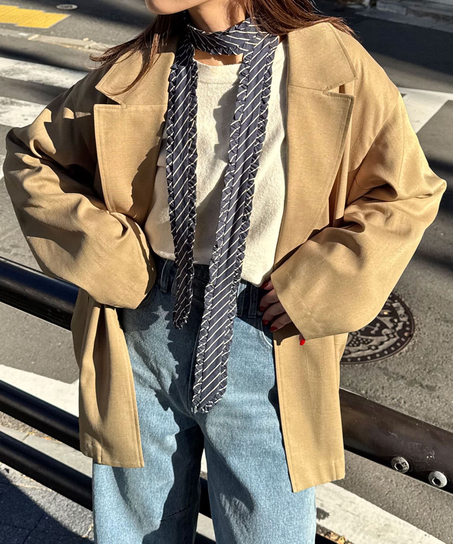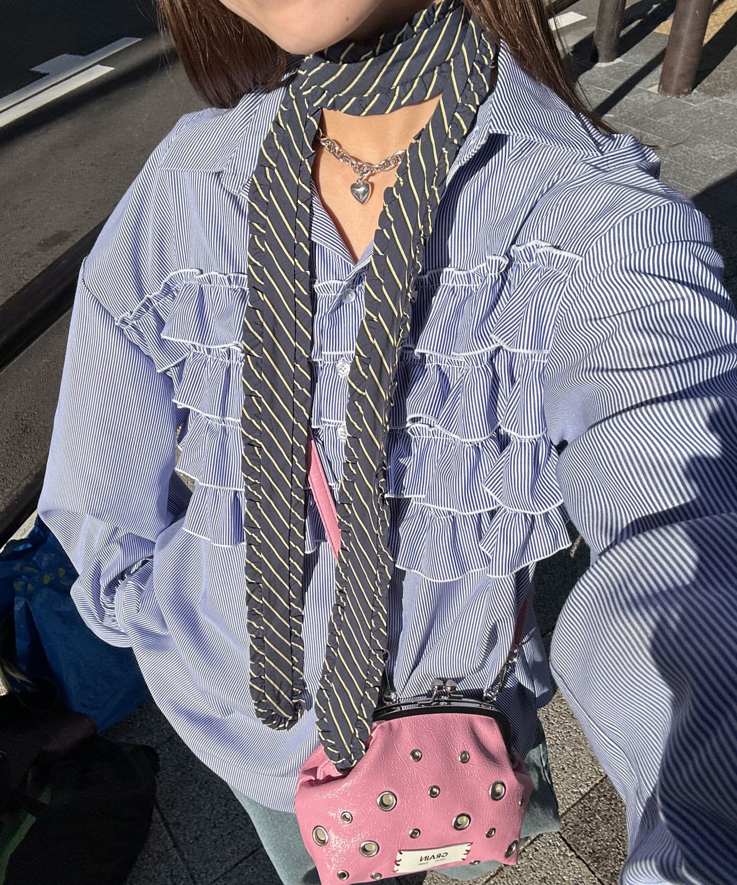 ストライプ柄のフリルネクタイは、ニットやカーディガンにチョーカー巻きで取り入れると◎