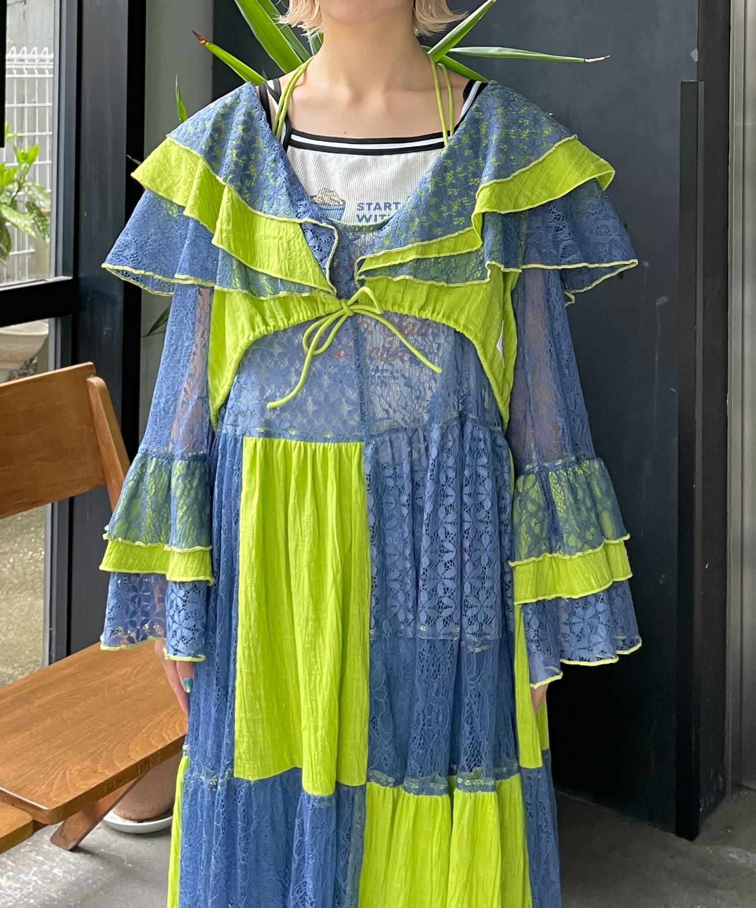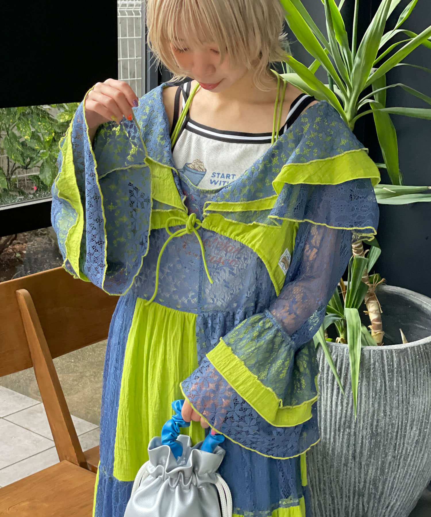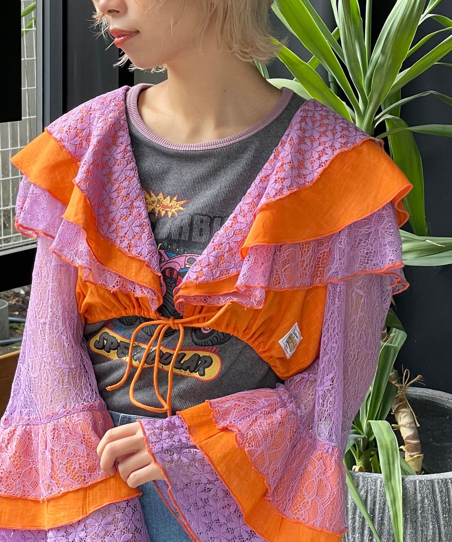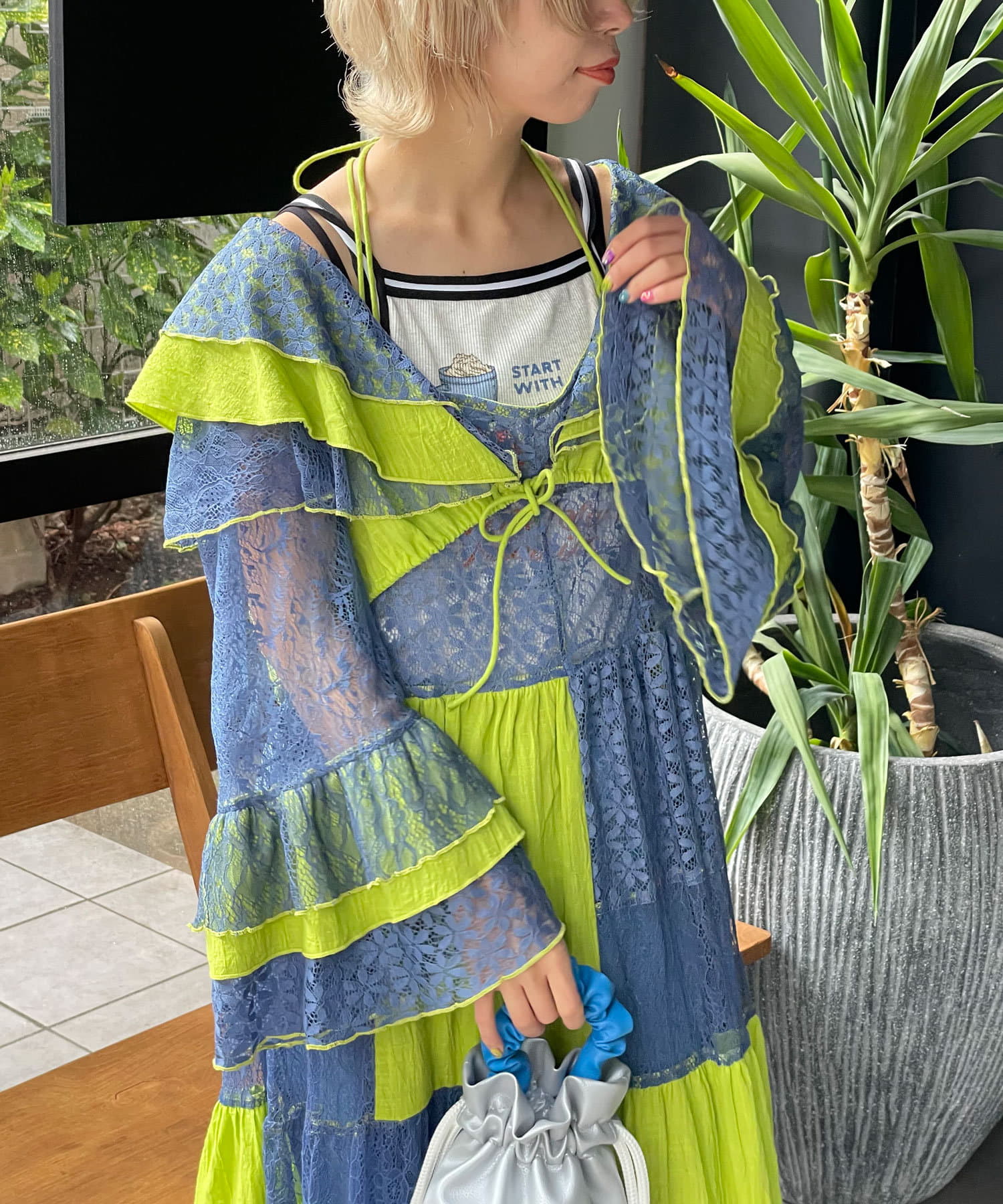 透け感のあるレースにビビッドカラーを組み合わせた、存在感抜群のパッチワークボレロ。