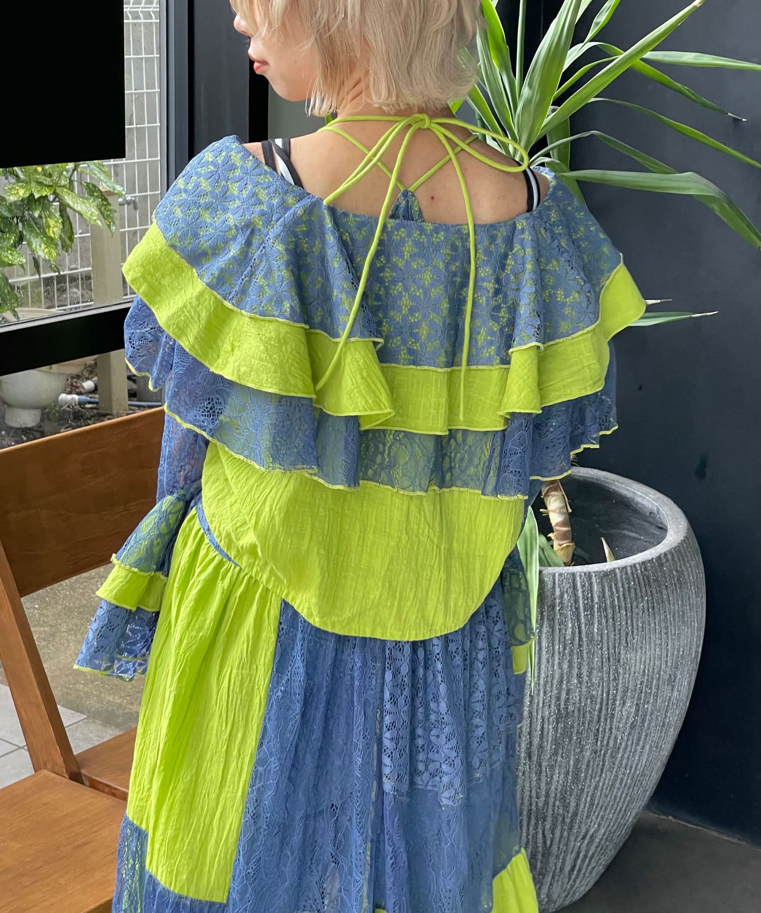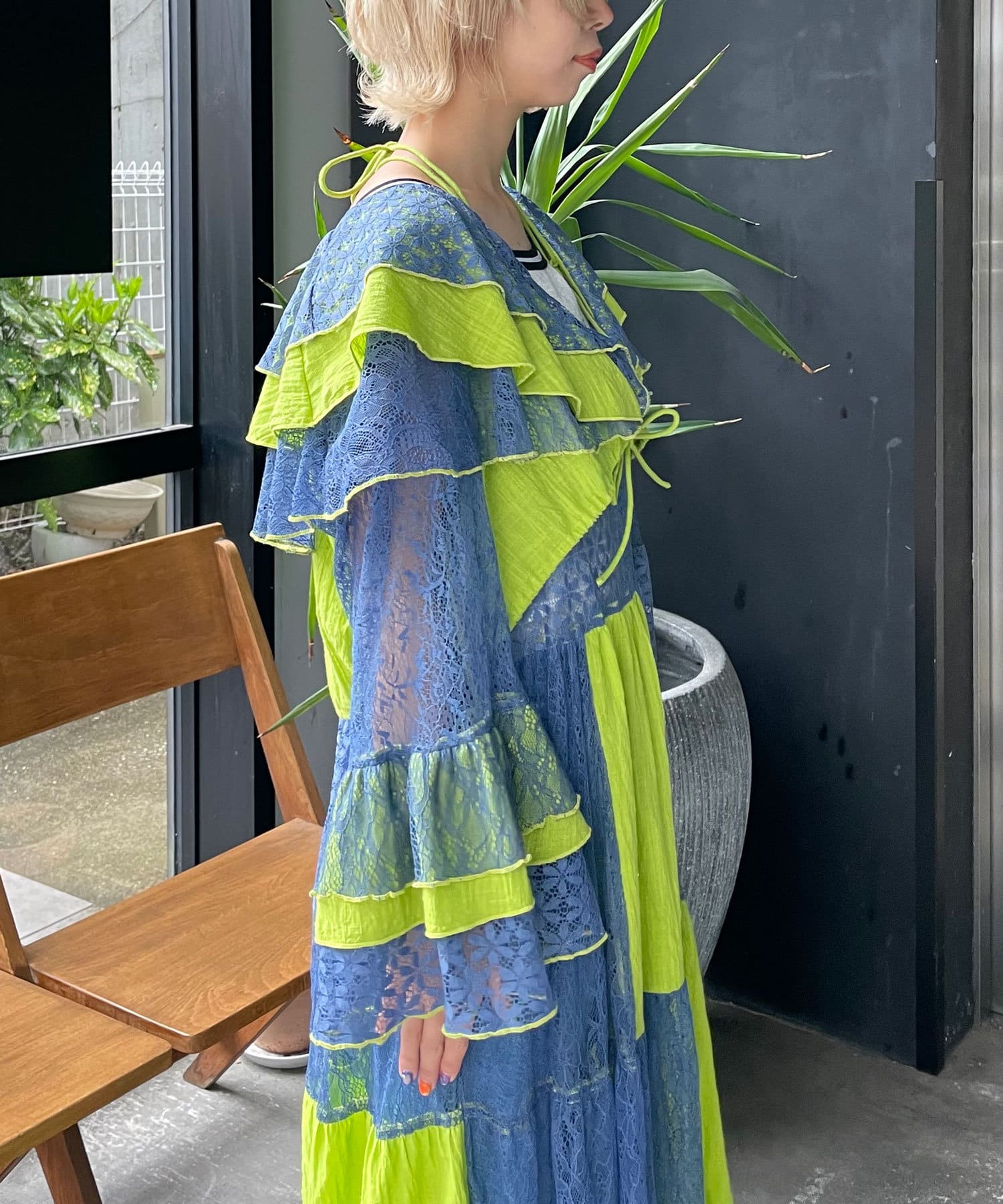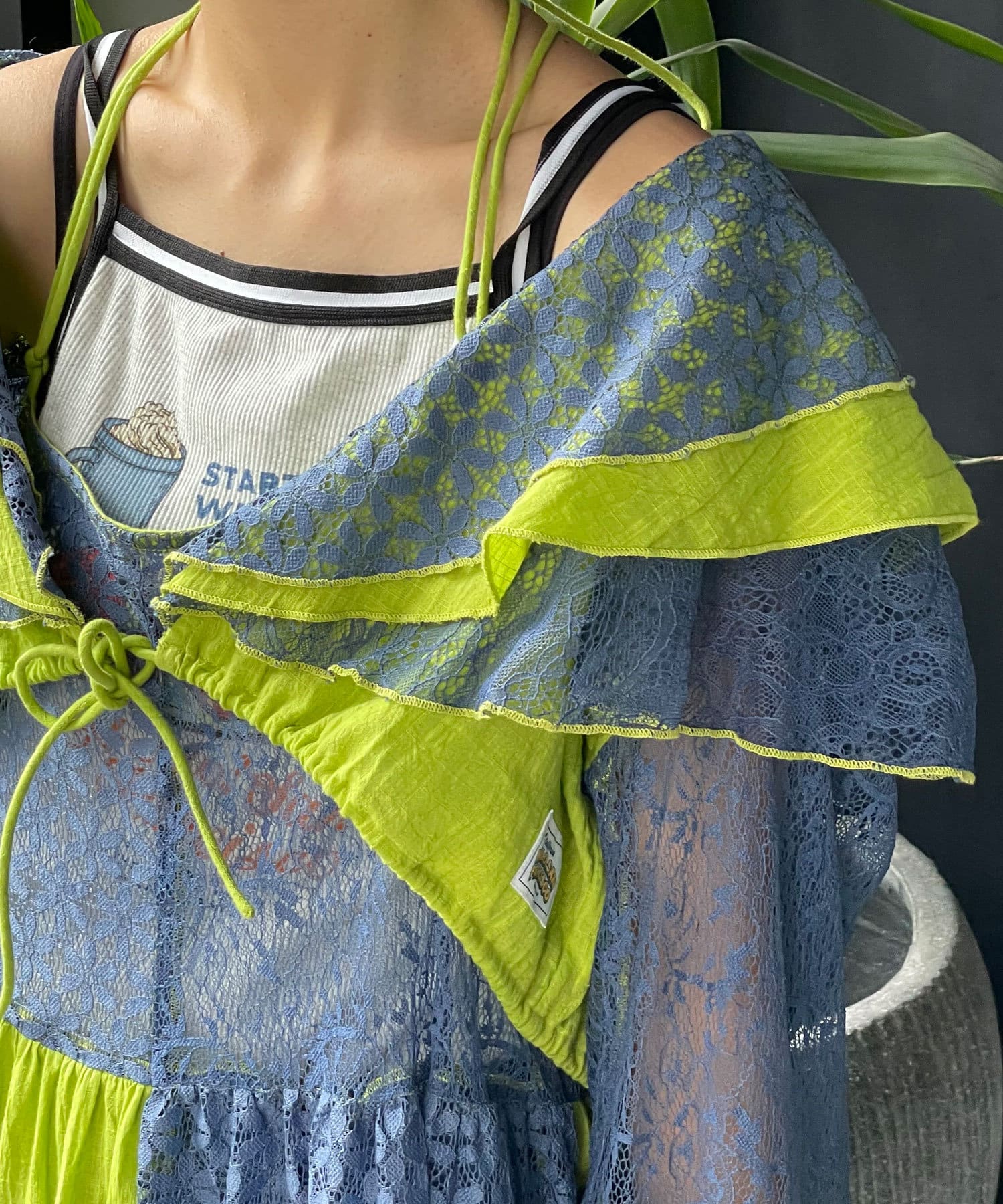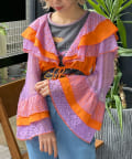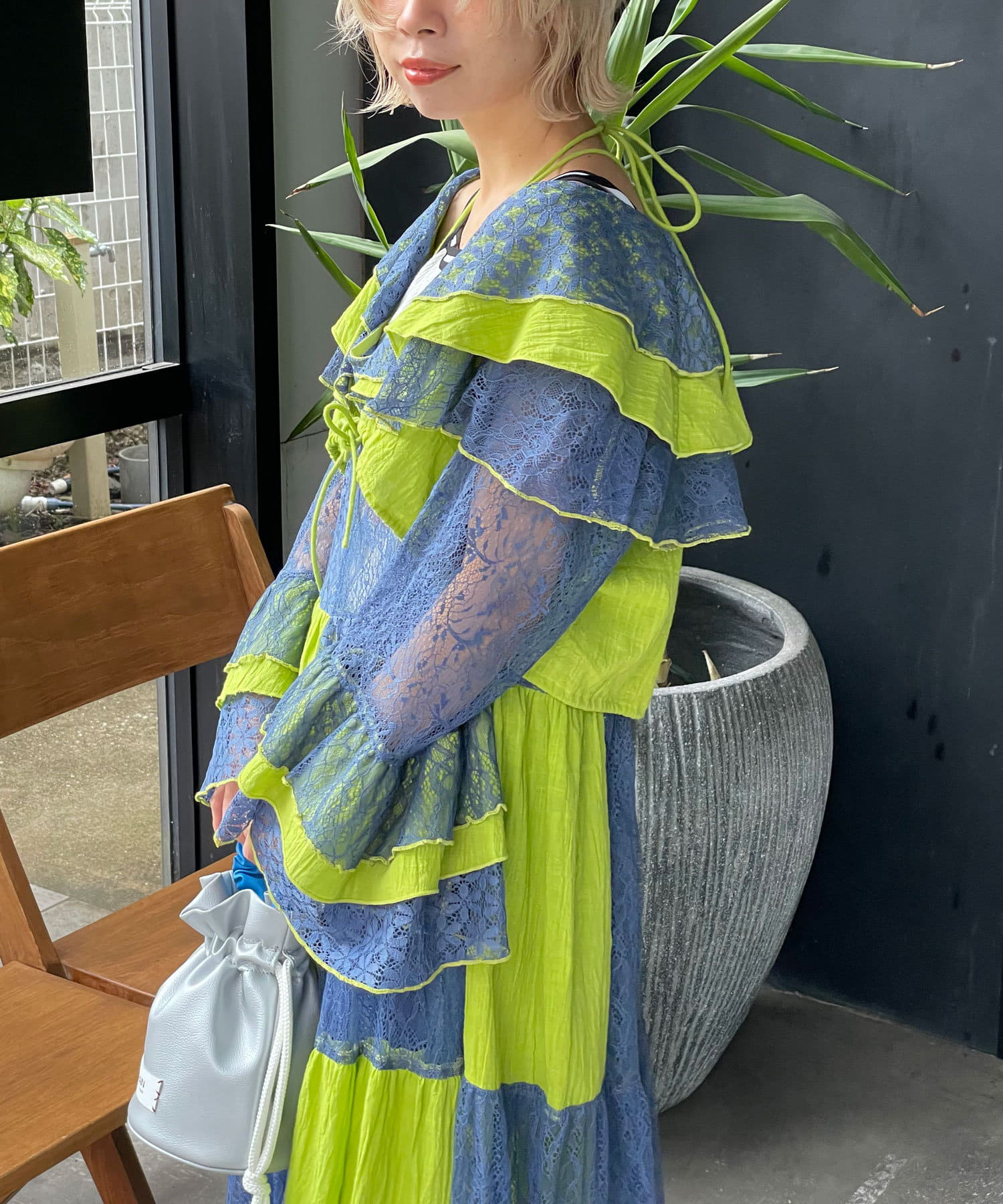透け感のあるレースにビビッドカラーを組み合わせた、存在感抜群のパッチワークボレロ。