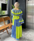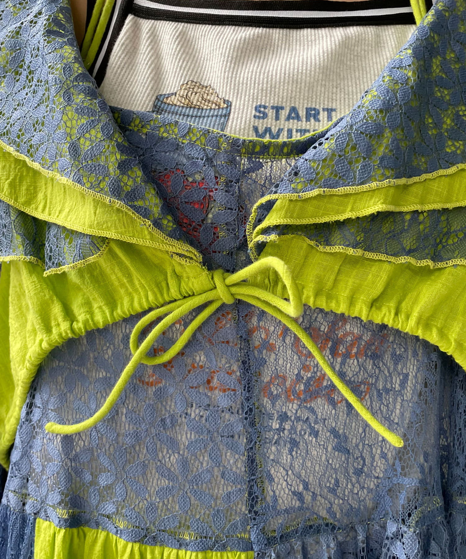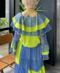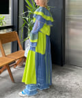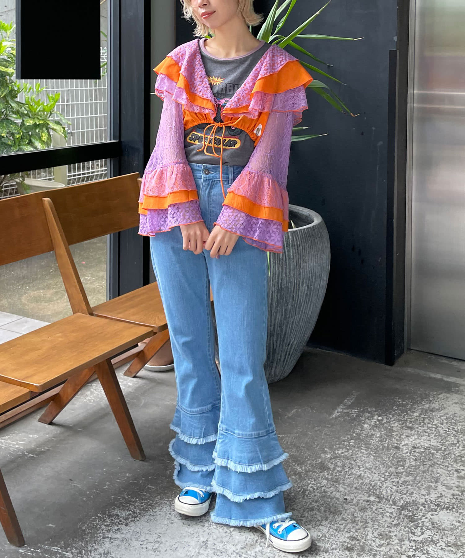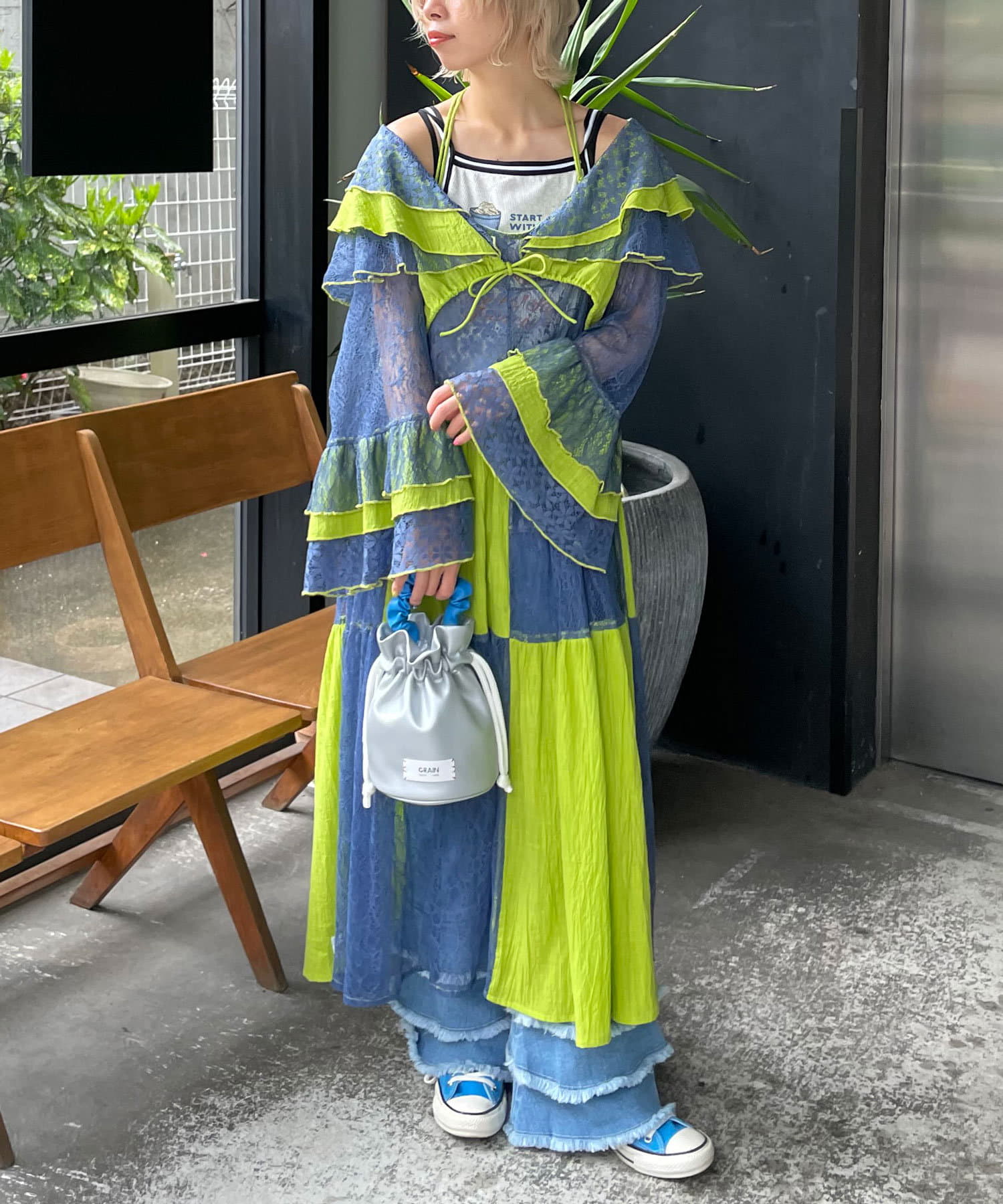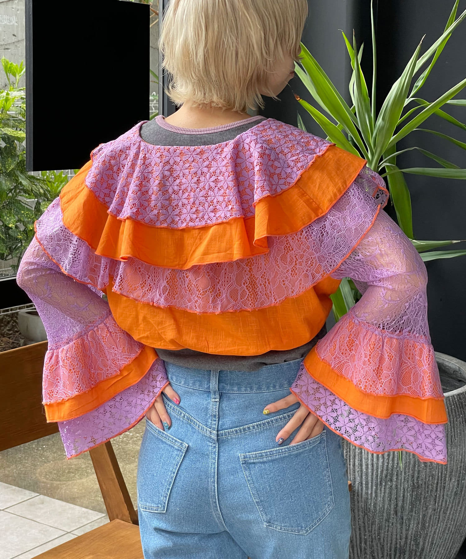 透け感のあるレースにビビッドカラーを組み合わせた、存在感抜群のパッチワークボレロ。