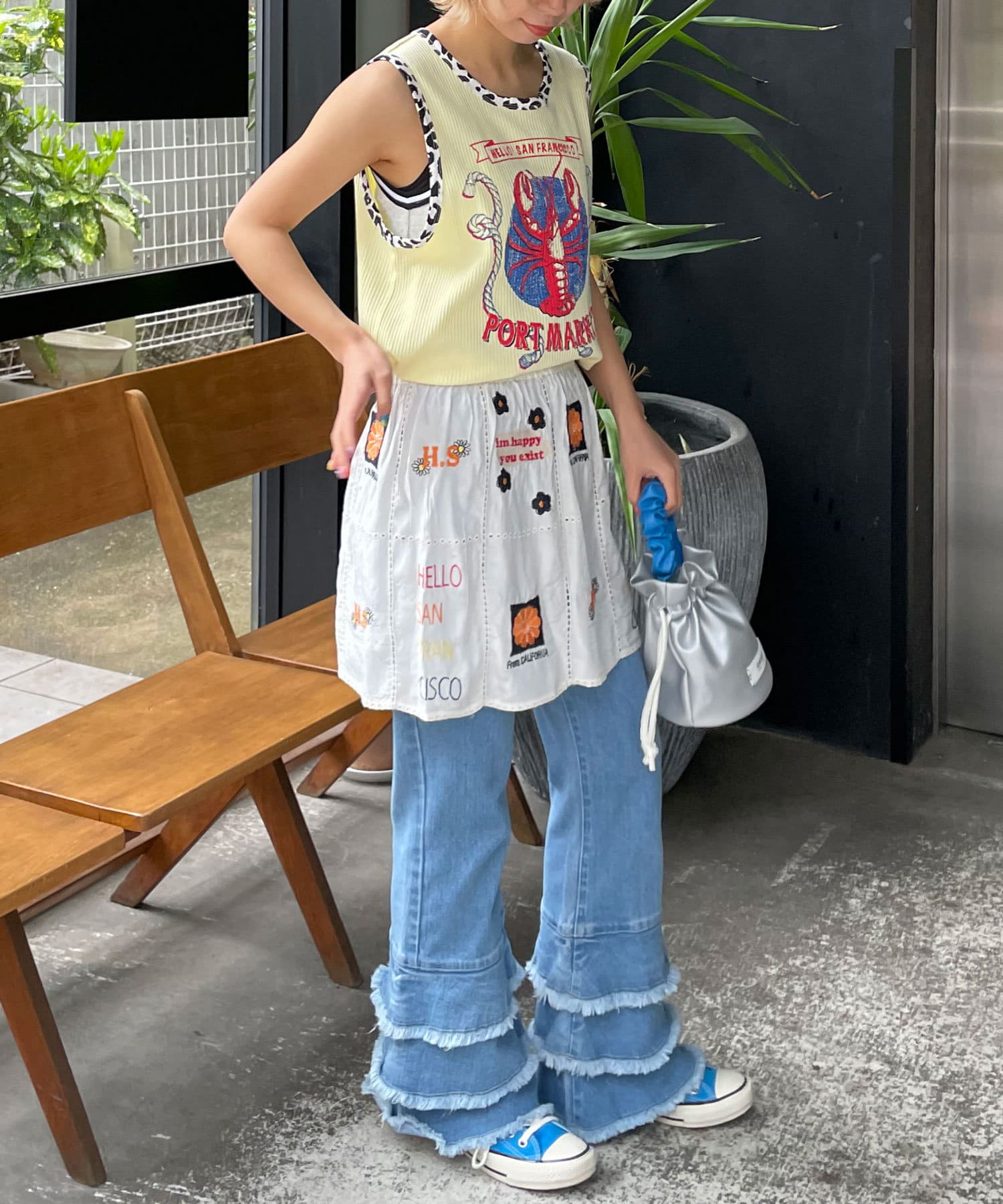 ボトムスはデニムでカジュアルダウン、スカート合わせでちょっぴりガーリーにも◎