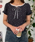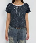 フロントのリボンがさりげないアクセントになり、カジュアルにもガーリーにも着まわせる万能アイテム。