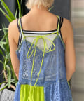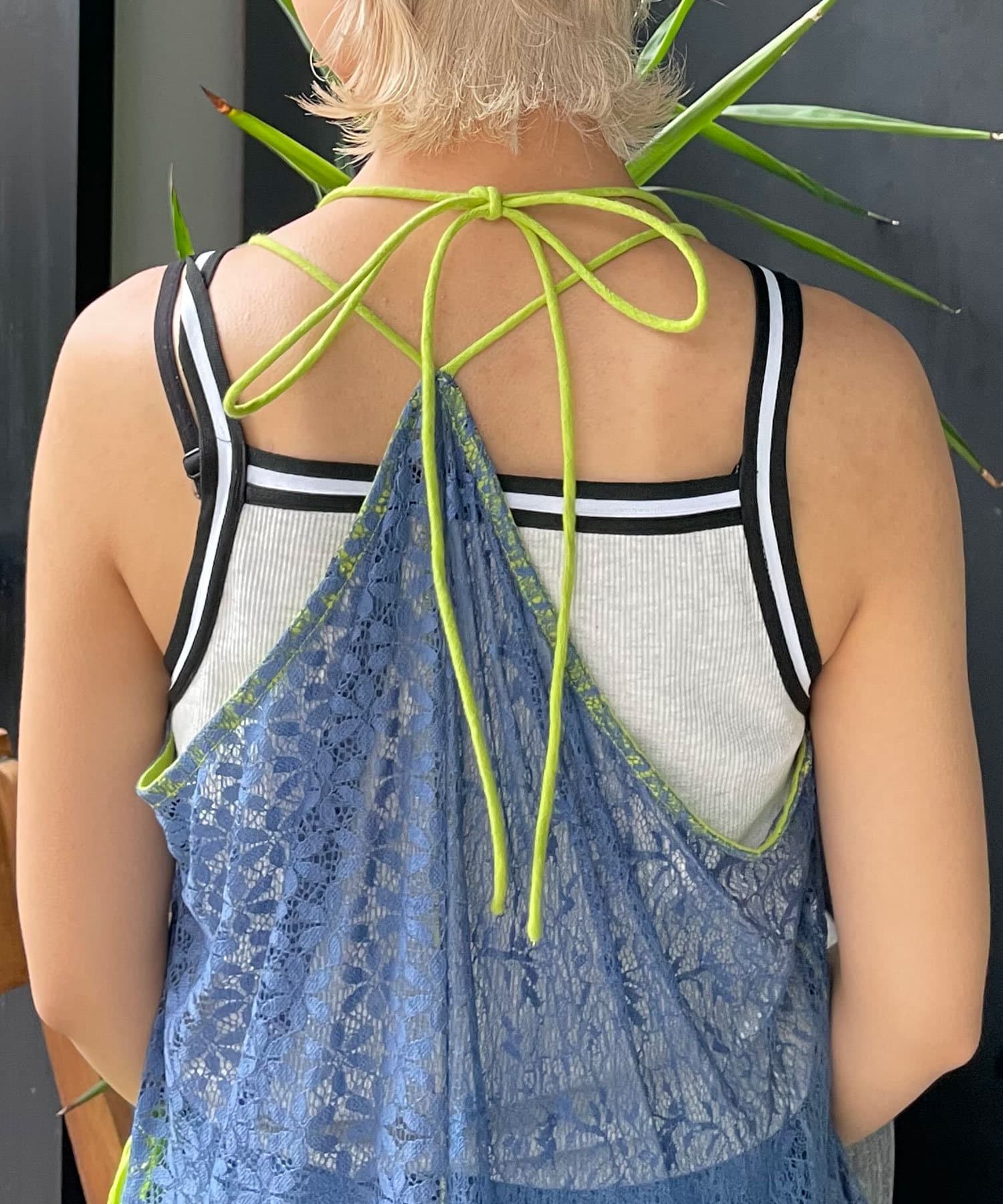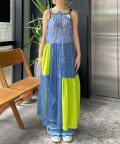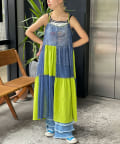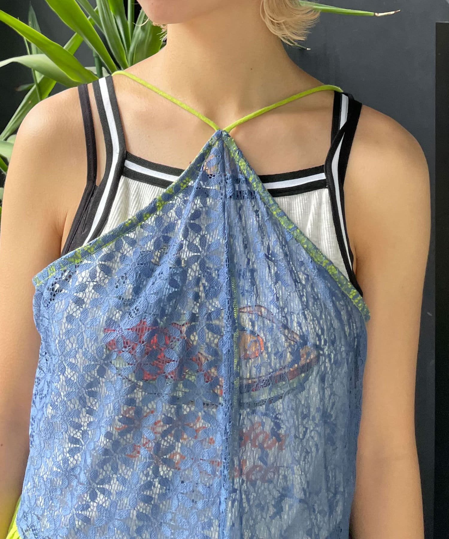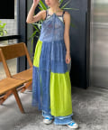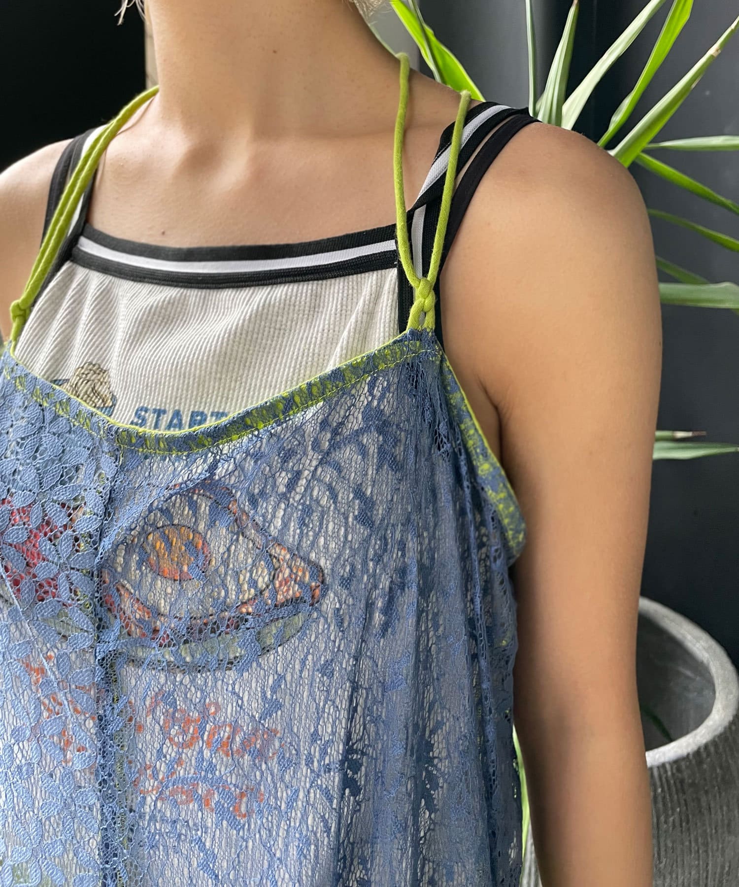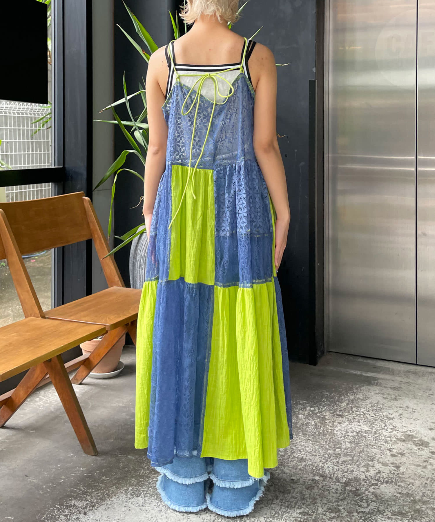 大胆な配色と繊細なレースの異素材切り替えが目を惹くキャミワンピース。