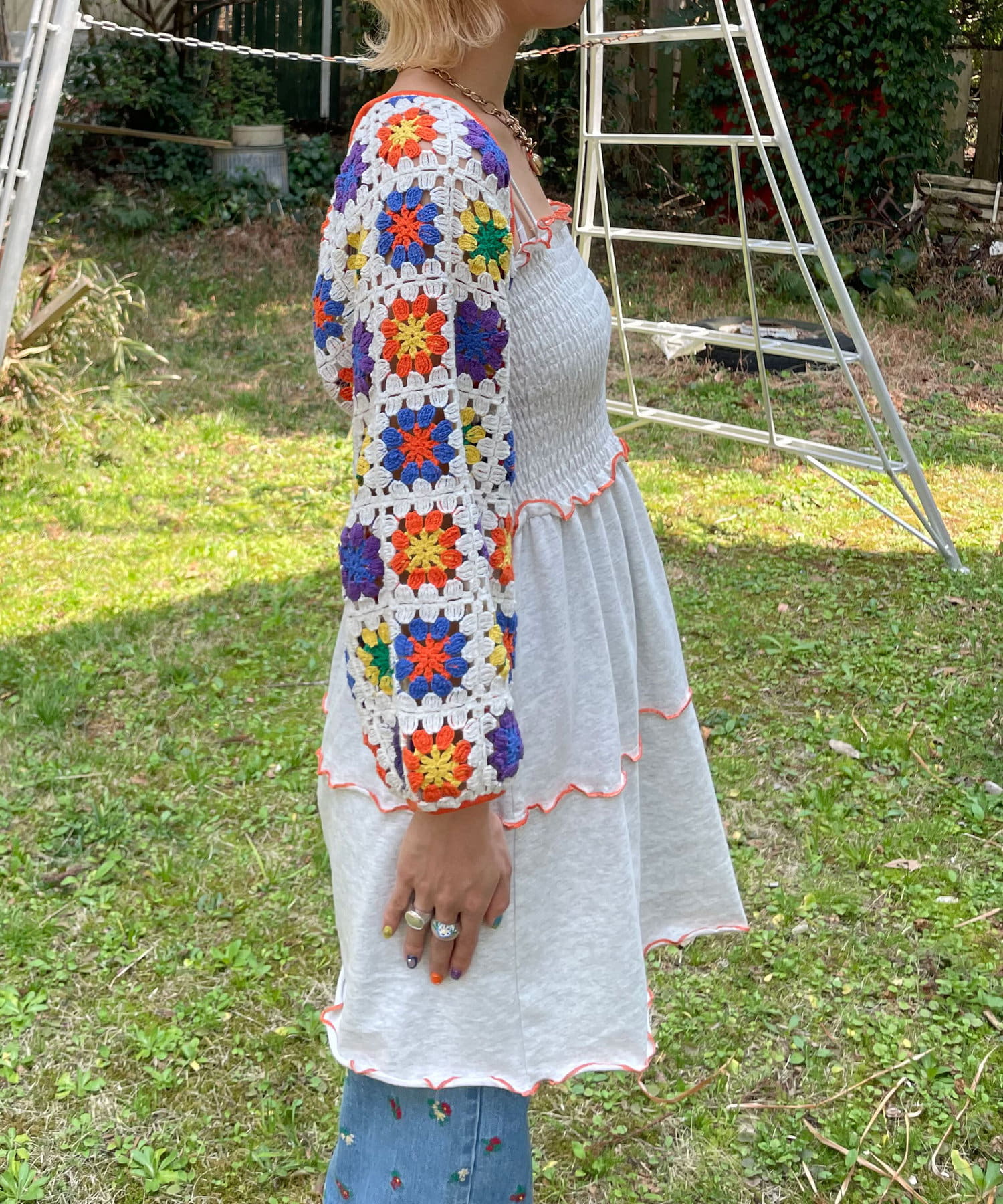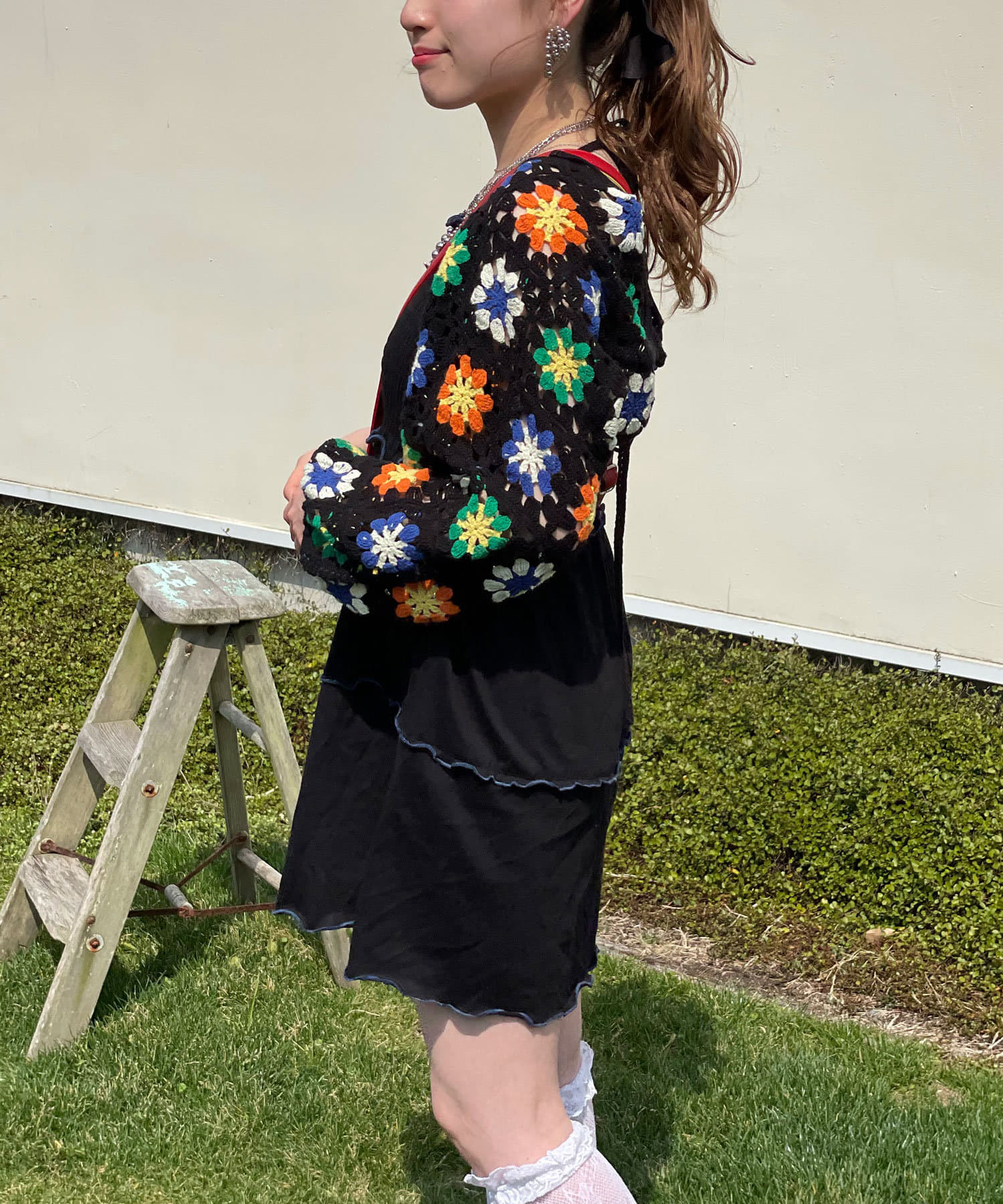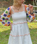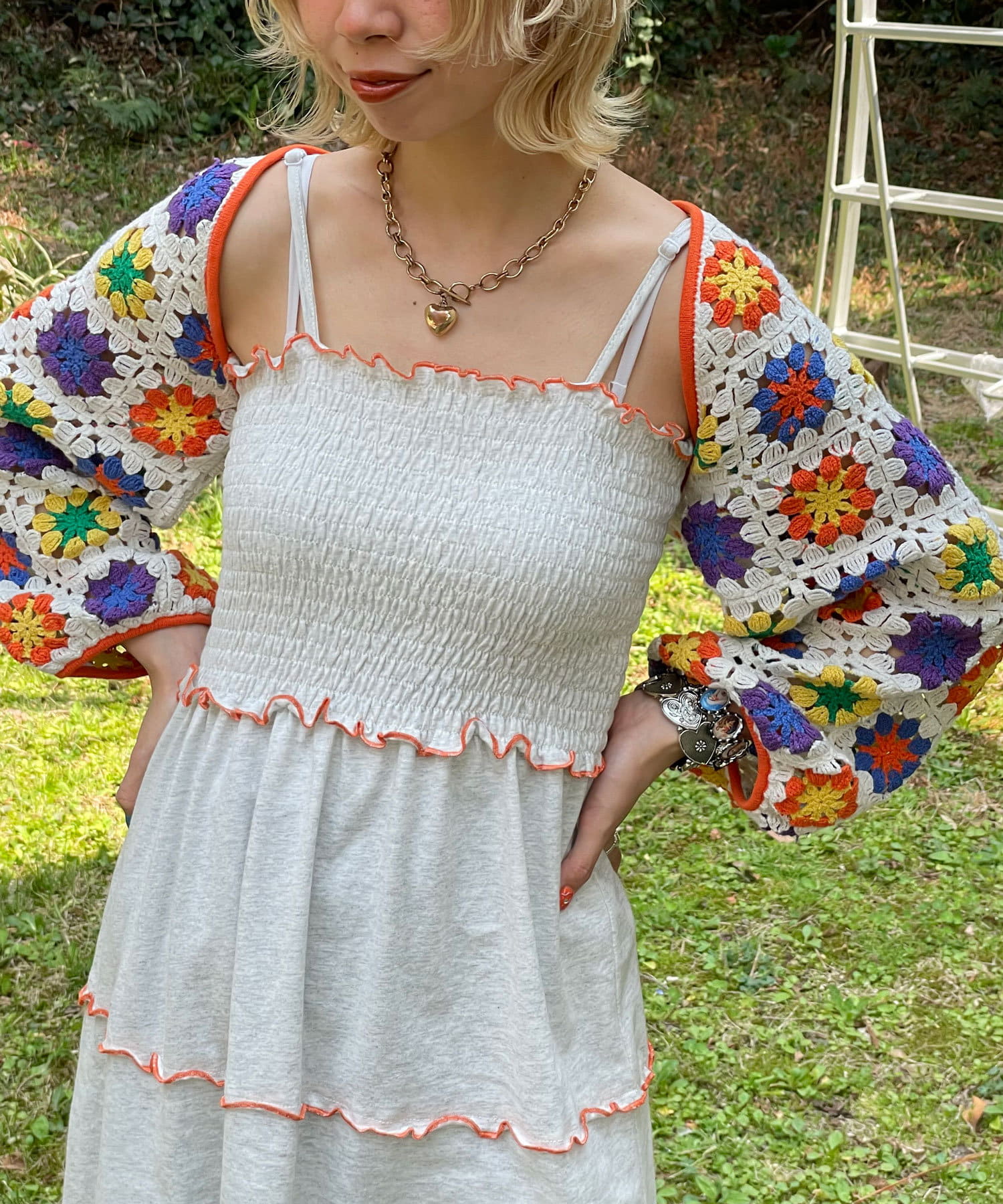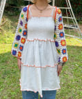 ボレロはカラフルな配色のクロシェ編みで、コーディネートのアクセントにぴったりです。
