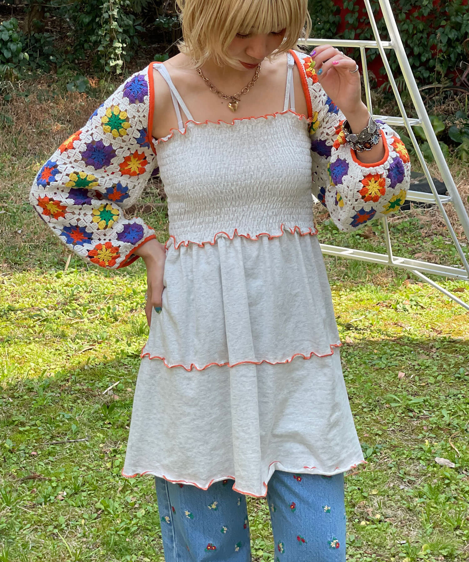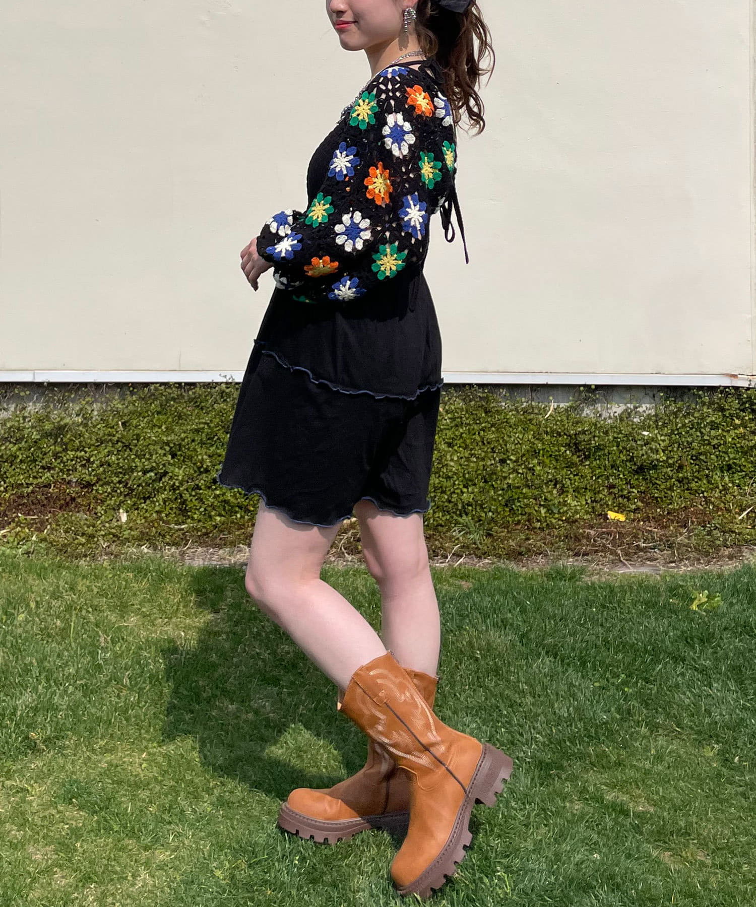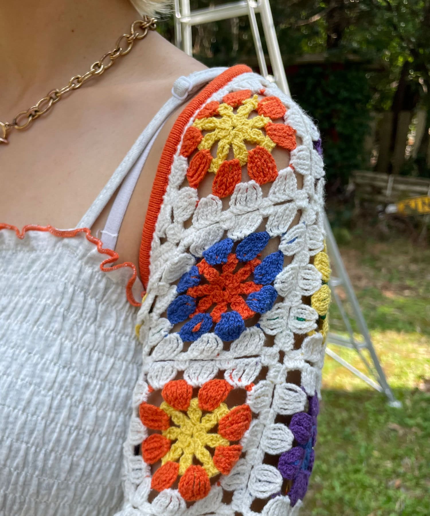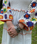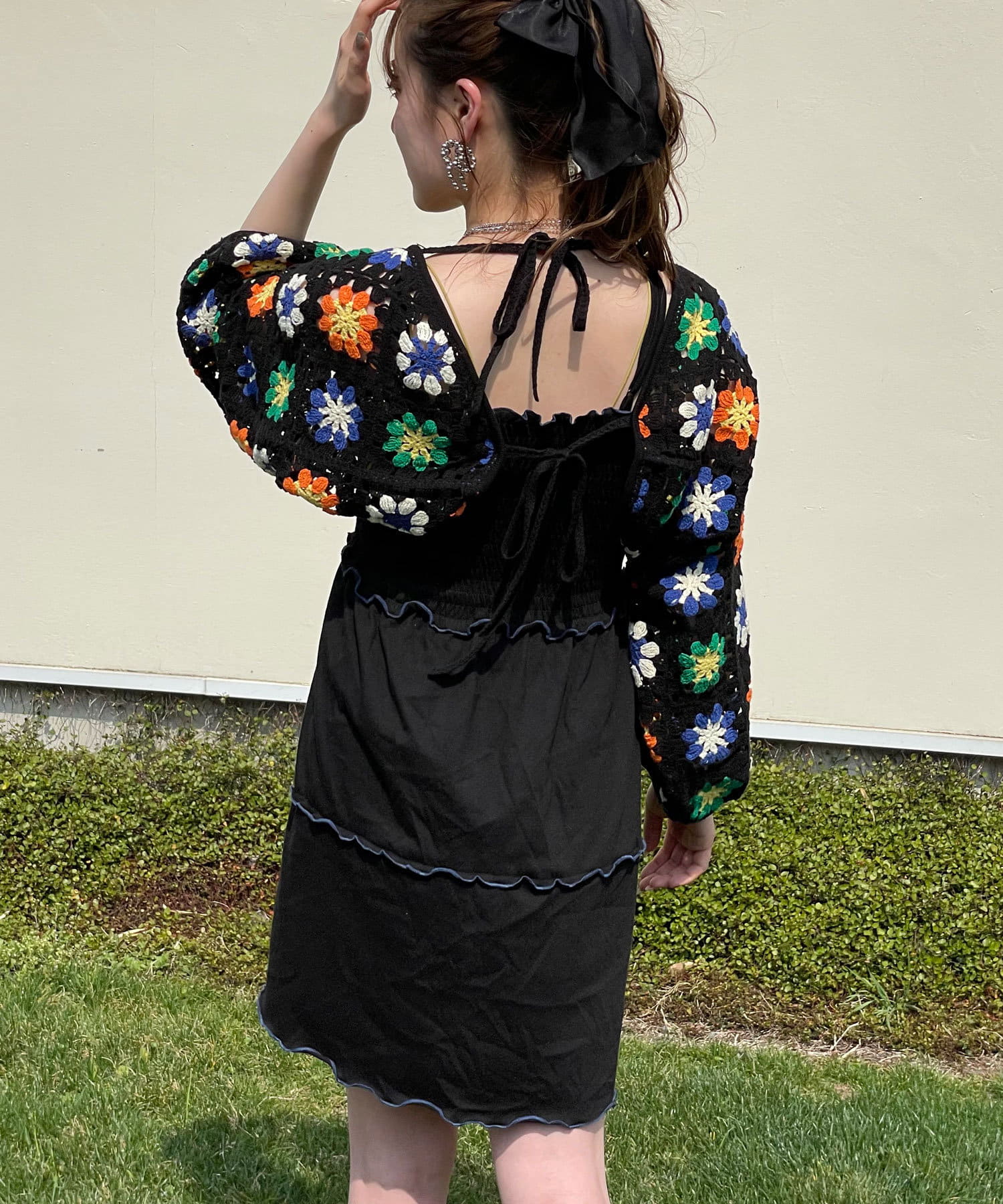 ボレロはカラフルな配色のクロシェ編みで、コーディネートのアクセントにぴったりです。