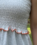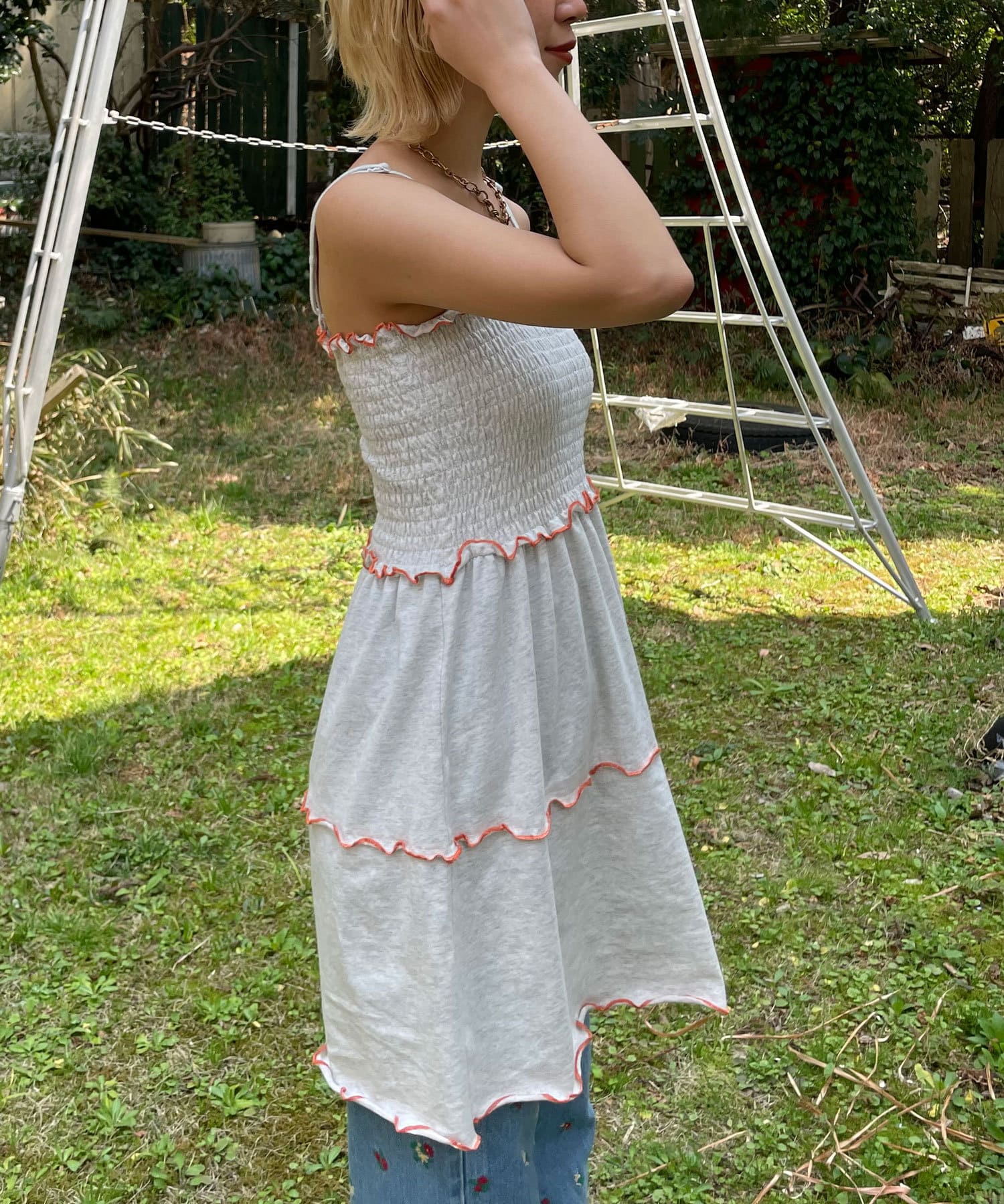 ワンピースはシンプルながら、配色ステッチが効いたデザインでさりげなくアクセントに。