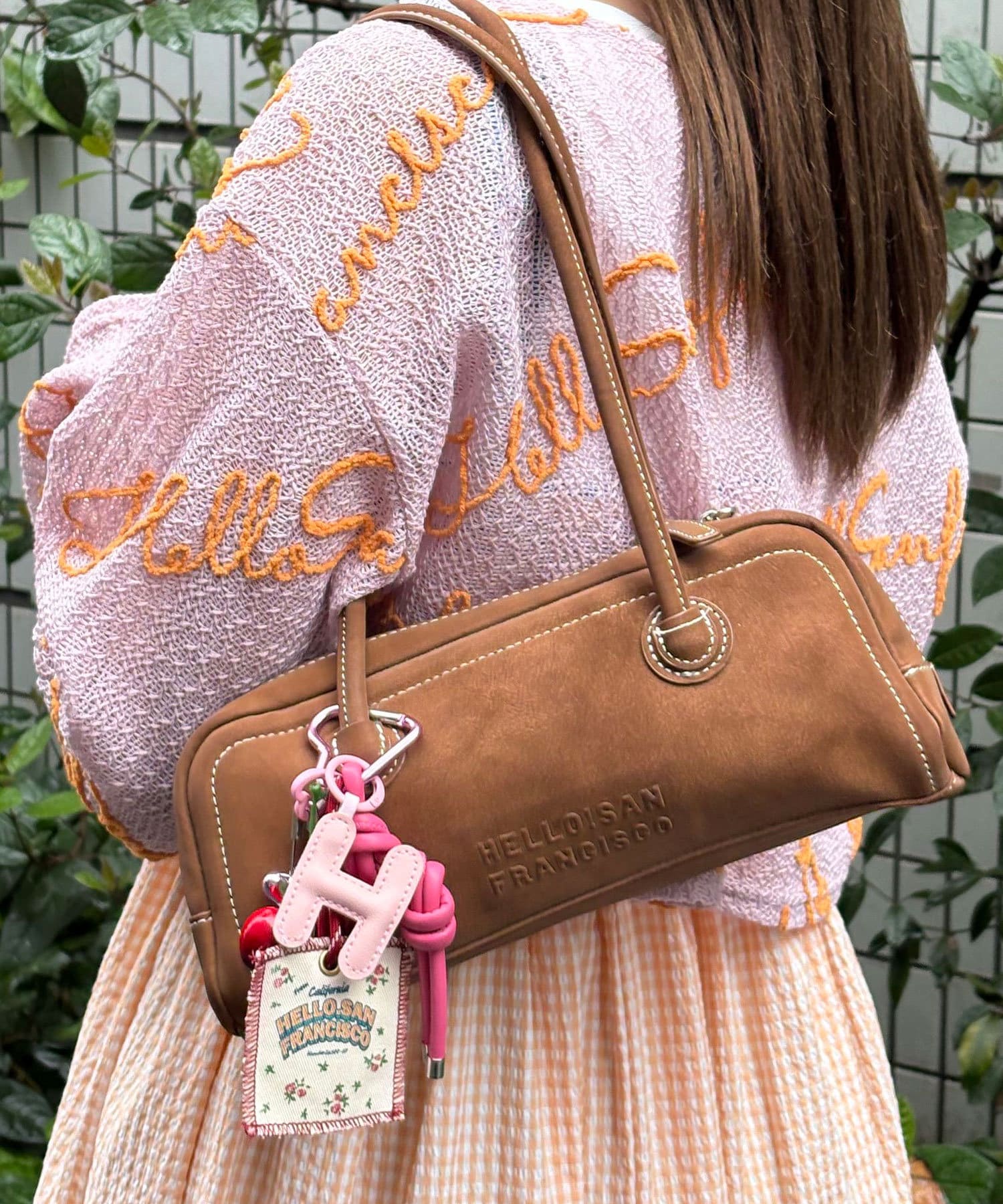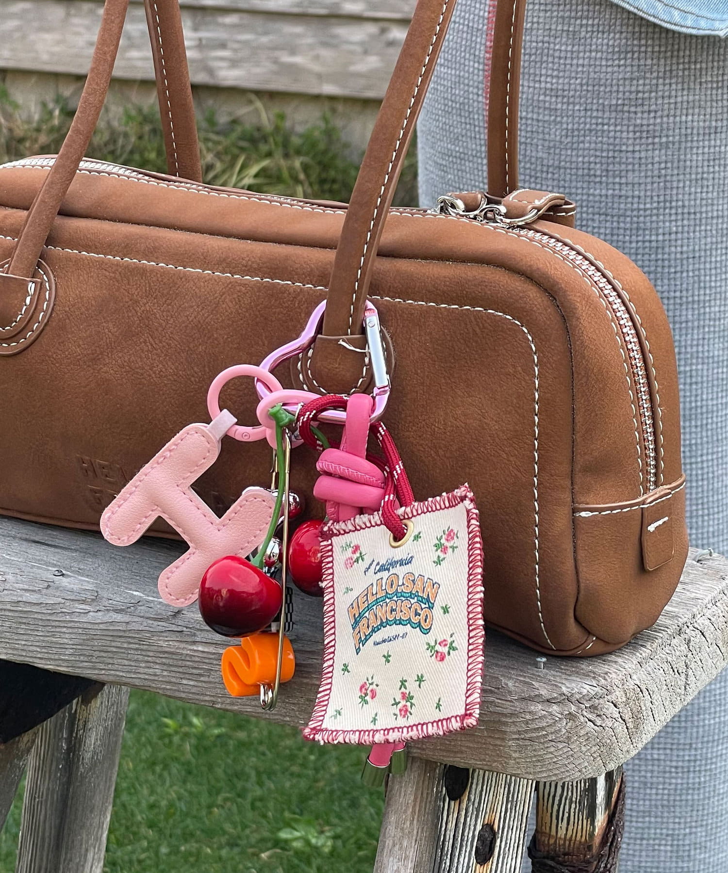 チェリーやイニシャルモチーフ、大きめのステッチがかわいい布タグなど、異なる素材とカラーを組み合わせた遊び心満点のアイテムです。